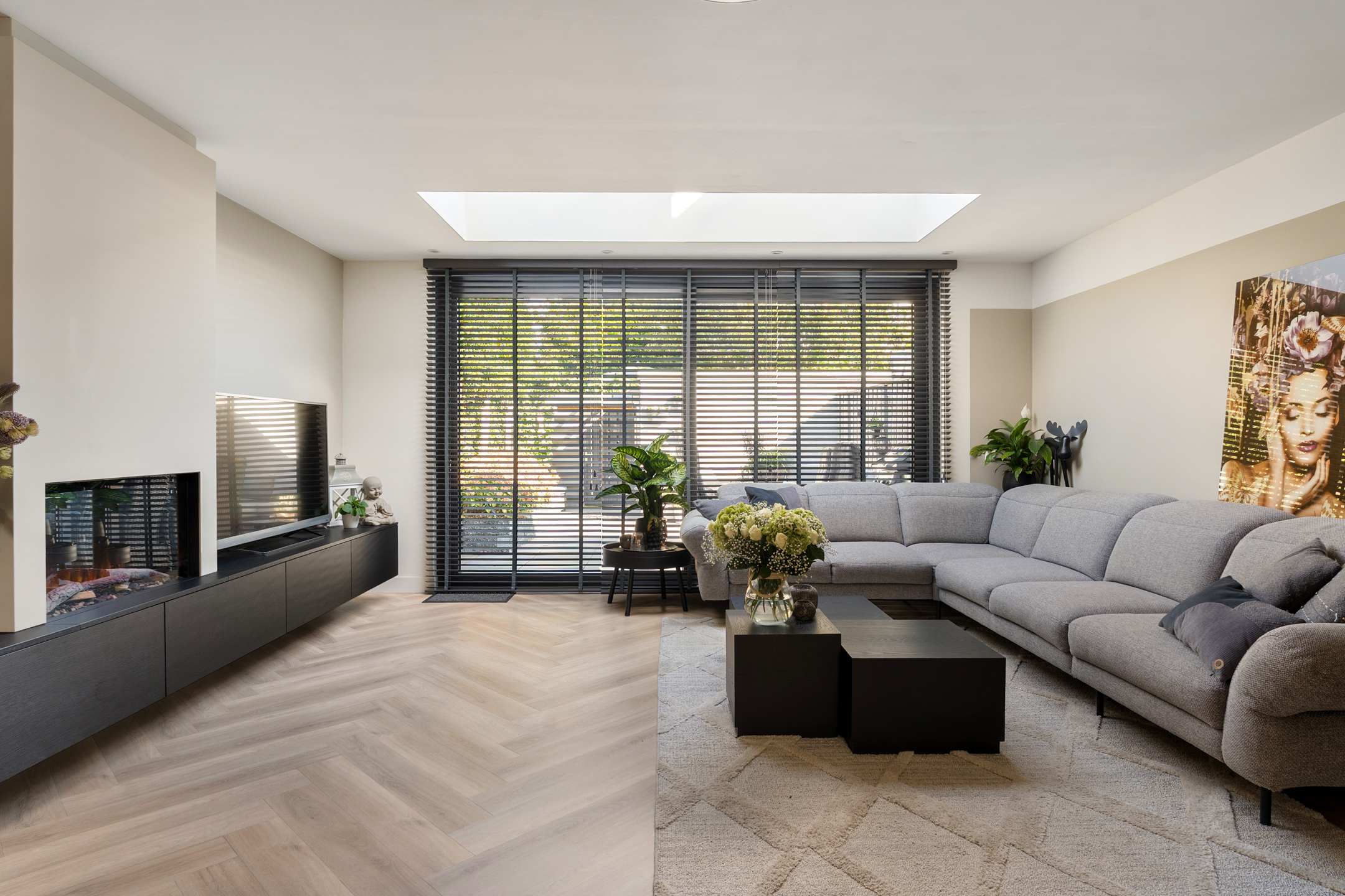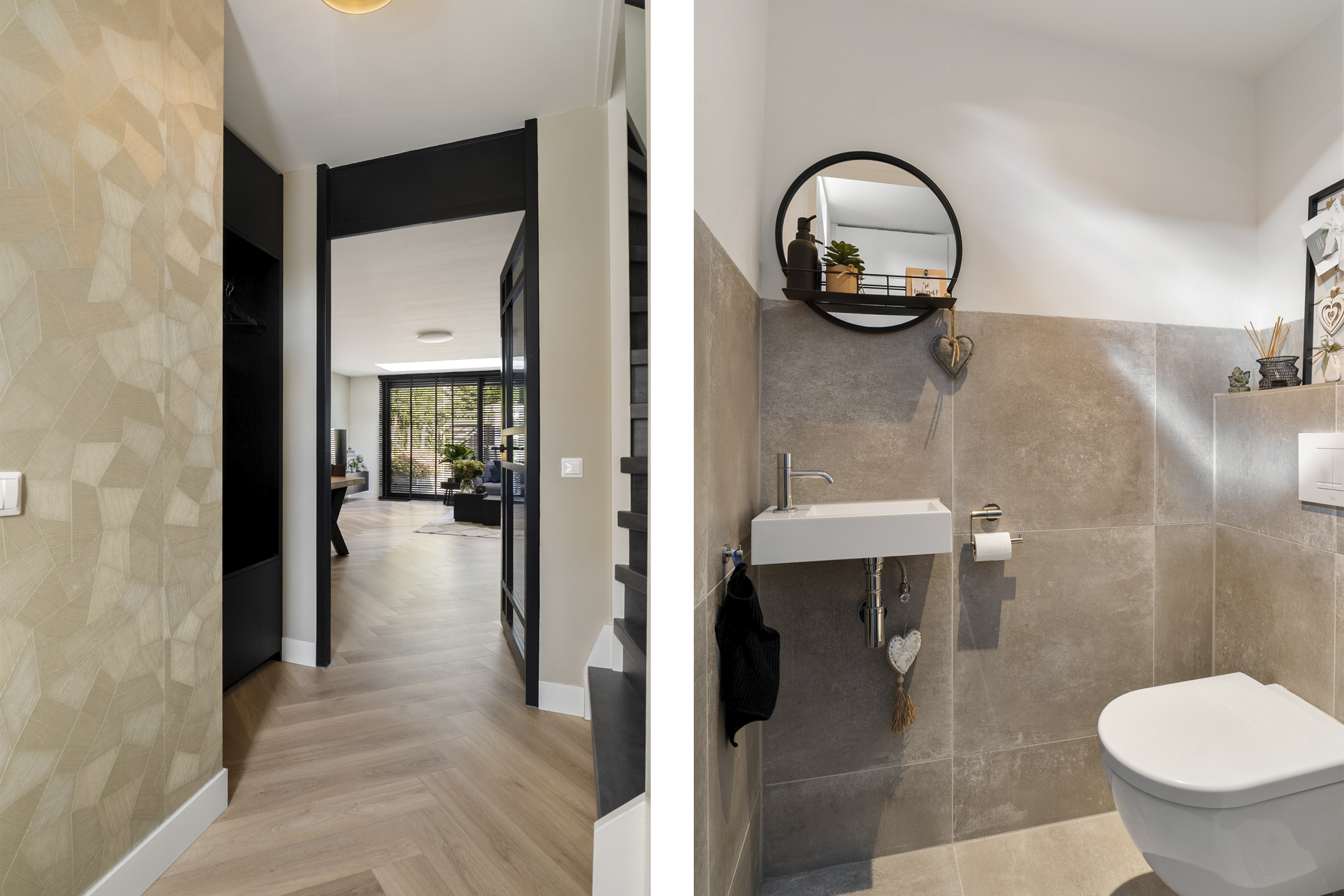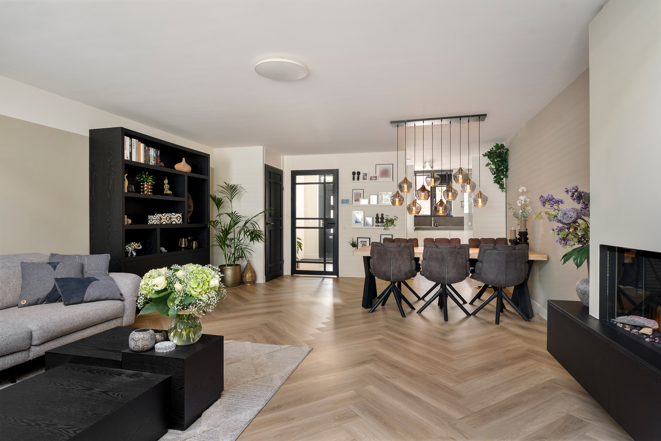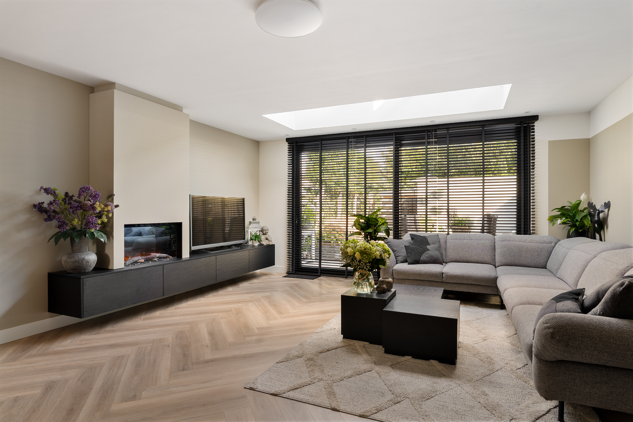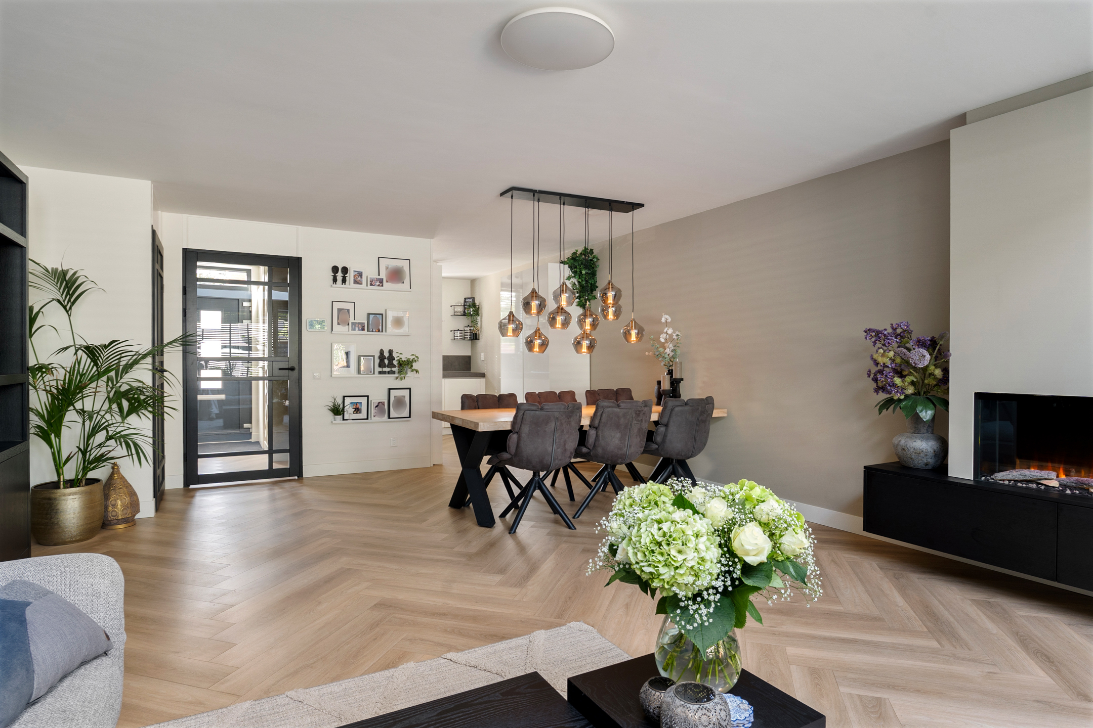 Binnenkomen doe je via de nieuwe voordeur (vernieuwd in 2023). De hal is ruim opgezet met meterkast en een modern toilet (vernieuwd in 2020). De uitgebouwde woonkamer is het hart van het huis: een lichte en sfeervolle ruimte met een prachtige lichtstraat, een strakke elektrische haard en een schuifpui voorzien van triple glass naar de achtertuin.