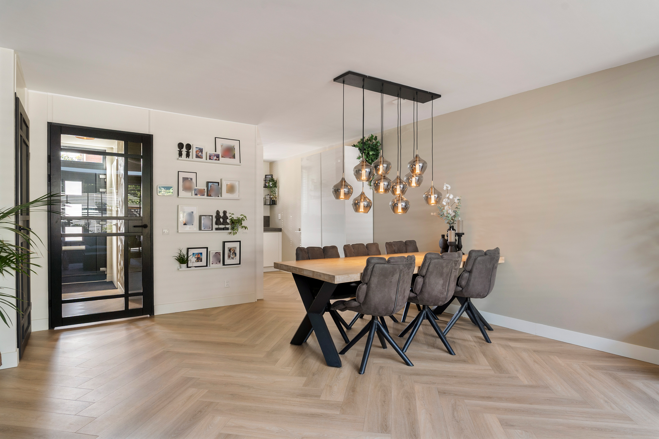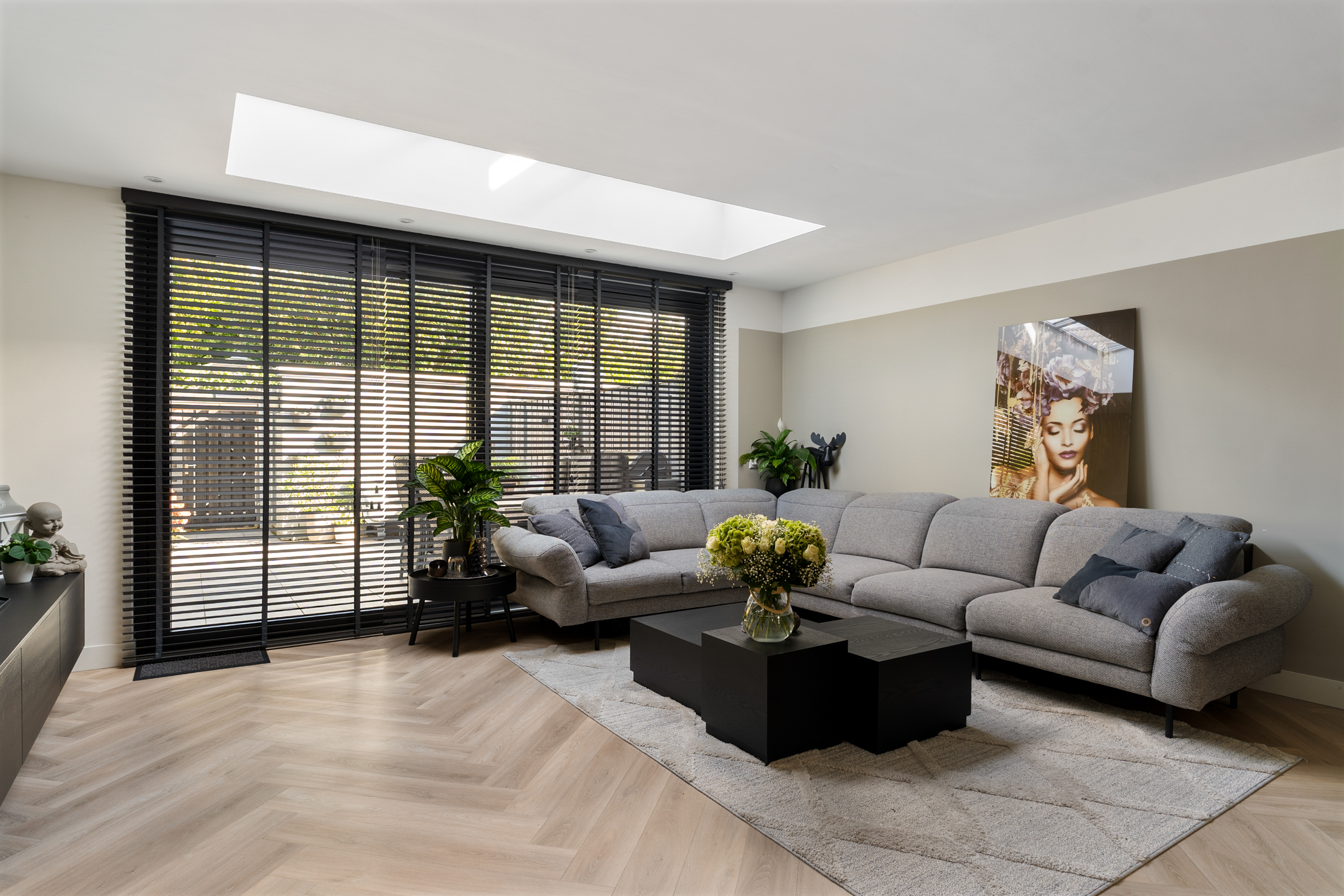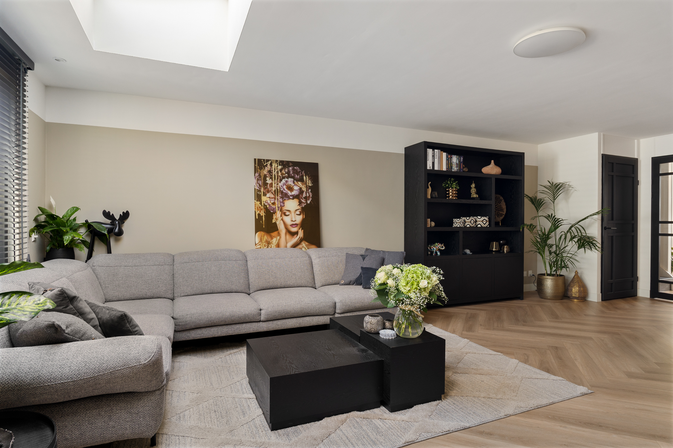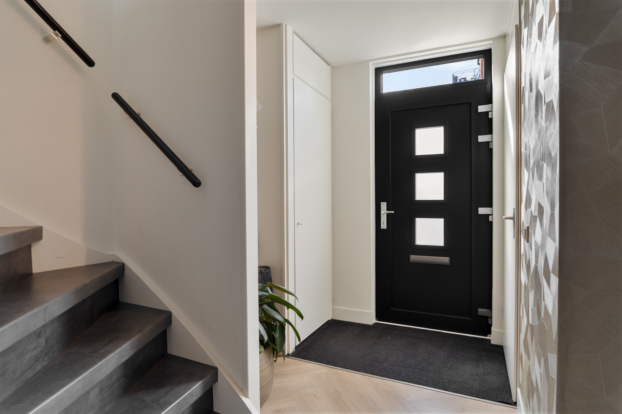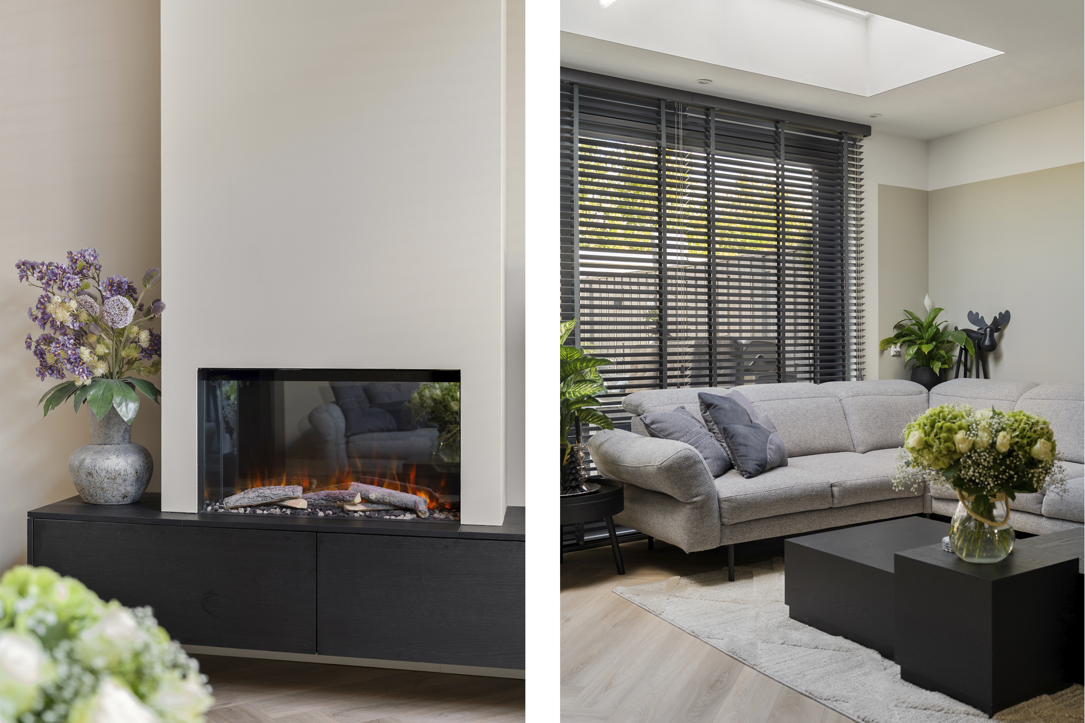 Binnenkomen doe je via de nieuwe voordeur (vernieuwd in 2023). De hal is ruim opgezet met meterkast en een modern toilet (vernieuwd in 2020). De uitgebouwde woonkamer is het hart van het huis: een lichte en sfeervolle ruimte met een prachtige lichtstraat, een strakke elektrische haard en een schuifpui voorzien van triple glass naar de achtertuin.