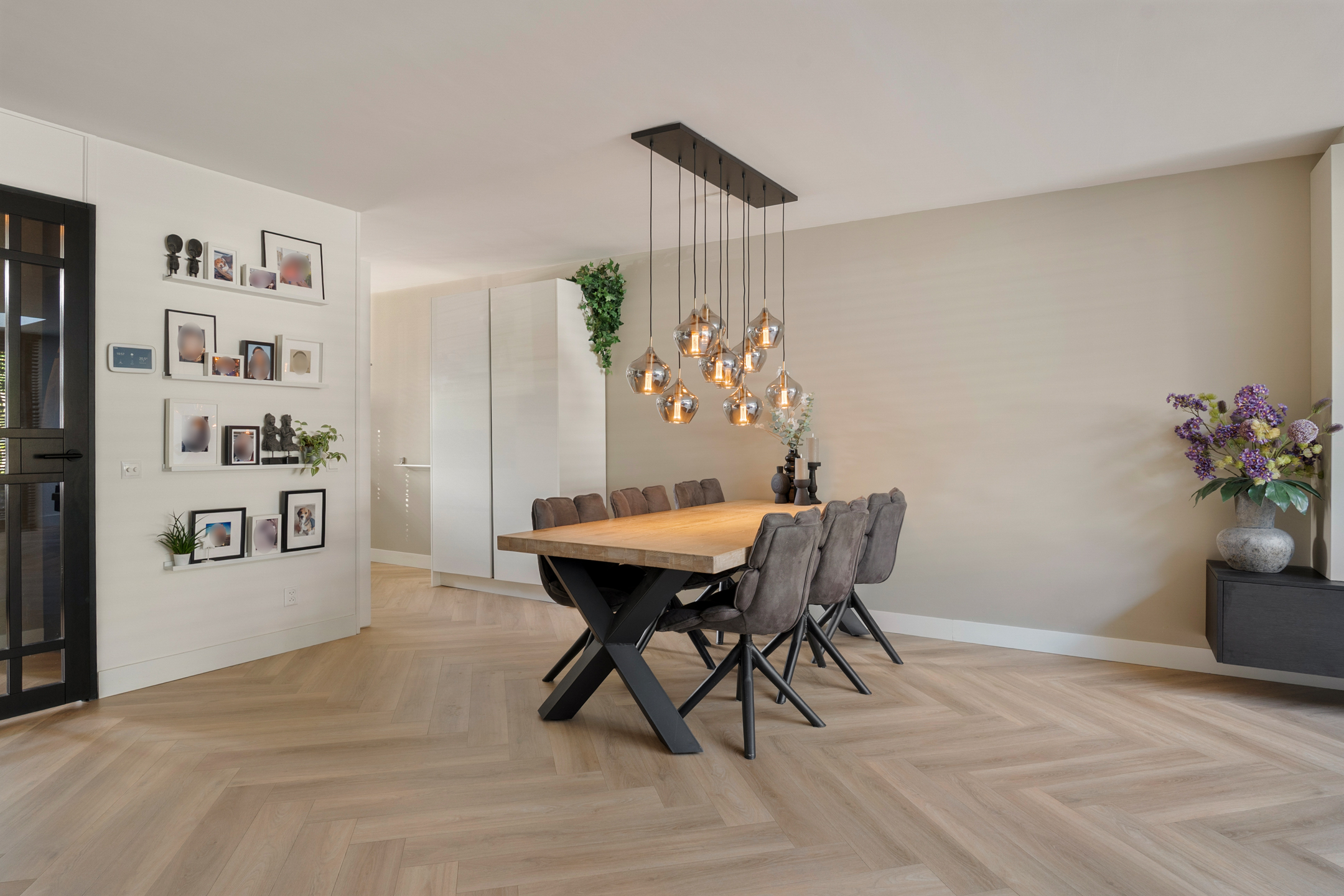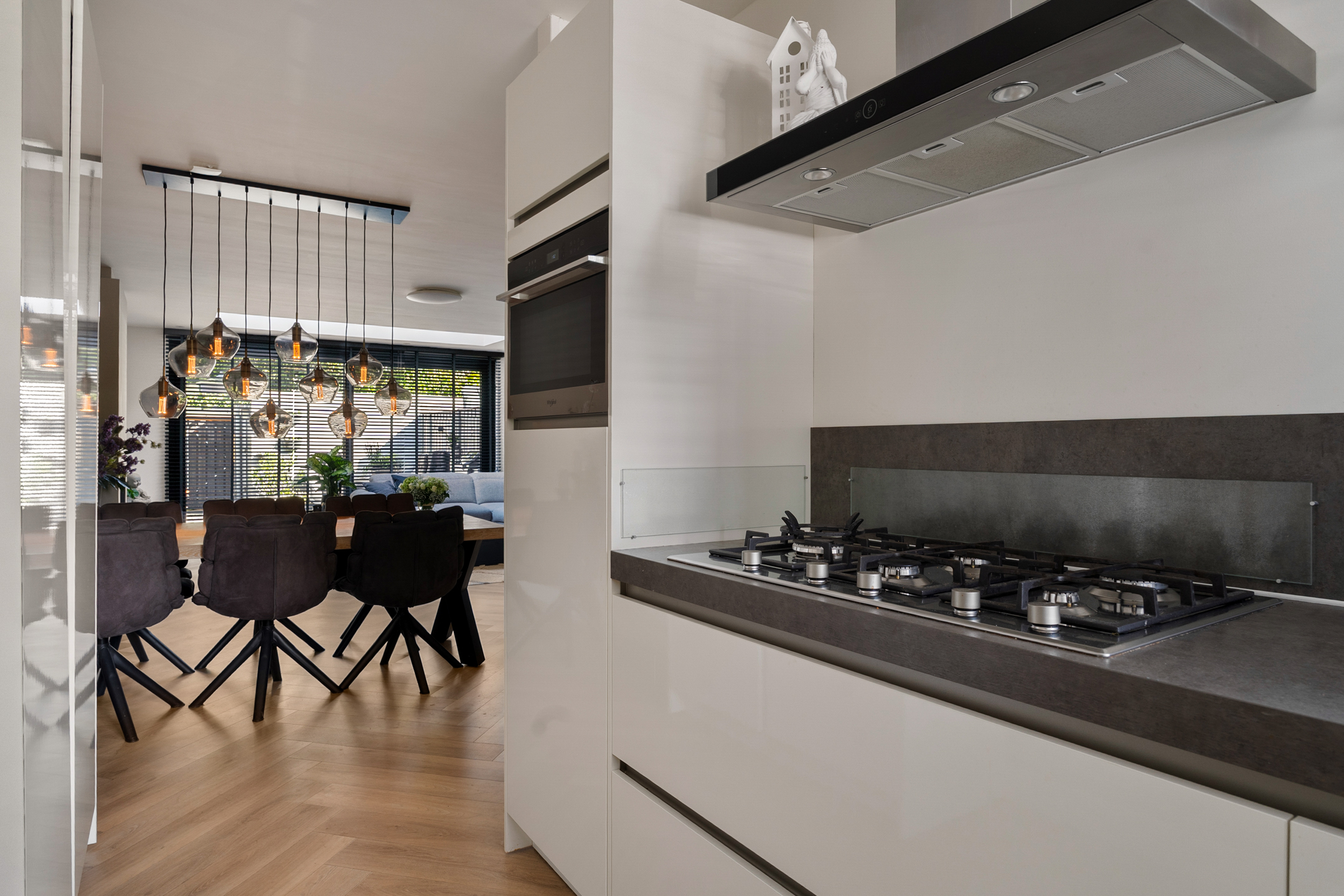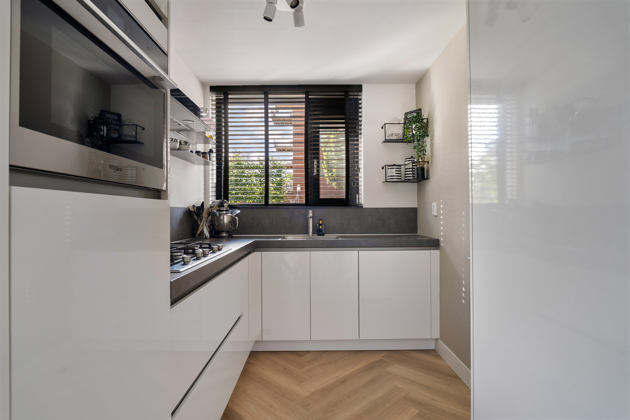 De stijlvolle PVC-vloer in visgraatmotief en de vloerverwarming maken het plaatje compleet. Aan de voorzijde ligt de open keuken in L-opstelling. Deze is in 2020 vernieuwd en voorzien van hoogwaardige inbouwapparatuur zoals een vijfpits gaskookplaat, combi-oven, afzuigkap, vaatwasser en een 10-liter close-in boiler voor direct warm water. Alles is strak afgewerkt en klaar voor gebruik.