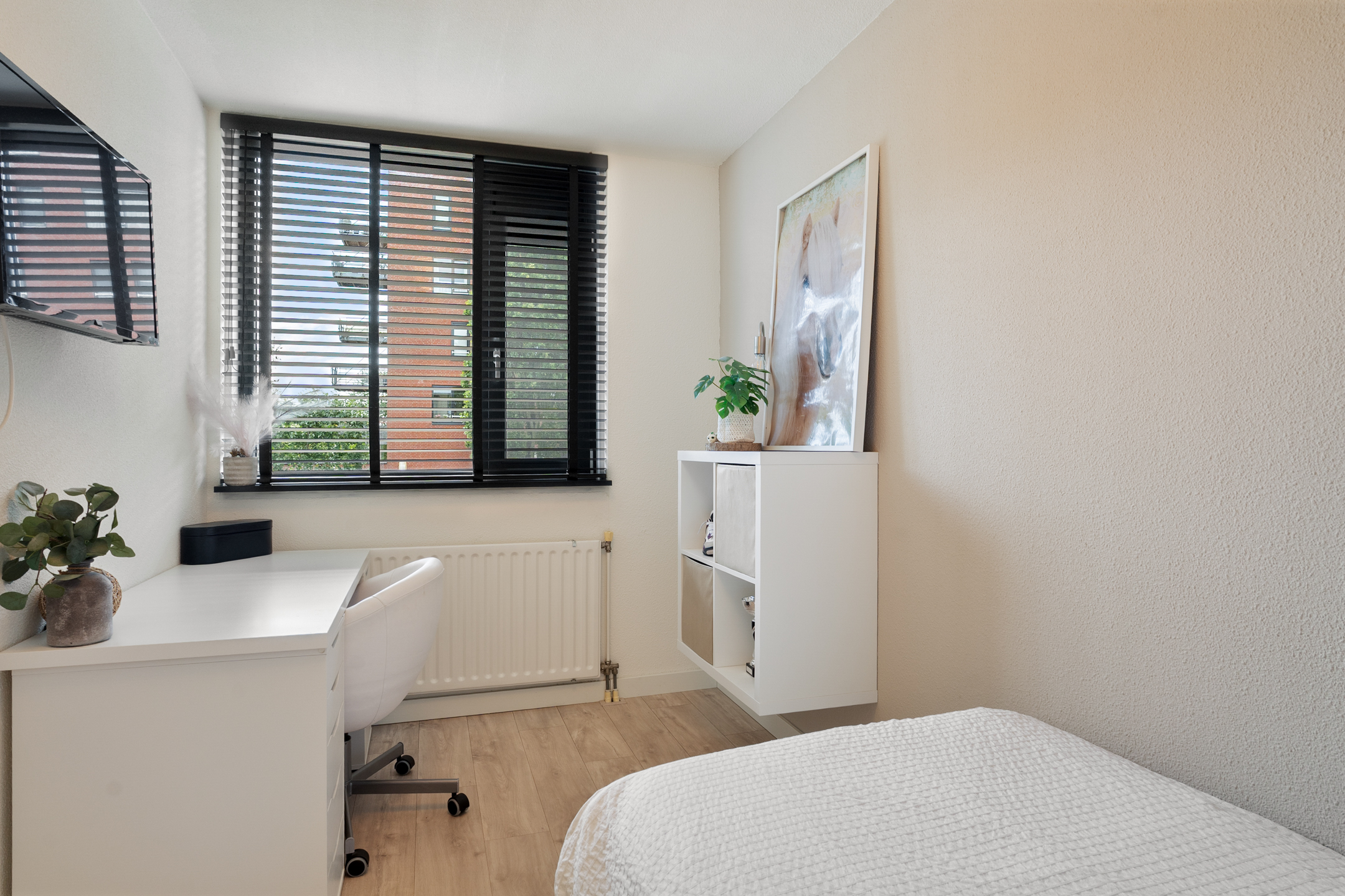 De tweede slaapkamer ligt aan de voorzijde. De badkamer is in 2020 vernieuwd en uitgevoerd met een ruime inloopdouche, dubbele wastafel met meubel, fraai tegelwerk en een tweede toilet.