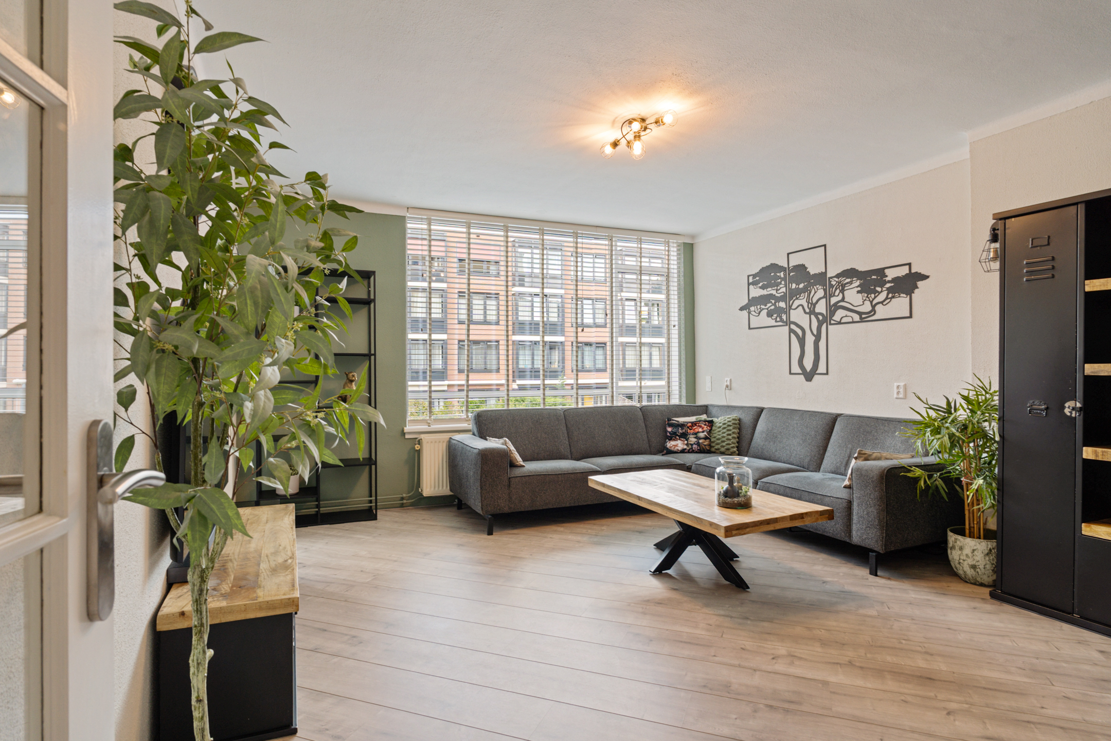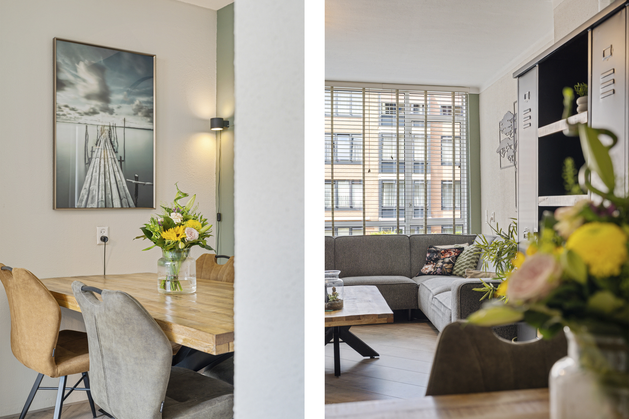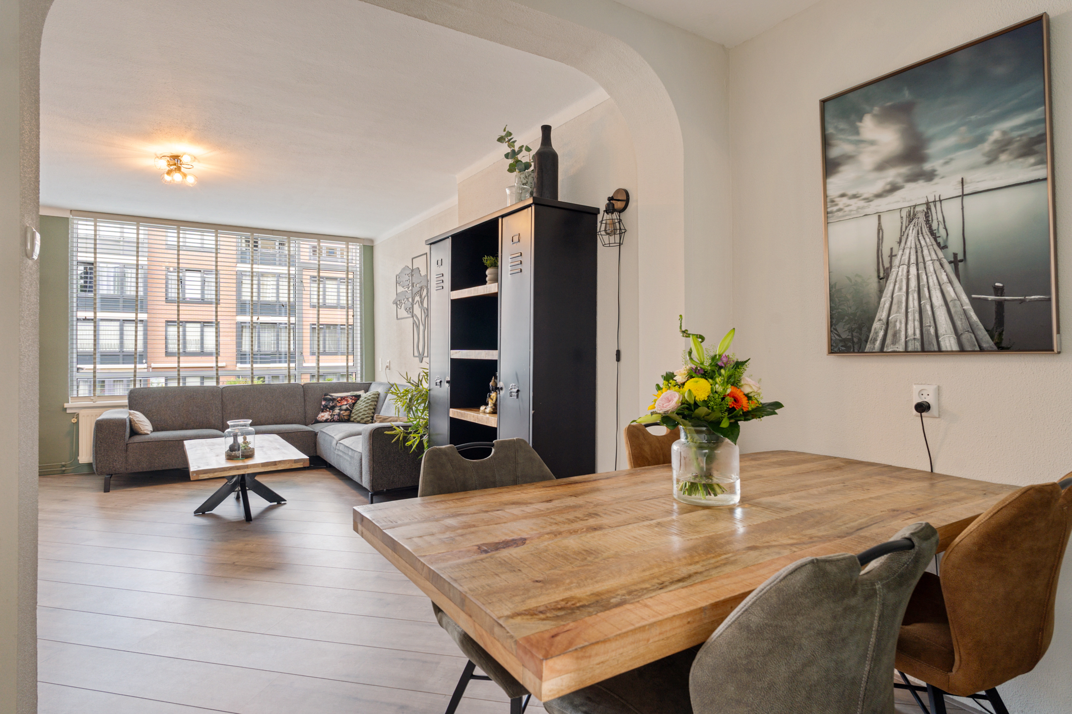 Vanuit de gang kom je via de openslaande deuren in de lichte woonkamer met grote raampartijen. De huidige indeling is slim aangepast: een deel van de voormalige slaapkamer is bij de woonkamer betrokken, waardoor er een gezellige eethoek is ontstaan. Via deze eethoek heb je toegang tot een slaapkamer, die iets compacter is gemaakt, maar nog steeds praktisch in te delen.