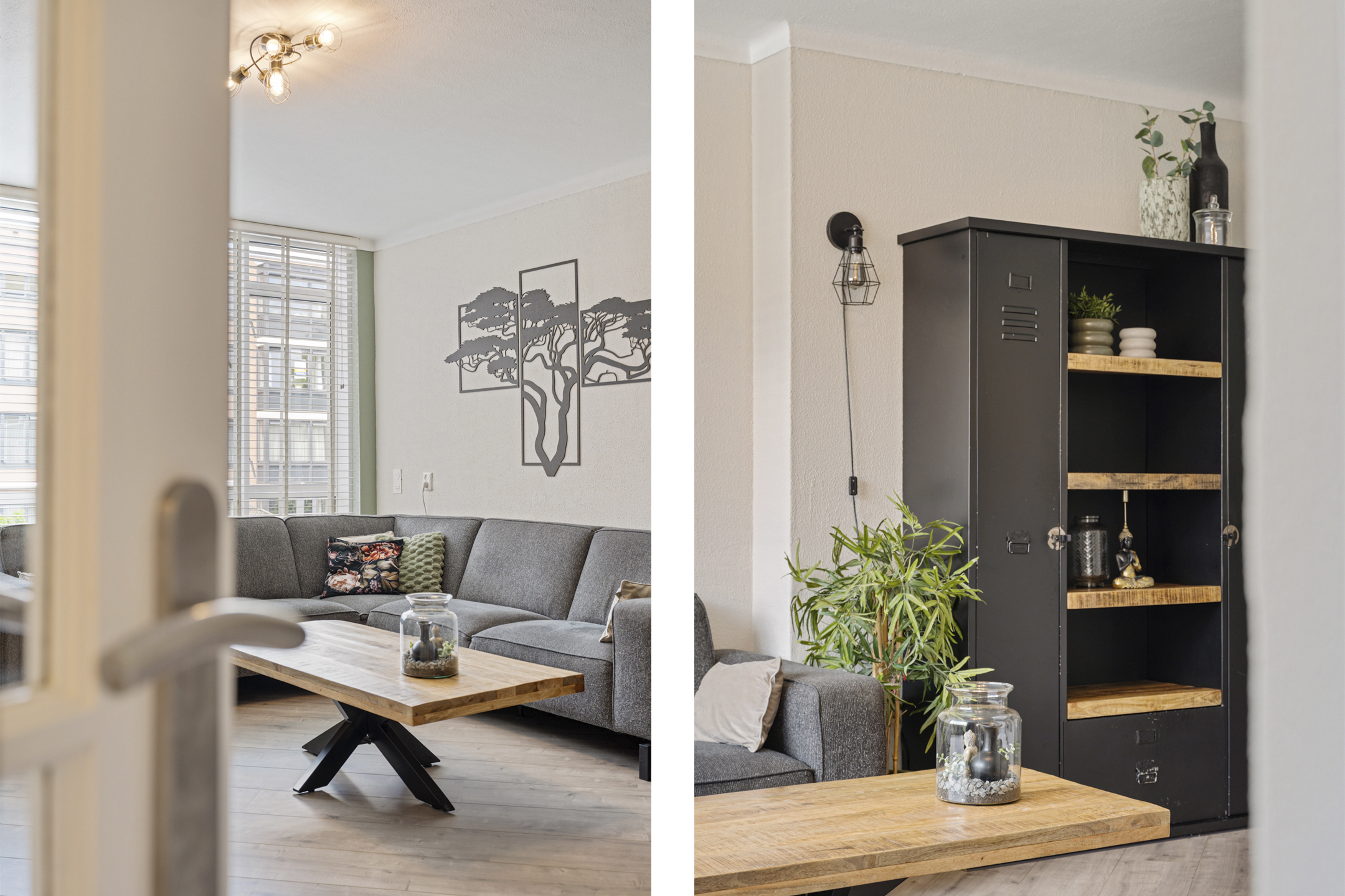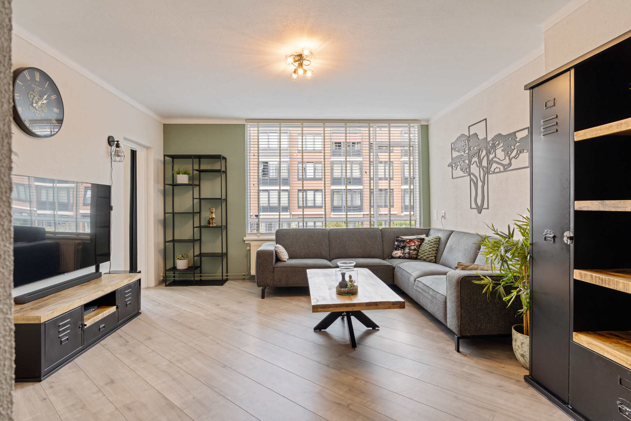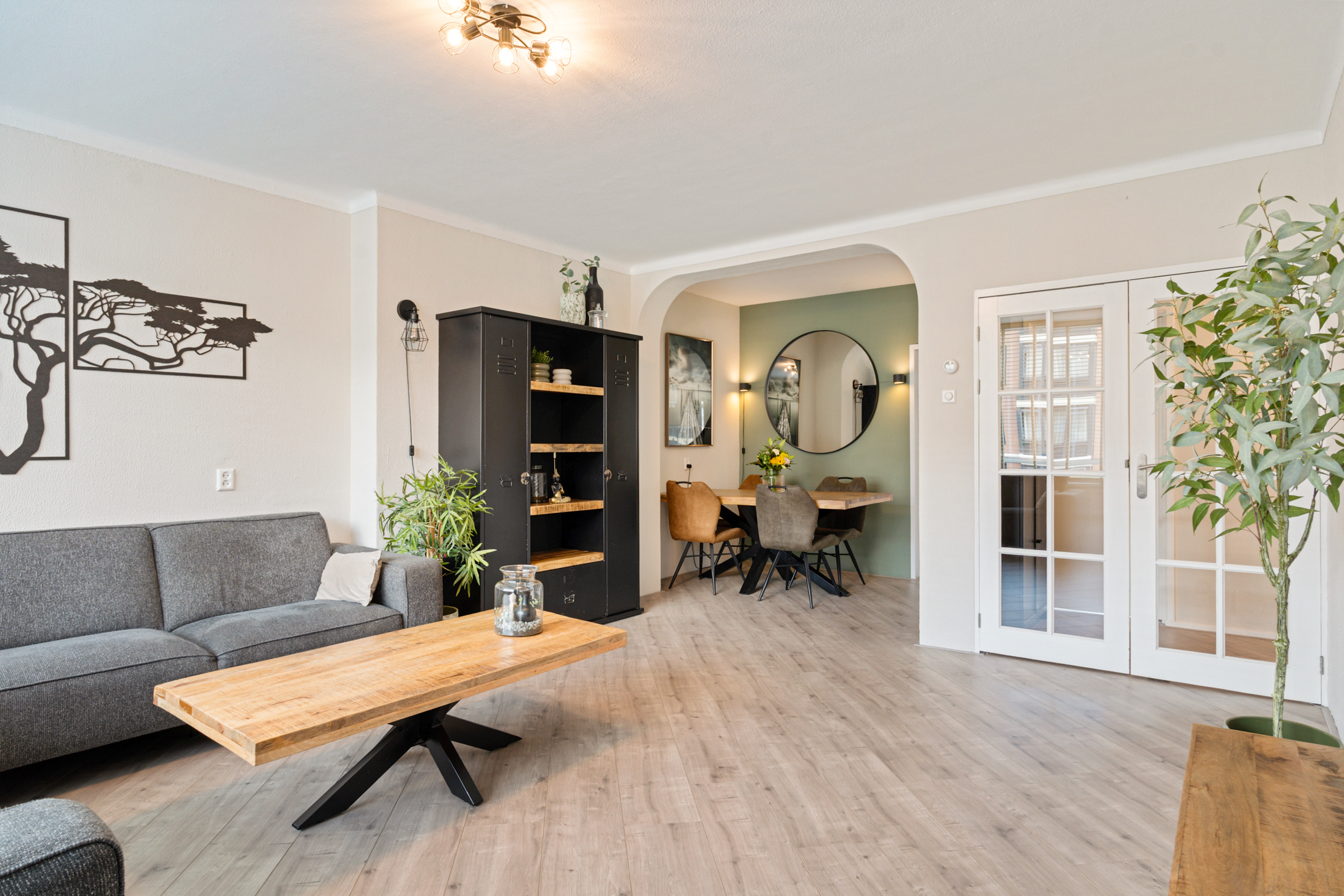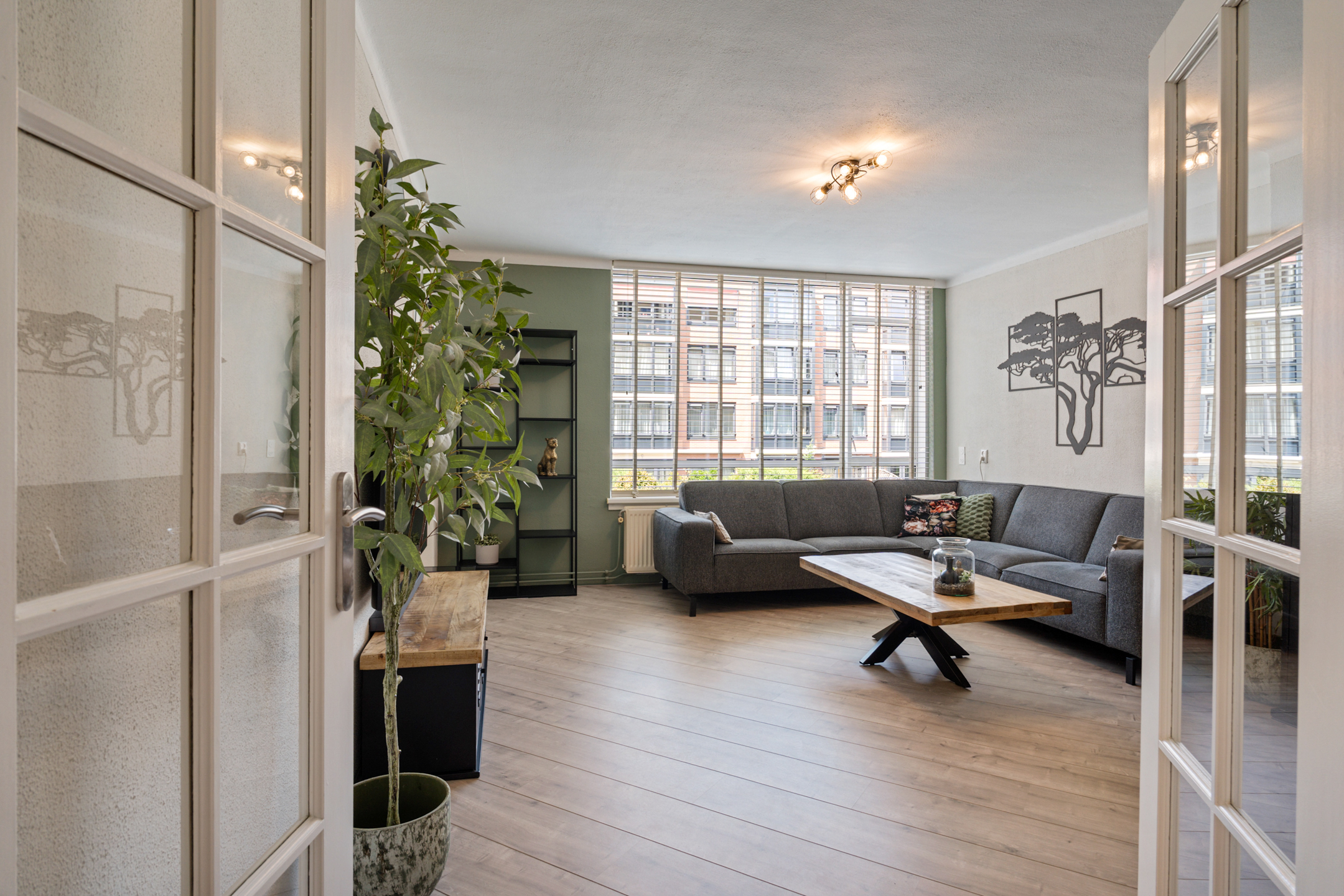 Vanuit de gang kom je via de openslaande deuren in de lichte woonkamer met grote raampartijen. De huidige indeling is slim aangepast: een deel van de voormalige slaapkamer is bij de woonkamer betrokken, waardoor er een gezellige eethoek is ontstaan. Via deze eethoek heb je toegang tot een slaapkamer, die iets compacter is gemaakt, maar nog steeds praktisch in te delen.