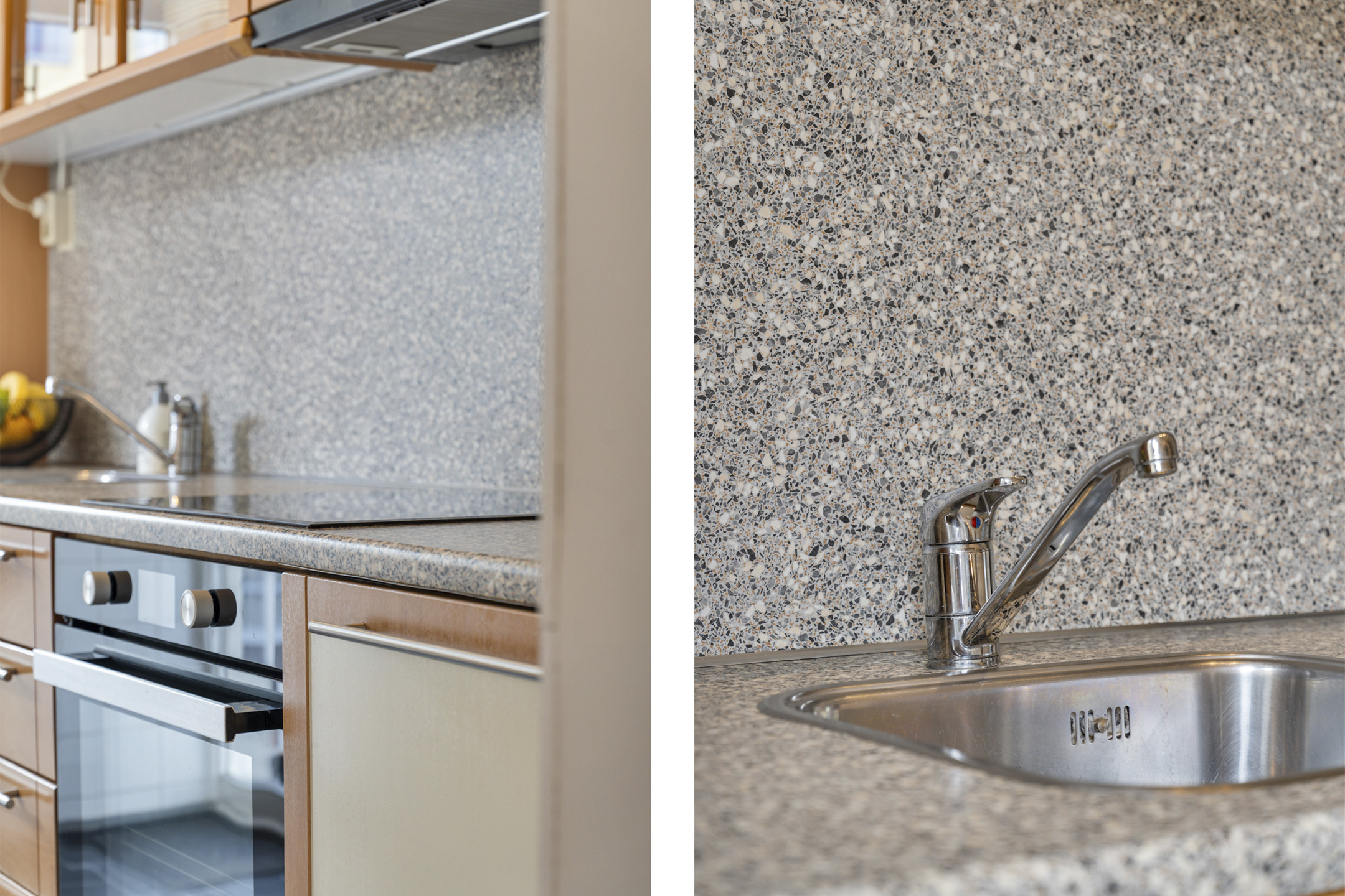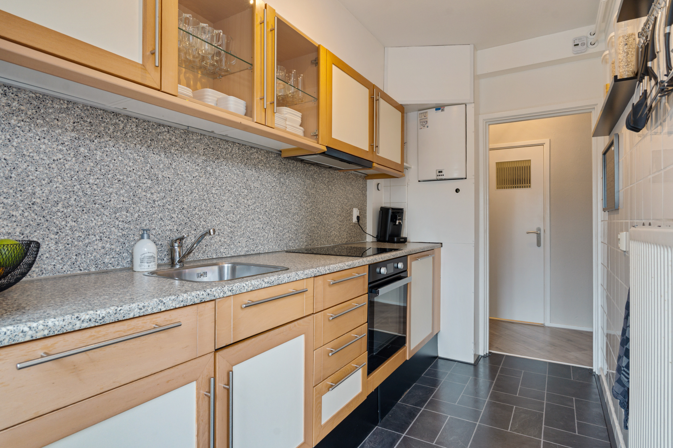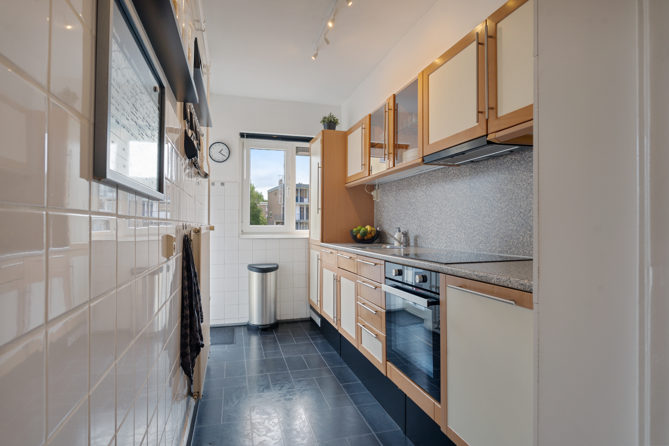 De keuken aan de achterzijde is praktisch ingericht en voorzien van diverse inbouwapparatuur. Hier beschik je over een inductiekookplaat, koel-/vriescombinatie, elektrische oven, vaatwasser (vernieuwd in 2025) en voldoende opbergruimte. Ook vanuit de keuken is het balkon bereikbaar.