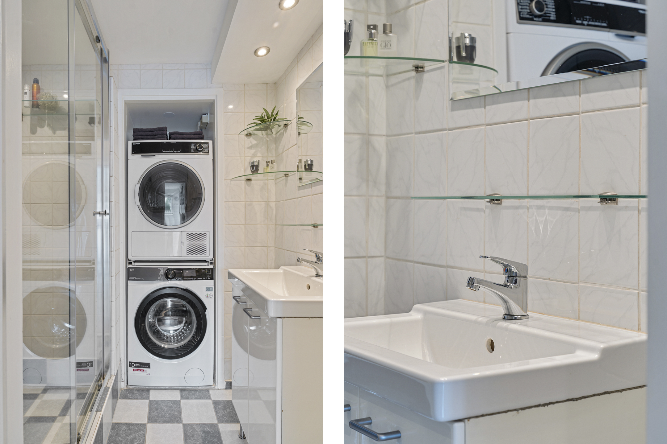 De badkamer is praktisch ingedeeld en volledig betegeld. Je vindt hier een ruime douchecabine, een wastafel en de aansluitingen voor de wasmachine en droger, die netjes zijn weggewerkt in een nis.