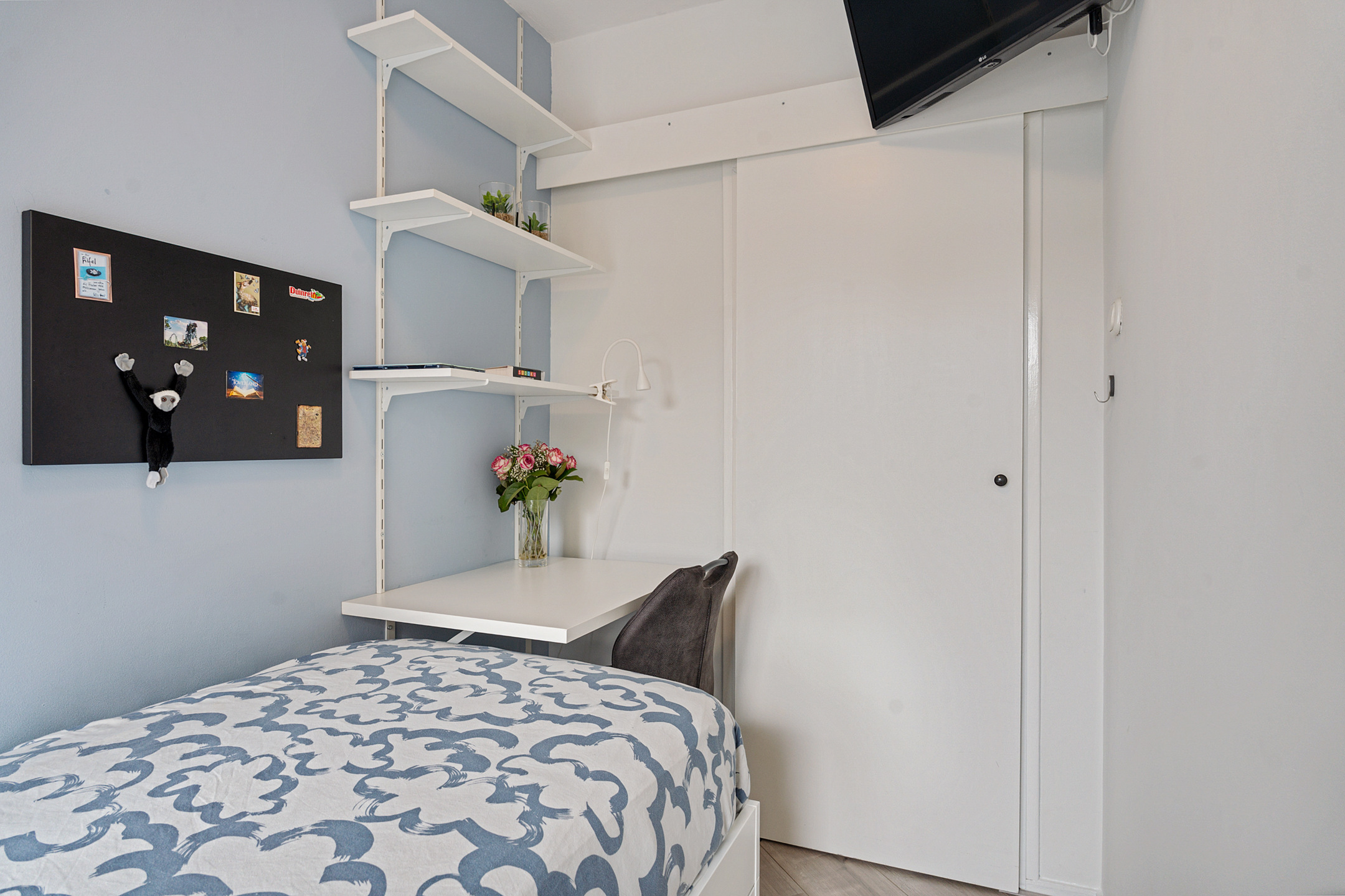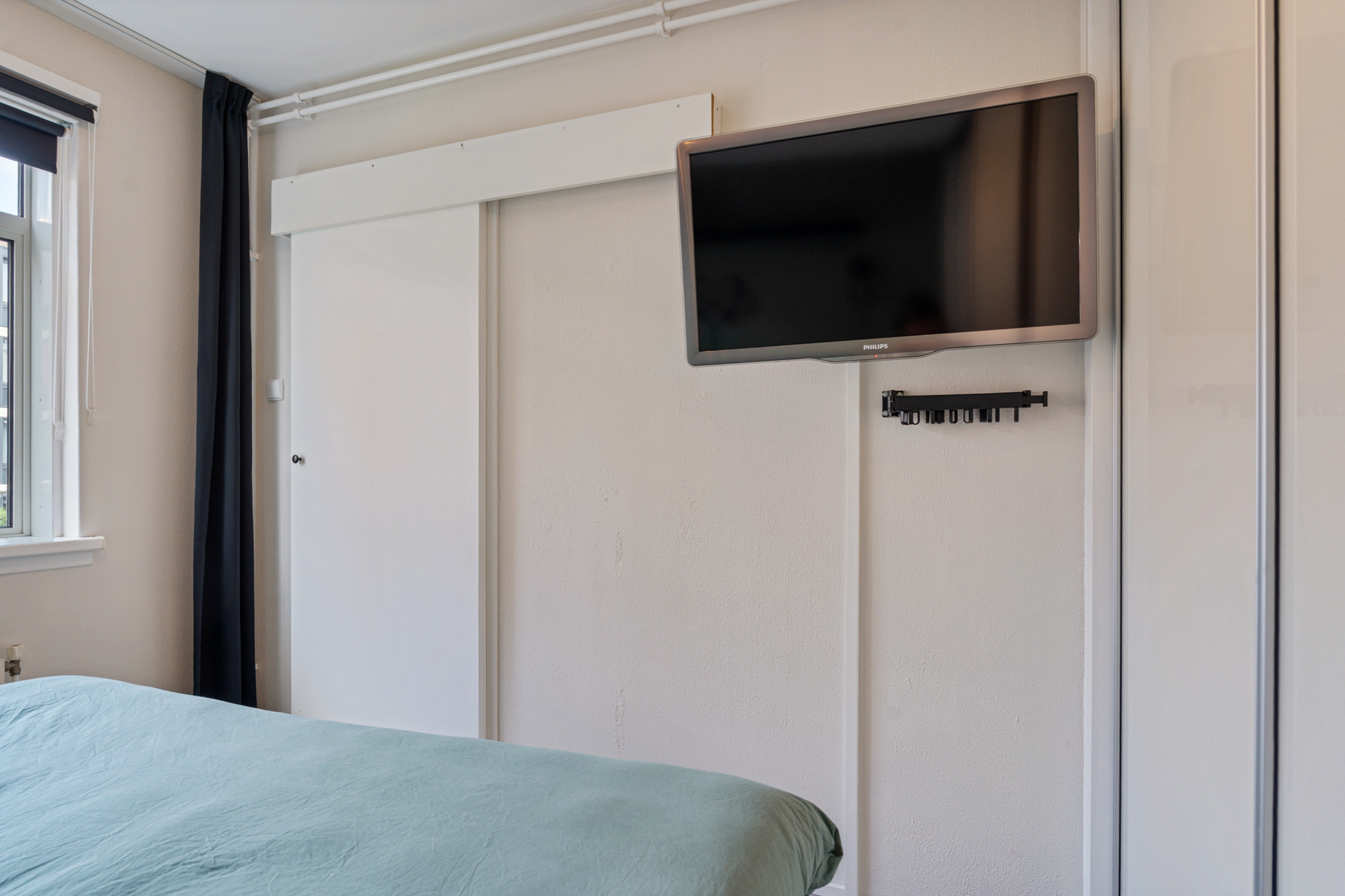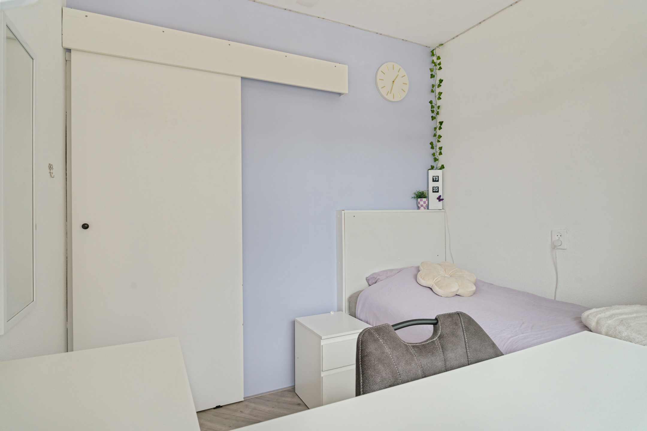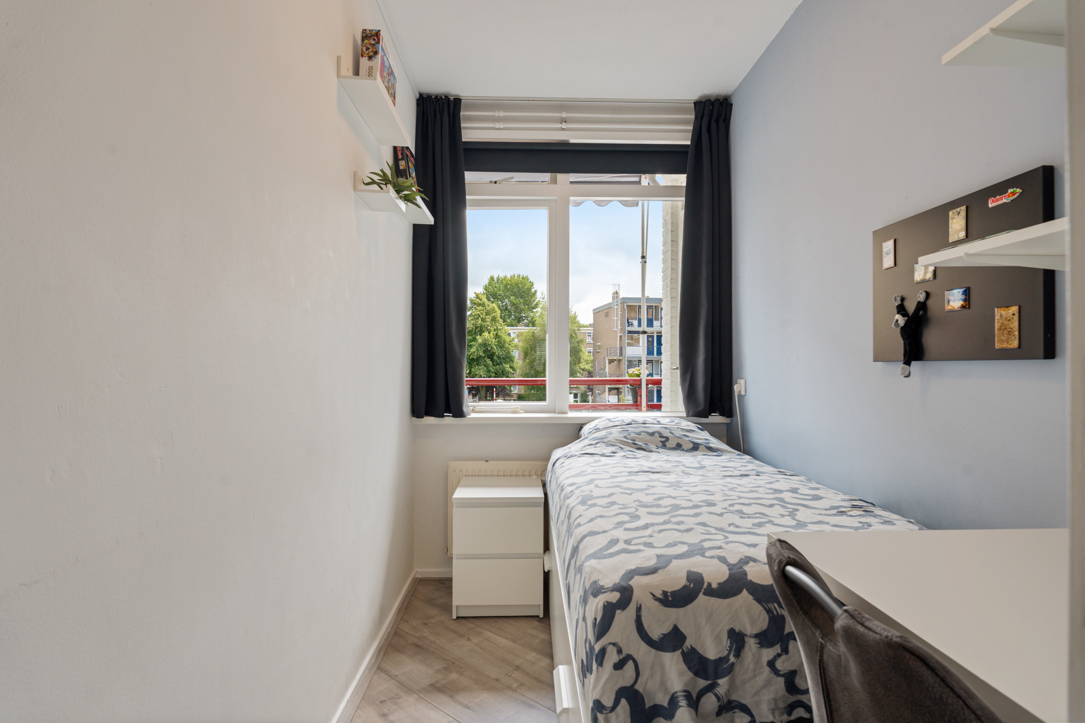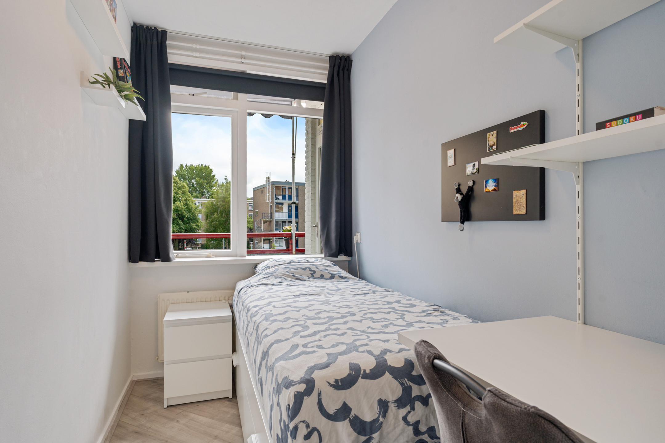 Naast de keuken ligt de tweede slaapkamer, die ideaal is als logeerkamer of werkkamer. De derde slaapkamer is opvallend licht en beschikt over een handige vaste kast
