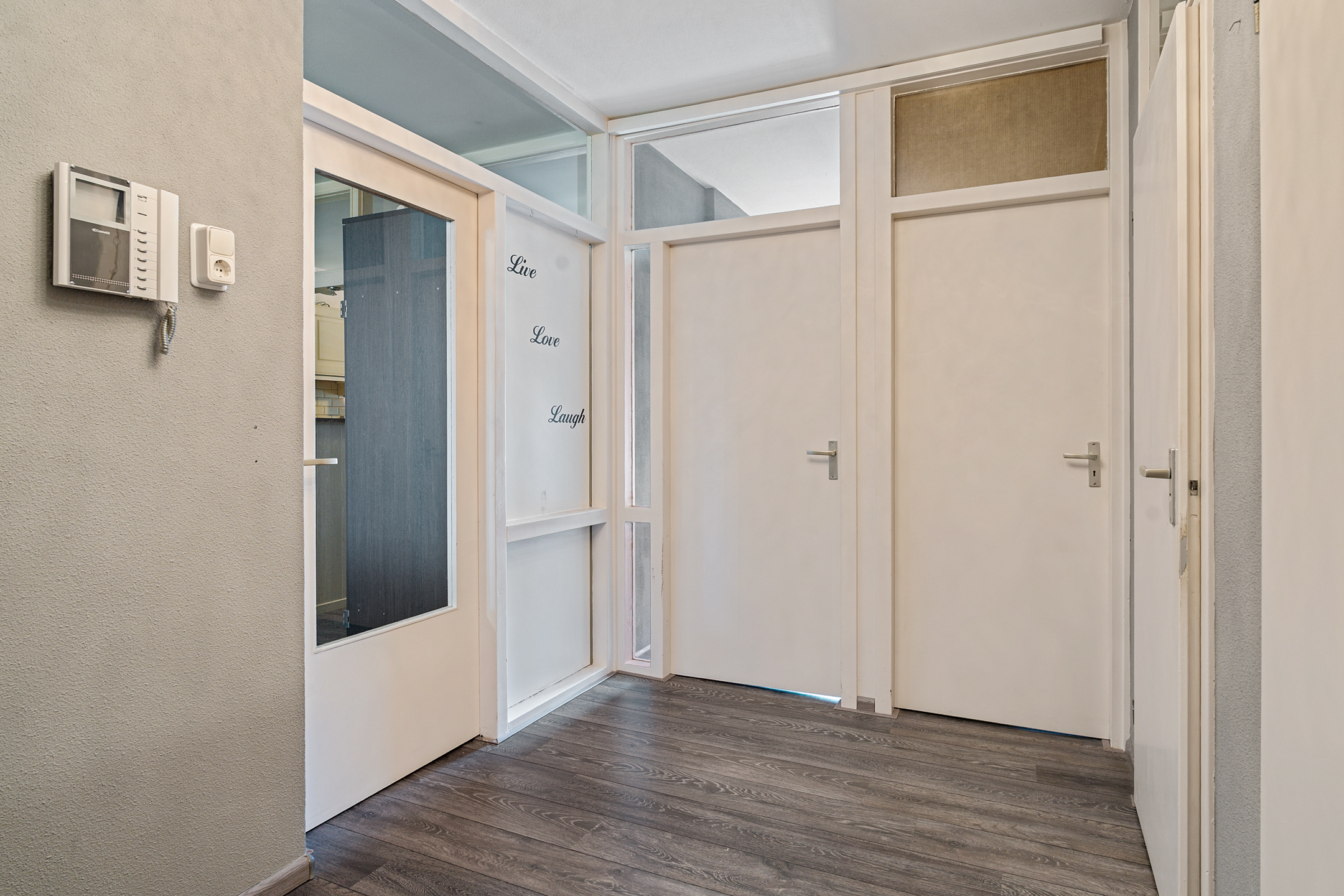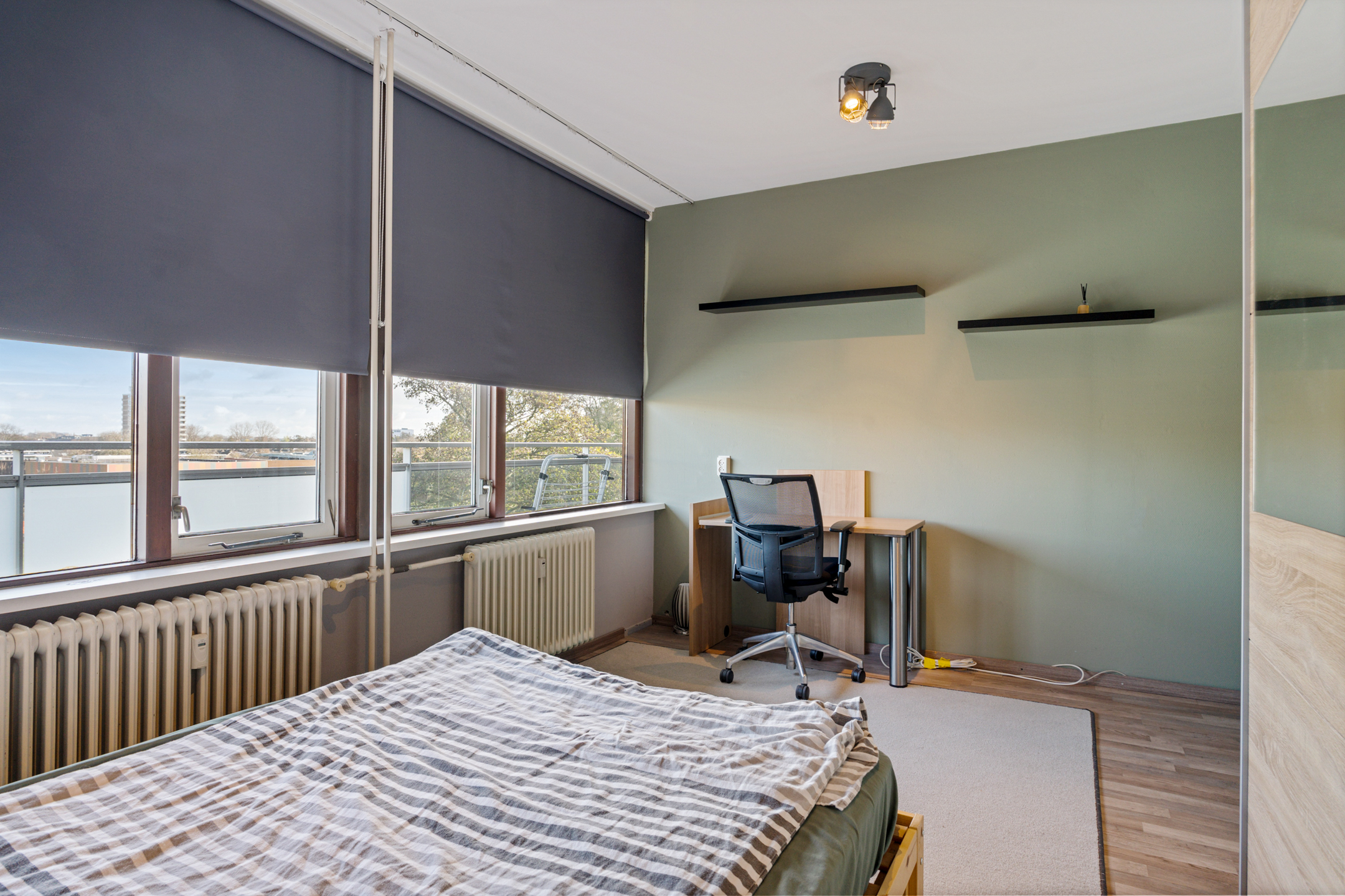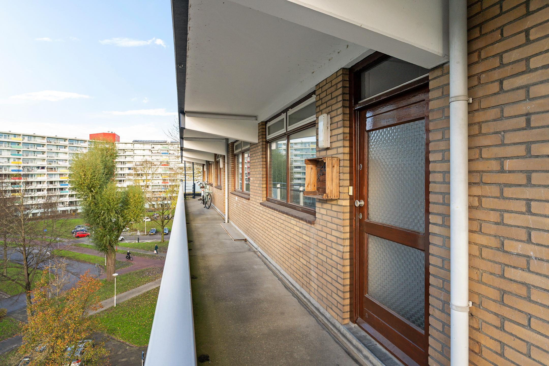 Via de galerij bereik je de entree van het appartement op de vijfde verdieping. De ruime hal geeft toegang tot alle vertrekken. Aan de voorzijde bevindt zich de eerste slaapkamer, ideaal als werk-, logeer- of kinderkamer. Aan de achterzijde ligt de tweede, royale slaapkamer.