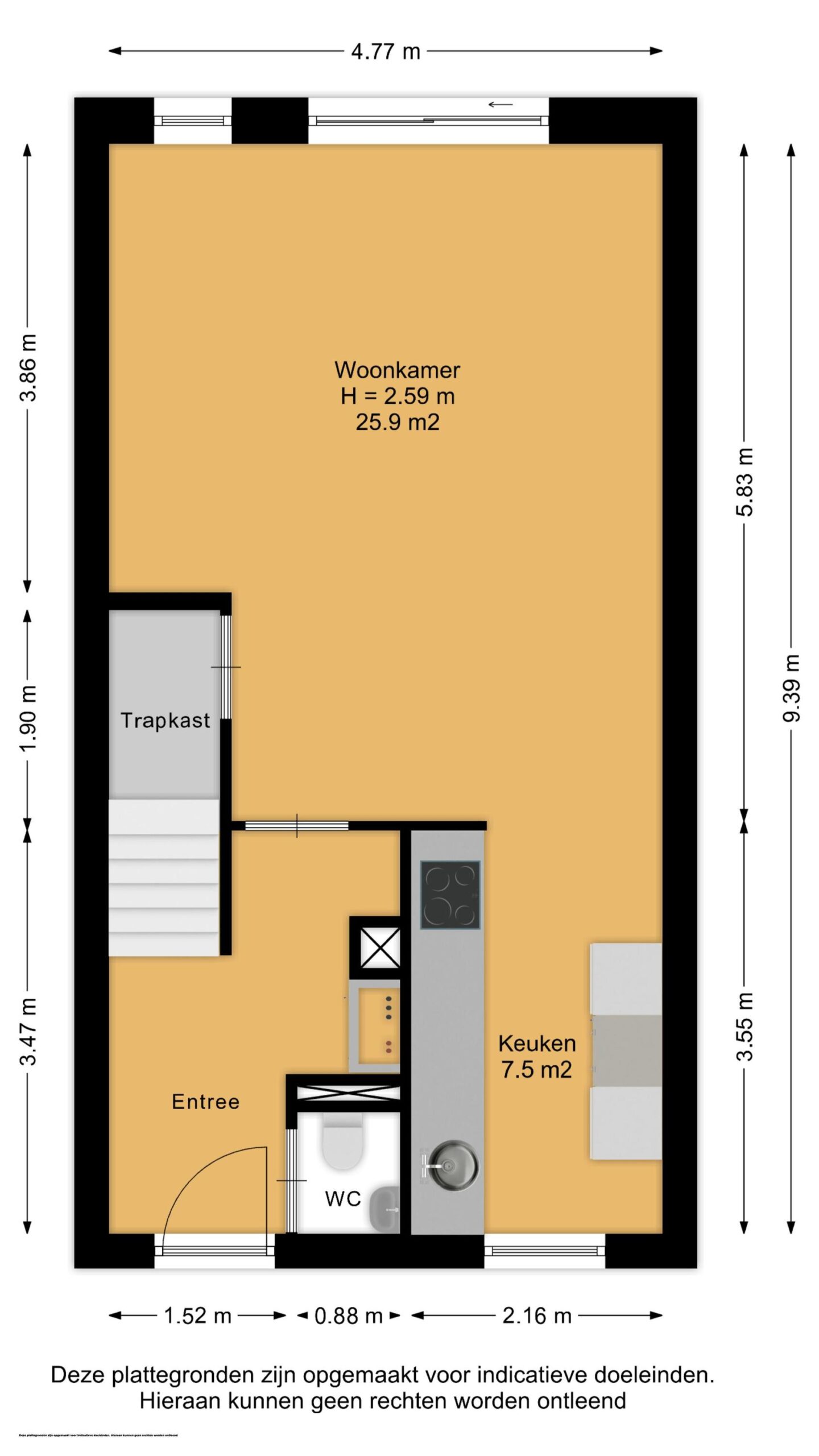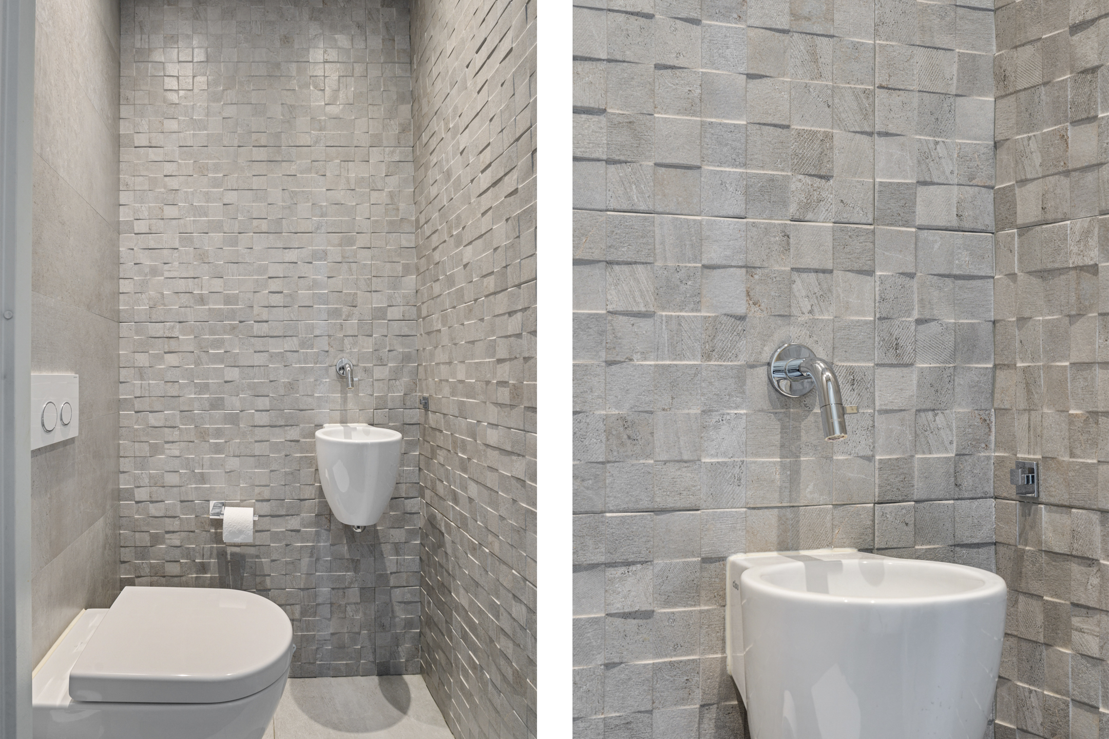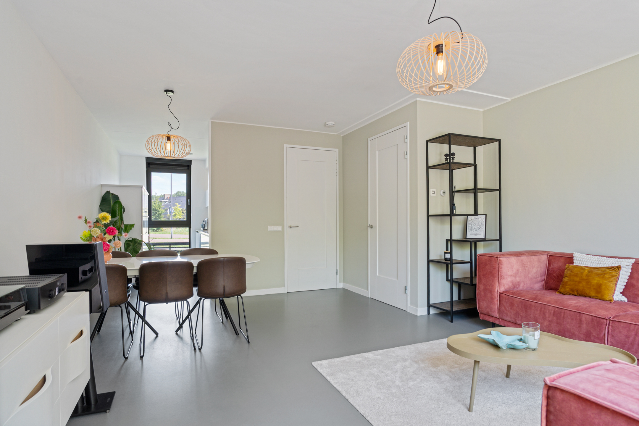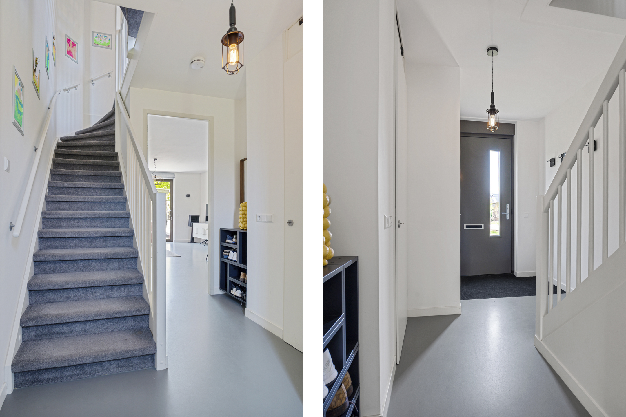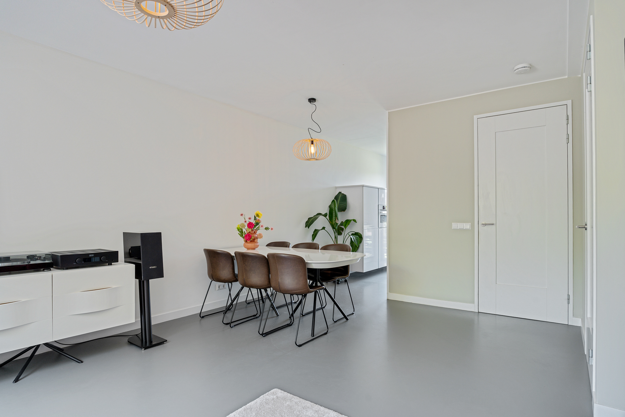Je komt binnen via de hal met modern betegeld toilet. Op de begane grond ligt een stijlvolle gietvloer met vloerverwarming die zorgt voor een strak en comfortabel geheel. De ruime woonkamer en open keuken vormen samen een lichte, uitnodigende leefruimte.