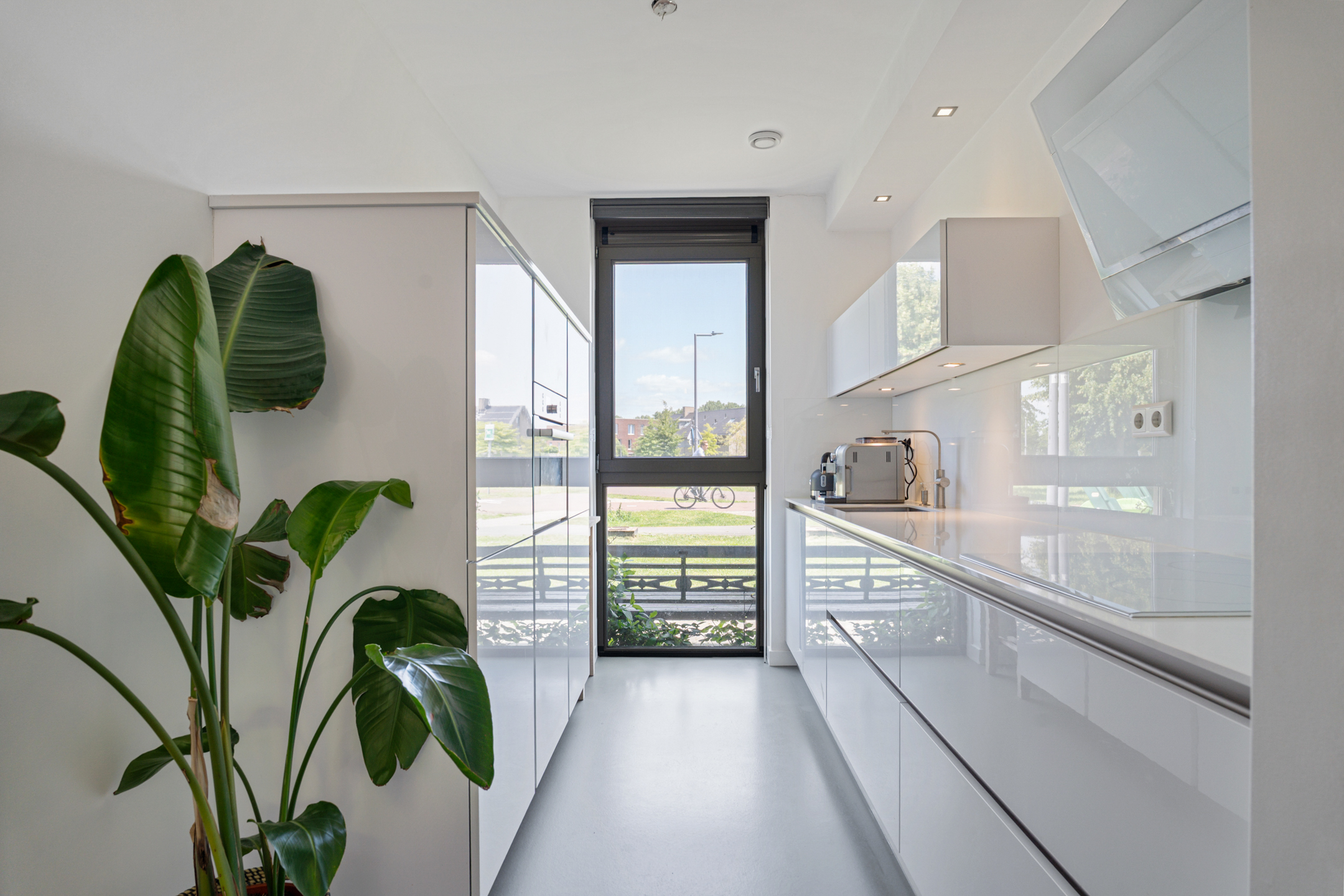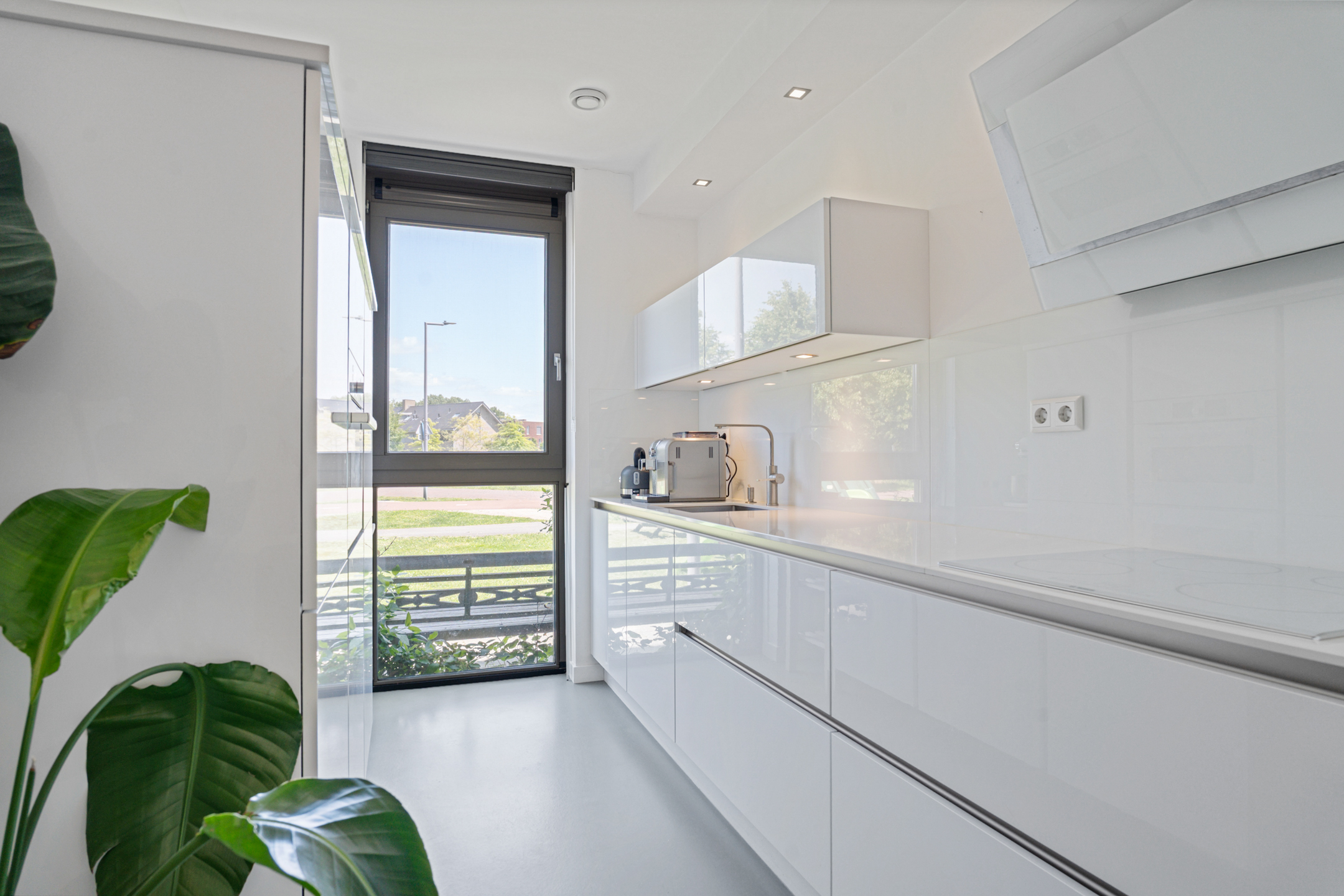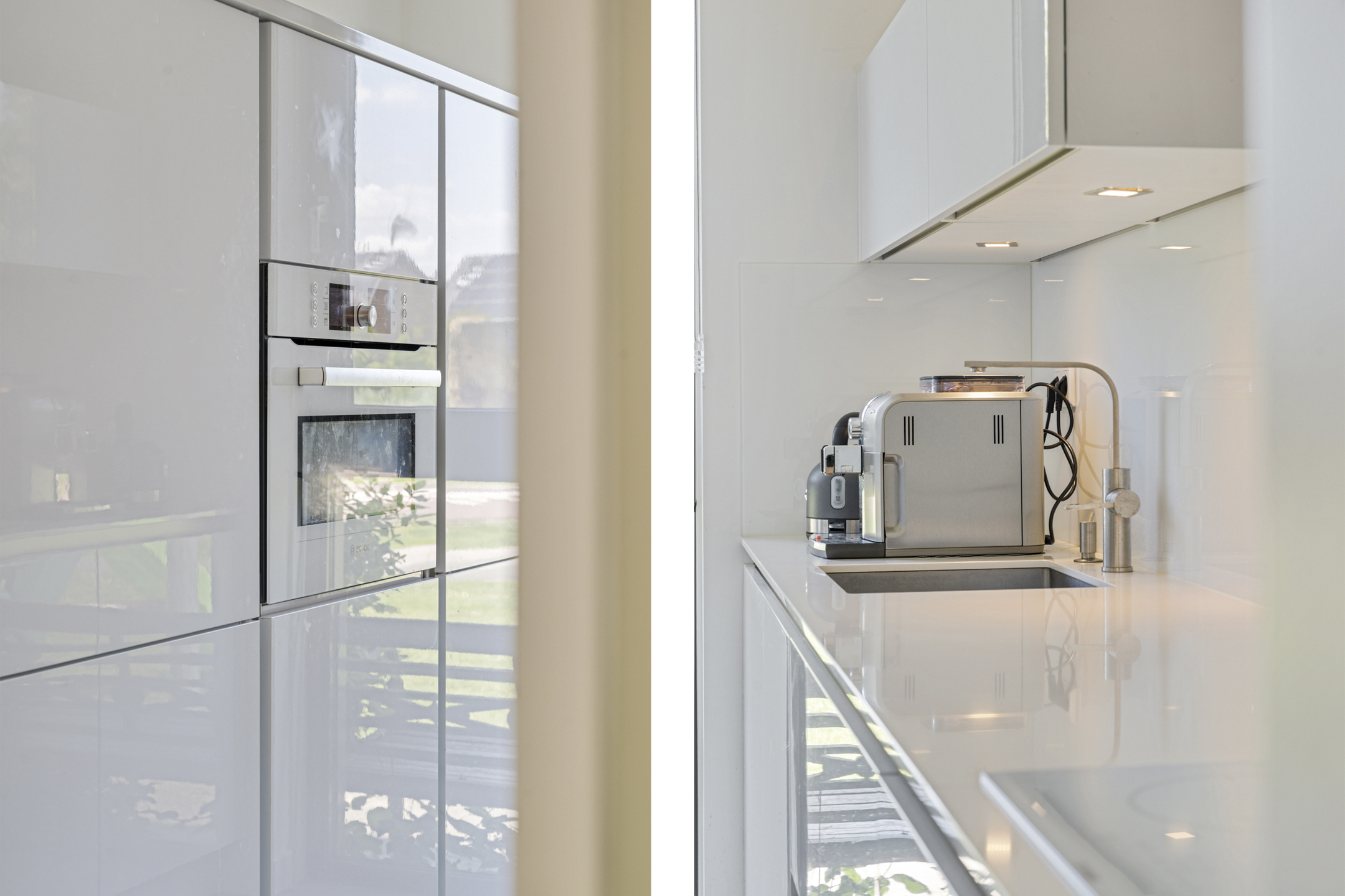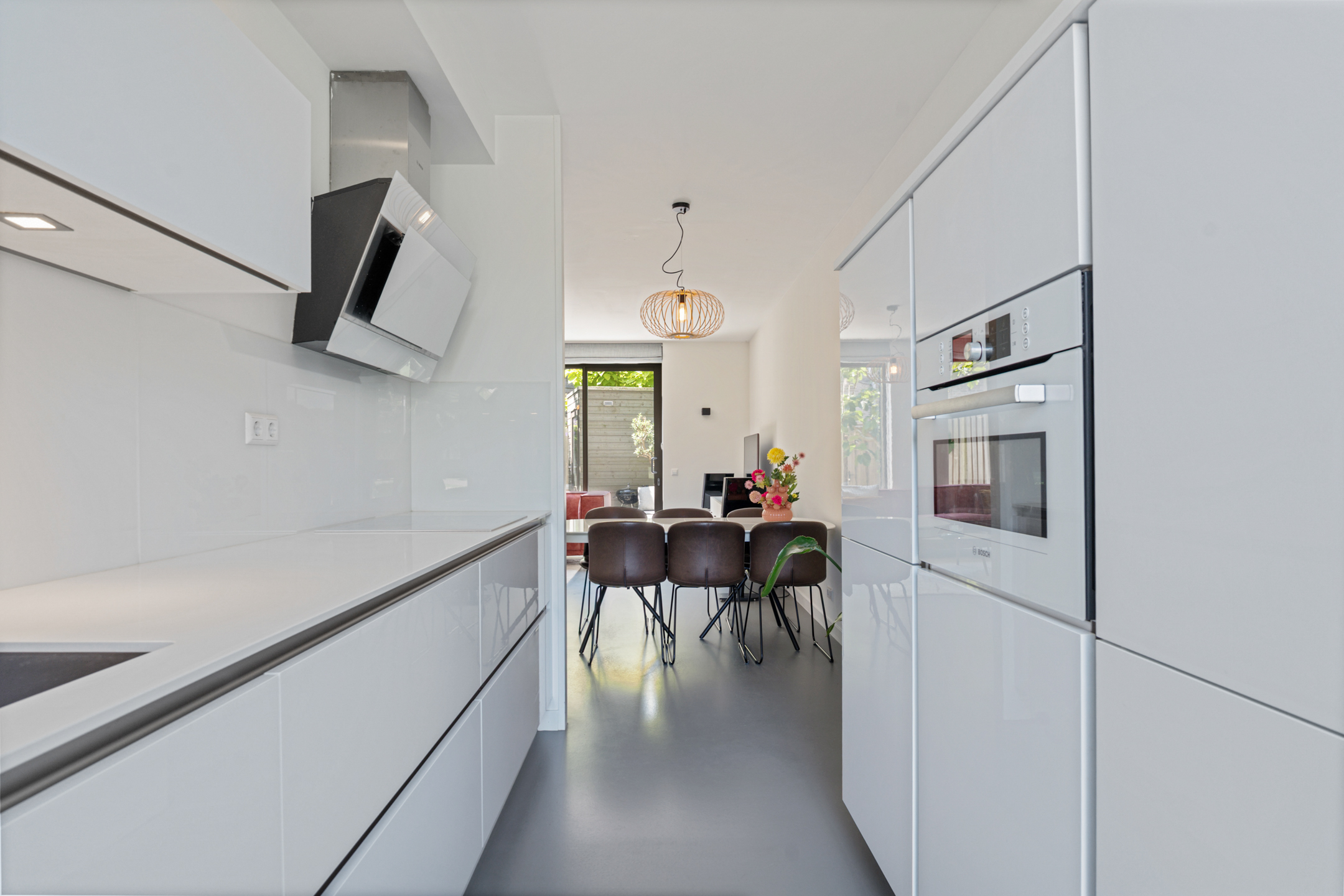 Aan de voorzijde vind je de strak vormgegeven keuken met witte fronten en hoogwaardige inbouwapparatuur: een inductiekookplaat, combi-oven, vaatwasser, koelkast, vriezer en volop opbergruimte. Dankzij de grote raampartijen en schuifpui aan de achterzijde geniet je van veel daglicht en een directe verbinding met de tuin.