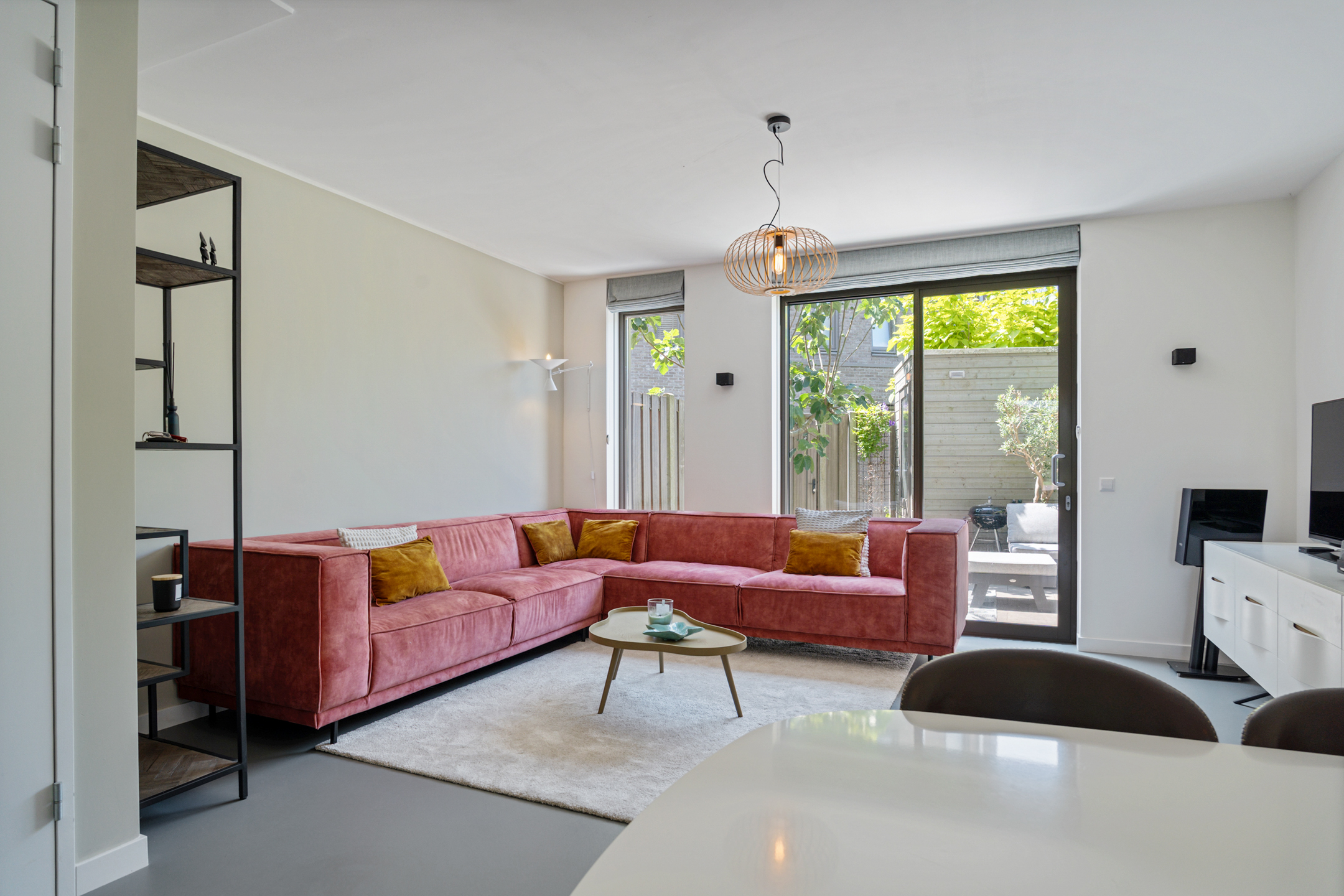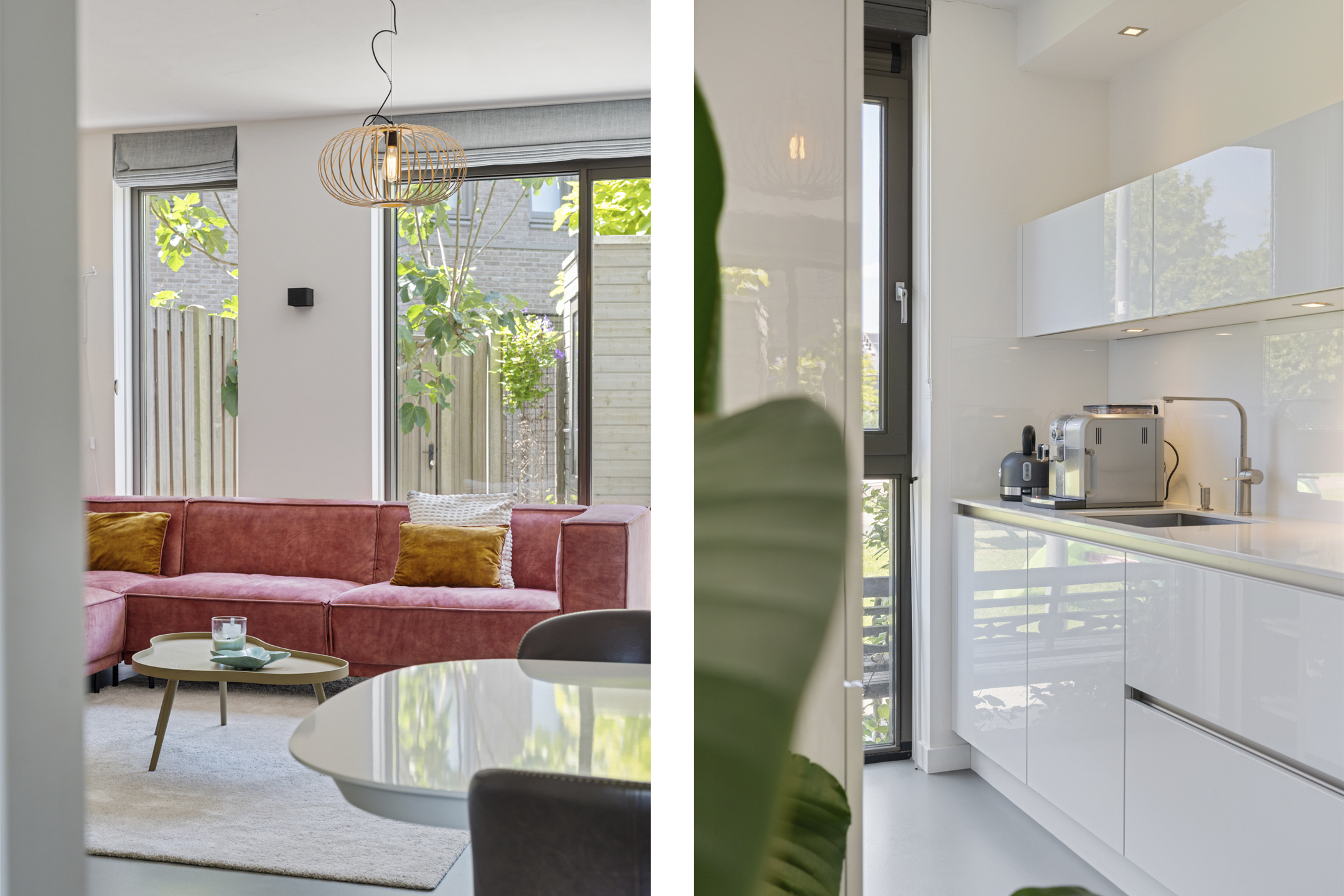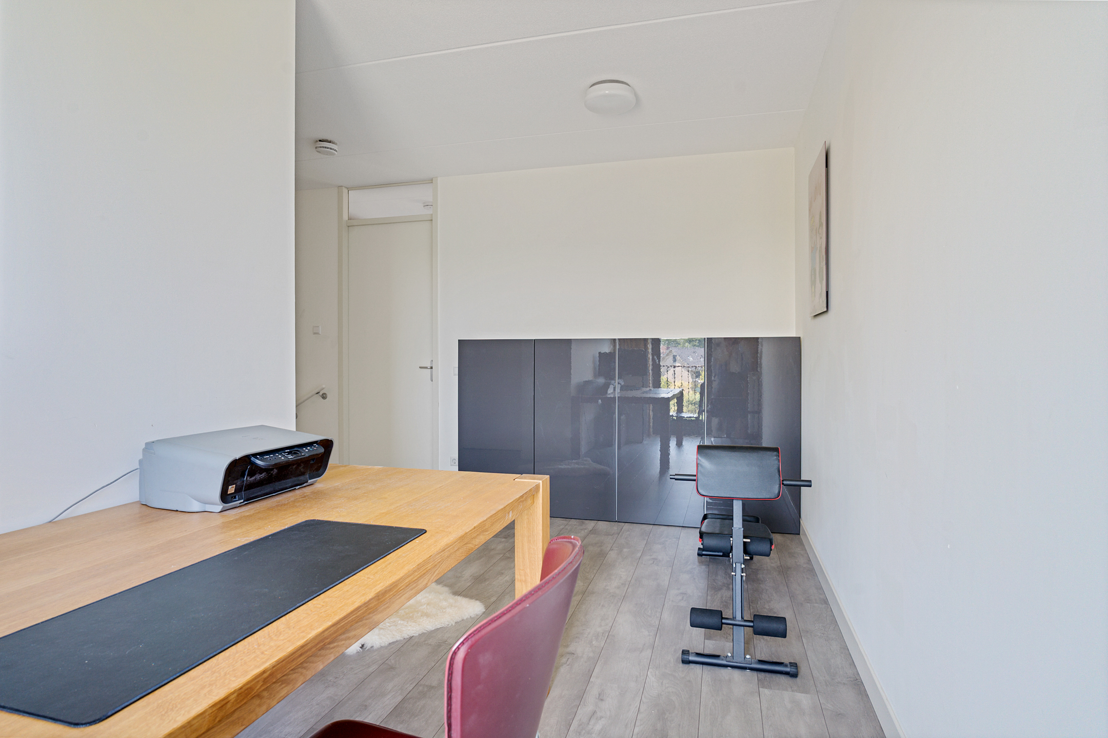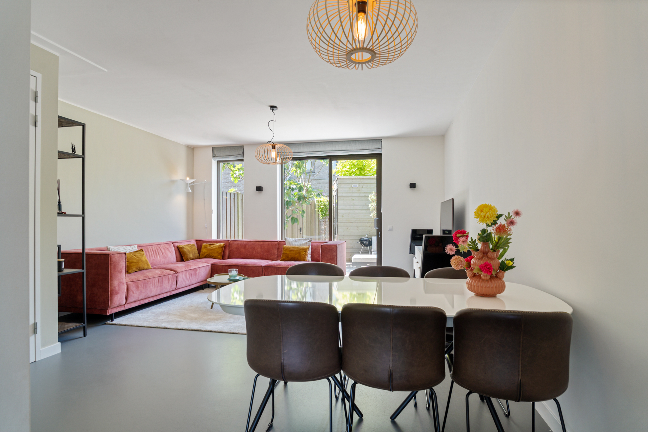 Aan de voorzijde vind je de strak vormgegeven keuken met witte fronten en hoogwaardige inbouwapparatuur: een inductiekookplaat, combi-oven, vaatwasser, koelkast, vriezer en volop opbergruimte. Dankzij de grote raampartijen en schuifpui aan de achterzijde geniet je van veel daglicht en een directe verbinding met de tuin.