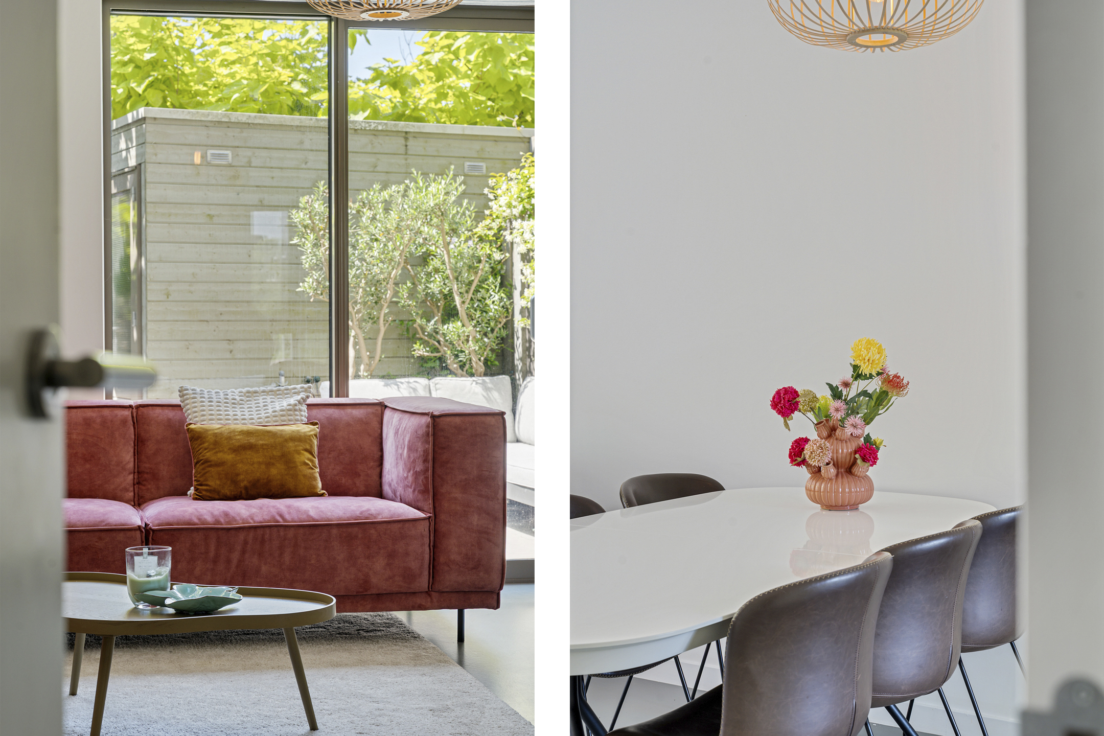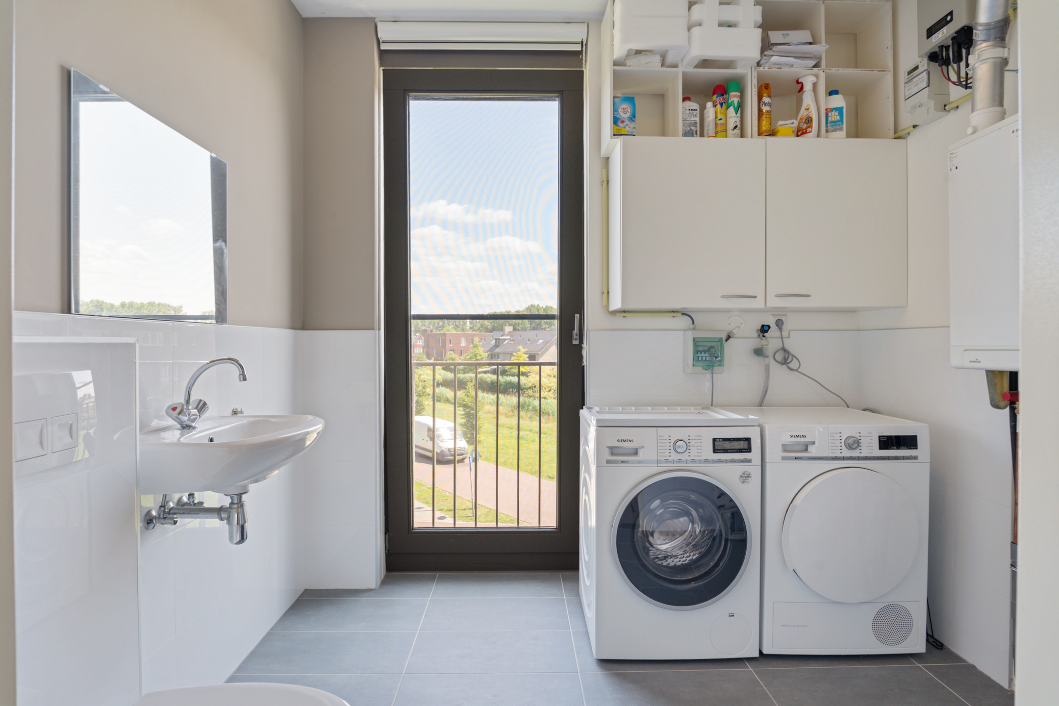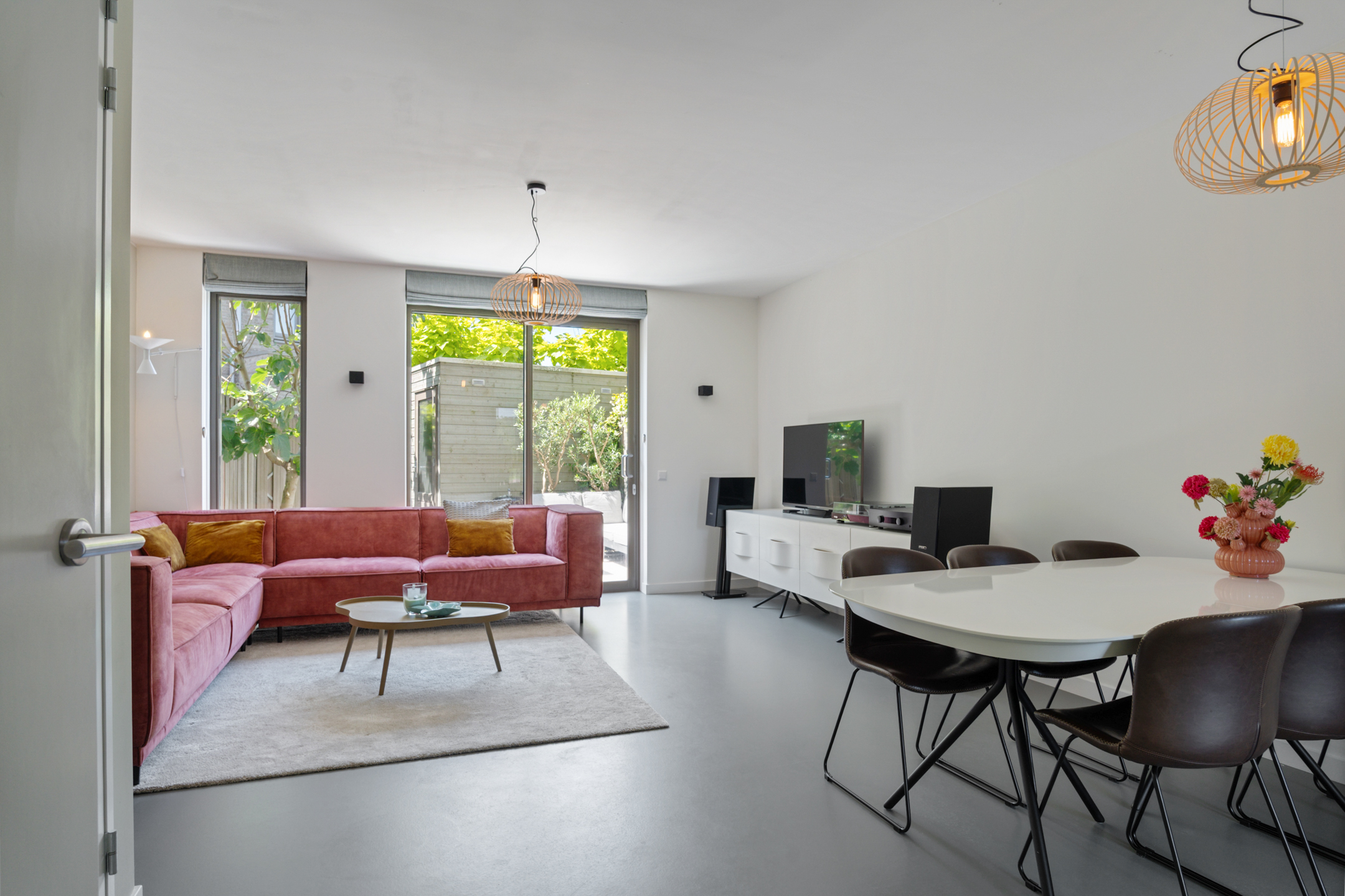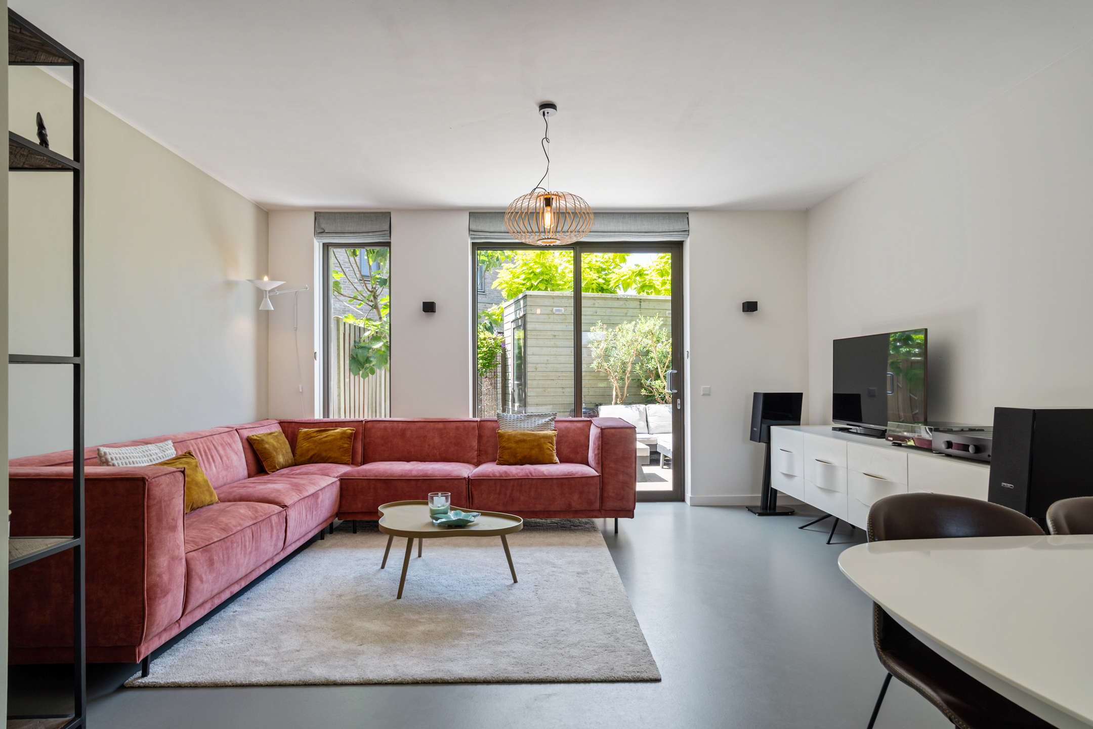 Aan de voorzijde vind je de strak vormgegeven keuken met witte fronten en hoogwaardige inbouwapparatuur: een inductiekookplaat, combi-oven, vaatwasser, koelkast, vriezer en volop opbergruimte. Dankzij de grote raampartijen en schuifpui aan de achterzijde geniet je van veel daglicht en een directe verbinding met de tuin.