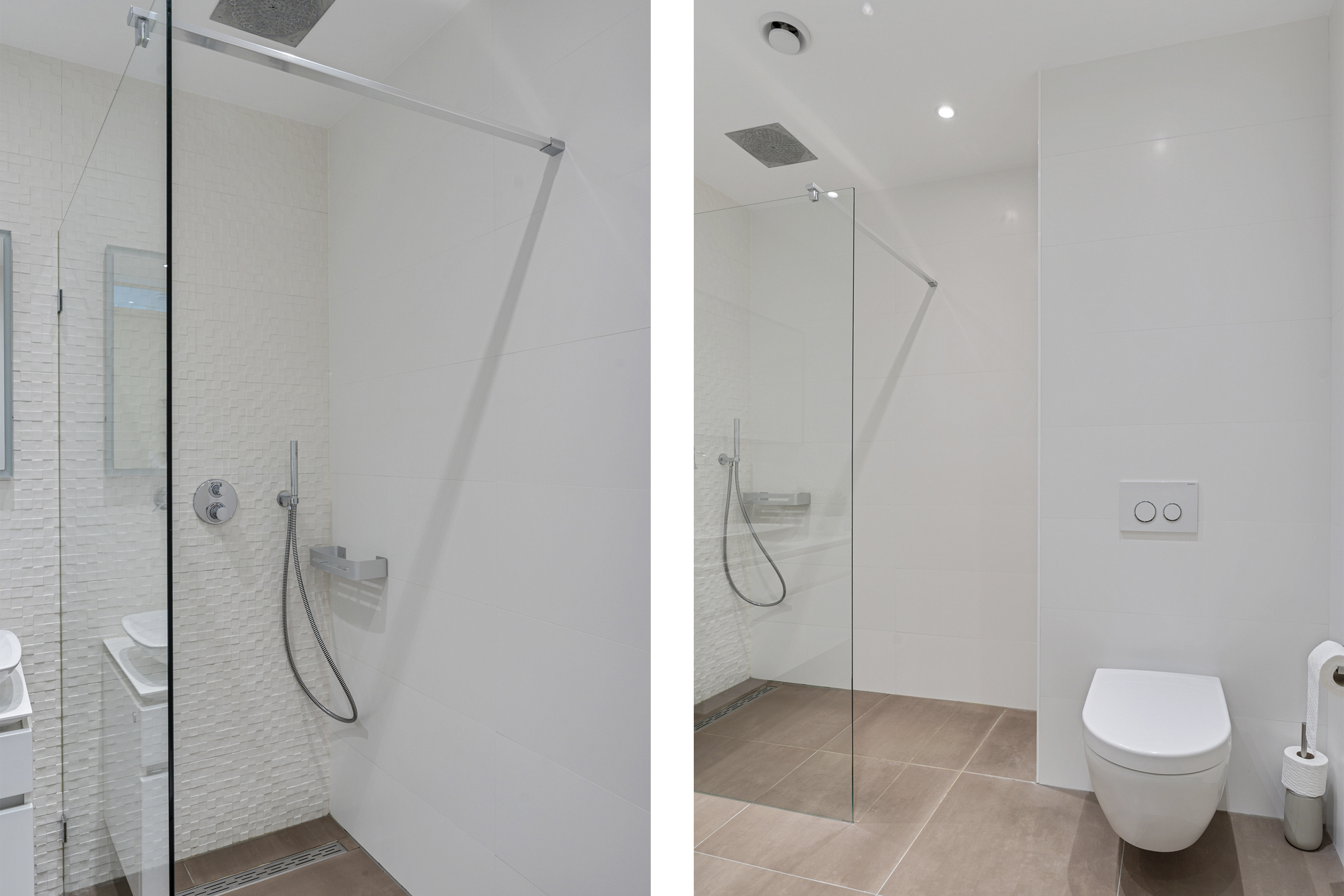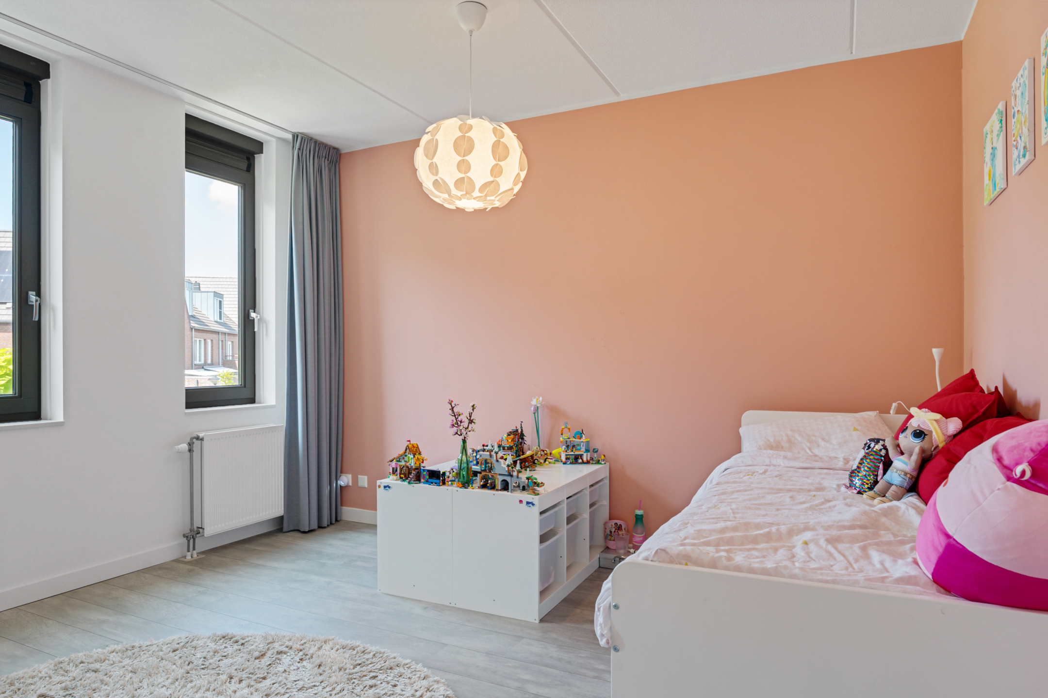 Op de eerste verdieping zijn twee ruime slaapkamers, één aan de voorzijde en één aan de achterzijde, beide voorzien van een tijdloze laminaatvloer. De luxe badkamer is uitgevoerd met een inloopdouche met regen- en handdouche, losstaand ligbad, wastafelmeubel, een tweede toilet en een designradiator. De afwerking is modern en stijlvol, met volledig betegelde wanden en vloeren.