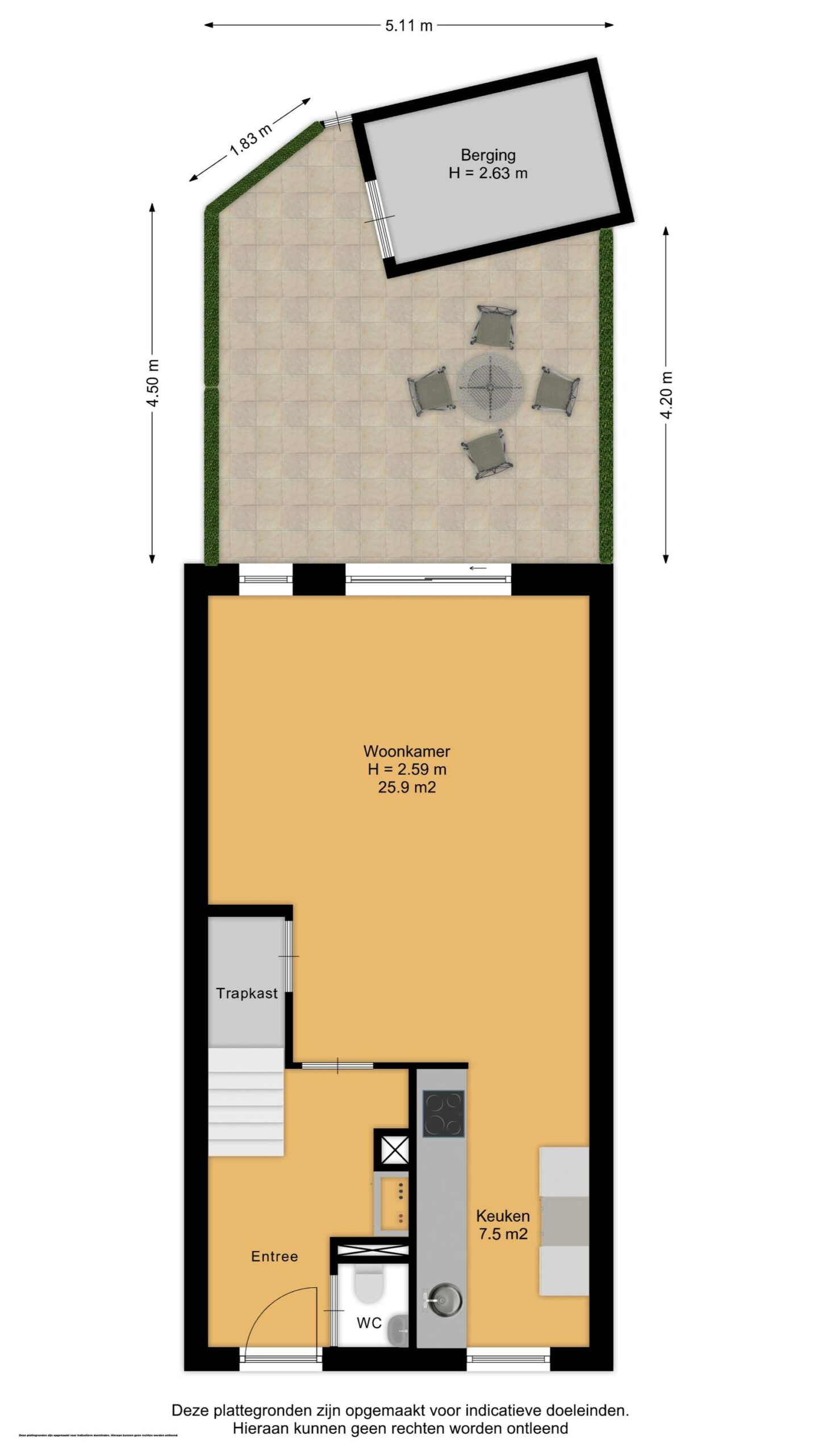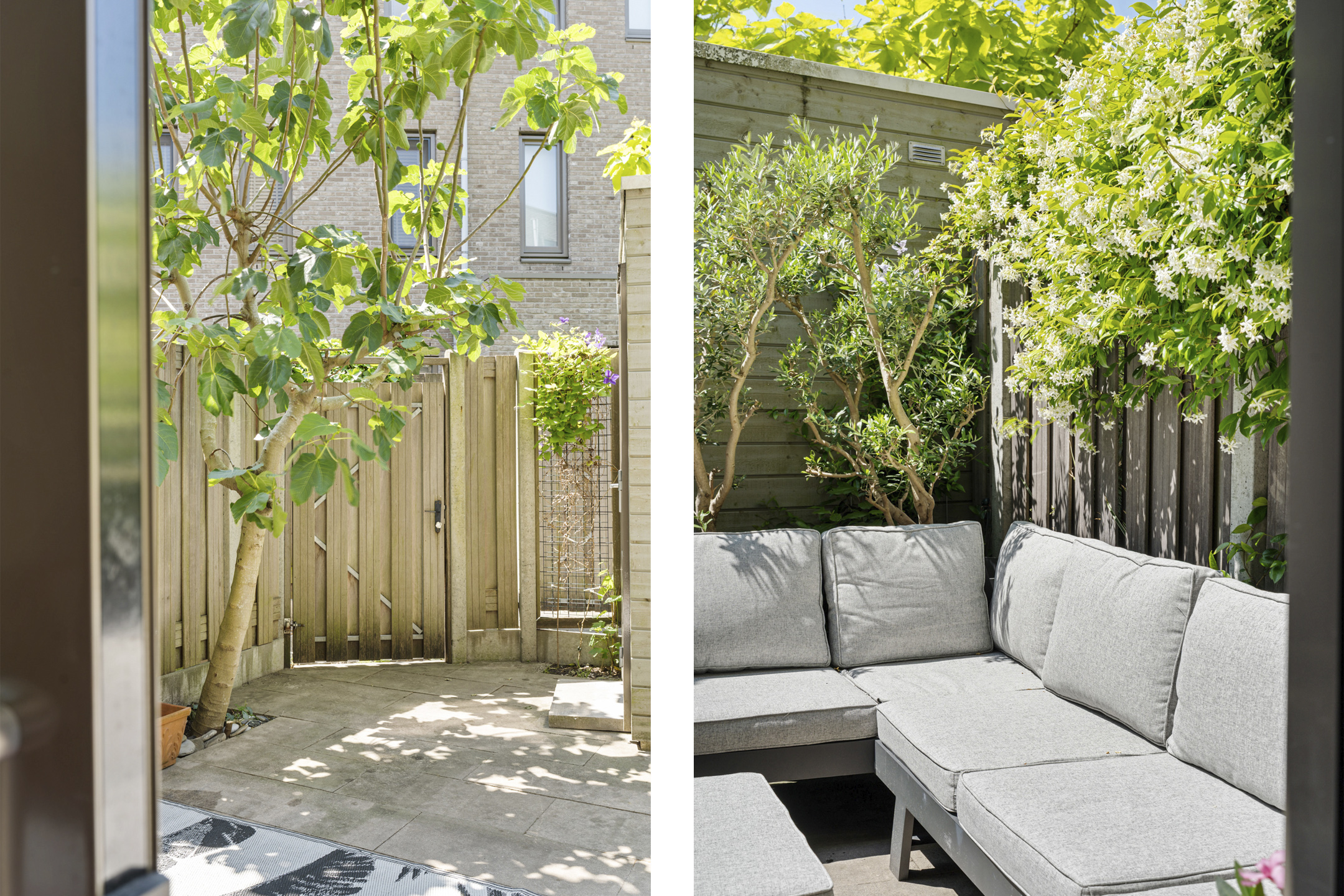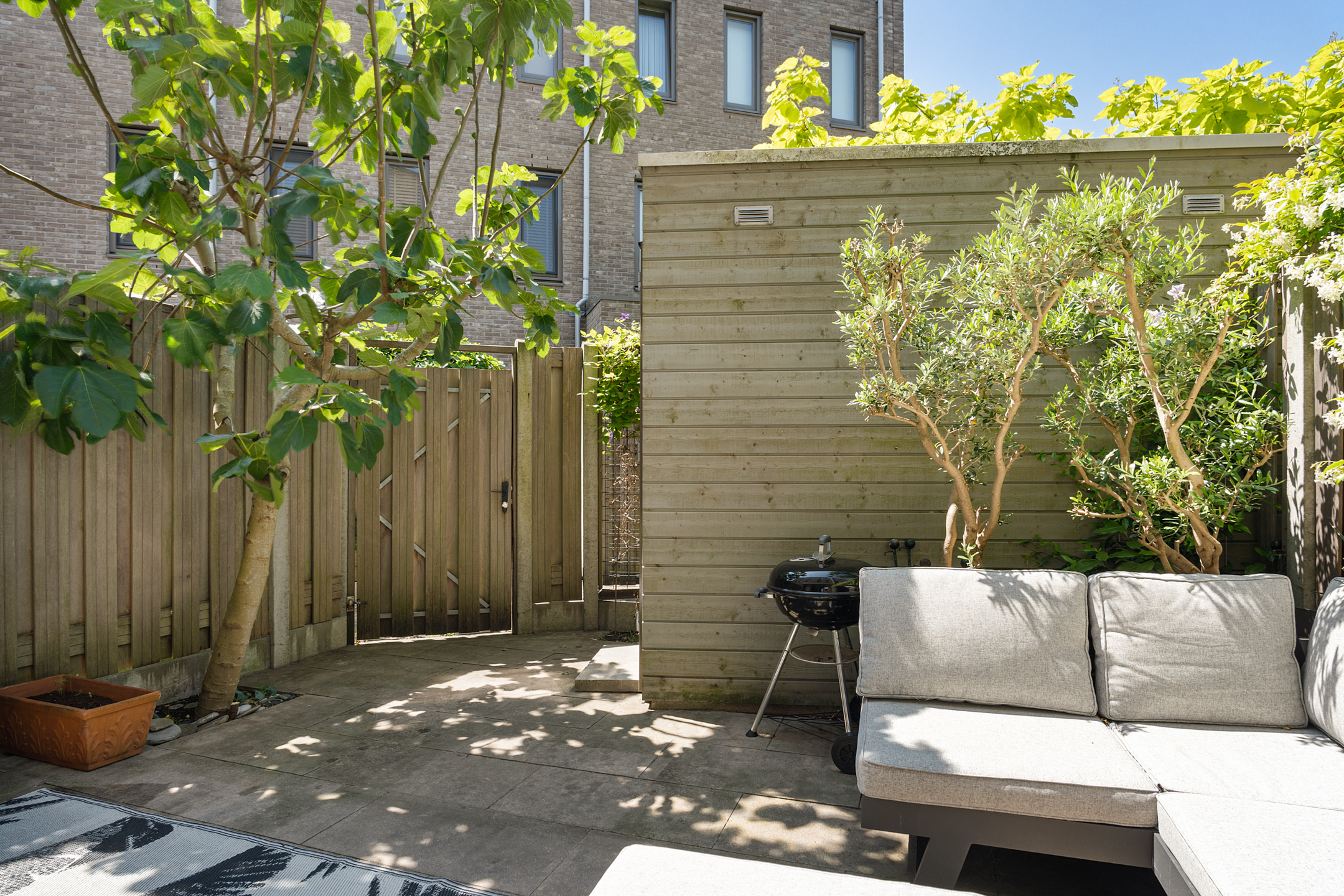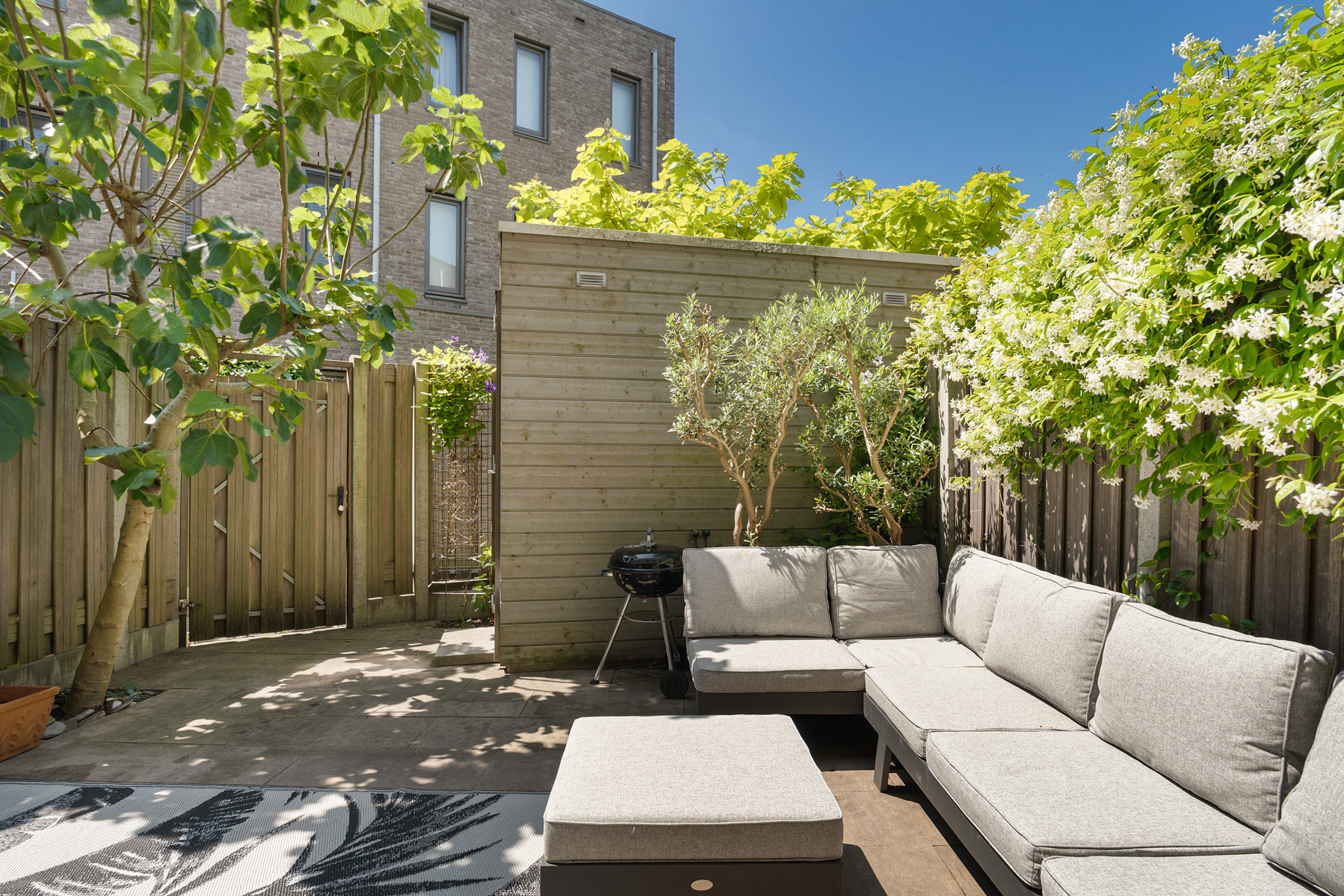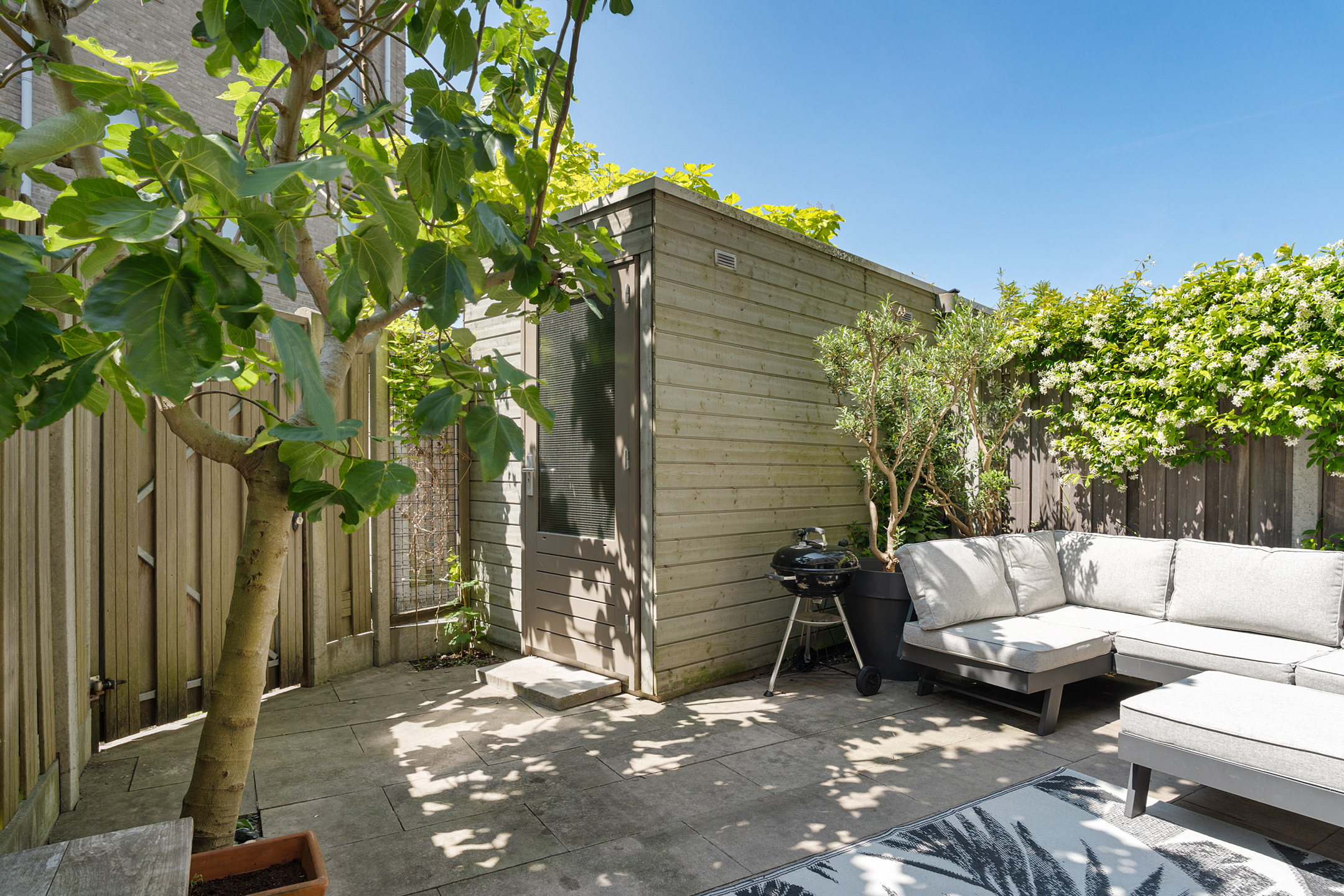 De zonnige achtertuin ligt op het westen en is circa 27 m² groot. Je beschikt hier over een vrijstaande houten berging van 5 m² en een achterom, wat zorgt voor goede bereikbaarheid aan beide zijden van de woning.