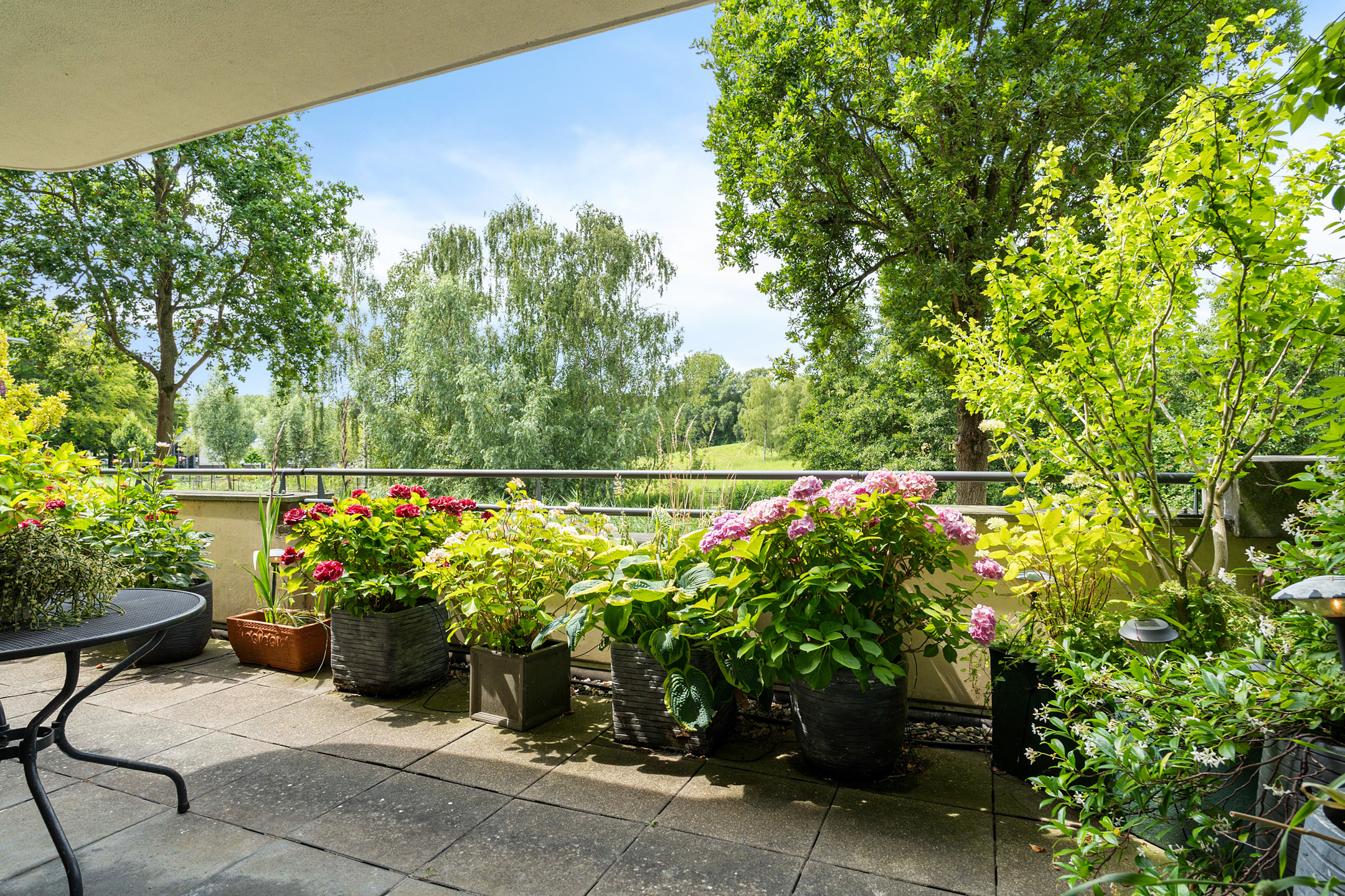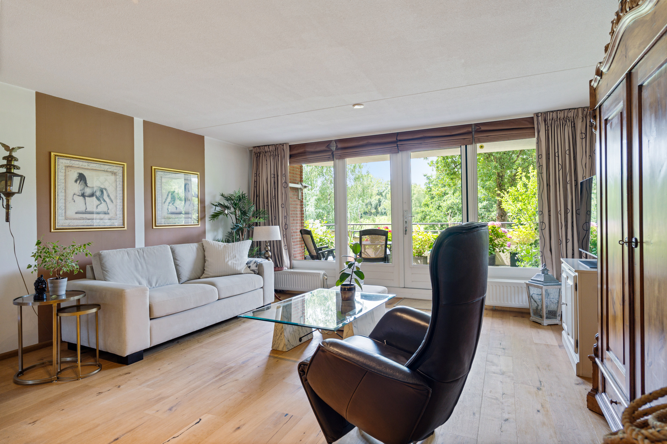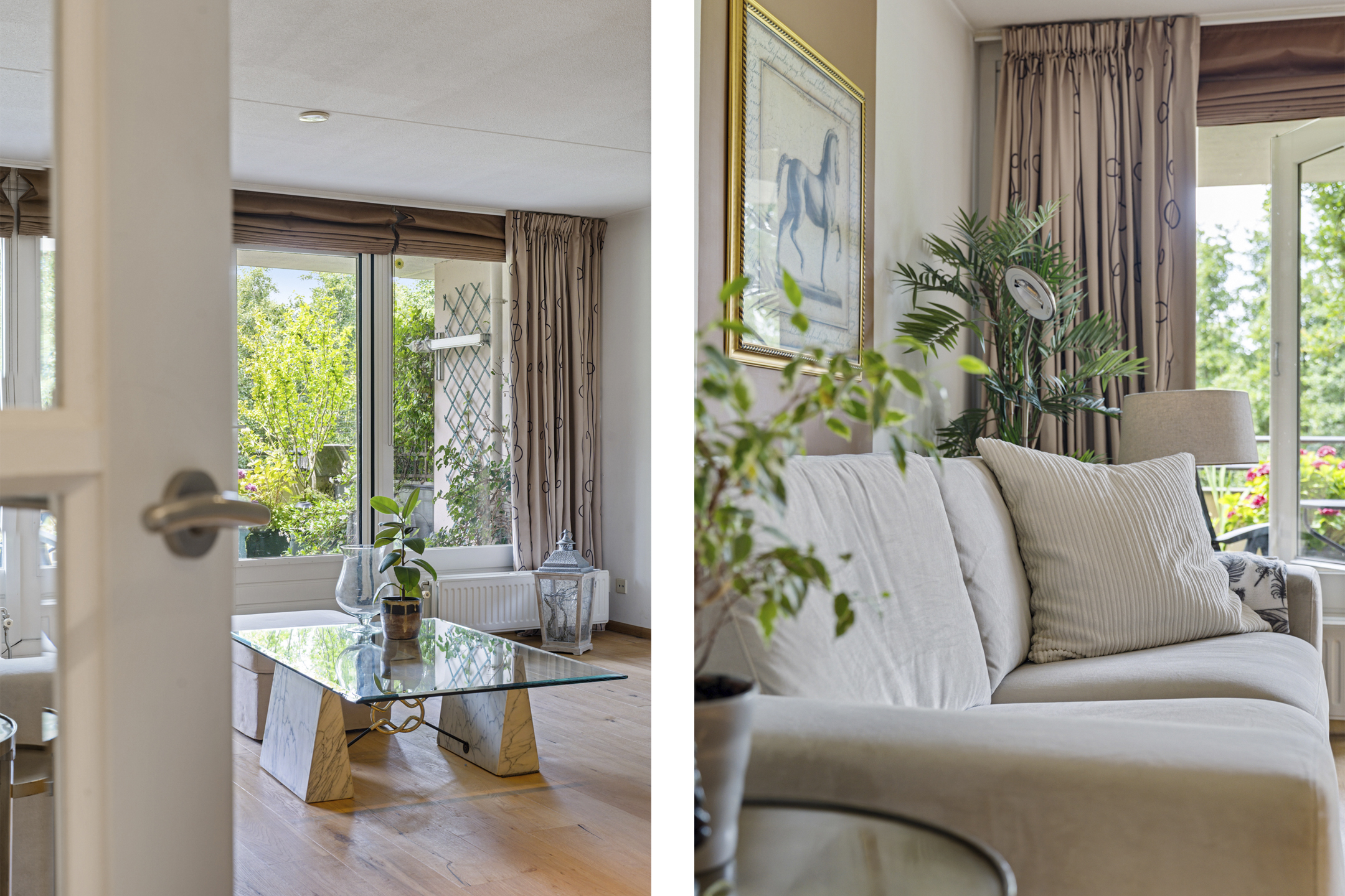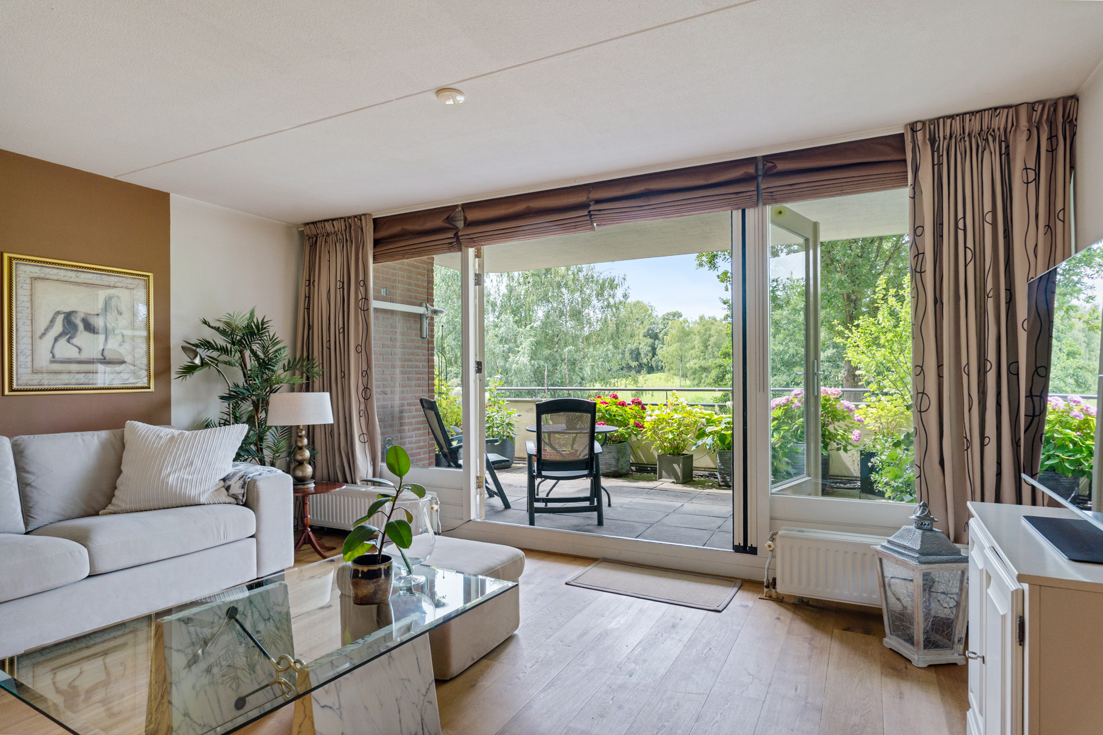 Aan de rechterzijde van het appartement bevindt zich de lichte en ruime woonkamer, met een royale raampartij en openslaande deuren naar het balkon. Vanuit hier heb je vrij uitzicht op het groene Balijbos, een oase van rust en natuur direct voor de deur. Dankzij de westelijke ligging van het balkon geniet je hier volop van de middag- en avondzon.