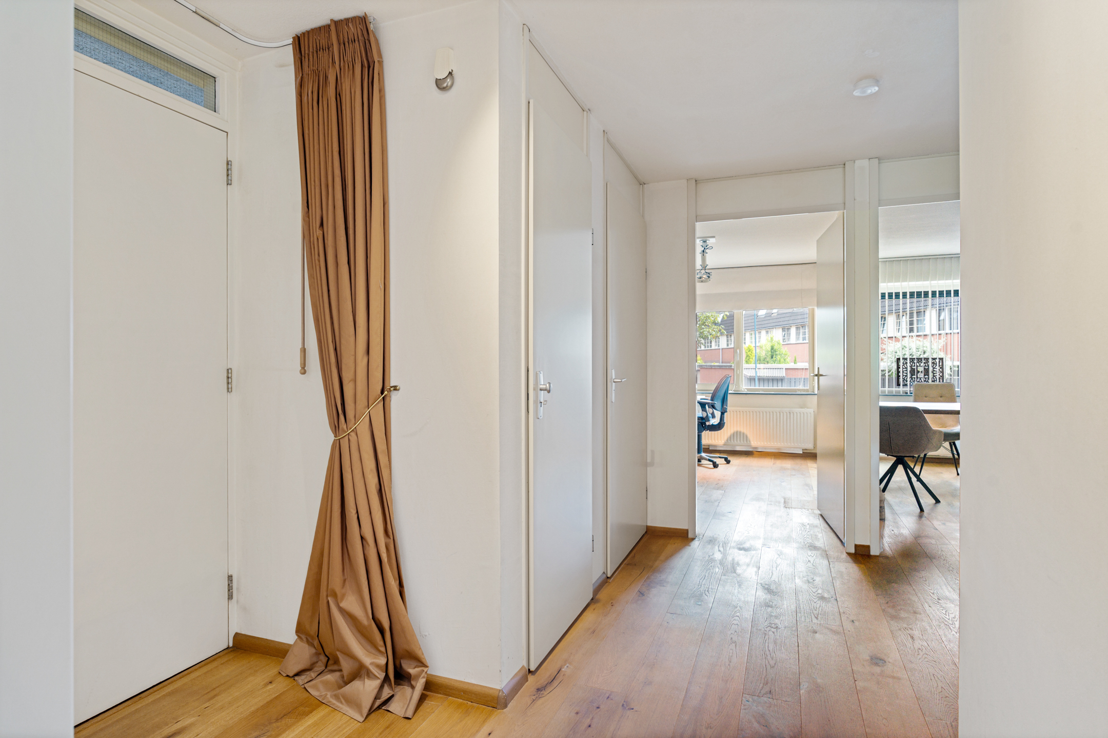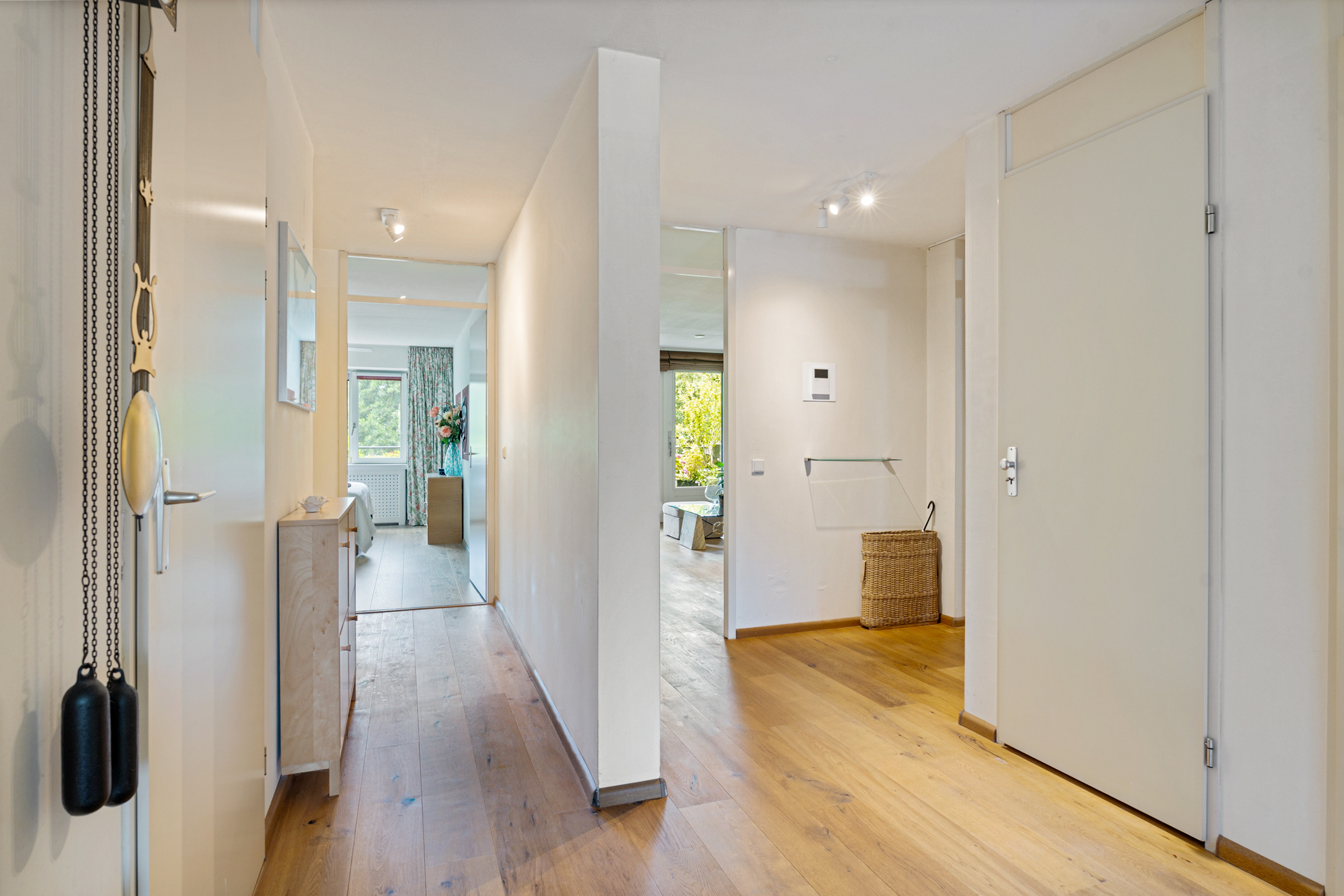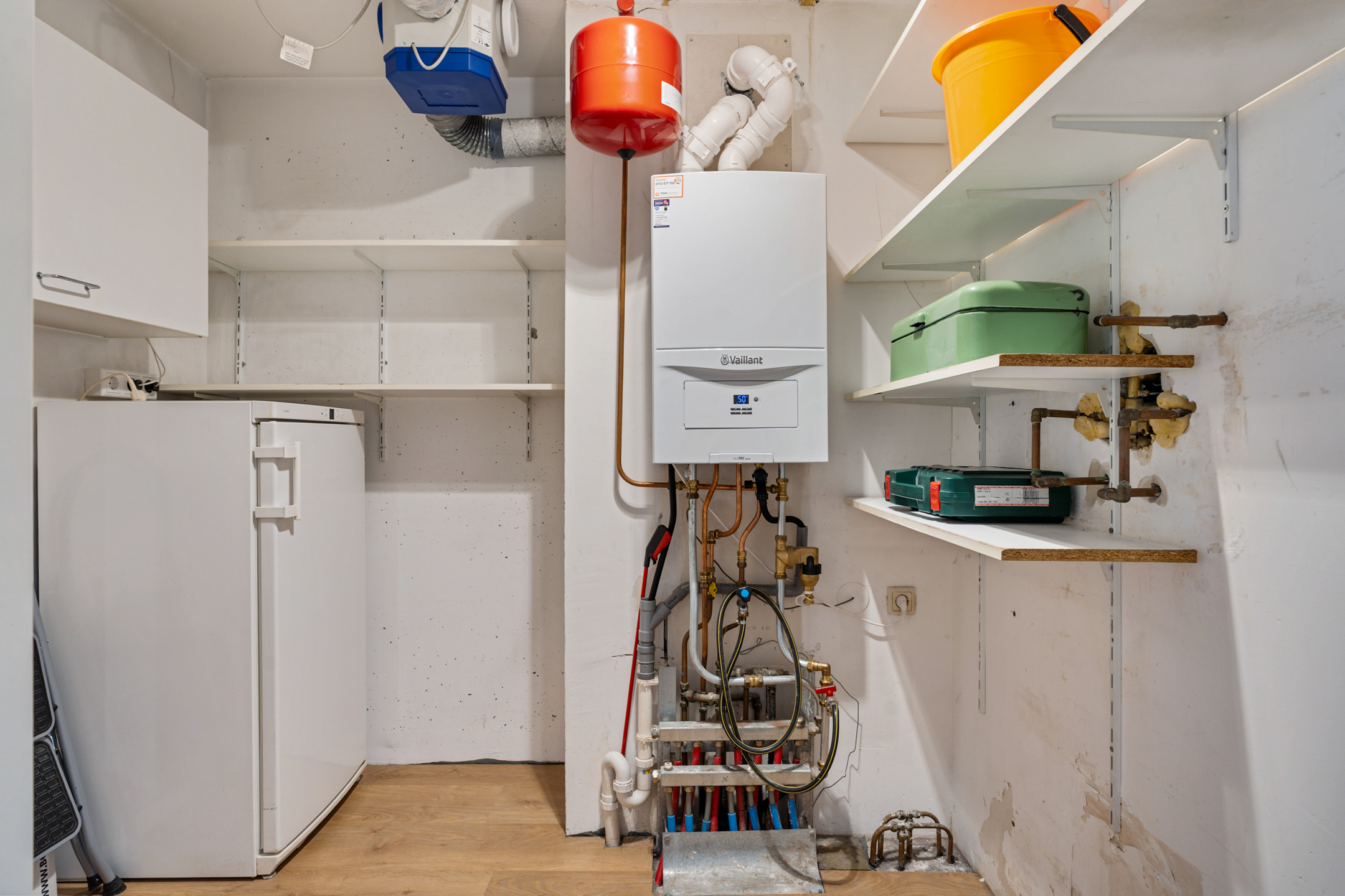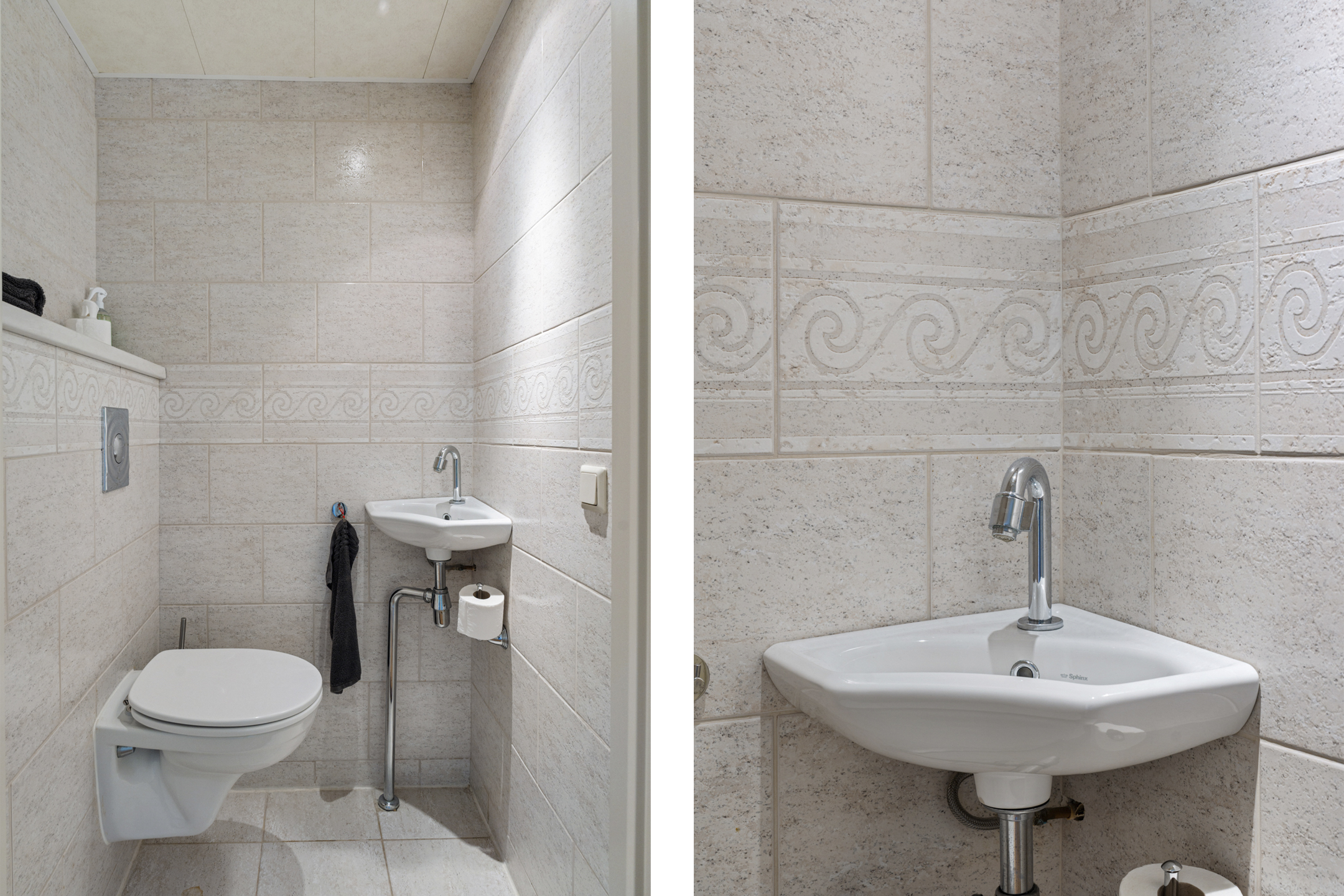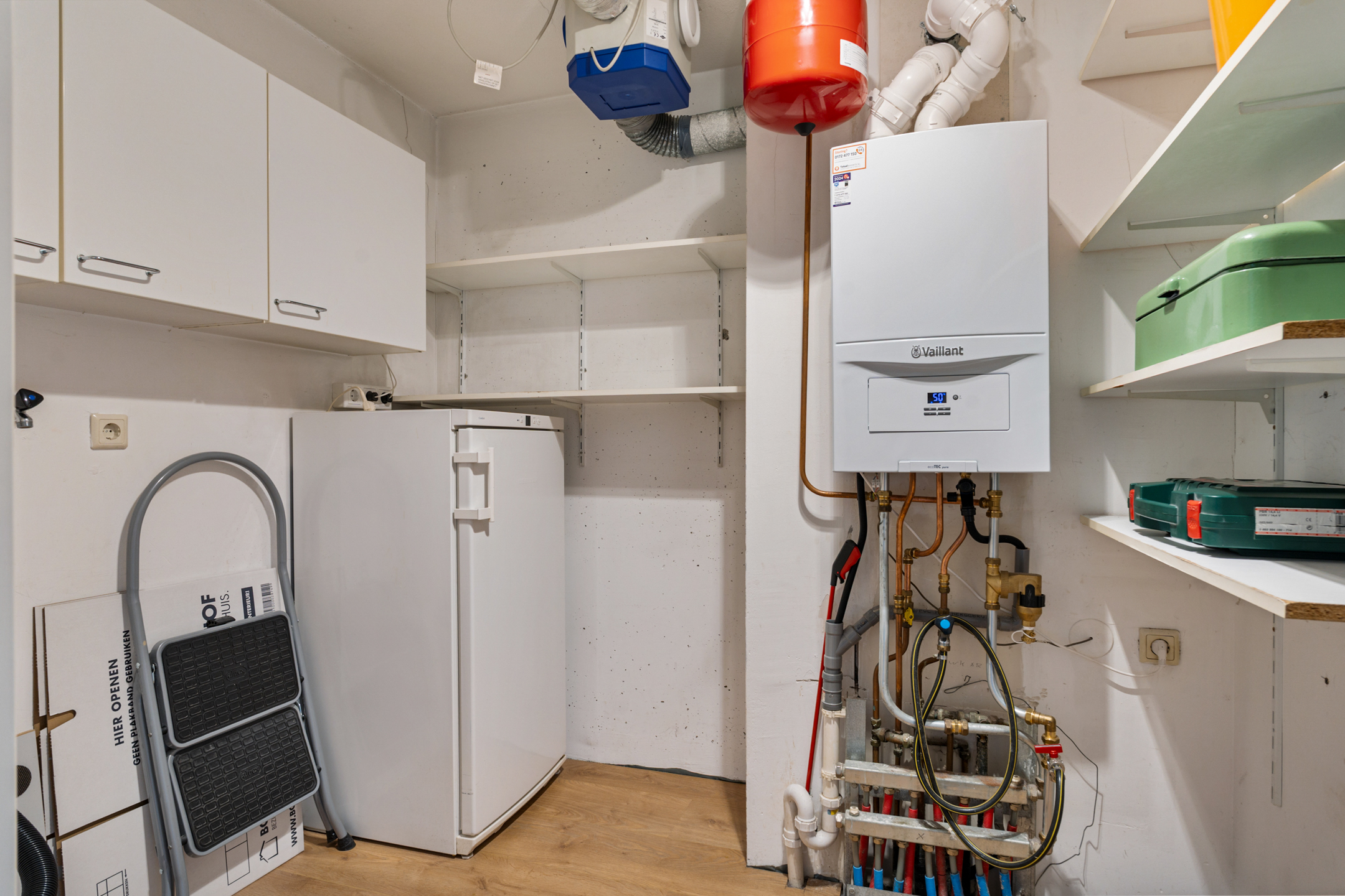 In de hal tref je verder de meterkast, een separaat hangend toilet met fonteintje en een ruime inpandige berging met volop opbergmogelijkheden. Hier bevinden zich ook de in 2024 vernieuwde cv-ketel, de mechanische ventilatiebox én is er ruimte voor bijvoorbeeld een extra vriezer.