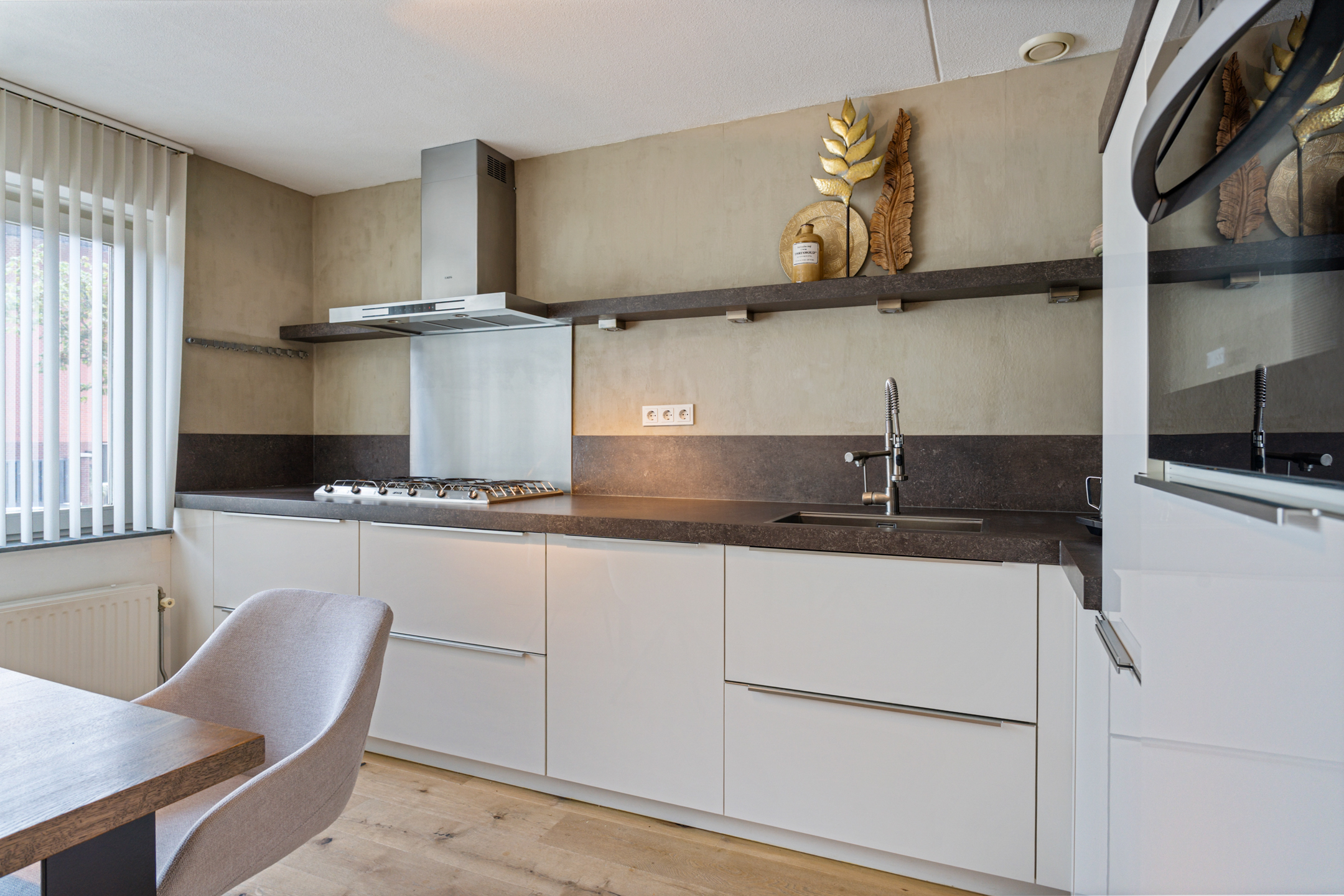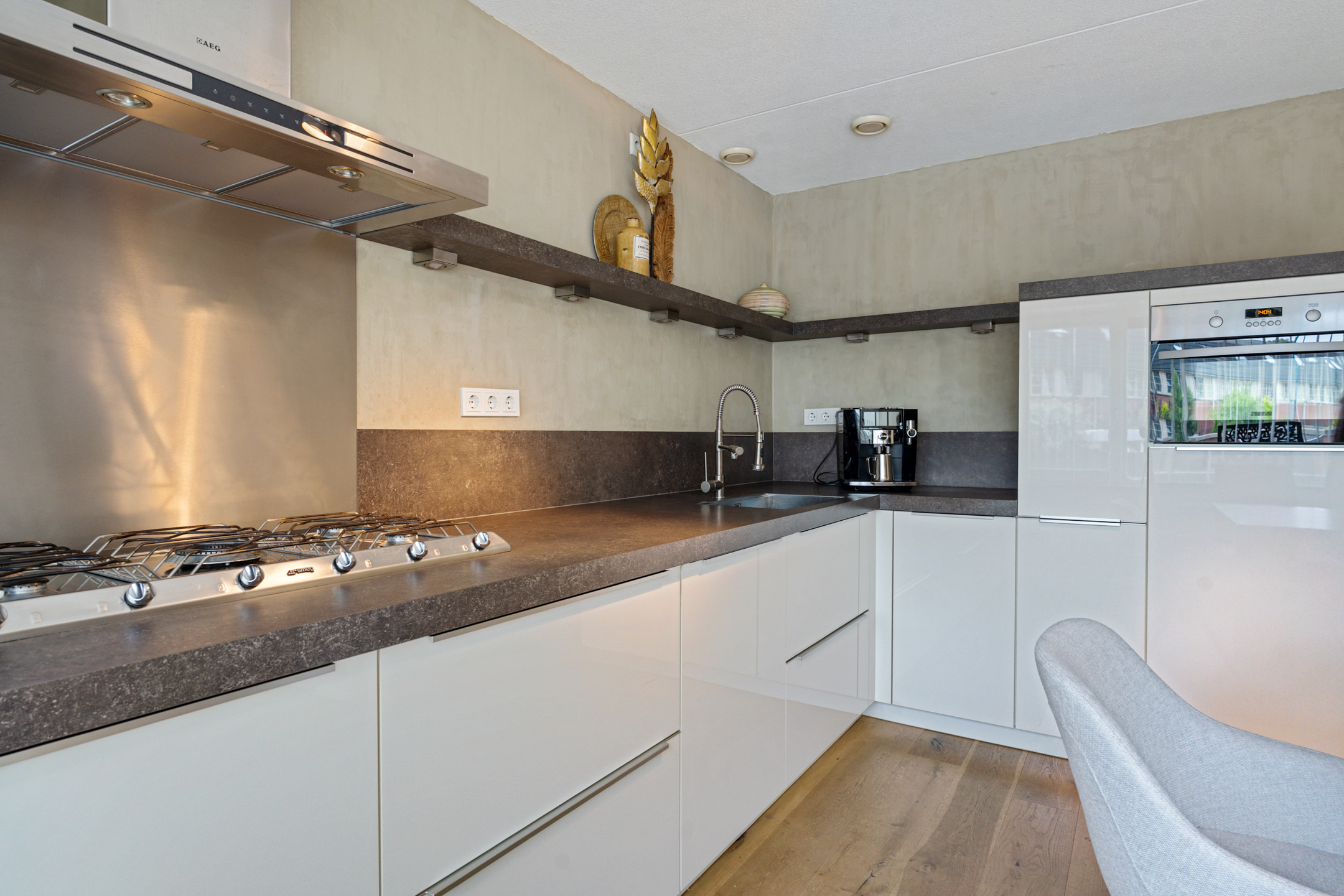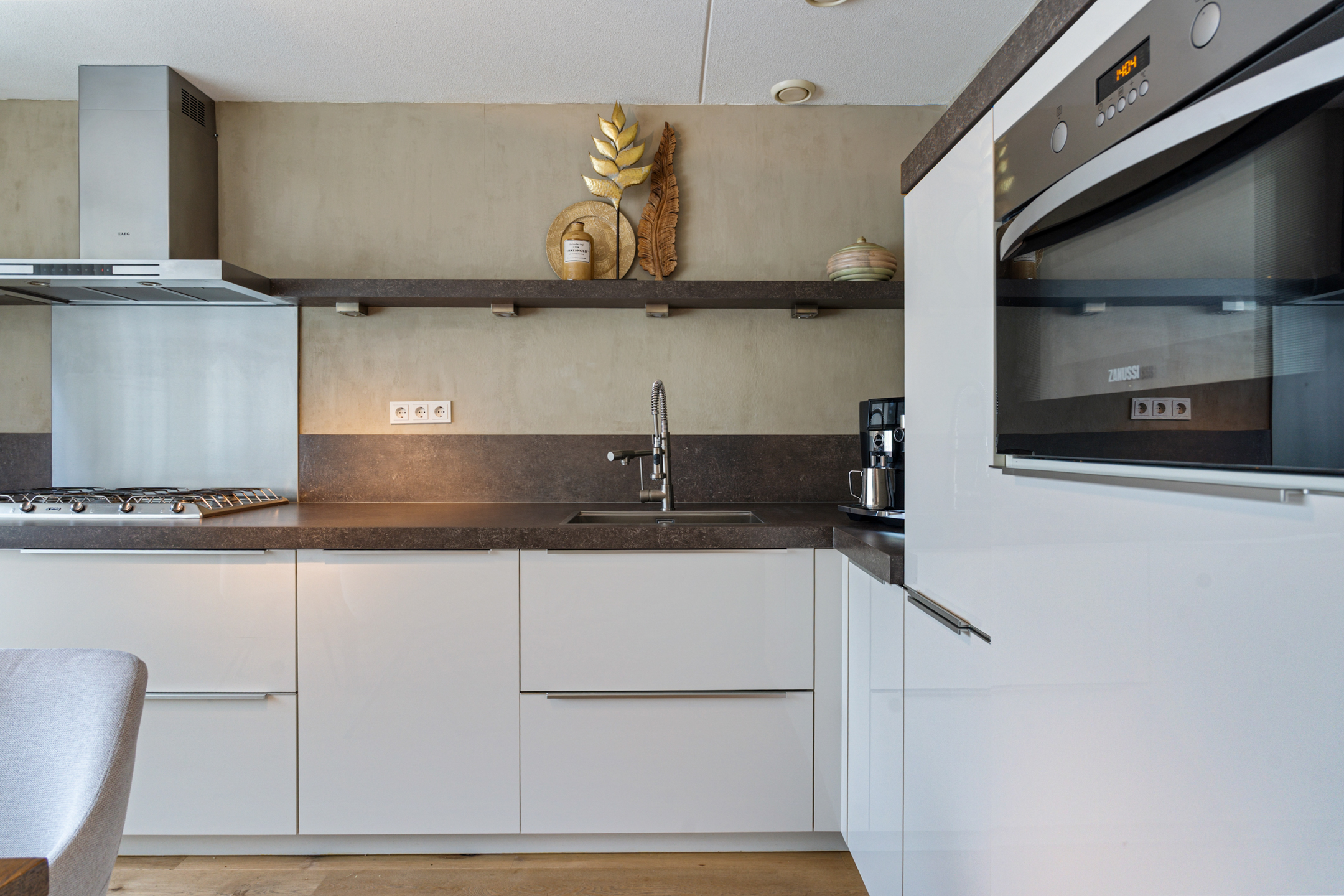 Aan de voorzijde van het appartement ligt de afgesloten keuken. Deze is netjes onderhouden en praktisch ingedeeld in een L-vorm, waardoor er volop werk- en kastruimte beschikbaar is. De keuken is uitgerust met diverse inbouwapparatuur, waaronder een 6-pits gasfornuis, een koelkast, vaatwasser en combi-oven.