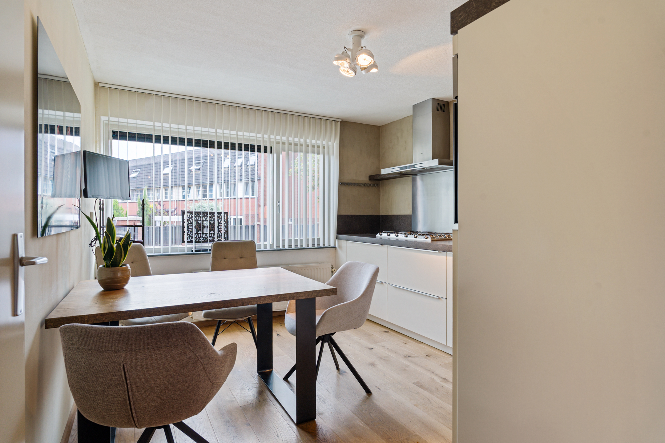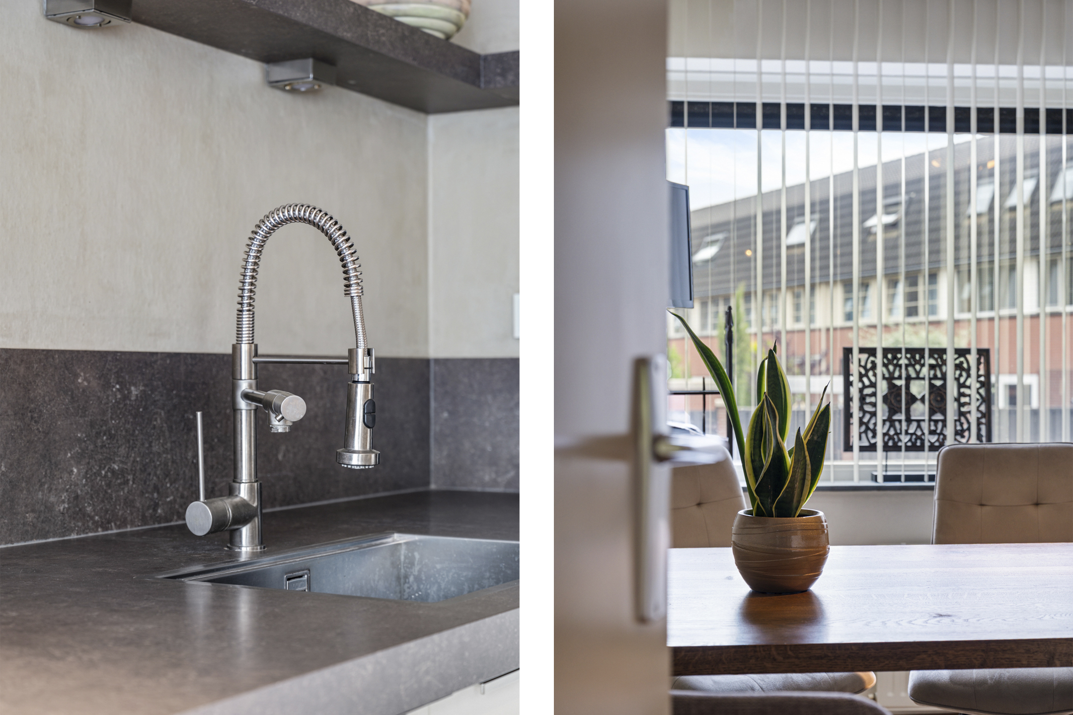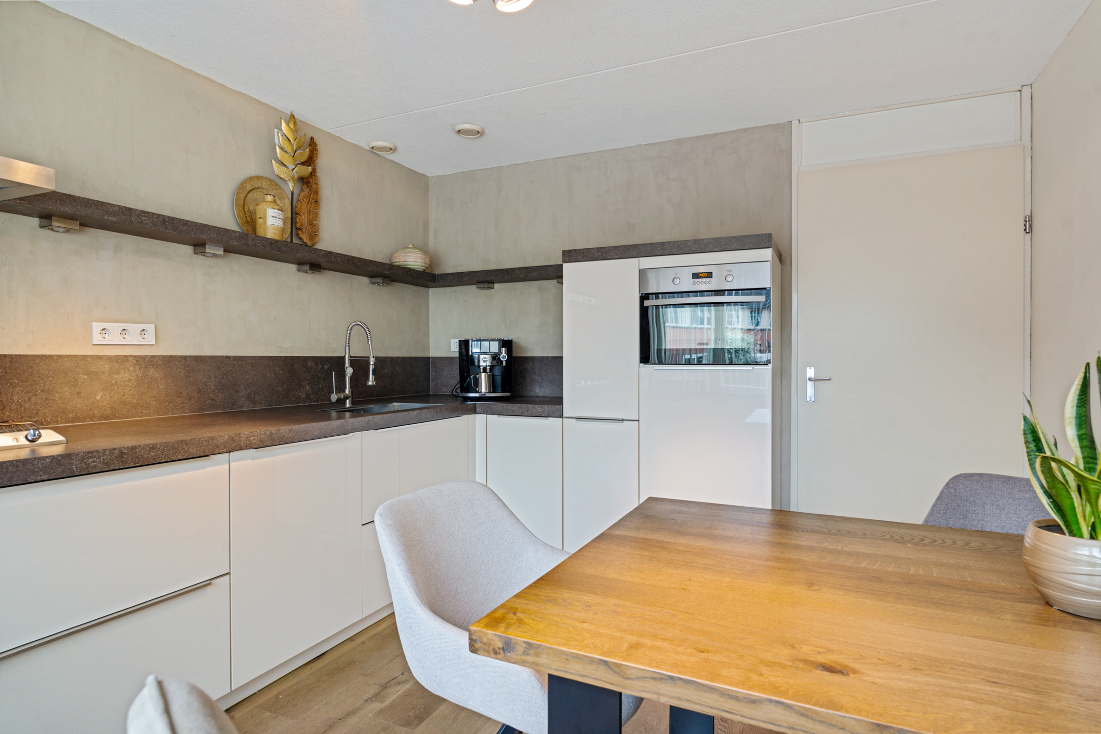 Aan de voorzijde van het appartement ligt de afgesloten keuken. Deze is netjes onderhouden en praktisch ingedeeld in een L-vorm, waardoor er volop werk- en kastruimte beschikbaar is. De keuken is uitgerust met diverse inbouwapparatuur, waaronder een 6-pits gasfornuis, een koelkast, vaatwasser en combi-oven.