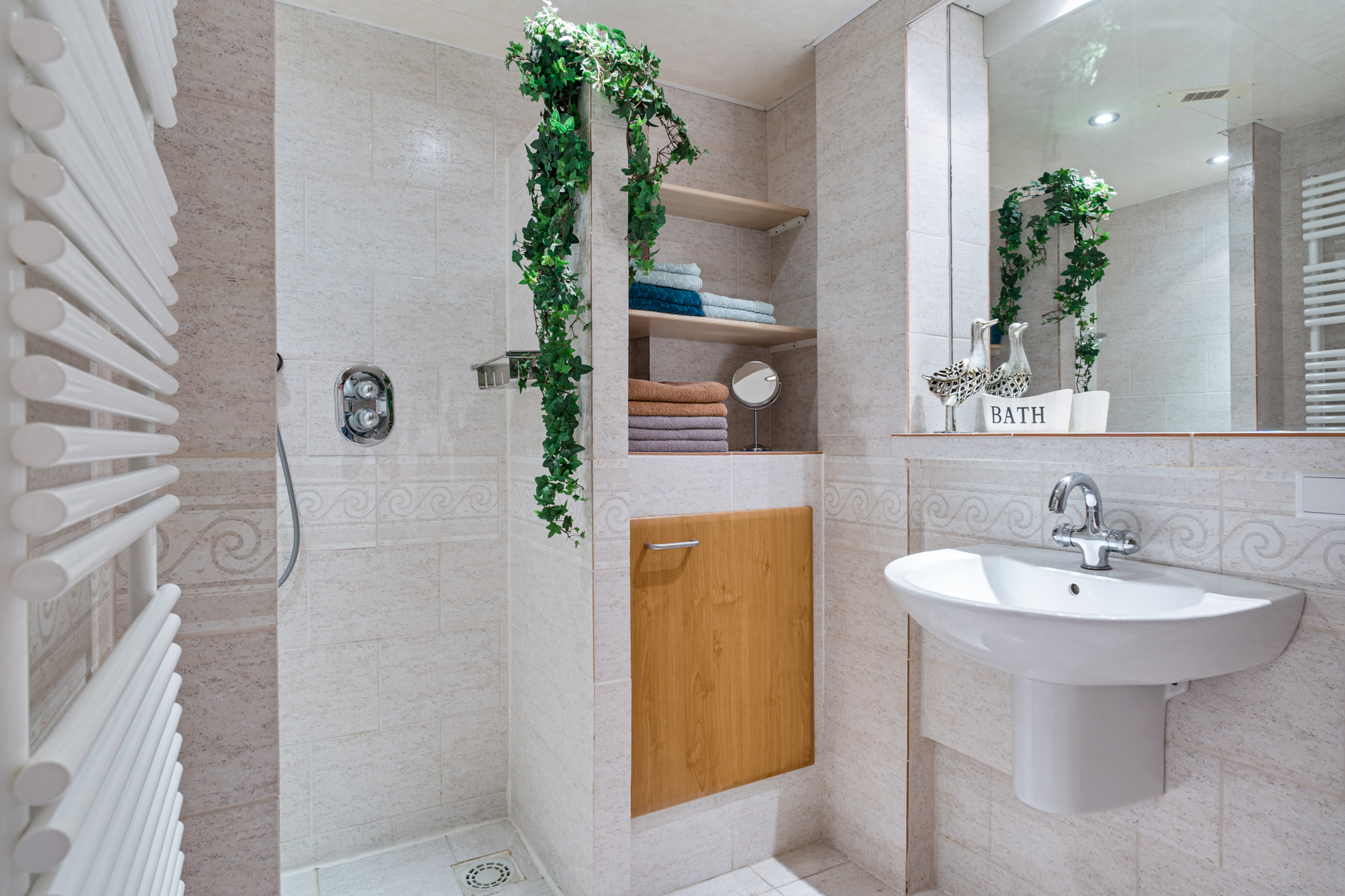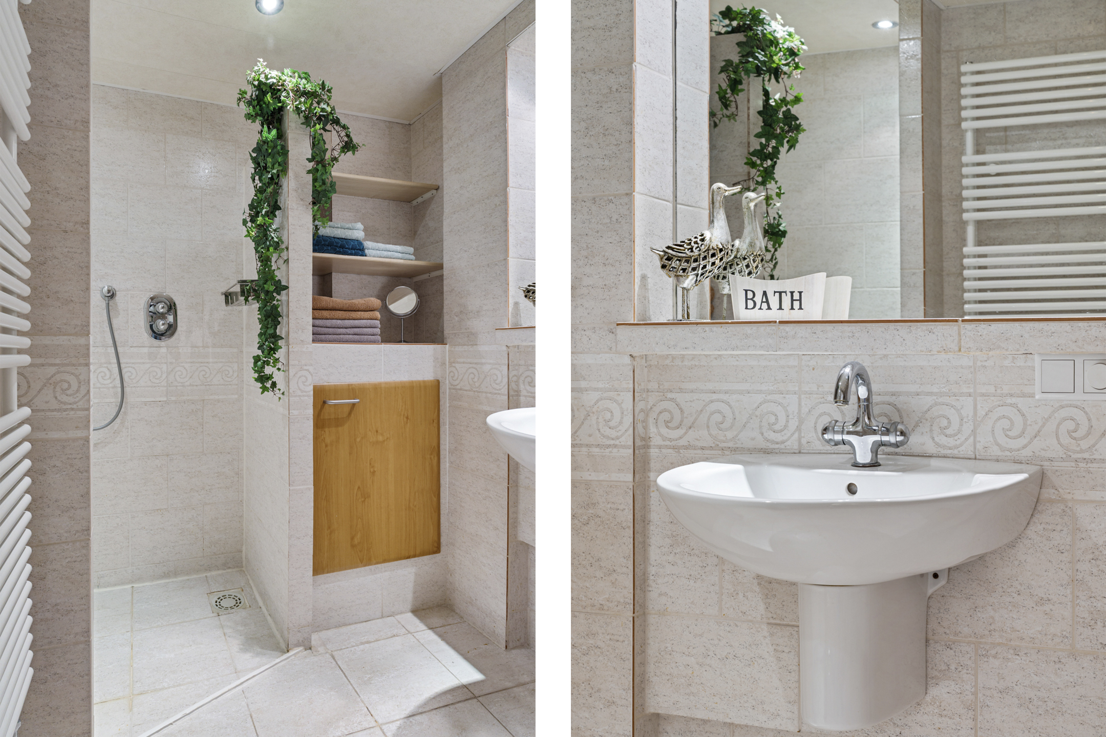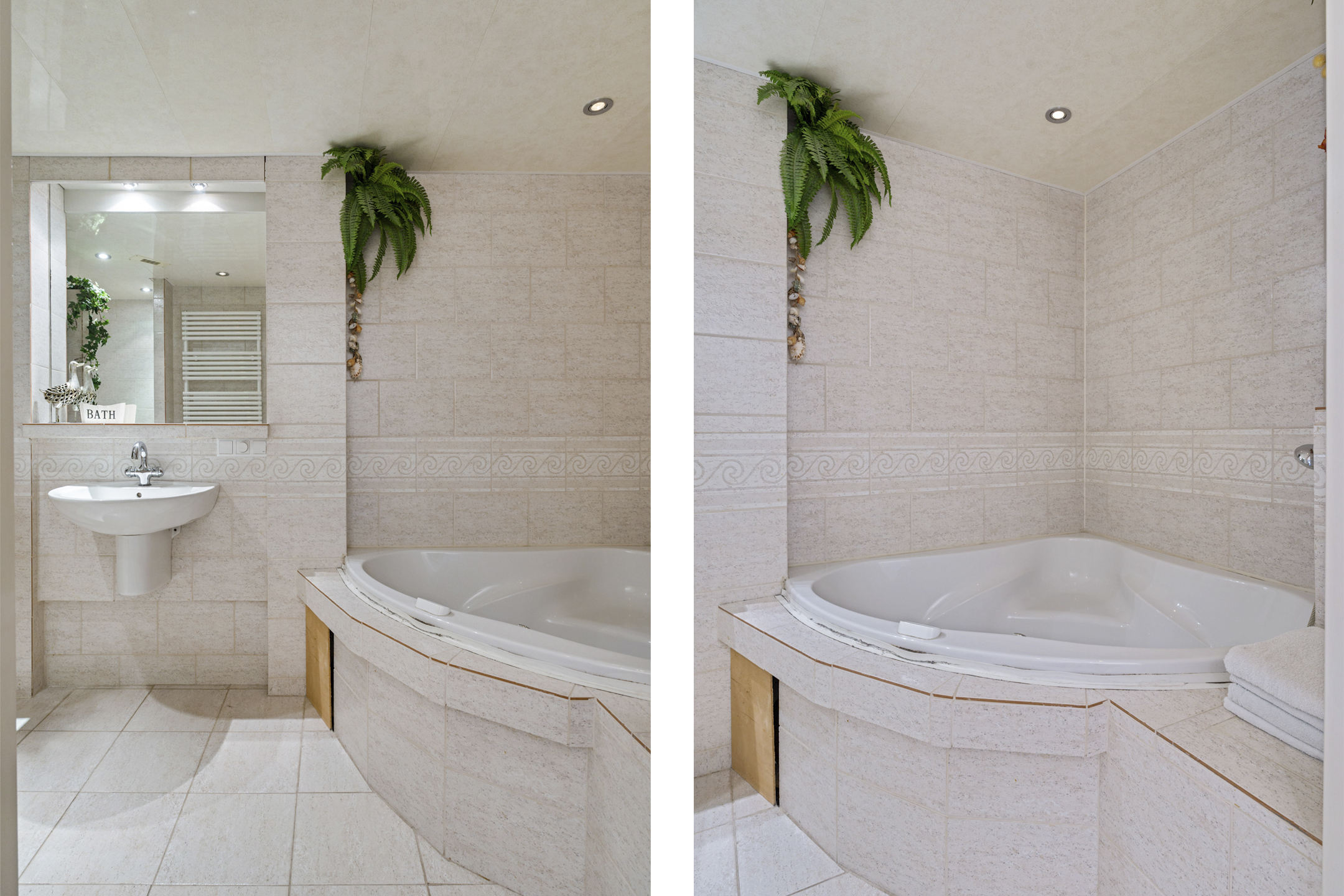 De badkamer is verzorgd en slim ingedeeld. Je vindt hier een aparte inloopdouche, een royaal ligbad met jetstream, een wastafel en een handdoekradiator.