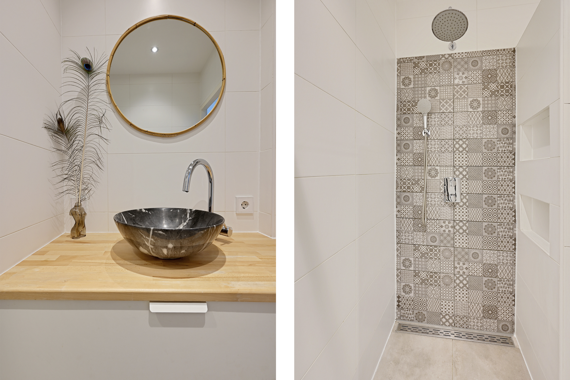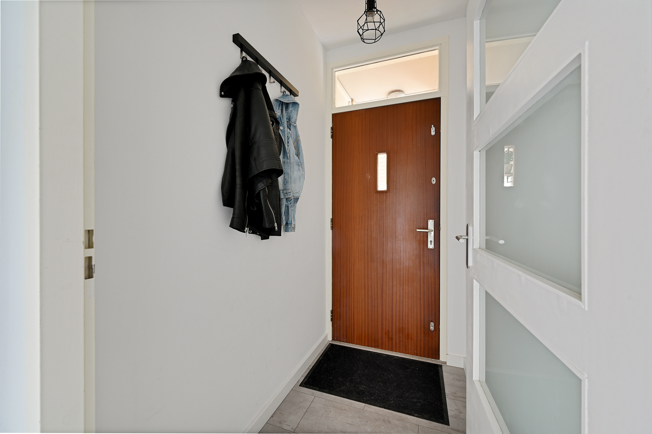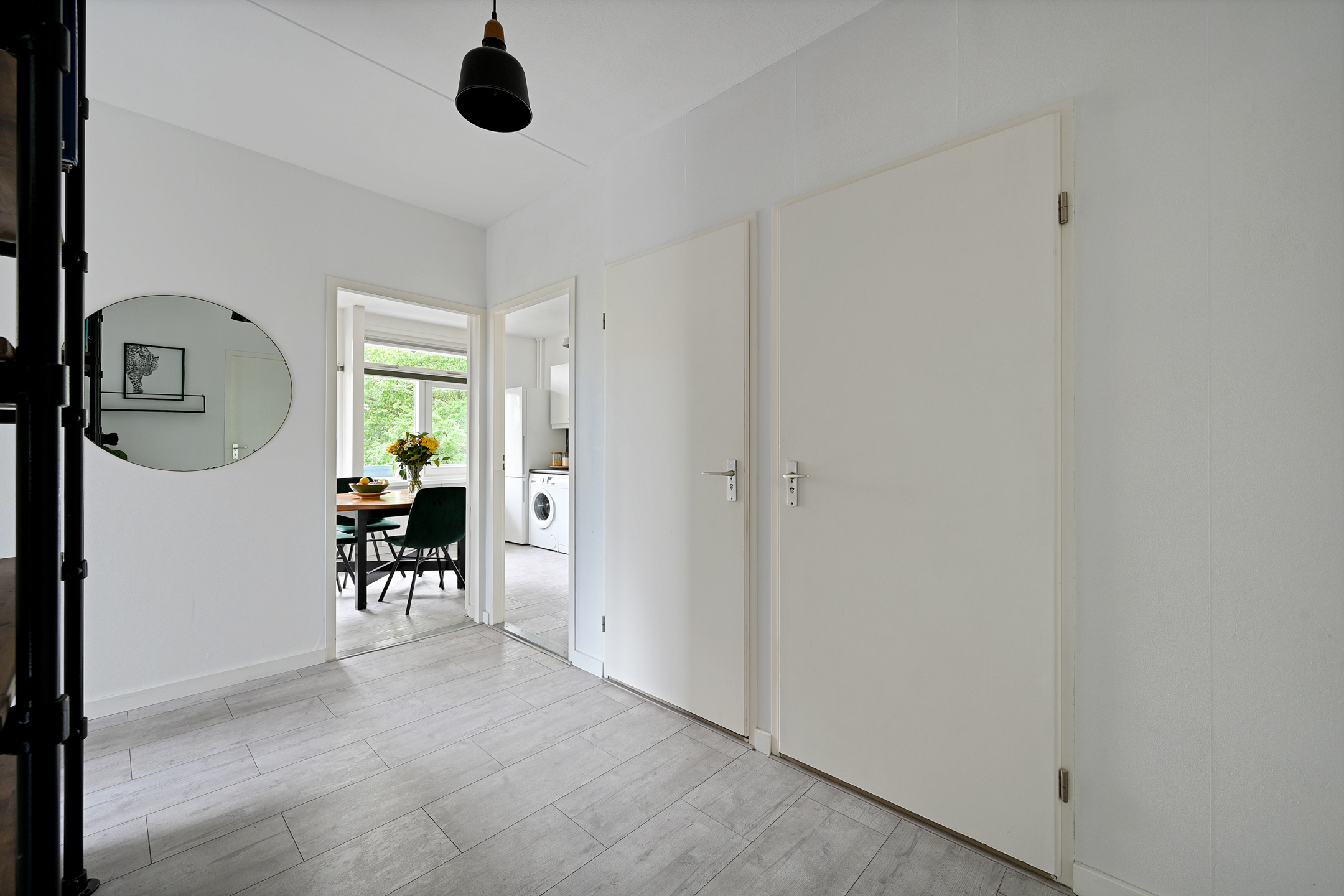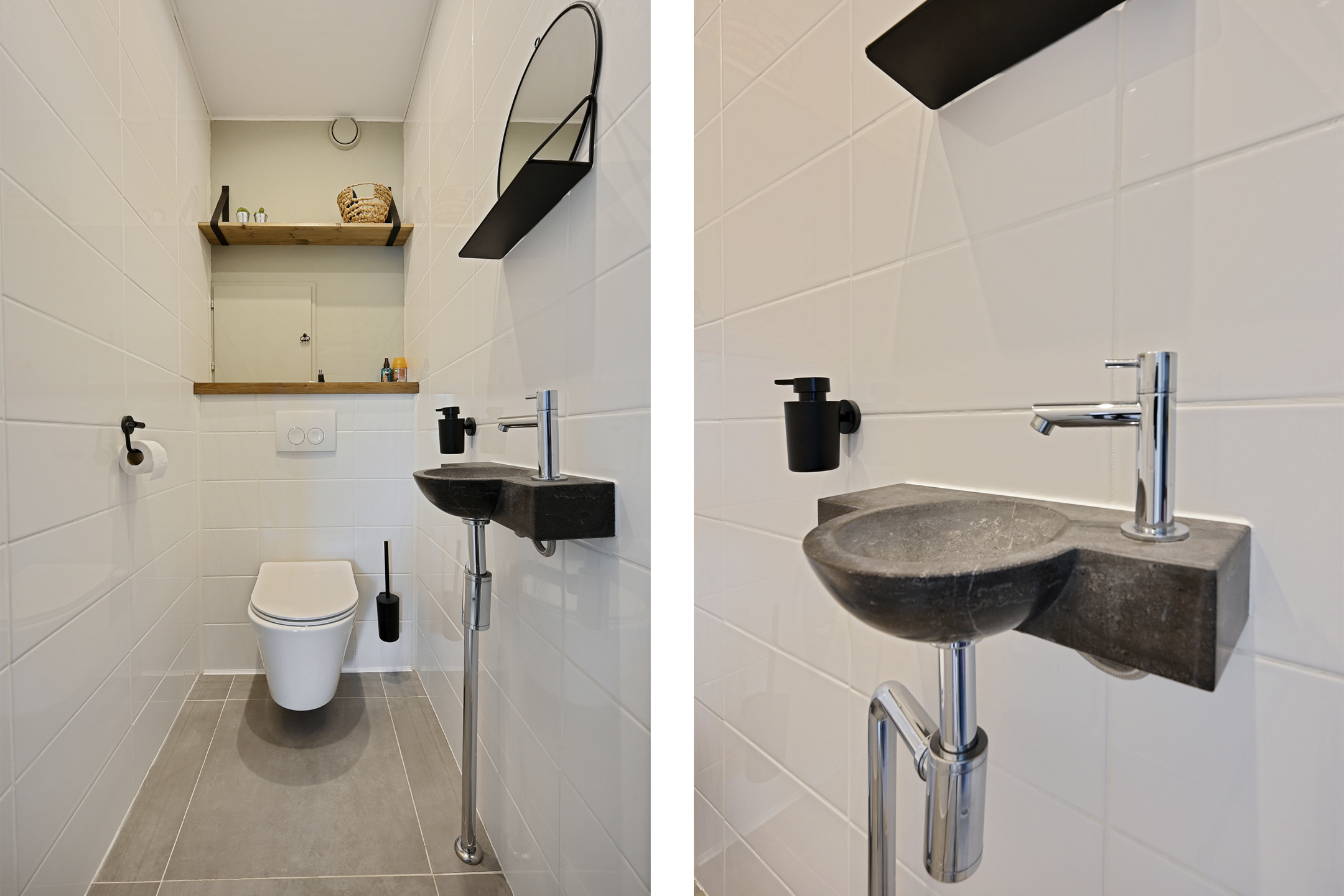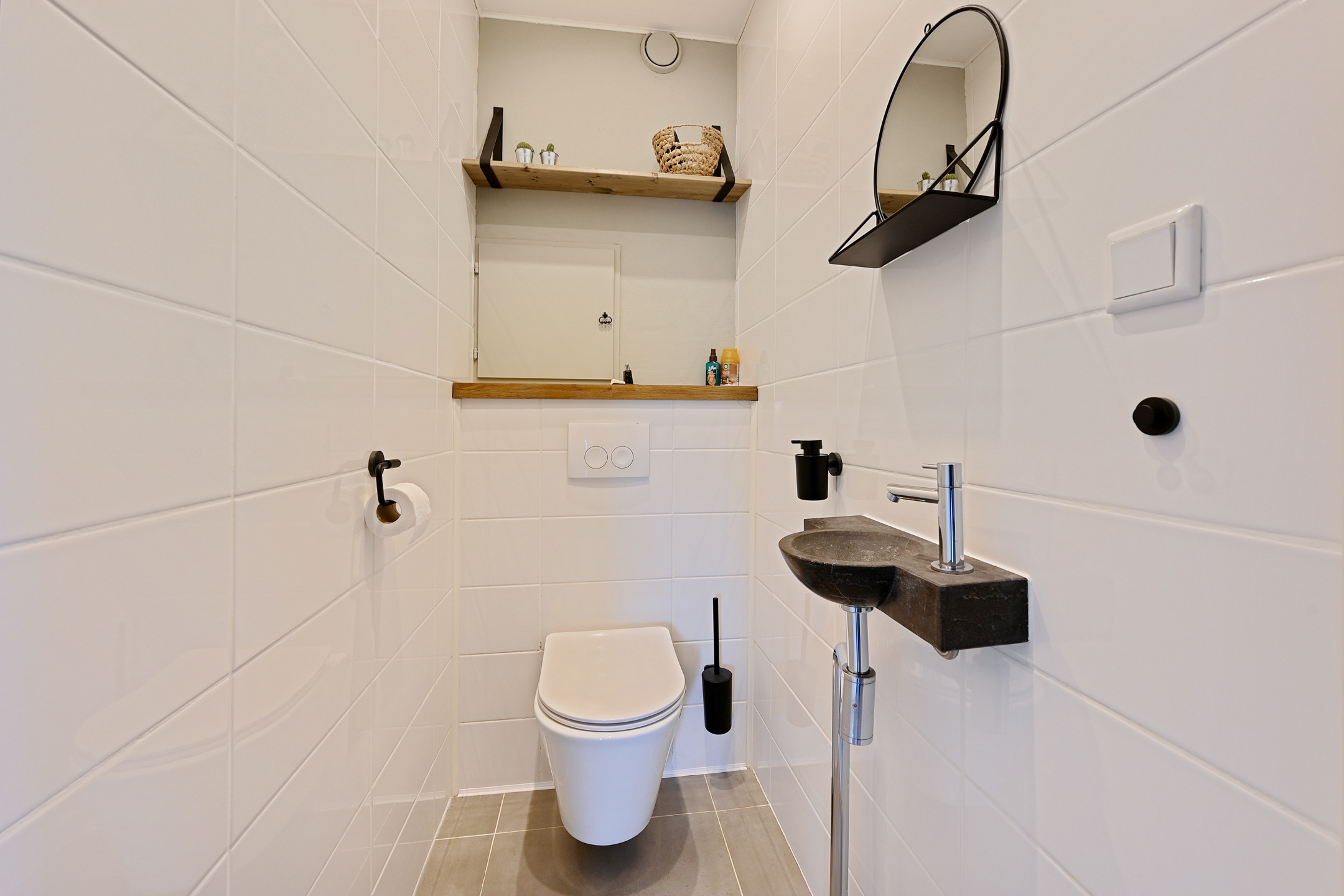 Via de centrale hal bereik je de overige vertrekken. Het separate toilet is in 2020 vernieuwd, modern uitgevoerd met wandcloset, fonteintje en volledig betegeld. De badkamer is in 2021 grondig gerenoveerd en voorzien van een ruime inloopdouche met regendouche, praktische nisjes, een losse wastafel, spiegel en elektra-punten.