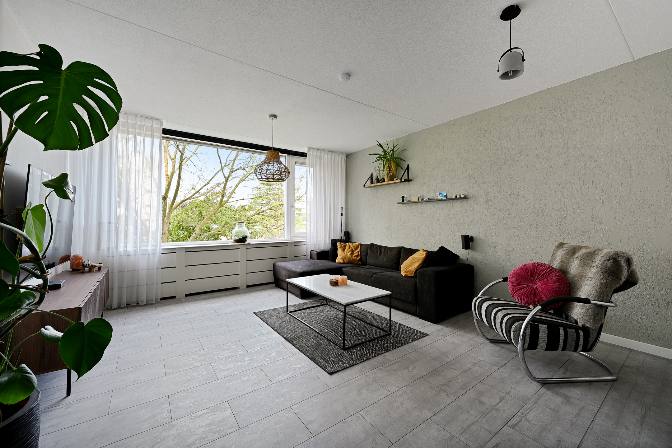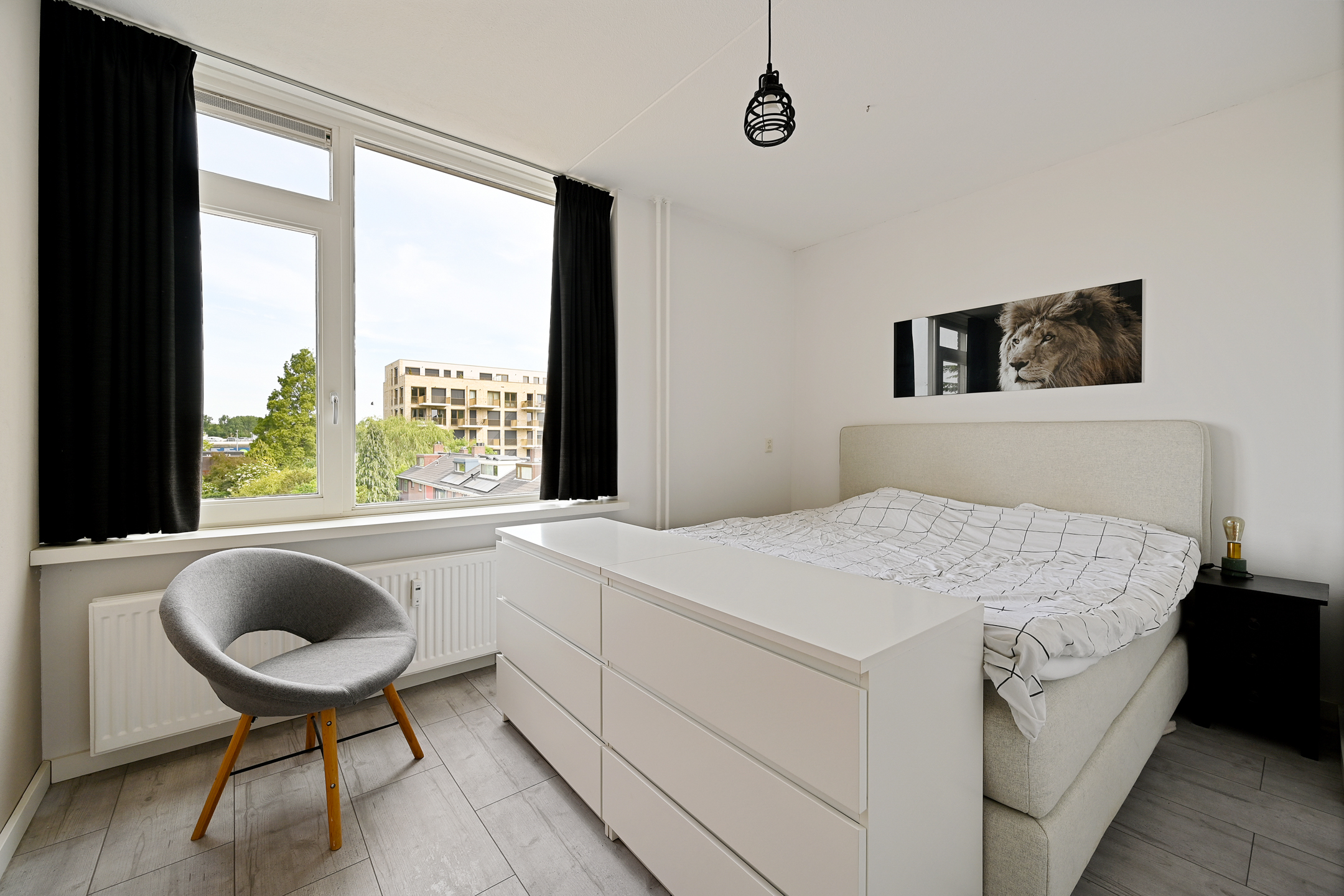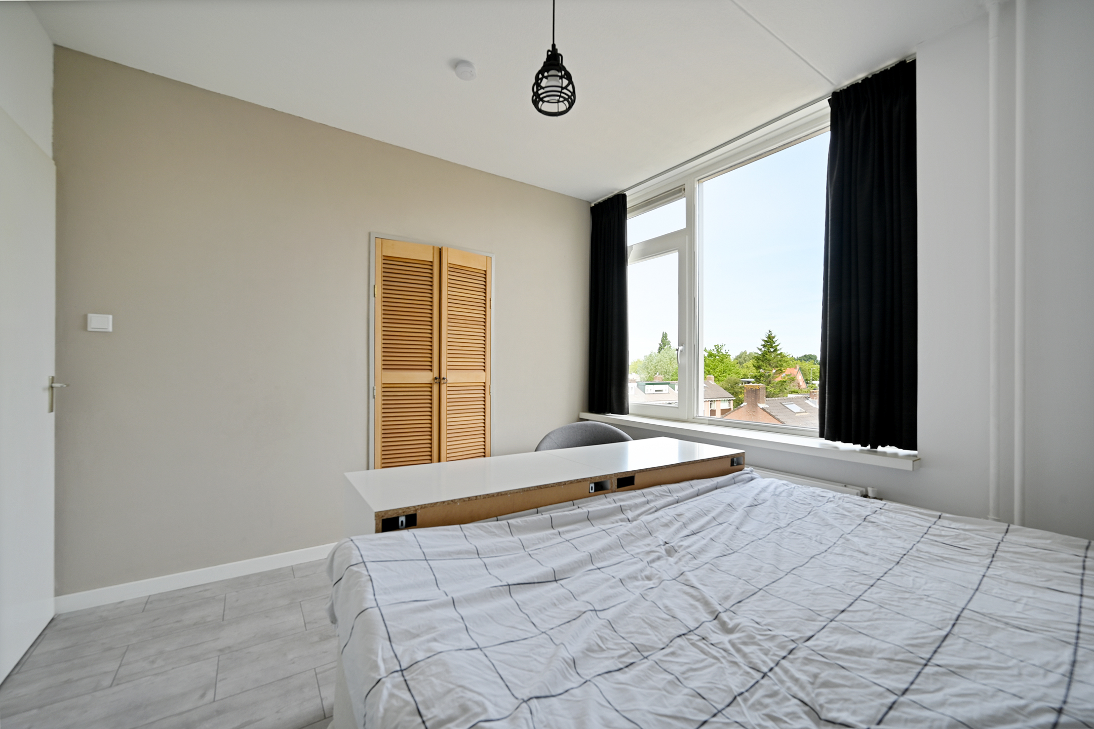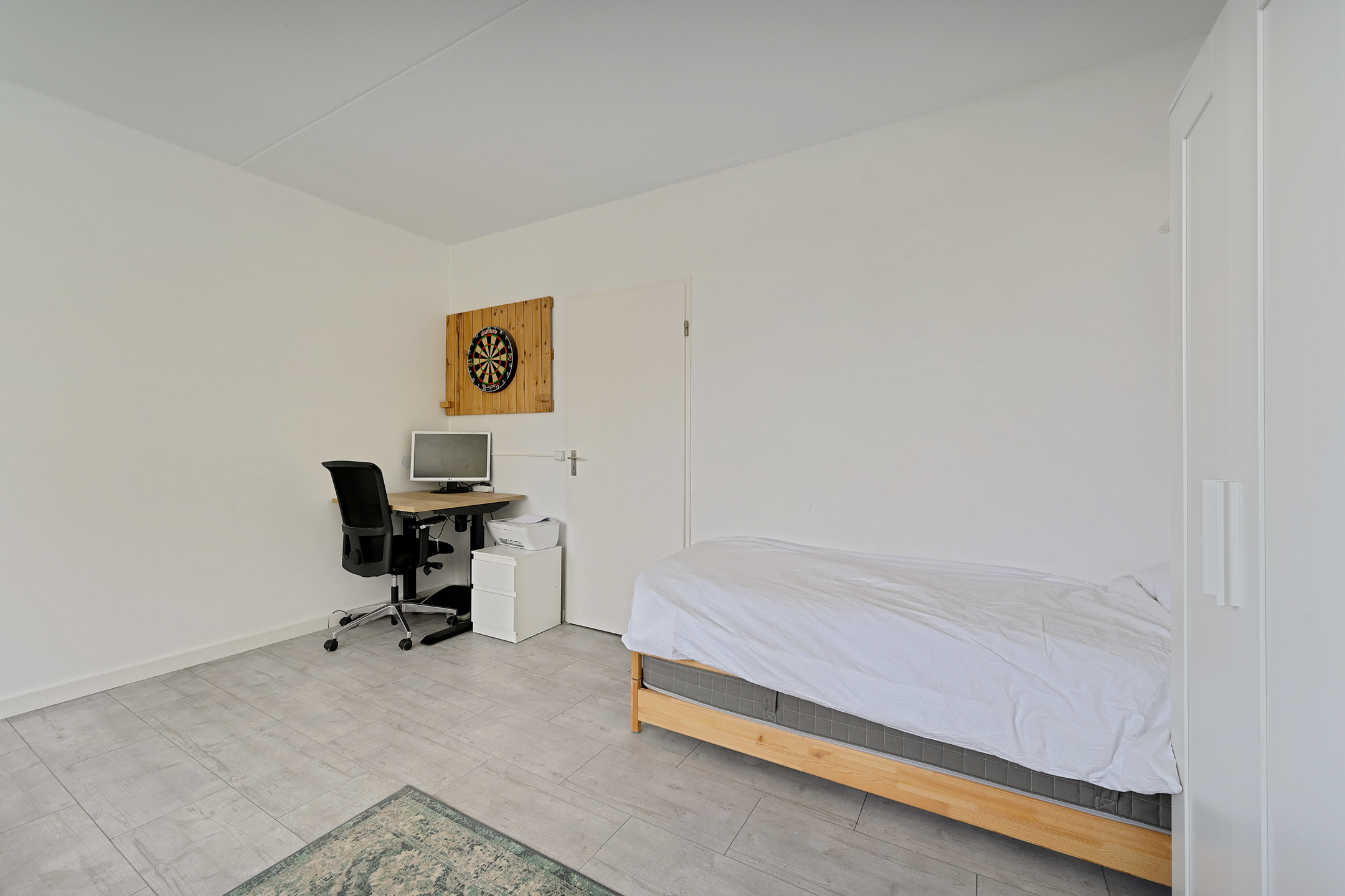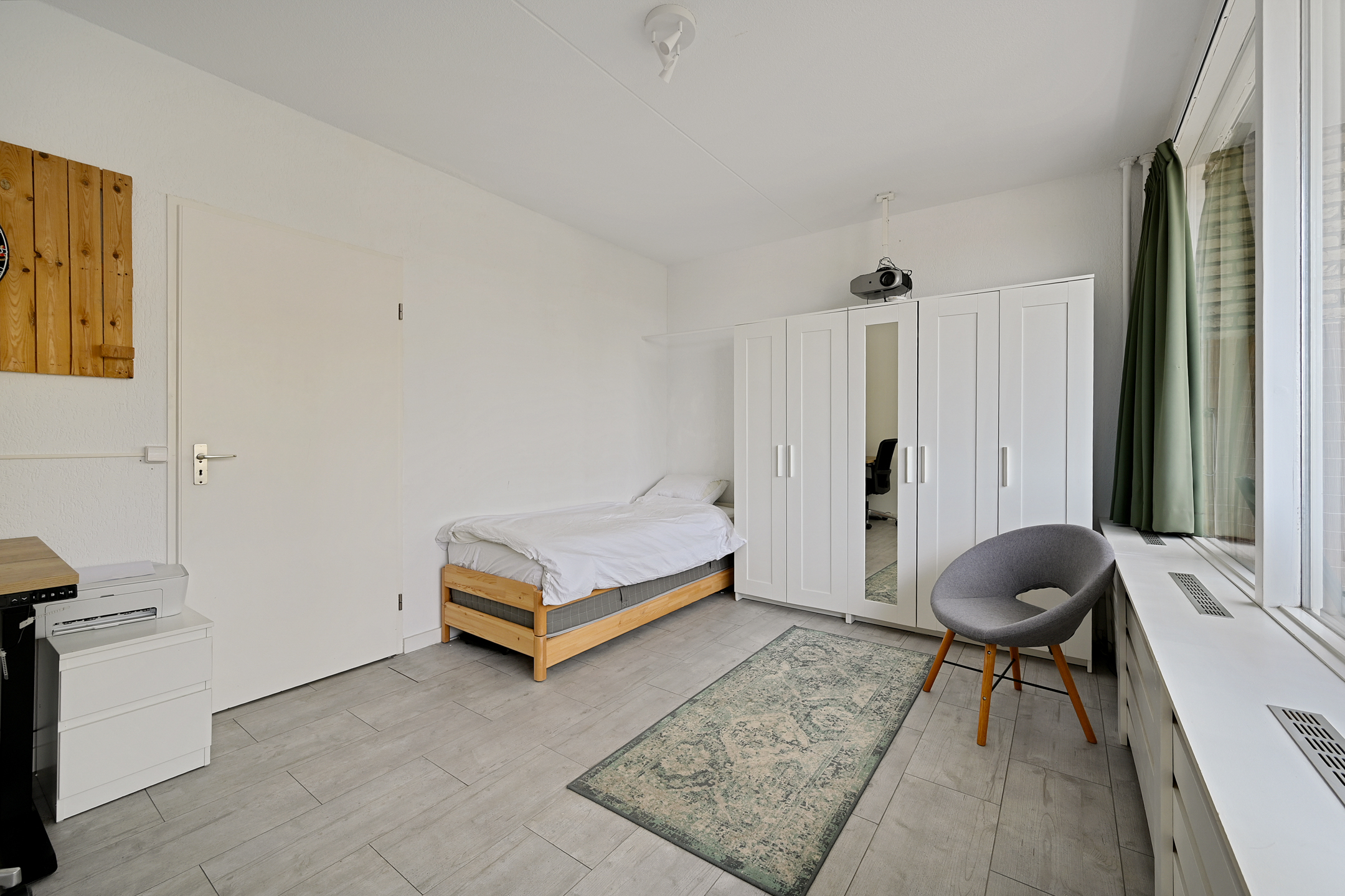 Aan de achterzijde ligt de tweede slaapkamer met directe toegang tot het zonnige balkon op het zuidwesten. Hier geniet je van rust, groen en zon tot in de avond. De woonkamer grenst eveneens aan dit balkon en biedt hetzelfde fijne uitzicht.