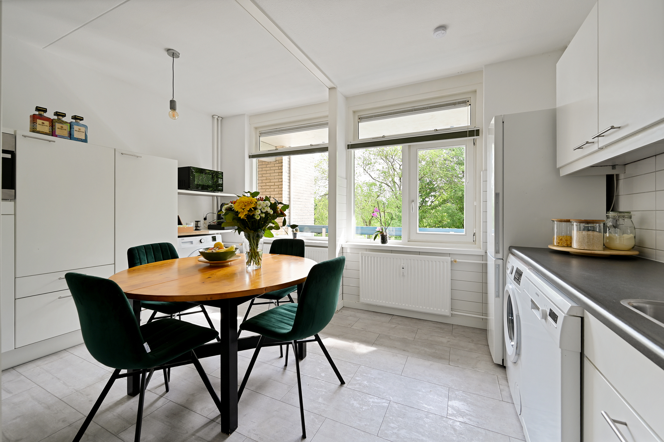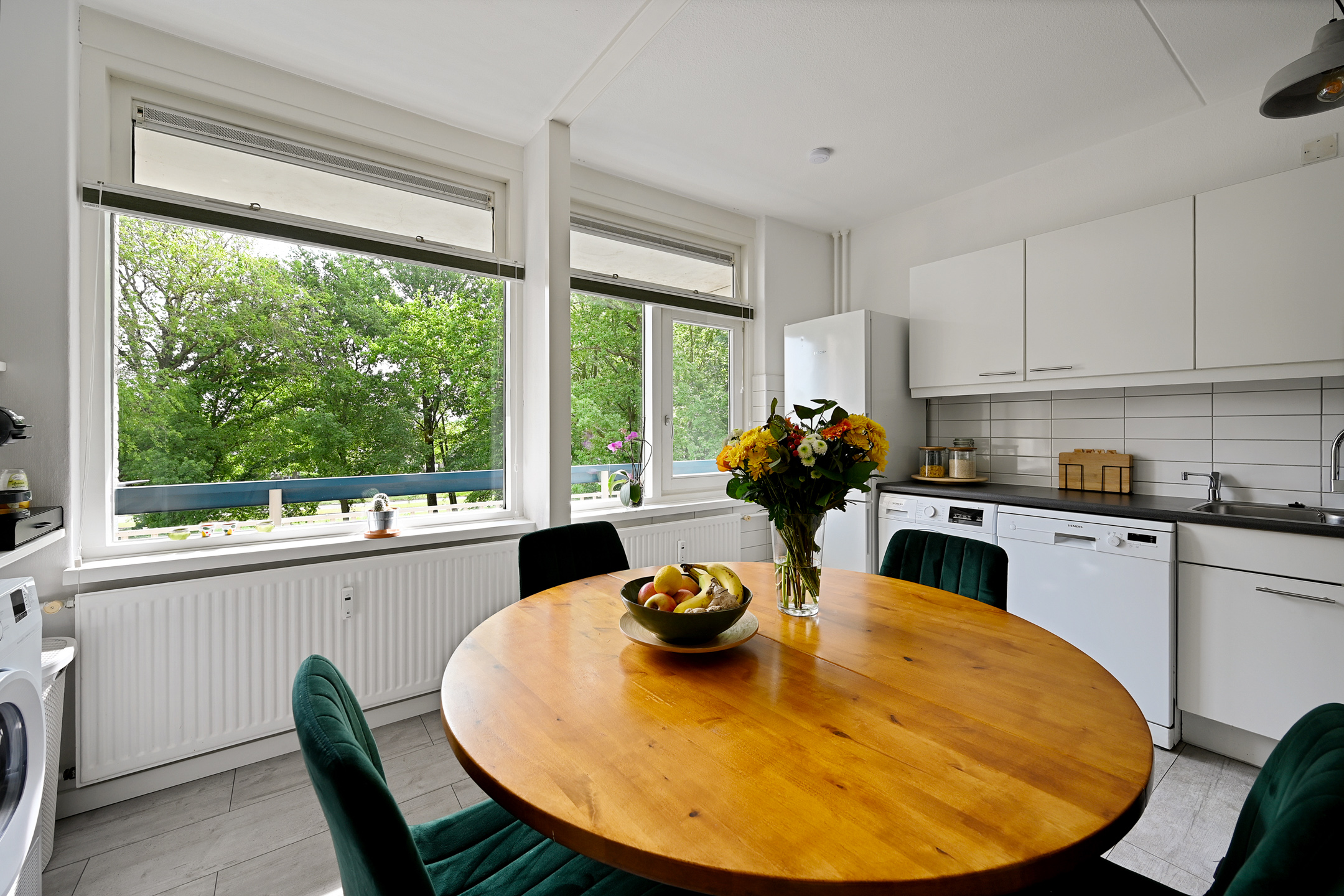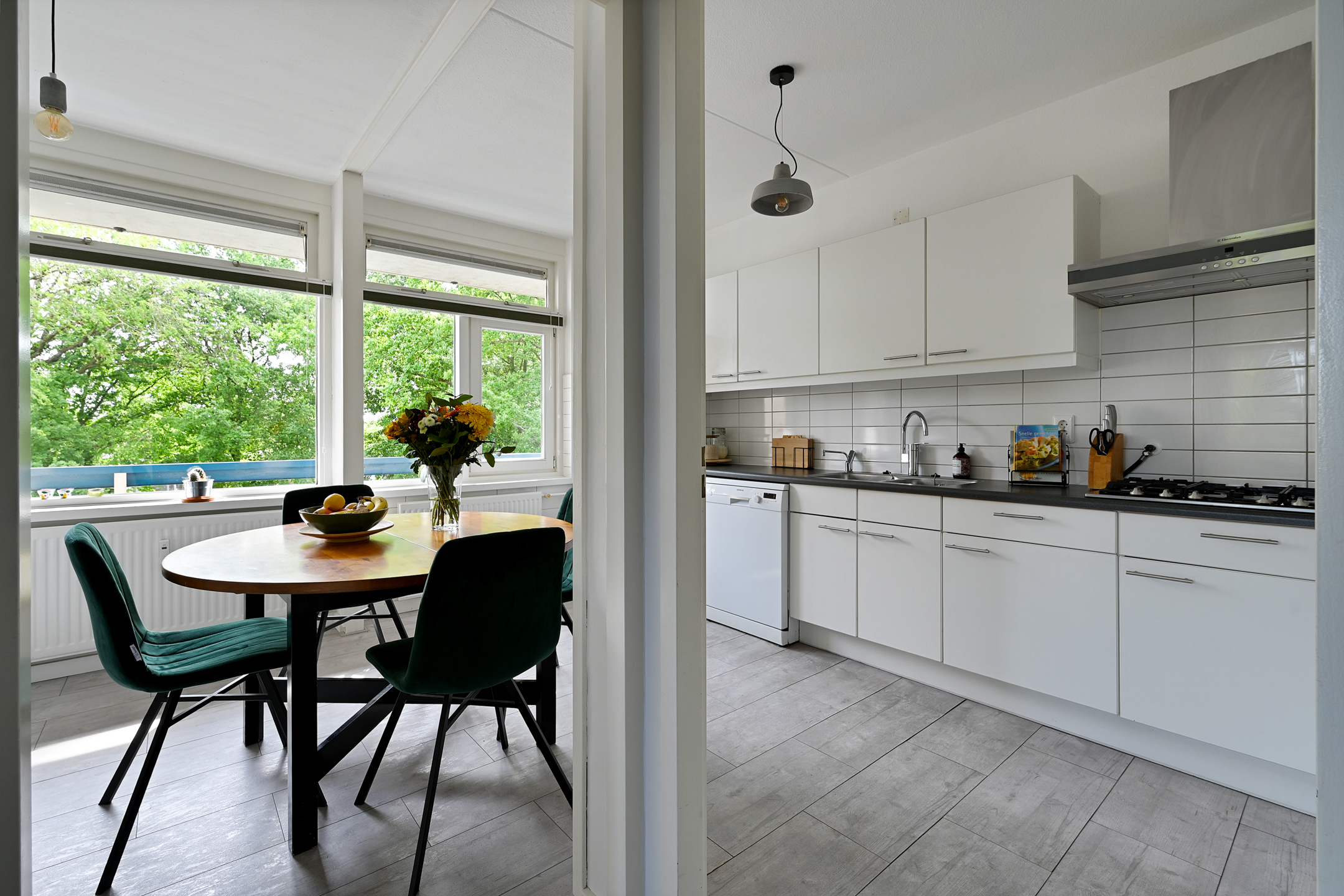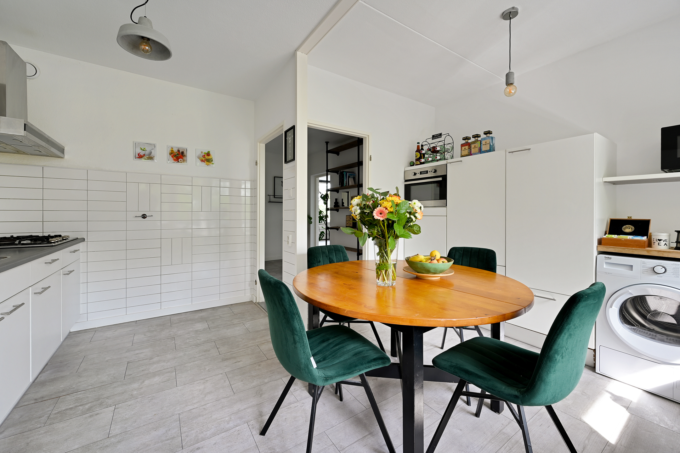 Er is voldoende plek voor een grote eettafel. De keuken is compleet uitgerust met een ruim gasfornuis, vaatwasser, Quooker, recirculatie-kap, veel kastruimte en een wasmachineaansluiting. Dankzij de oostelijke ligging start je hier je dag in de ochtendzon.