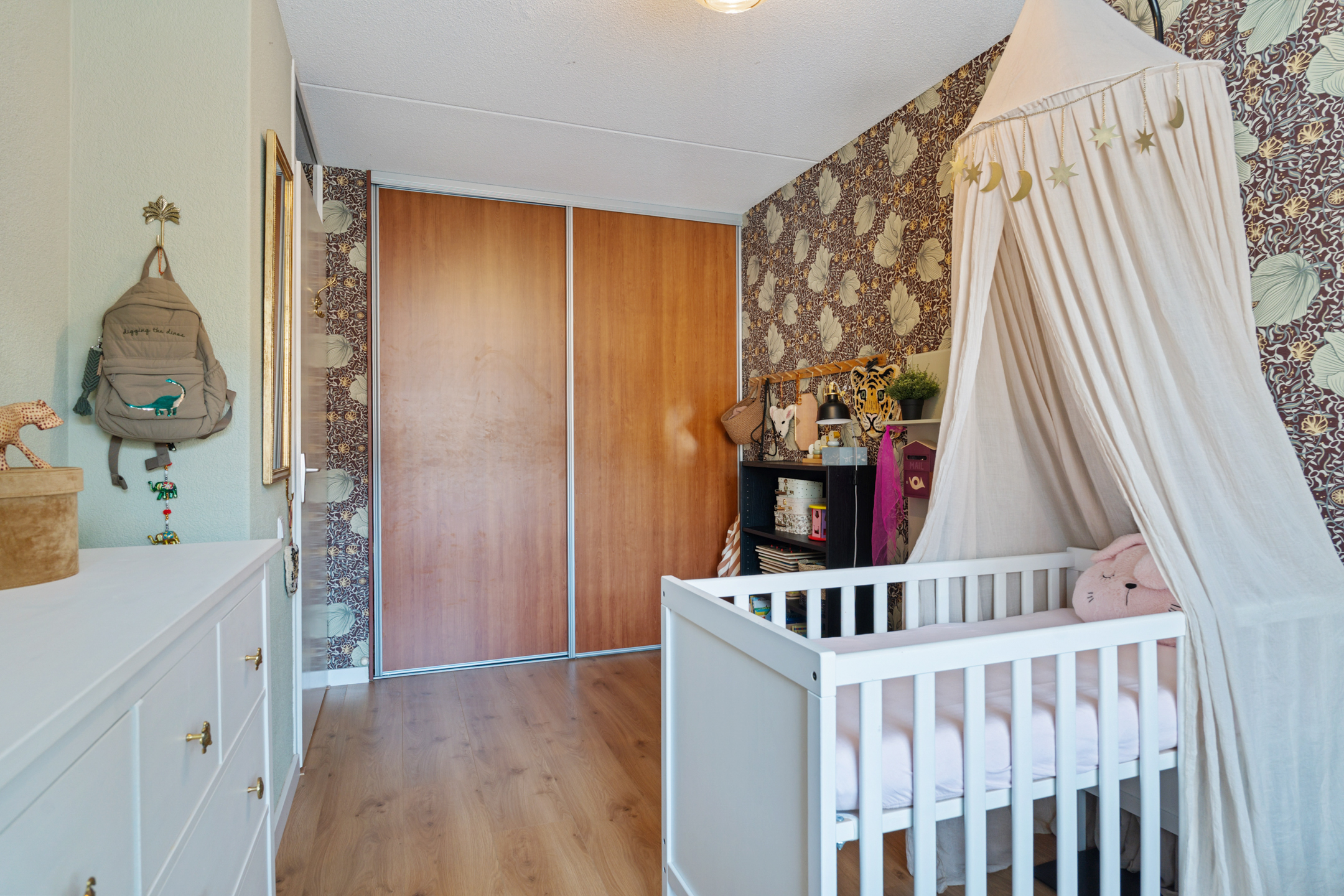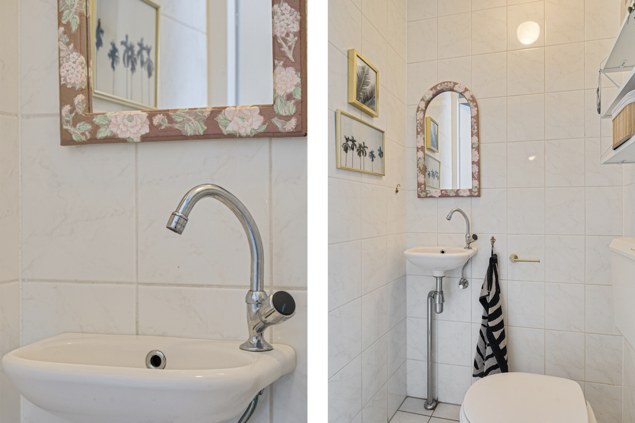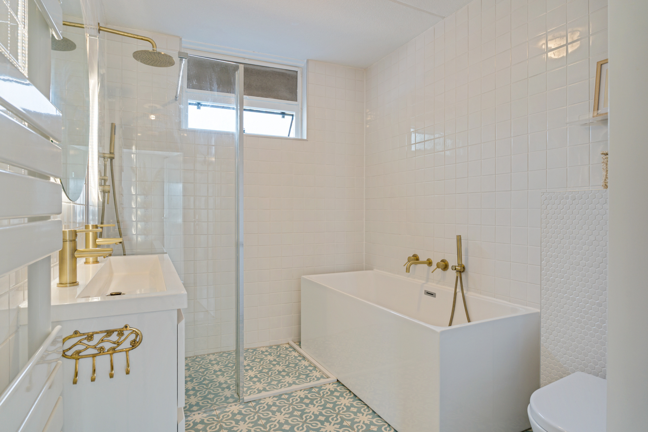 Via de trap kom je op de ruime overloop. Hier vind je twee ruime slaapkamers: één aan de voorzijde met handige schuifkast en één aan de achterzijde over de volledige breedte van de woning. De vernieuwde badkamer is praktisch ingedeeld met een ligbad, inloopdouche, designradiator, tweede toilet en royale wastafelmeubel voorzien van een dubbele kraan.