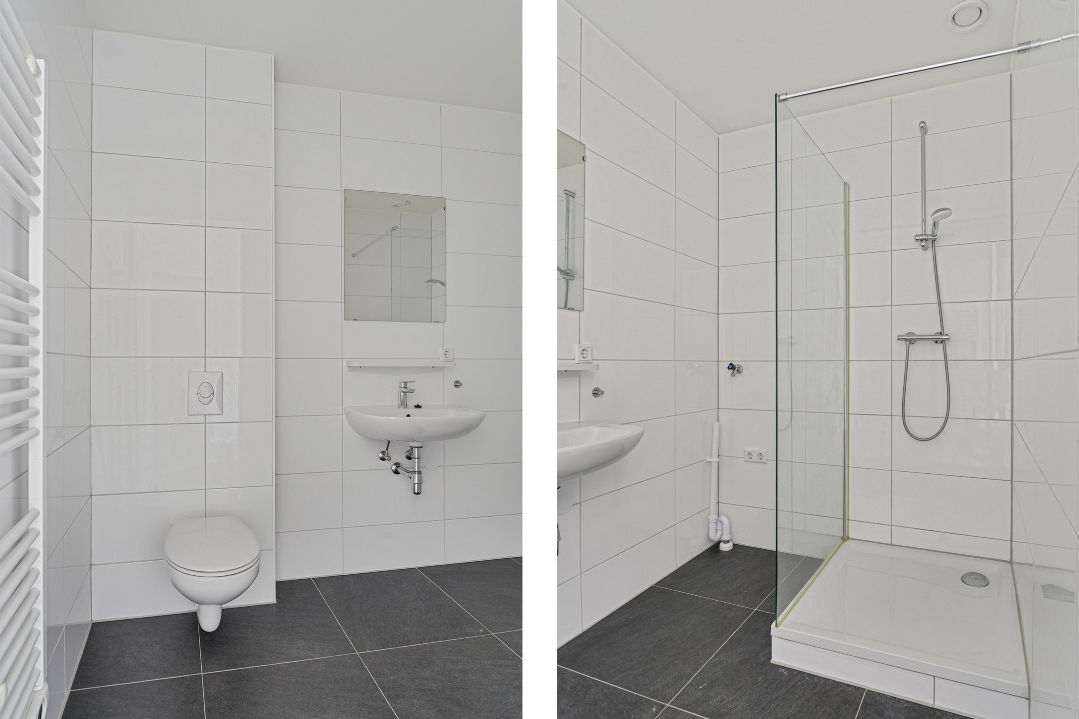 De badkamer is netjes betegeld met grijze vloertegels en witte wandtegels tot aan het plafond. Je vindt hier een douche met glazen wand en gordijn, een wastafel met planchette en spiegel, een wandcloset en de aansluiting voor de wasmachine.