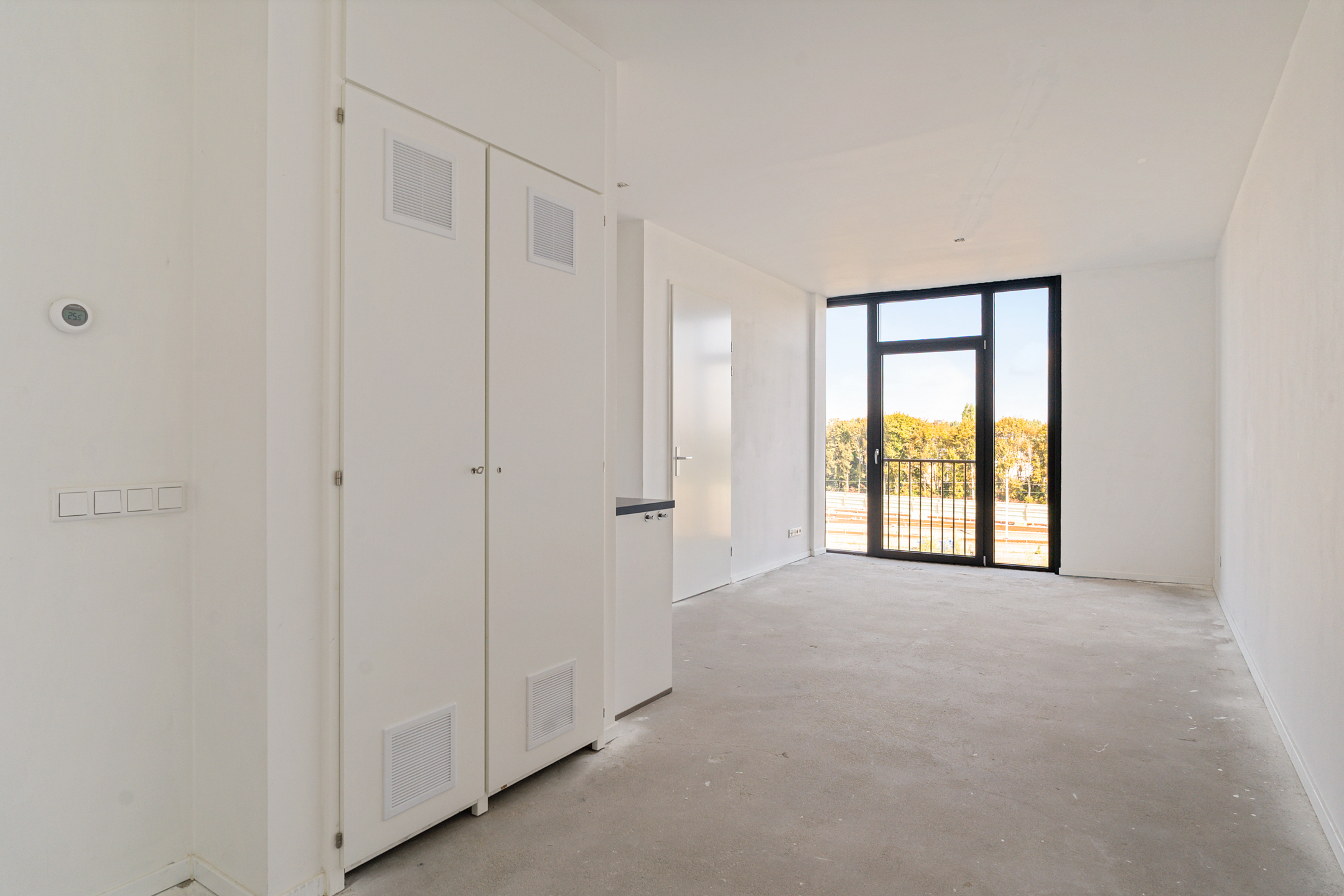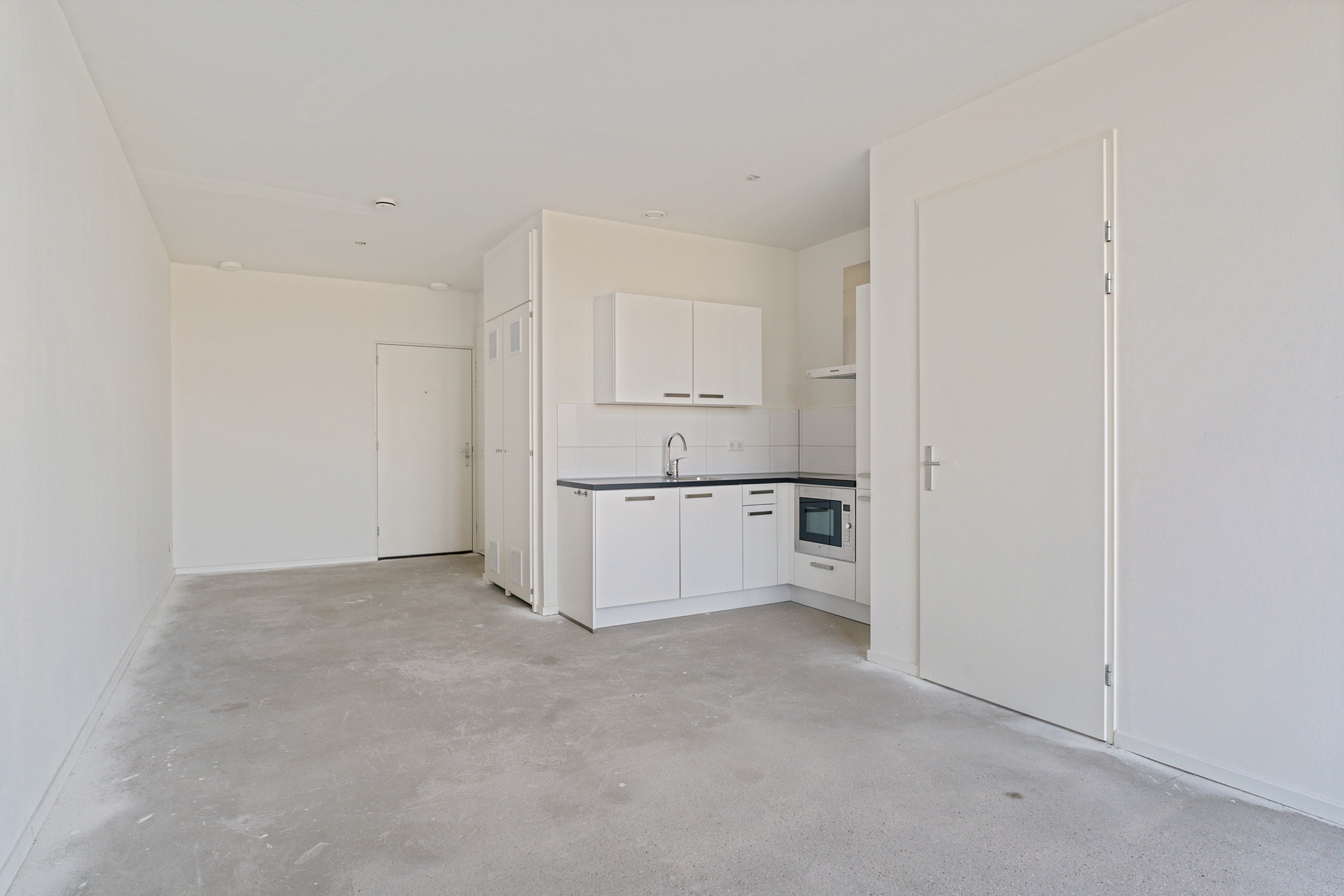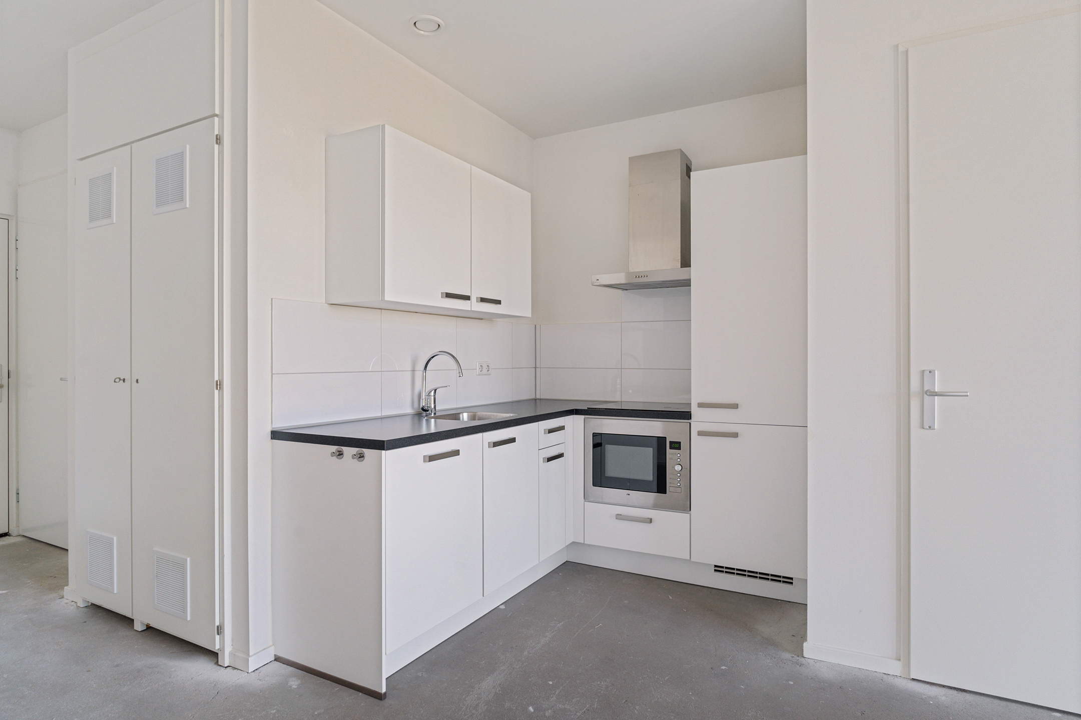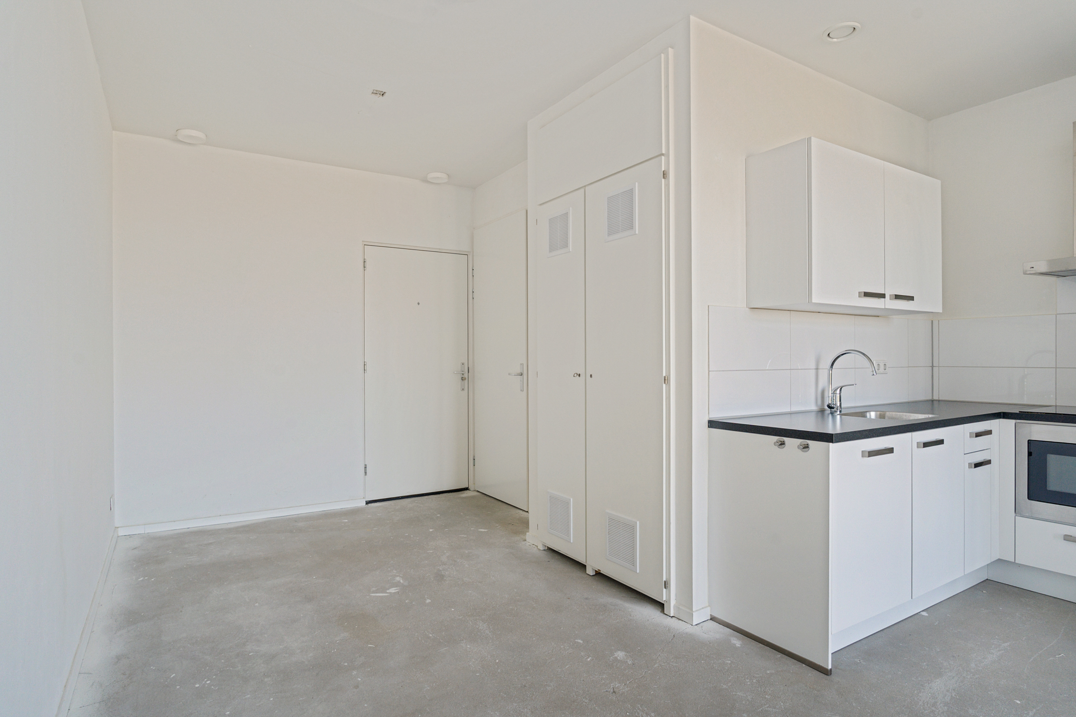 De studio heeft een open indeling met een lichte woonruimte, afgewerkt met laminaat en plafondlampen. De keuken is geplaatst in een hoekopstelling en uitgevoerd in wit met een grijs werkblad. Voorzien van koel-vriescombinatie (2,5 laden), magnetron, vaatwasser (links naast de spoelbak), afzuigkap, bovenkastjes en diverse lades.