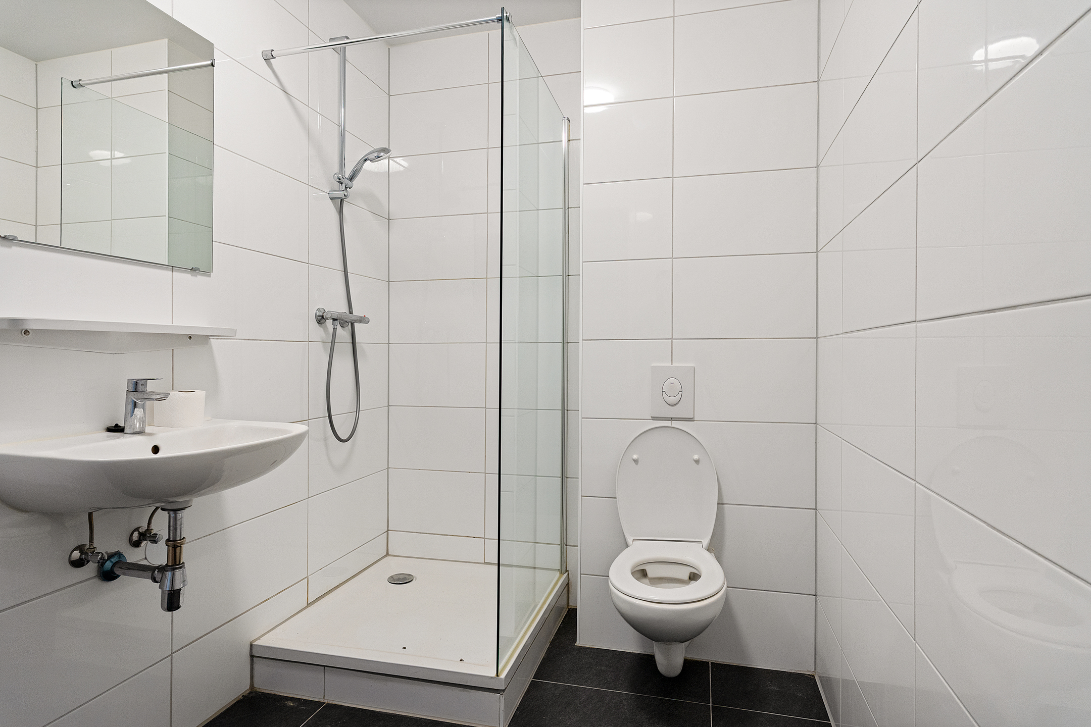 De badkamer is betegeld met grijze vloertegels en witte wandtegels tot aan het plafond. Je vindt hier een douche met glazen wand en gordijn, een wastafel met planchette en spiegel, een wandtoilet en de opstelplaats voor de wasmachine.