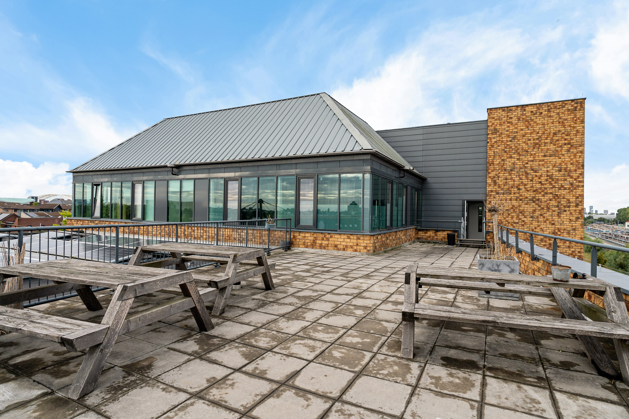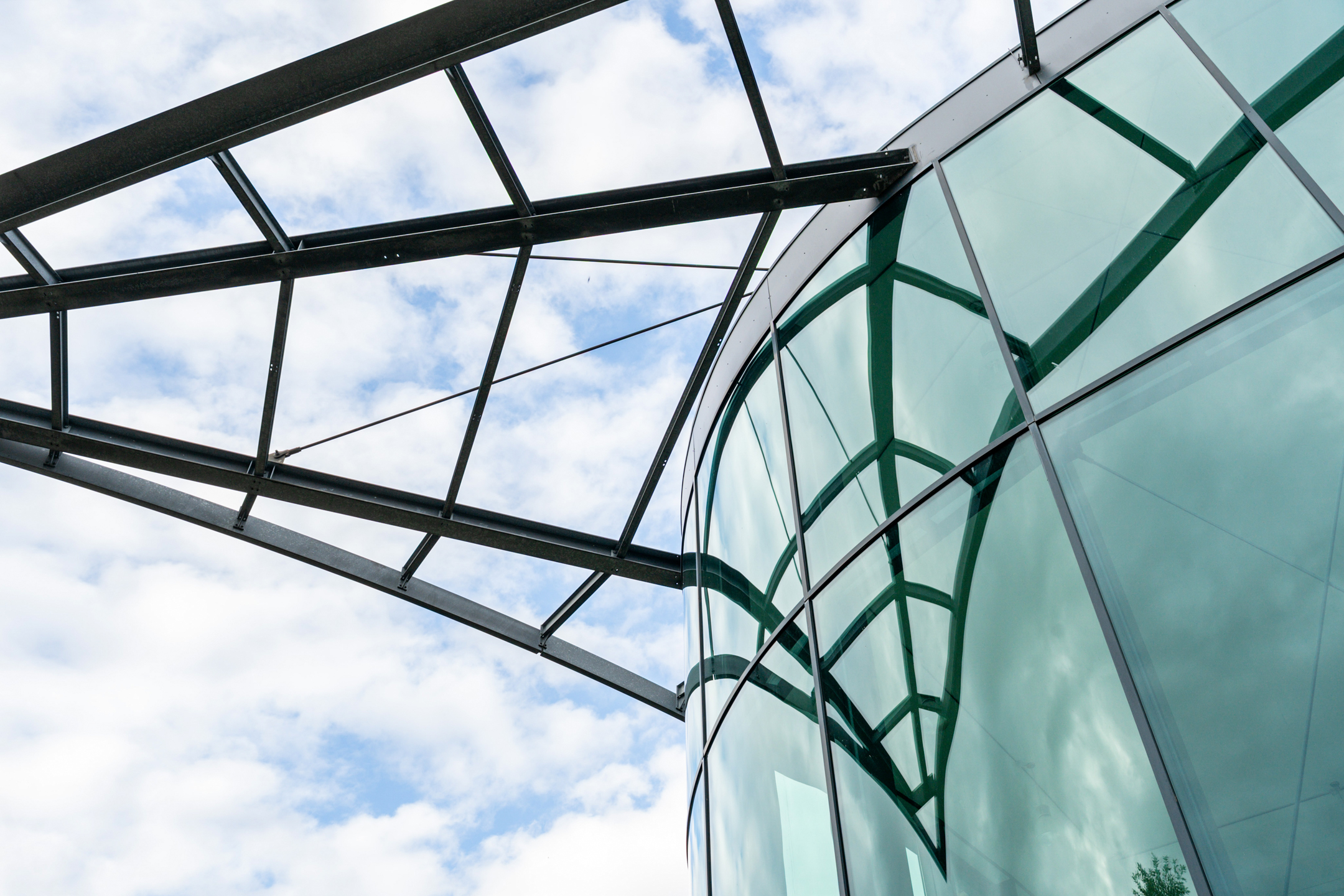 Het gebouw heet The Rhino, een naam die je gelijk ziet terugkomen in de imposante staalconstructie boven de entree, die het pand karakter geeft en de overgang markeert van kantoor naar wooncomplex.