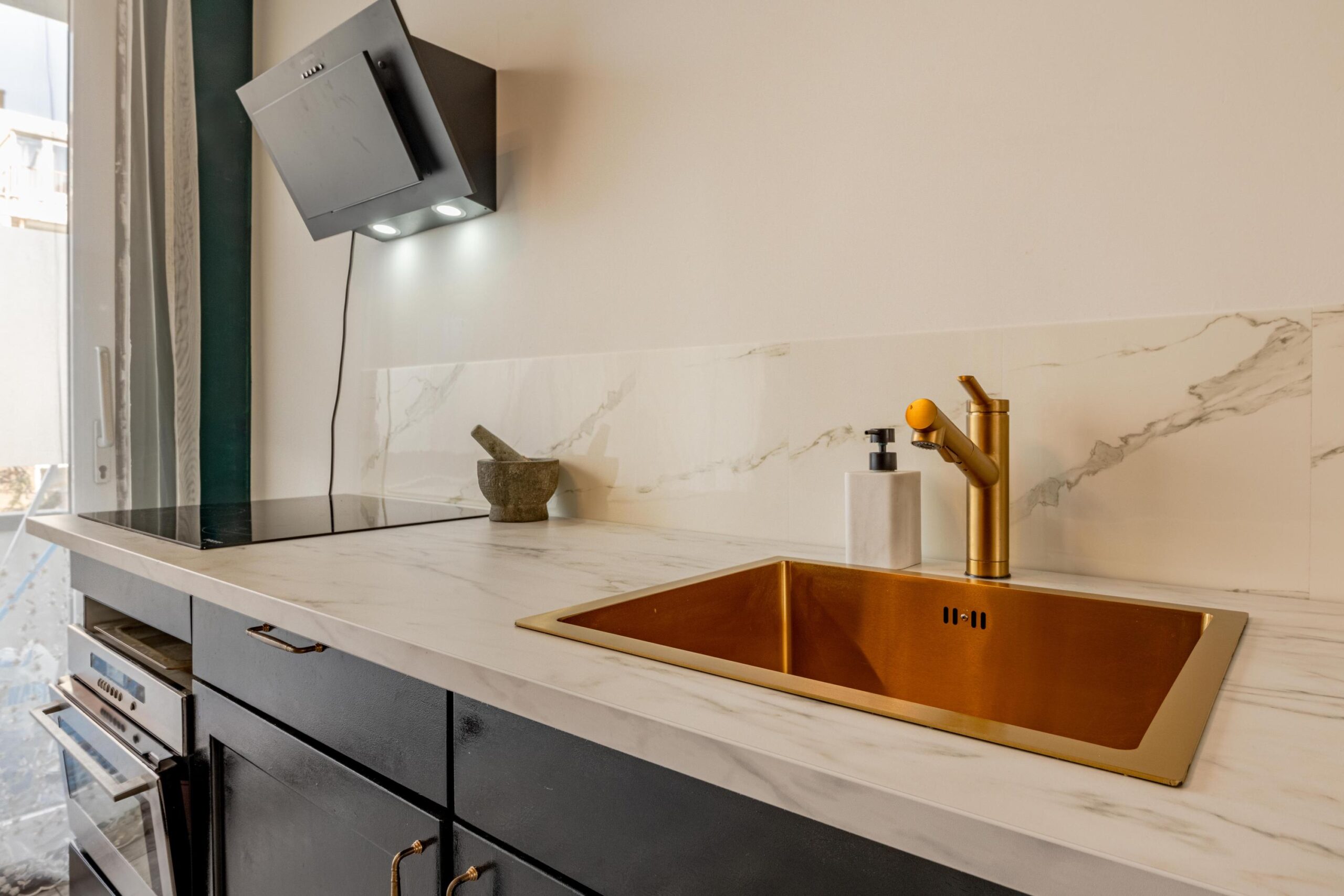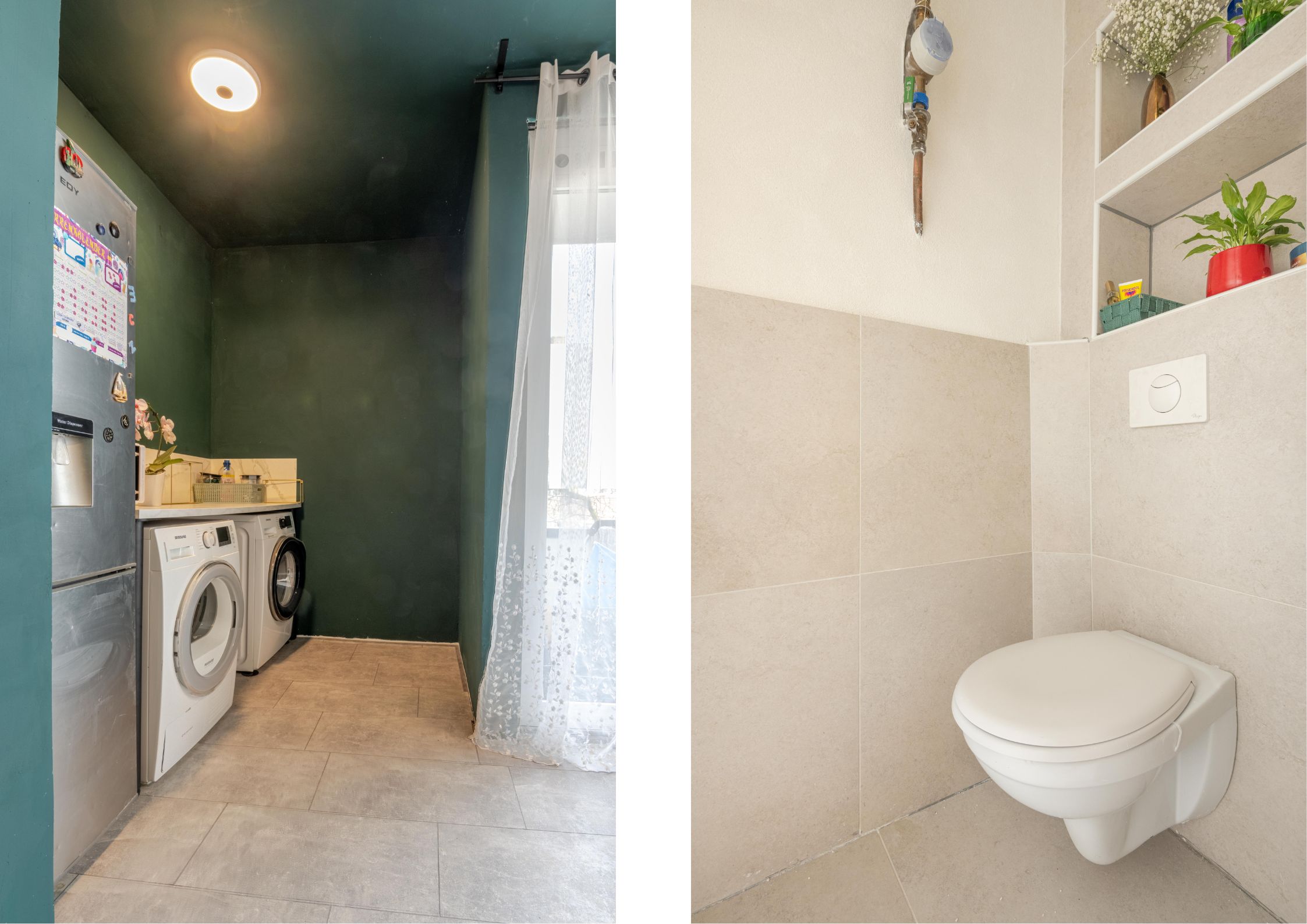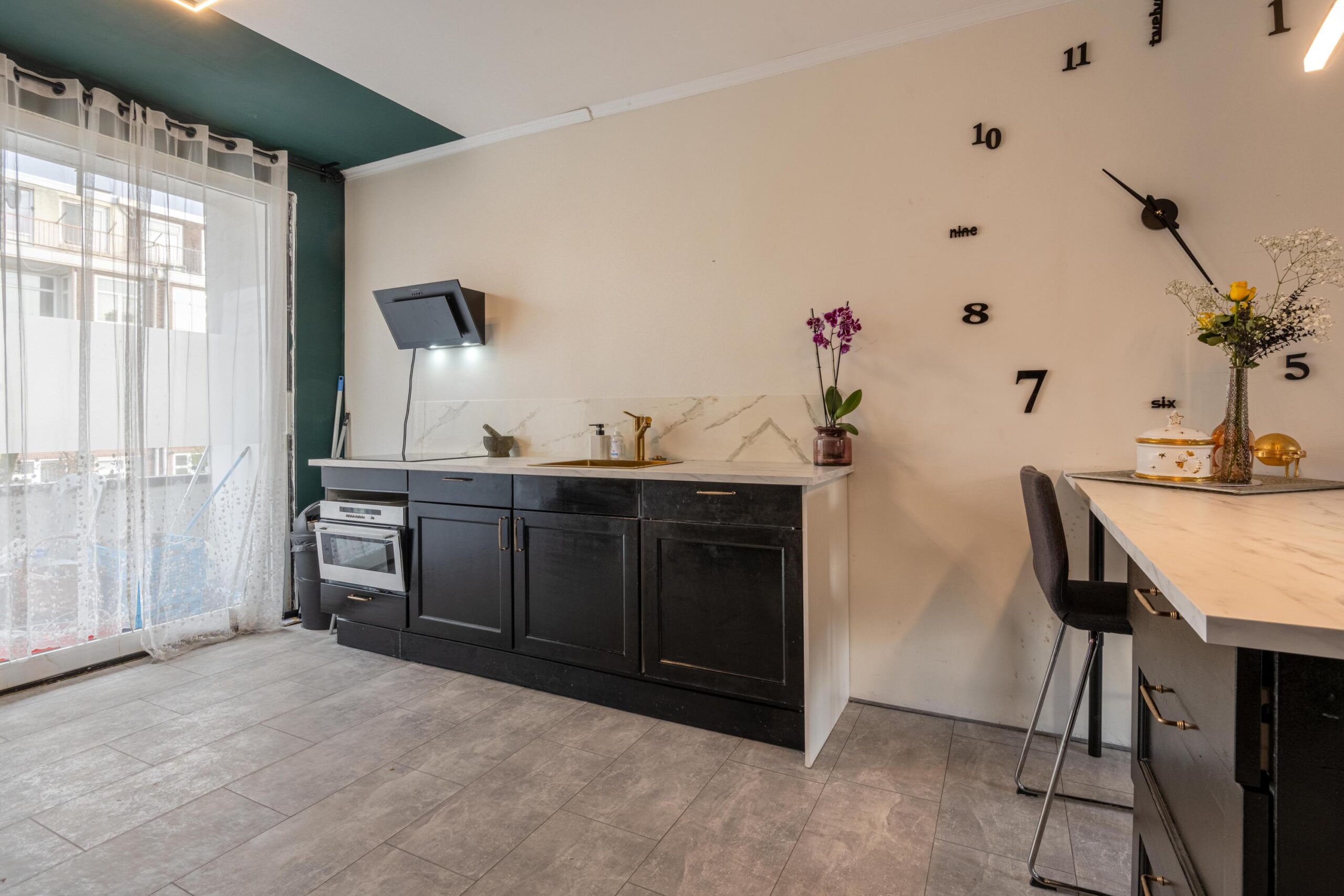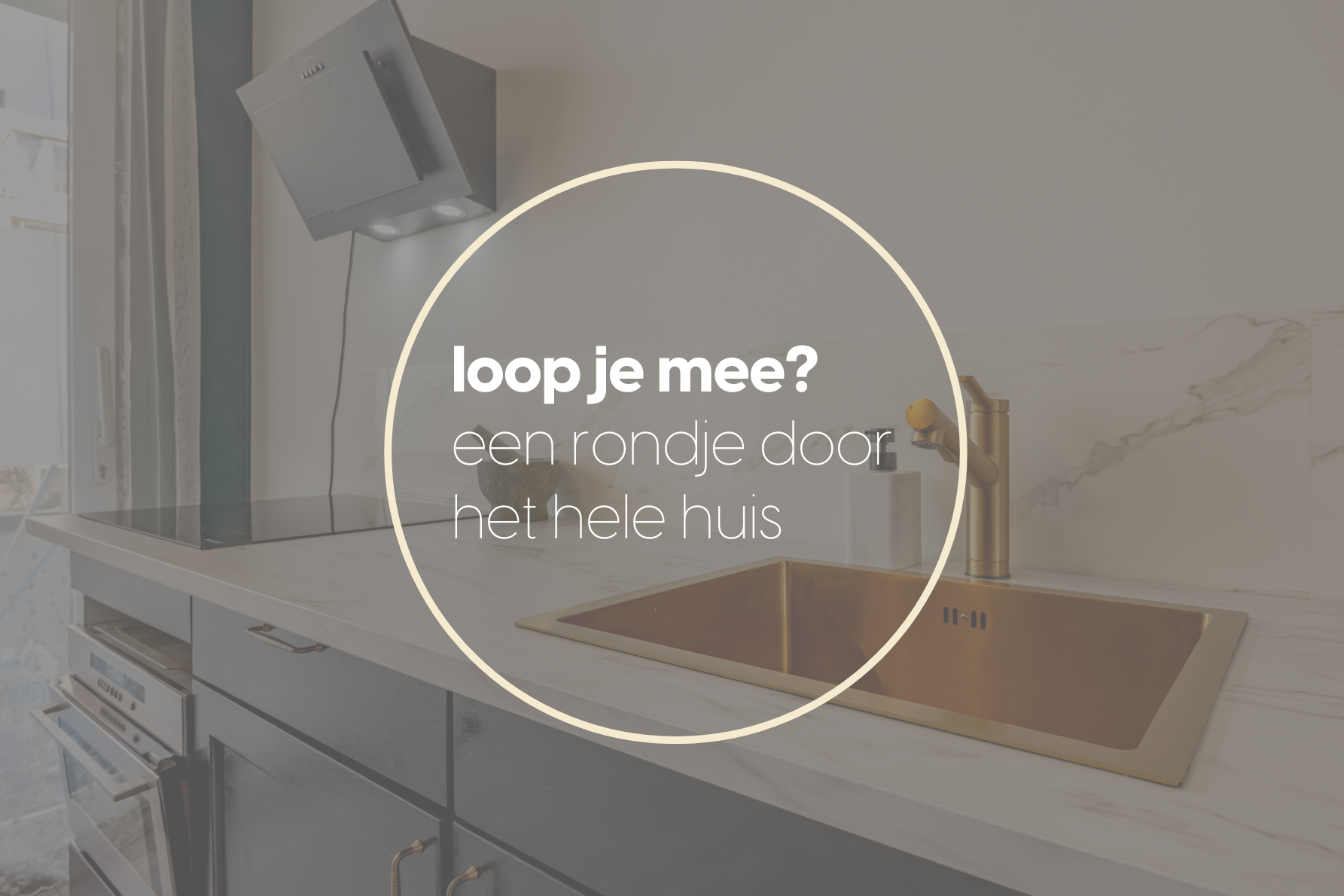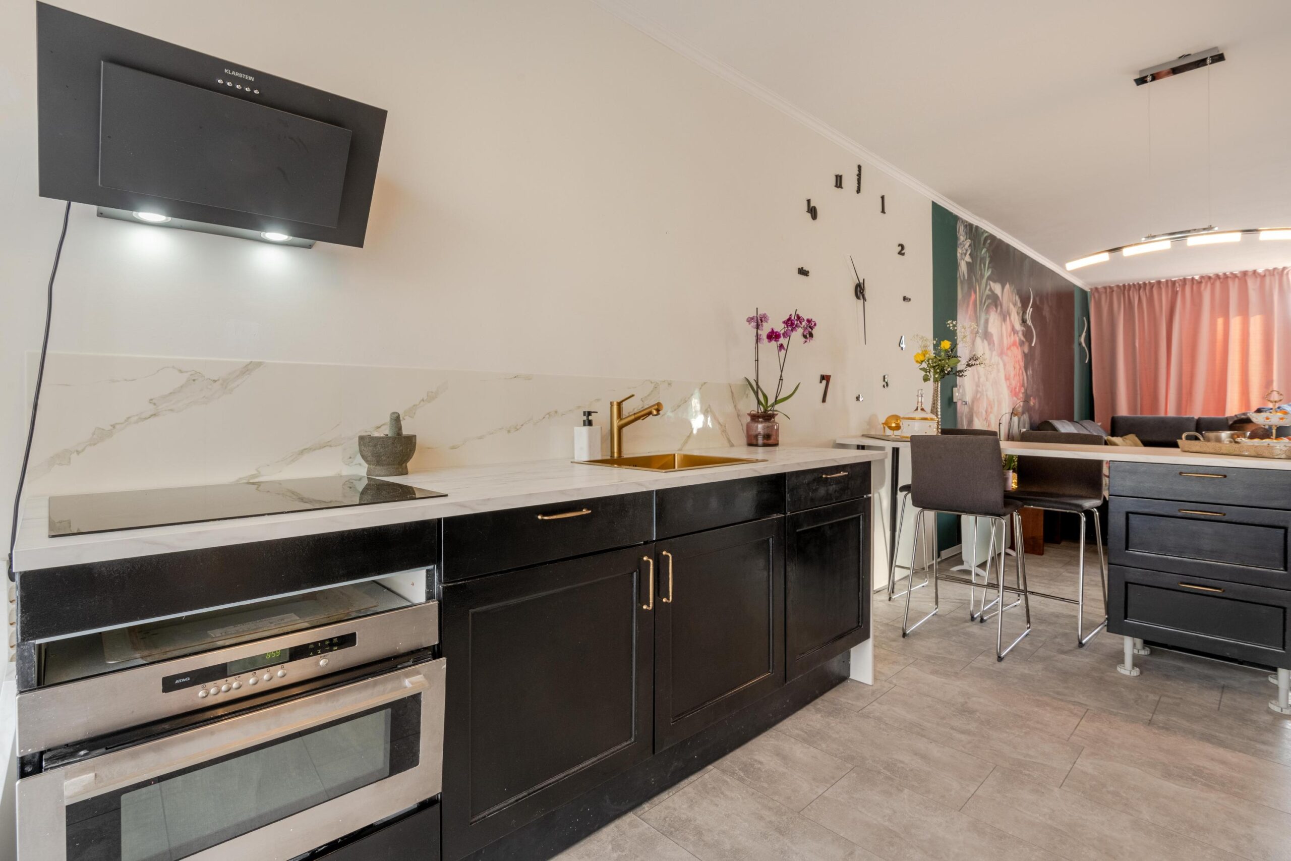 De open keuken is afgewerkt met een marmerlook werkblad en voorzien van een inductiekookplaat, afzuigkap, oven en een bar met opbergruimte. Vanuit de keuken heb je toegang tot de wasruimte en het inpandige balkon op het noorden. Op deze verdieping bevindt zich ook het modern betegelde toilet met wandcloset, fonteintje en inbouwspots.
