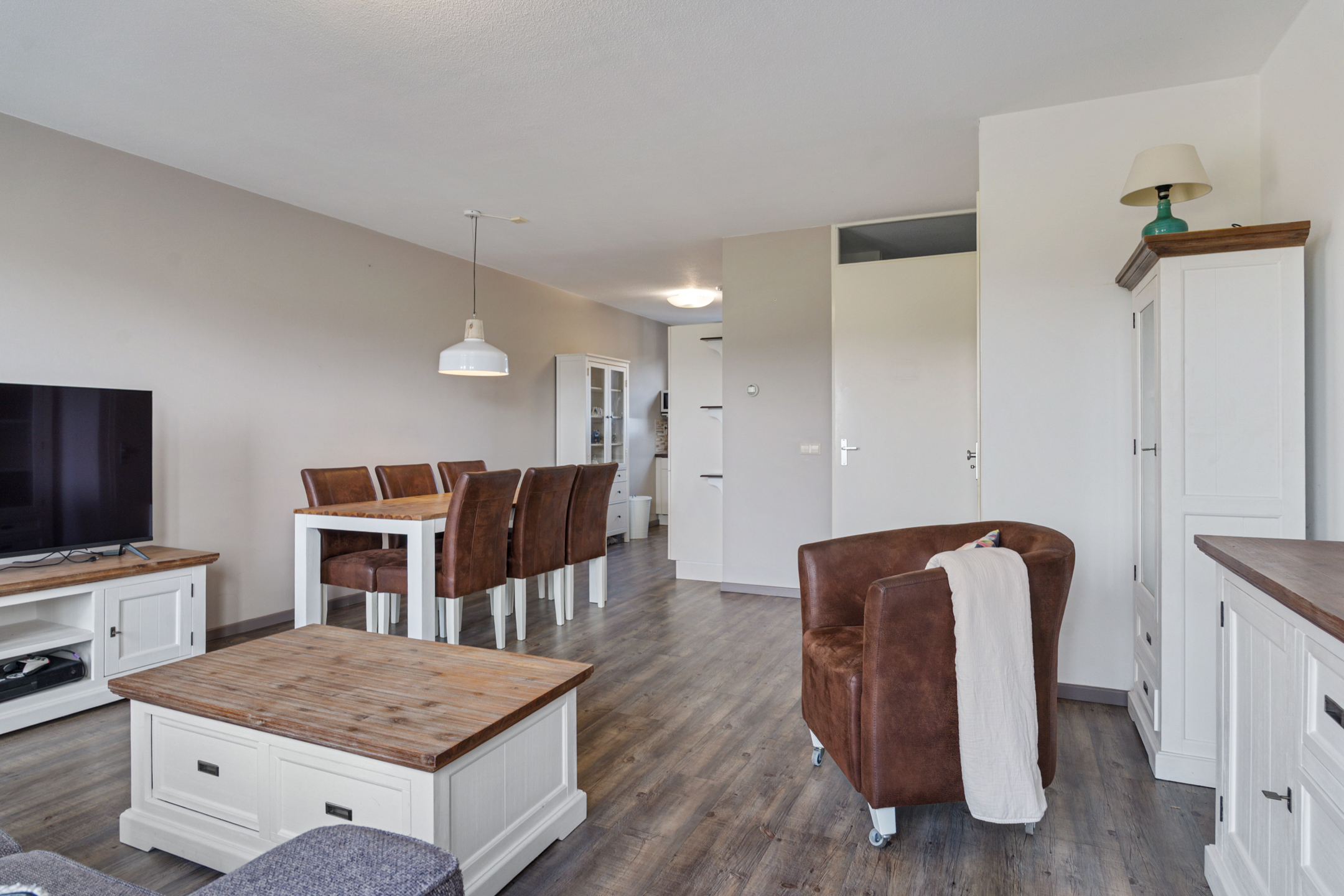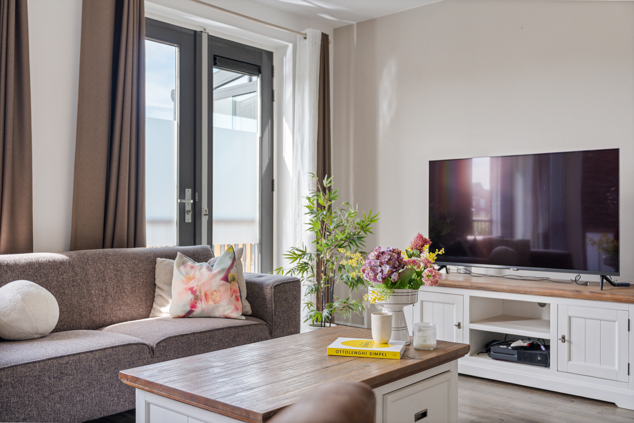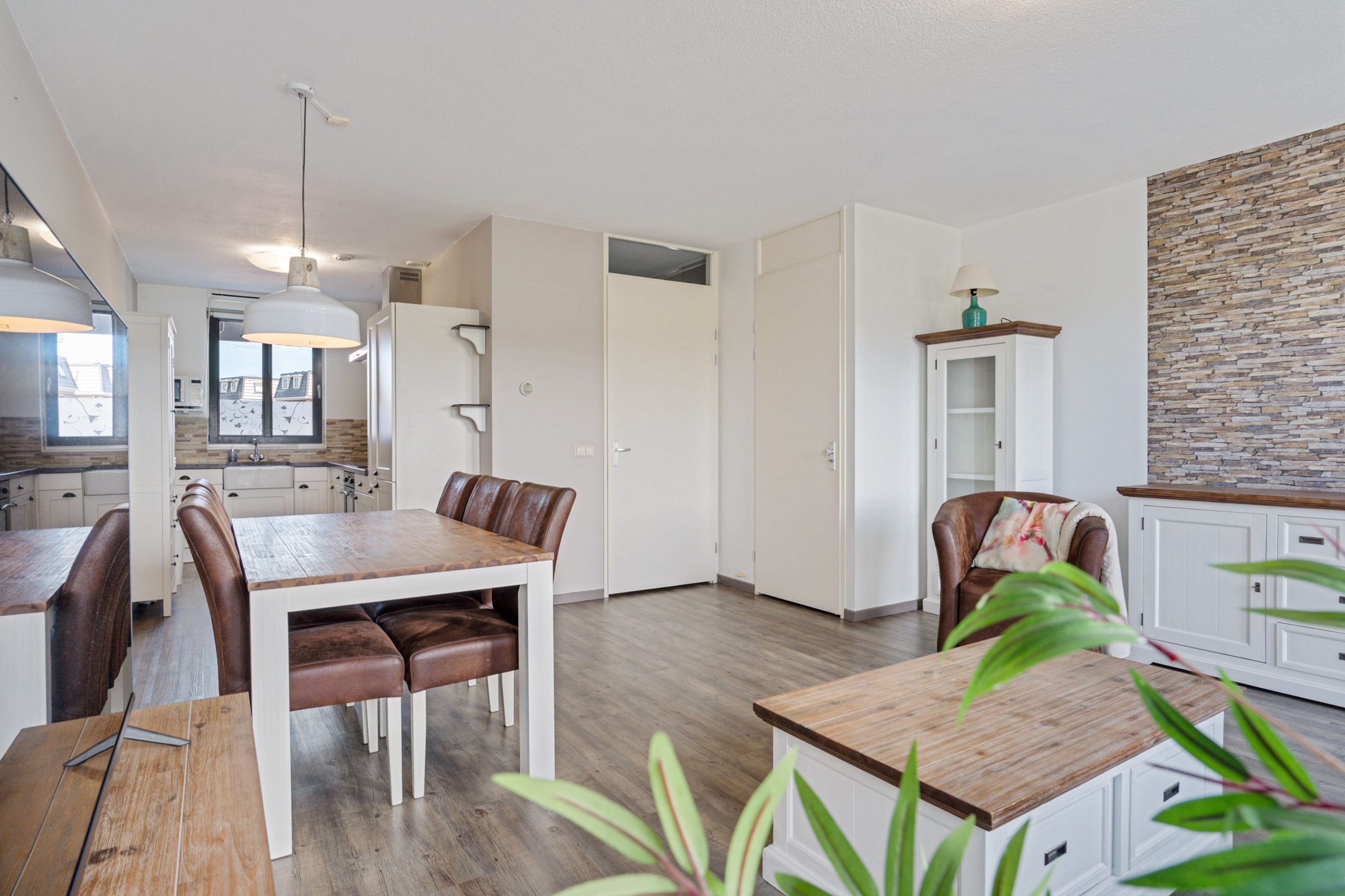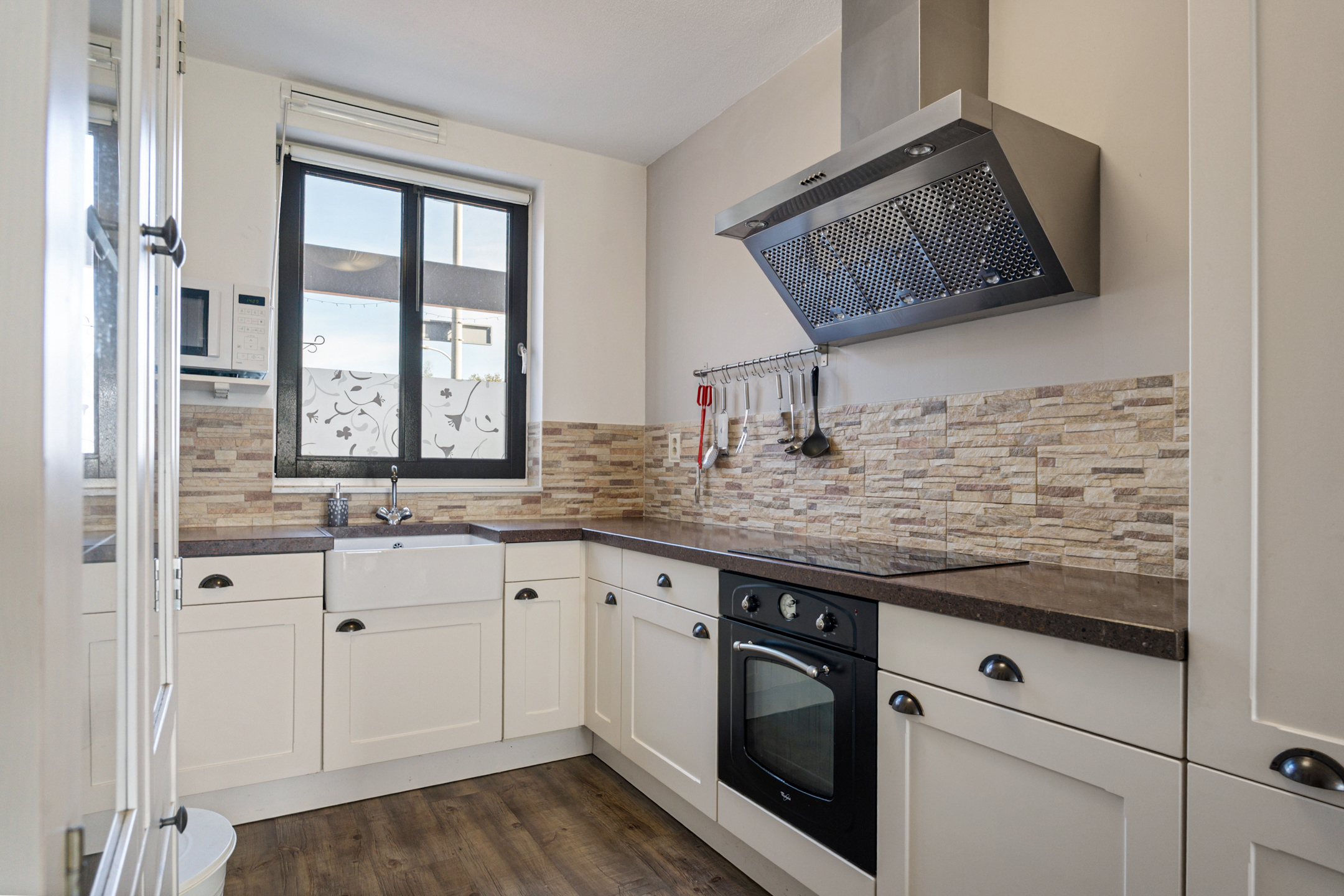 Aan de voorzijde bevindt zich de moderne, lichte keuken in L-opstelling. Deze is van alle gemakken voorzien: inductiekookplaat, oven, koelkast, vriezer, vaatwasser en voldoende kastruimte. Een fijne plek om te koken met uitzicht op de rustige straat.