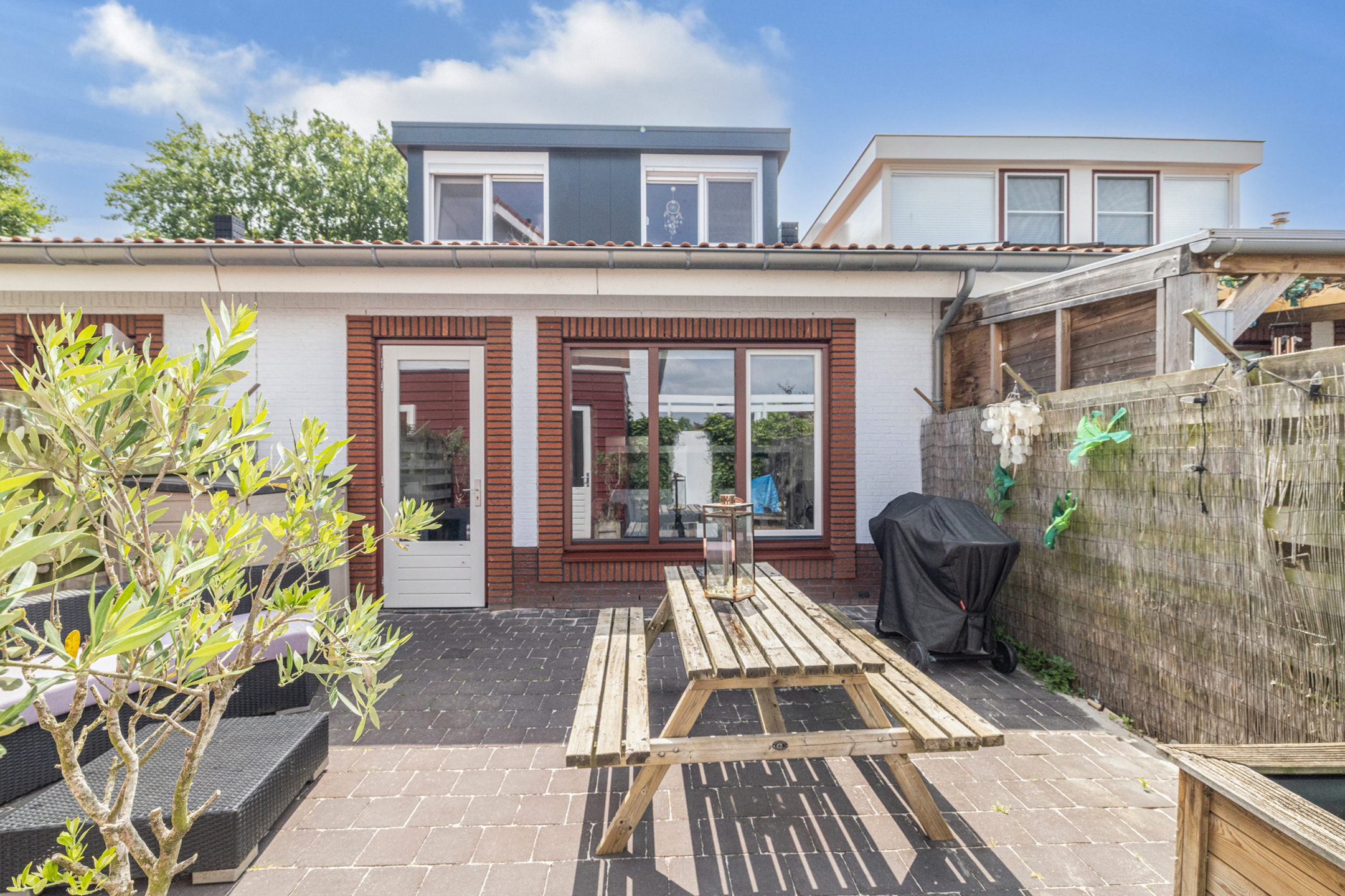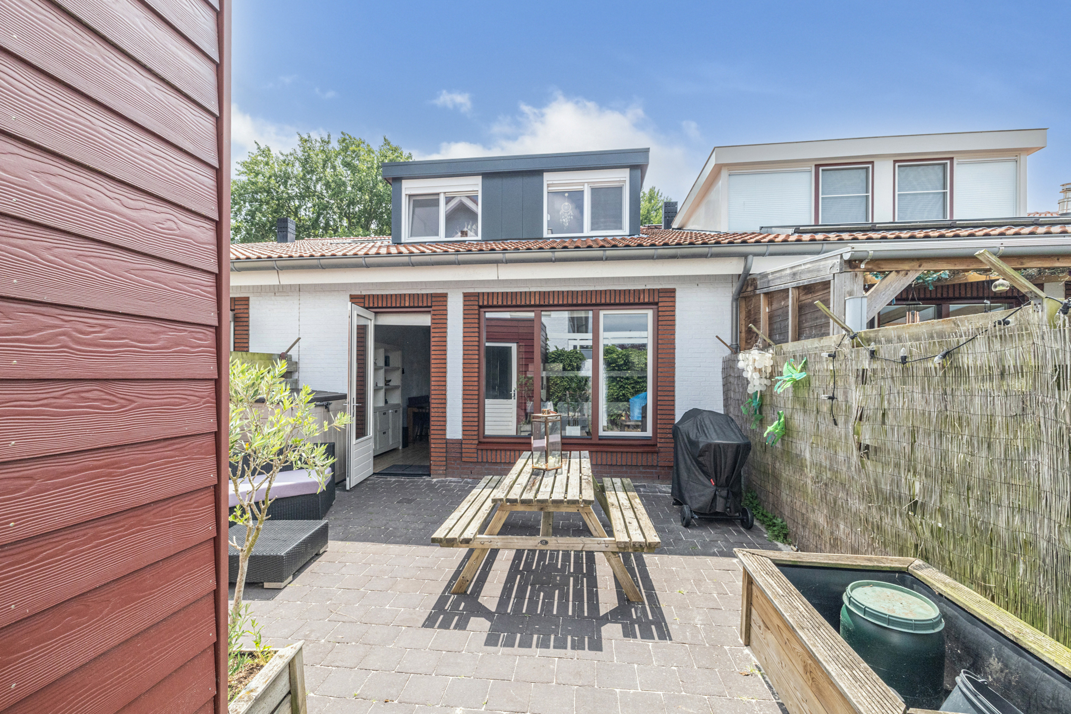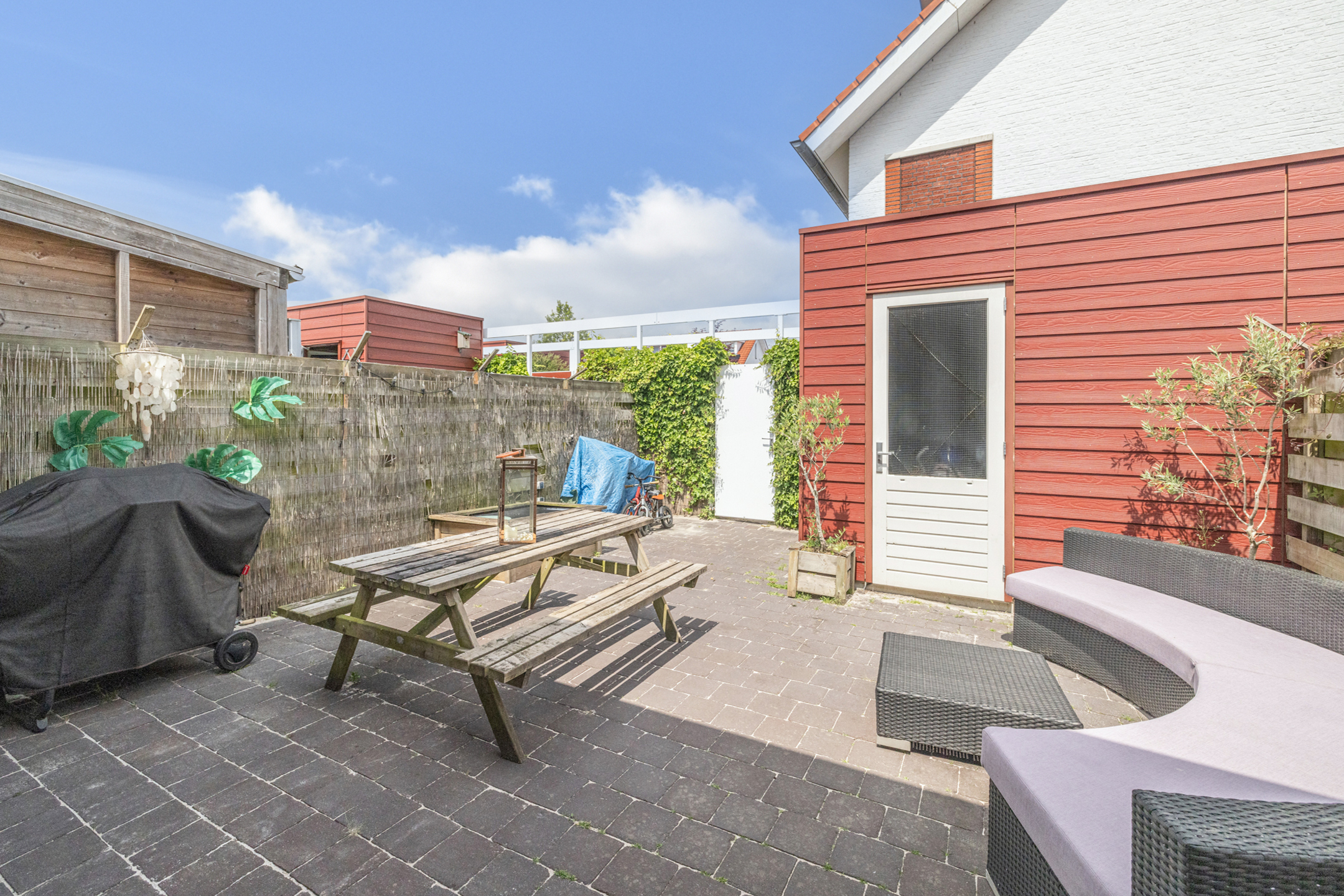 De volledig betegelde achtertuin is onderhoudsvriendelijk aangelegd en beschikt over een achterom en een kunststof berging. Ondanks de noordoostelijke ligging zorgt de gunstige dakhelling voor een prettige zonligging. Aan de voorzijde bevindt zich een verzorgd voortuintje met overdekte entree.
