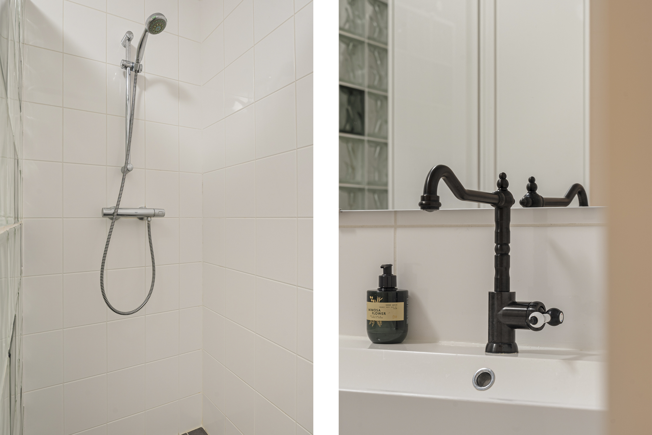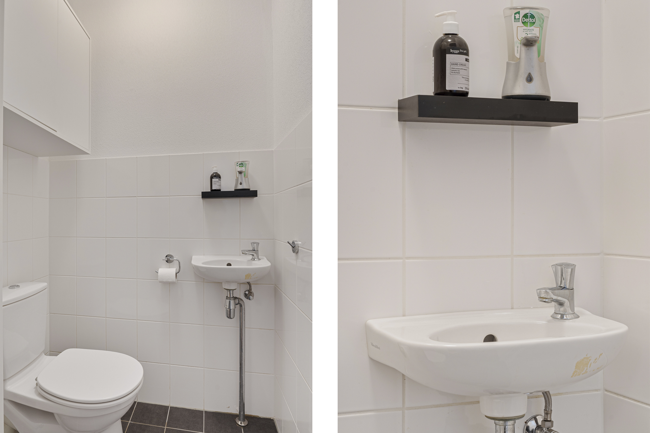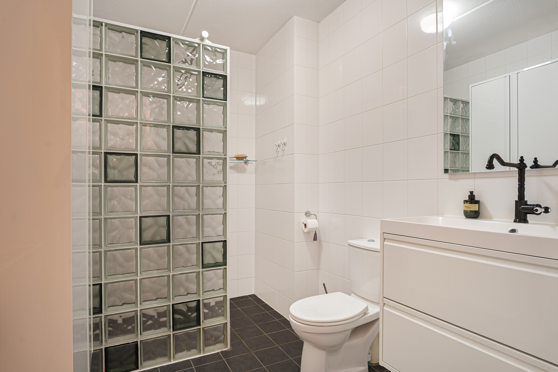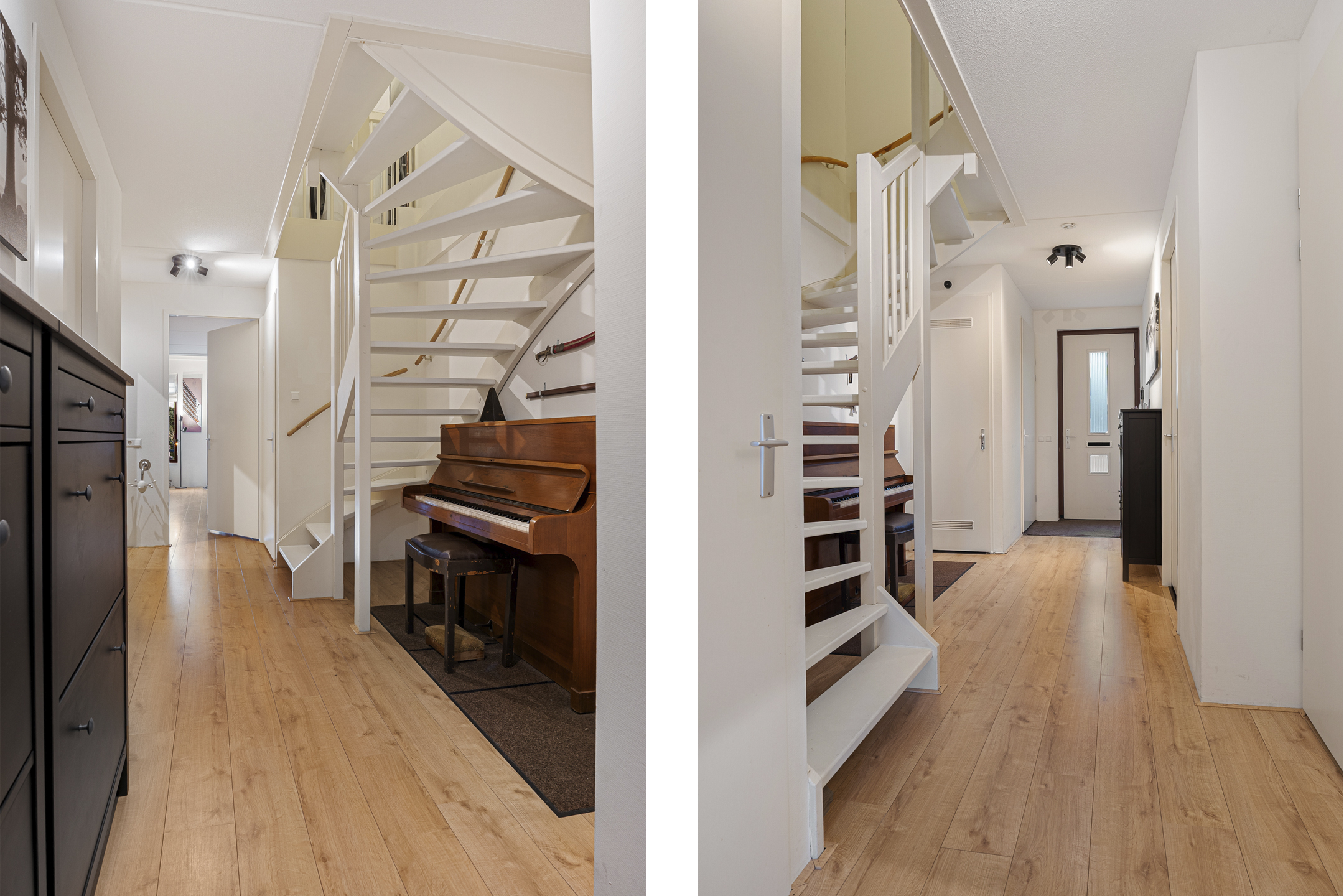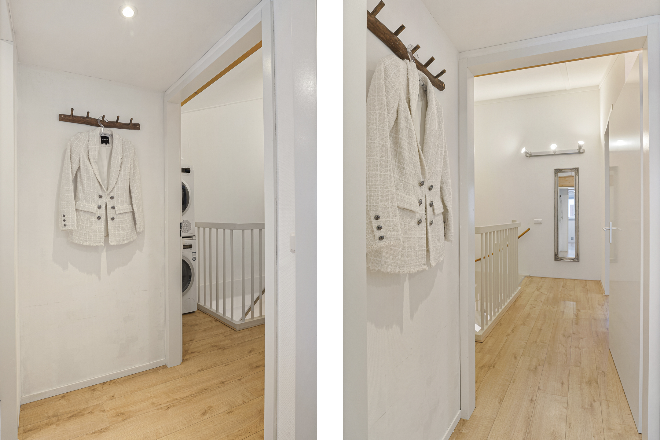 Via de overdekte entree kom je binnen in de hal met toilet, meterkast, trapkast en een praktische wasruimte met aansluitingen voor wasmachine en droger. Aan de voorzijde bevinden zich een slaapkamer en de in 2024 vernieuwde badkamer, voorzien van een inloopdouche, tweede toilet en wastafelmeubel.