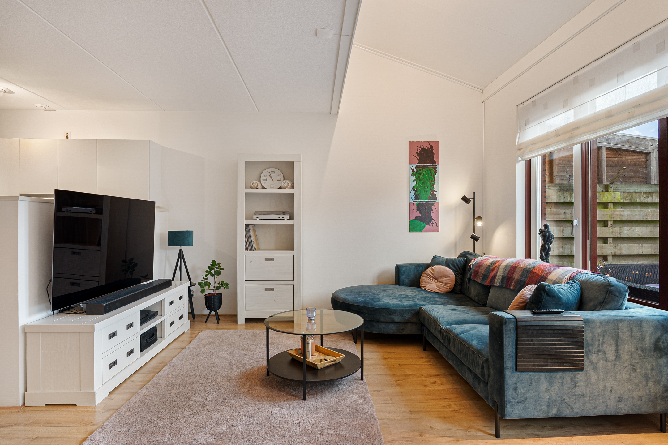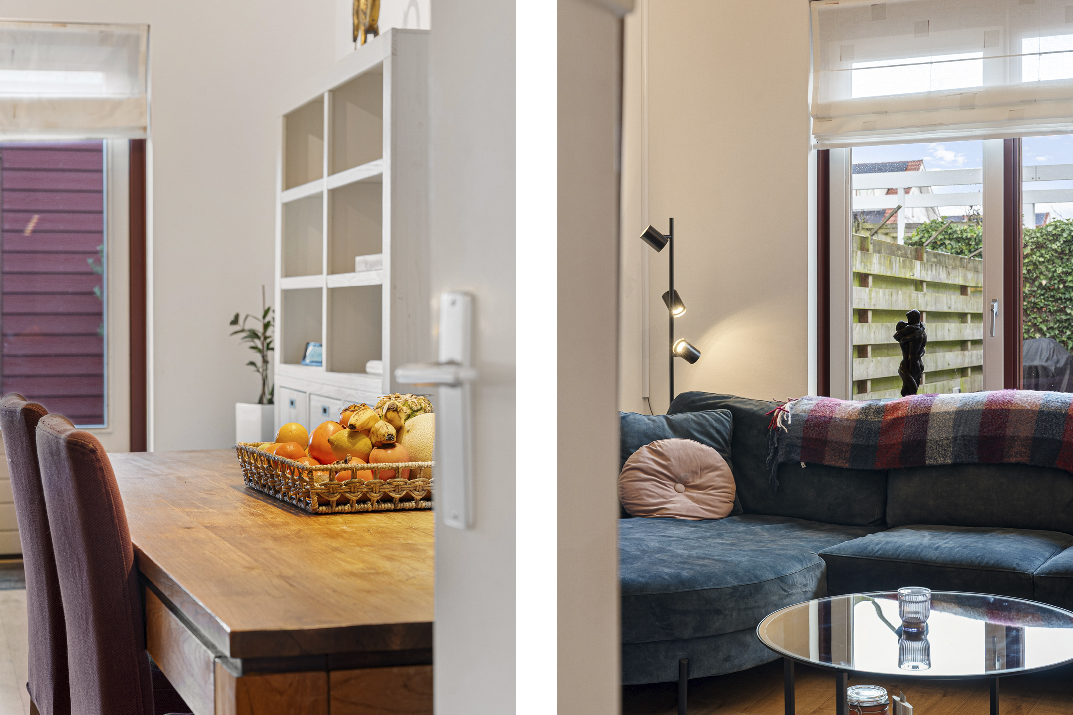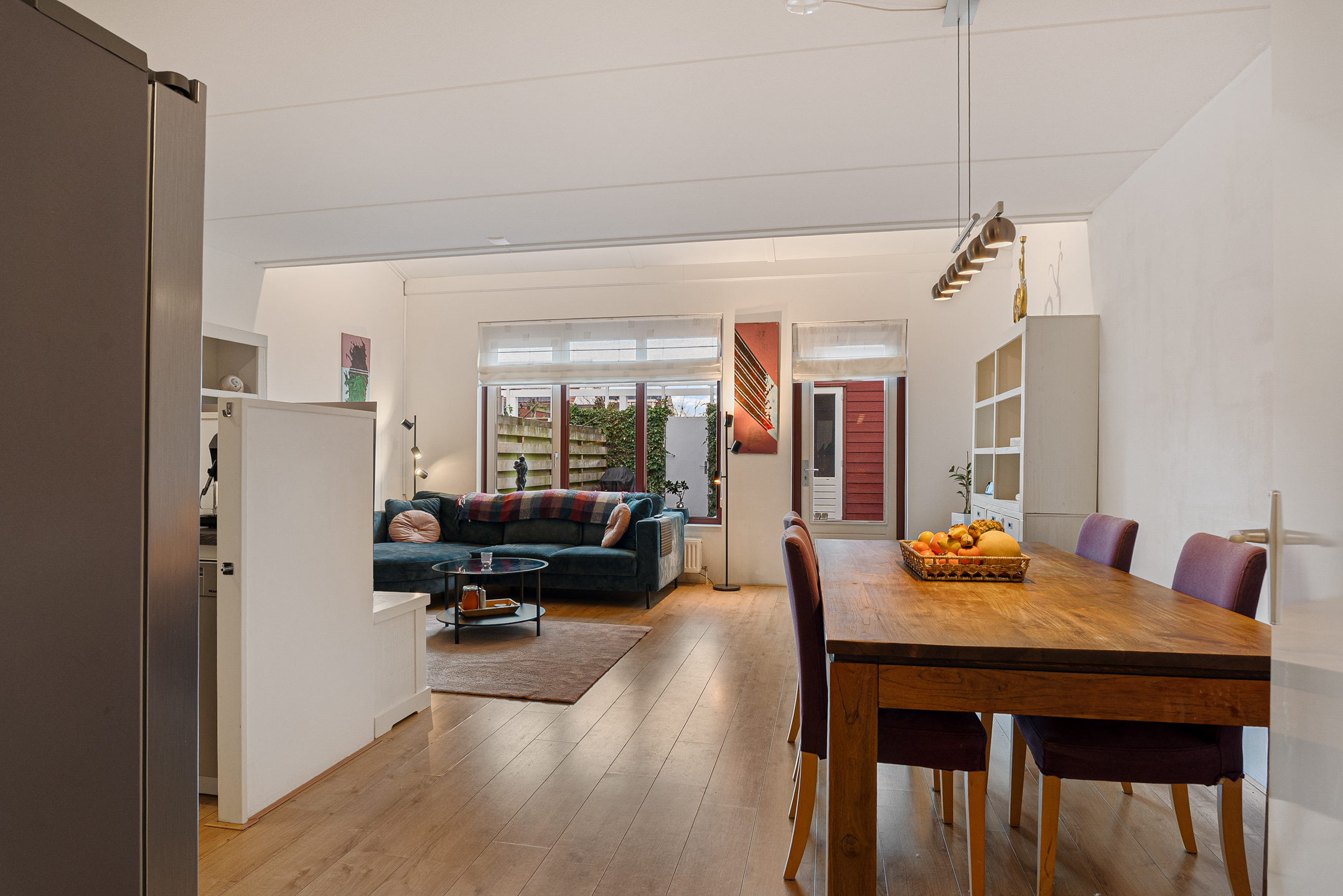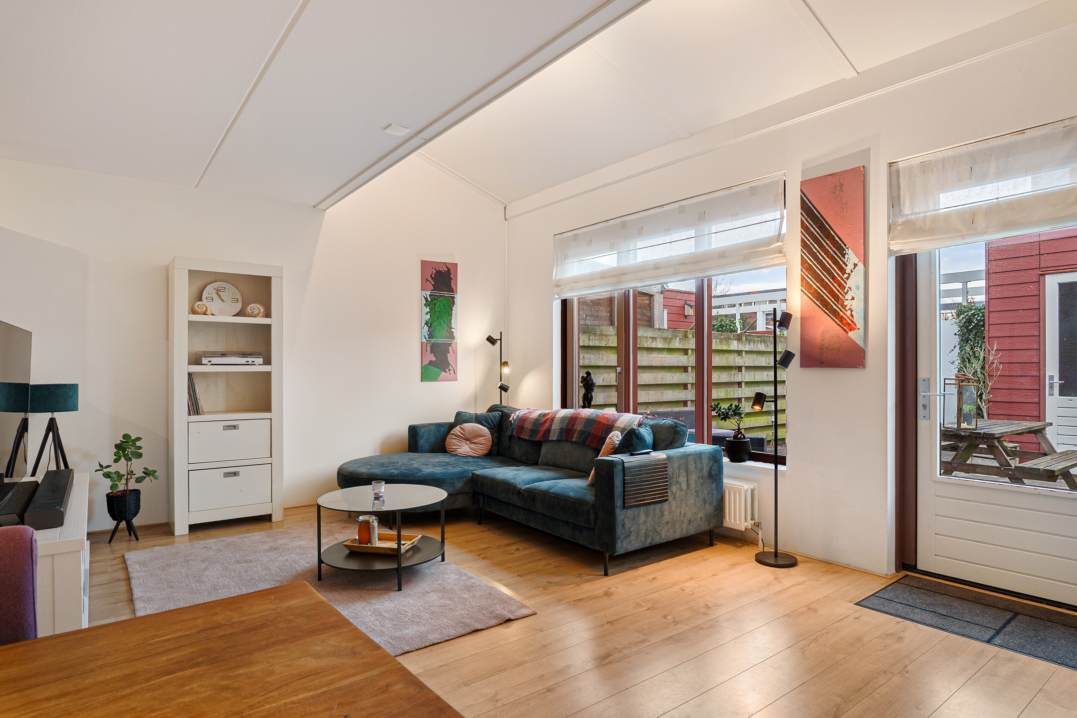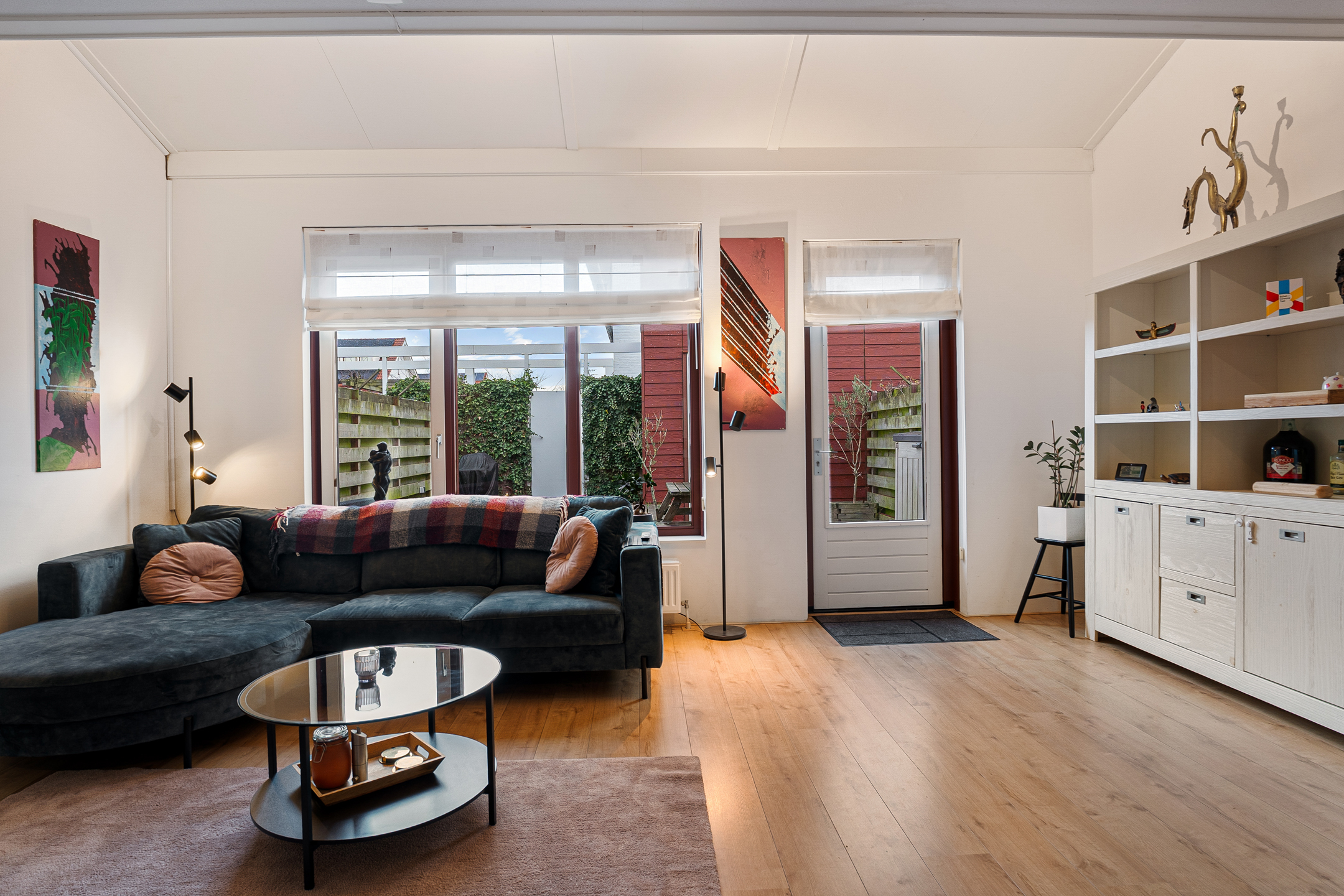 Het ruime woongedeelte bestaat uit een lichte woonkamer aan de tuinzijde en een moderne keuken, compleet uitgerust met inbouwapparatuur. Grote raampartijen zorgen voor veel licht en een prettige verbinding met de tuin.