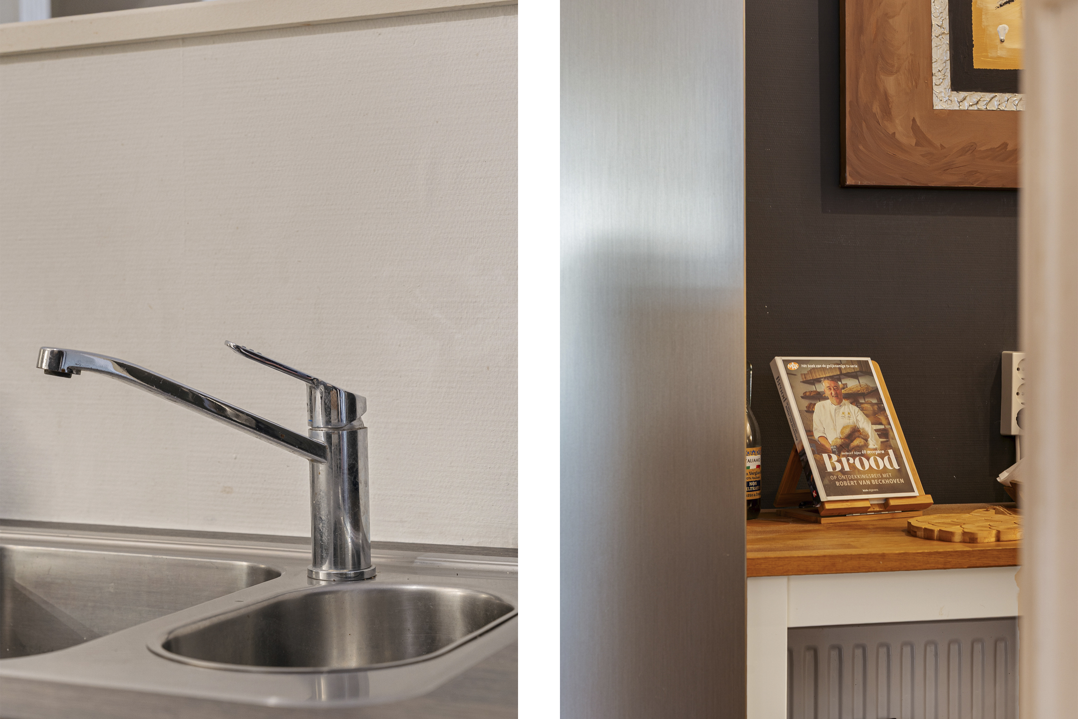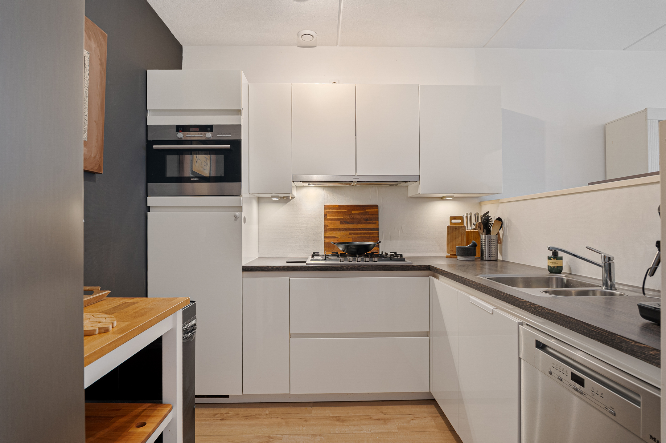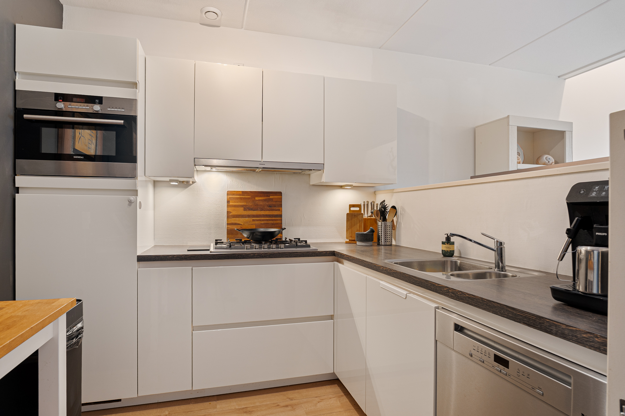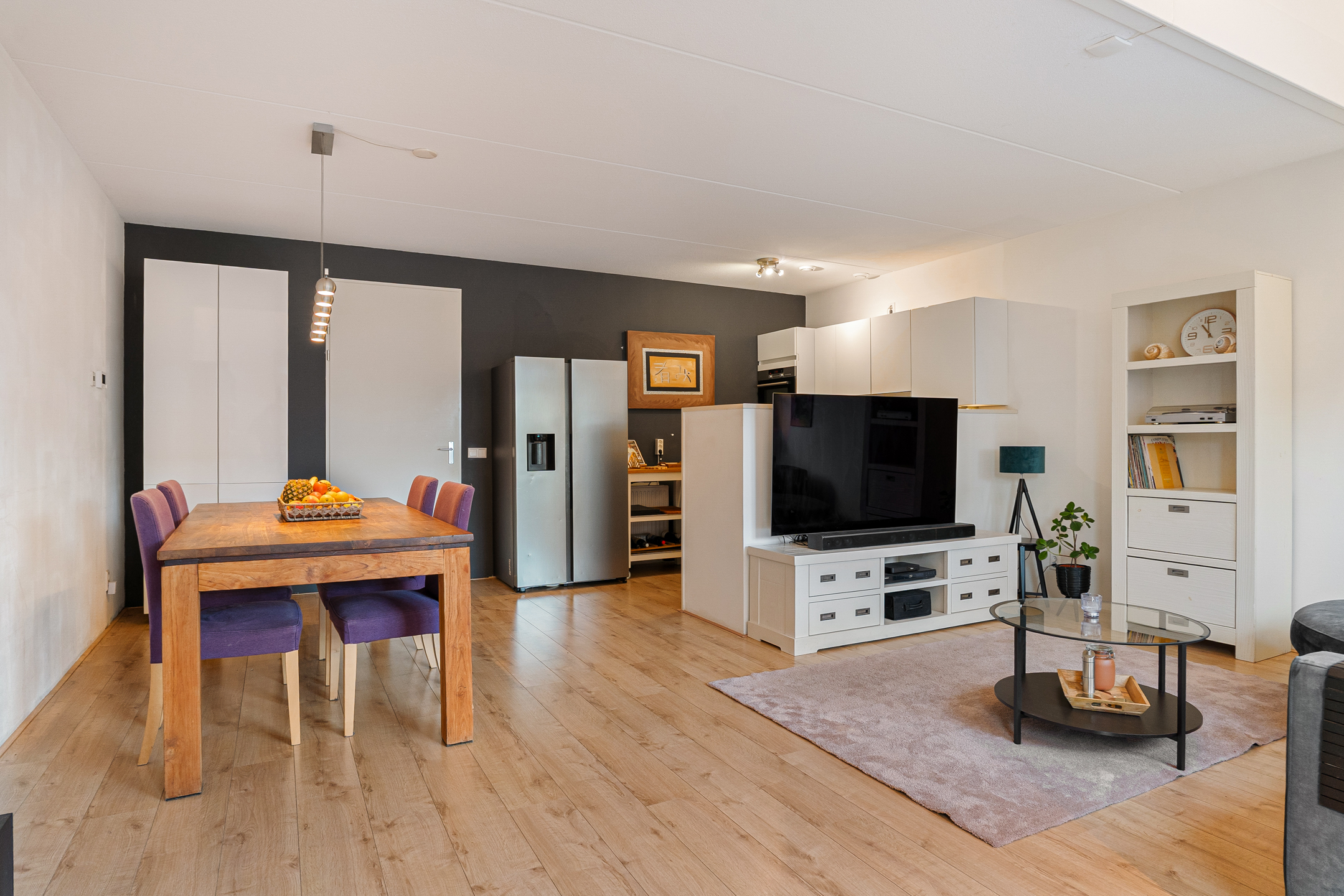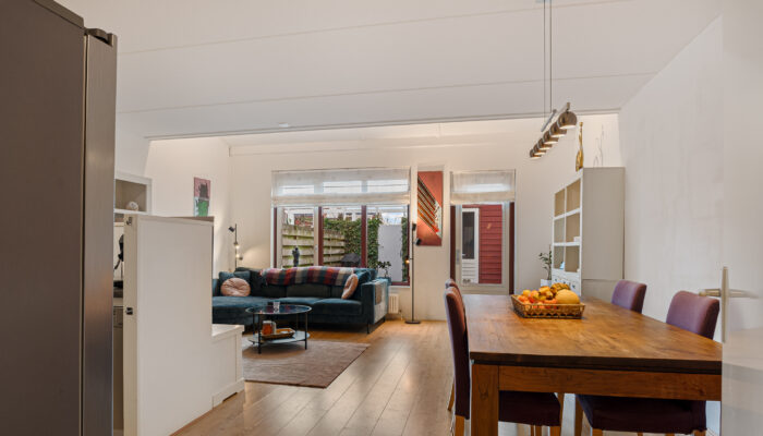 Het ruime woongedeelte bestaat uit een lichte woonkamer aan de tuinzijde en een moderne keuken, compleet uitgerust met inbouwapparatuur. Grote raampartijen zorgen voor veel licht en een prettige verbinding met de tuin.