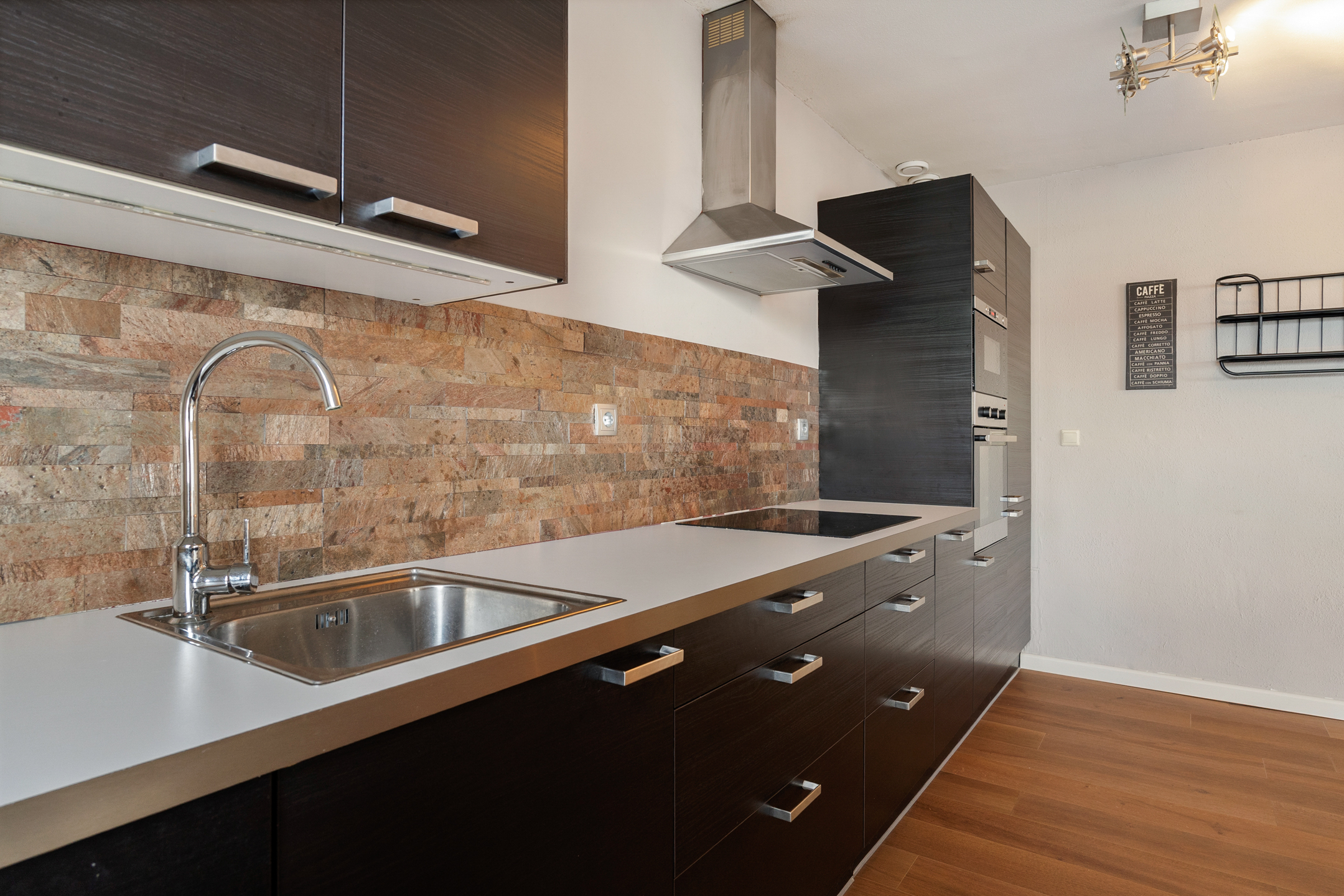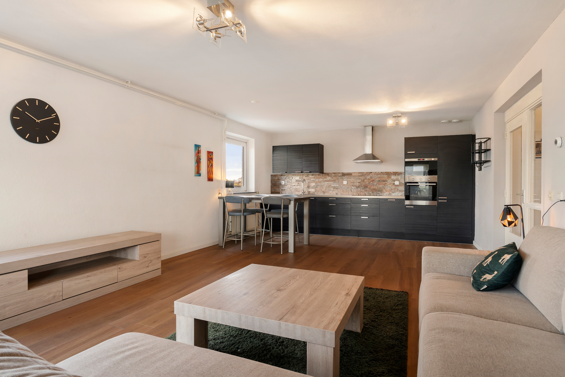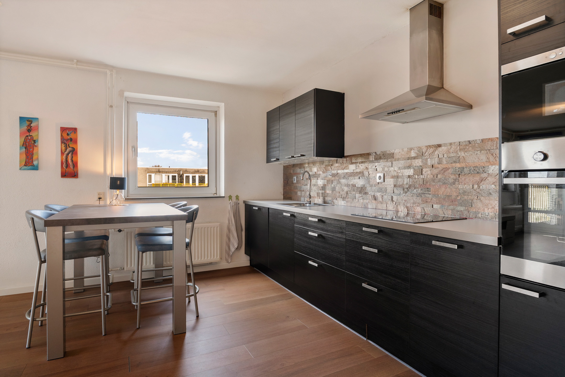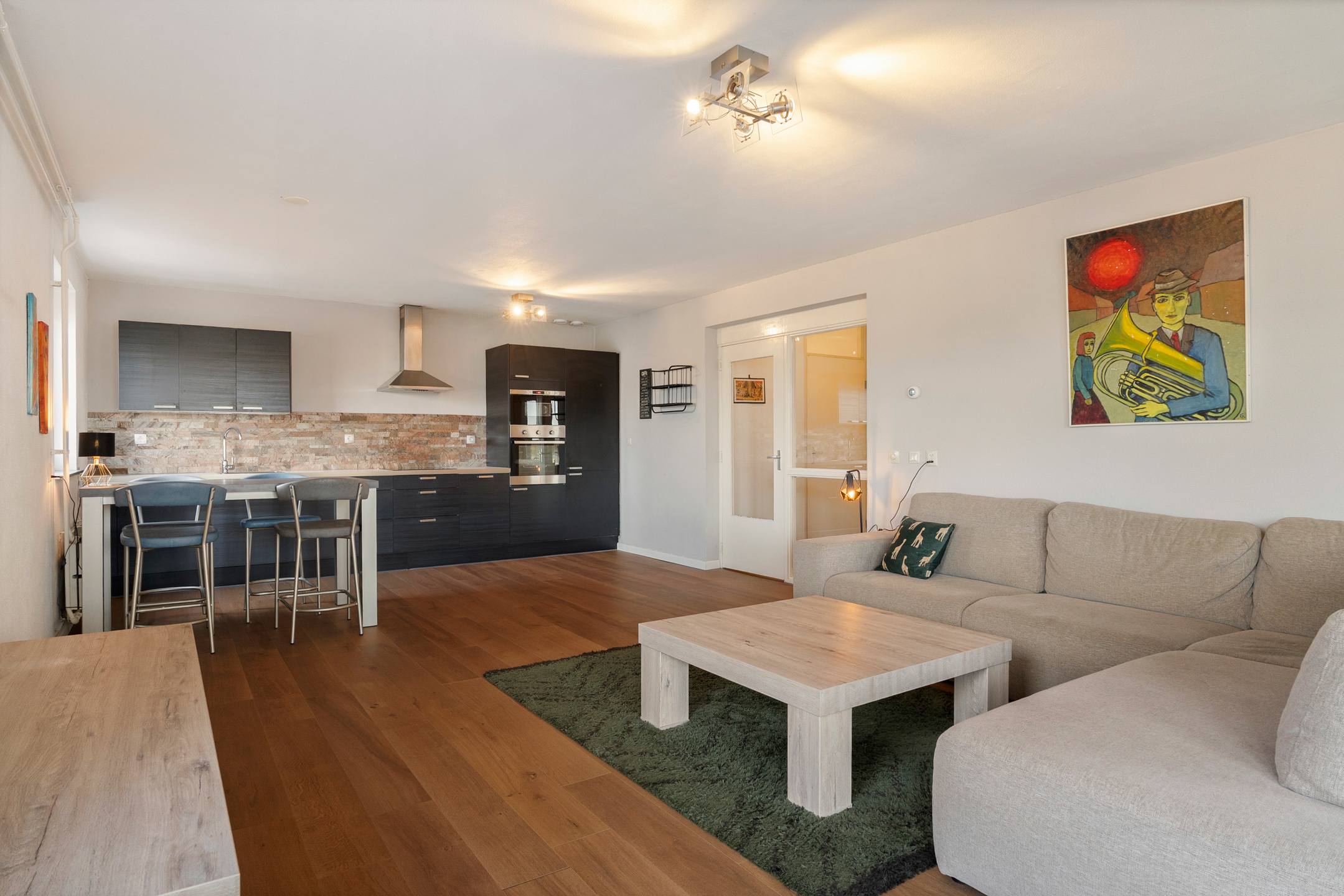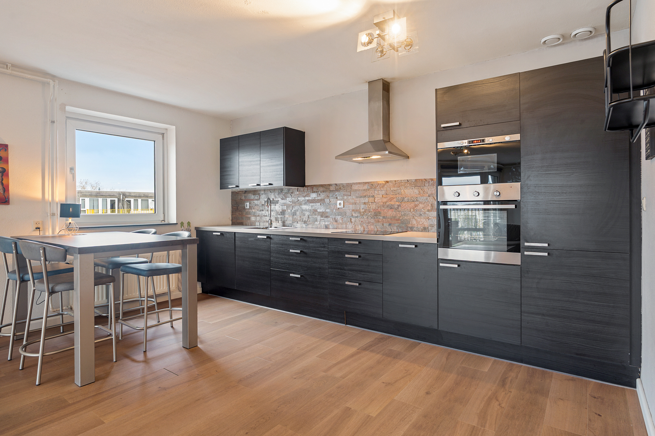 De ruime en lichte woonkamer strekt zich uit over de gehele lengte van de woning en biedt een prettige leefruimte met veel daglicht. Aan de voorzijde bevindt zich de open keuken, uitgevoerd in een moderne opstelling en voorzien van diverse inbouwapparatuur, waaronder een koel-vriescombinatie, oven, magnetron, vaatwasser en inductiekookplaat.