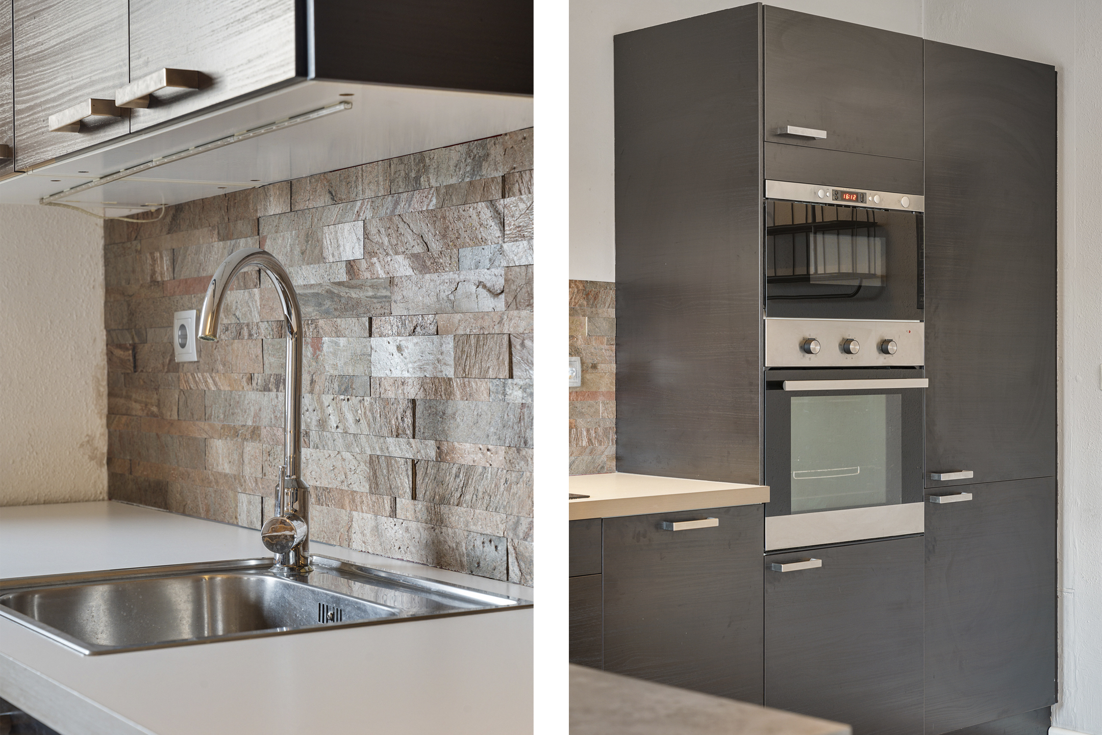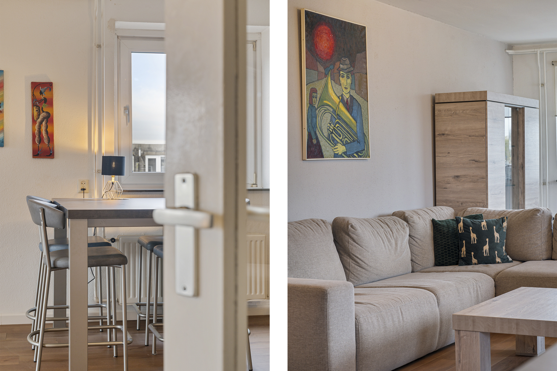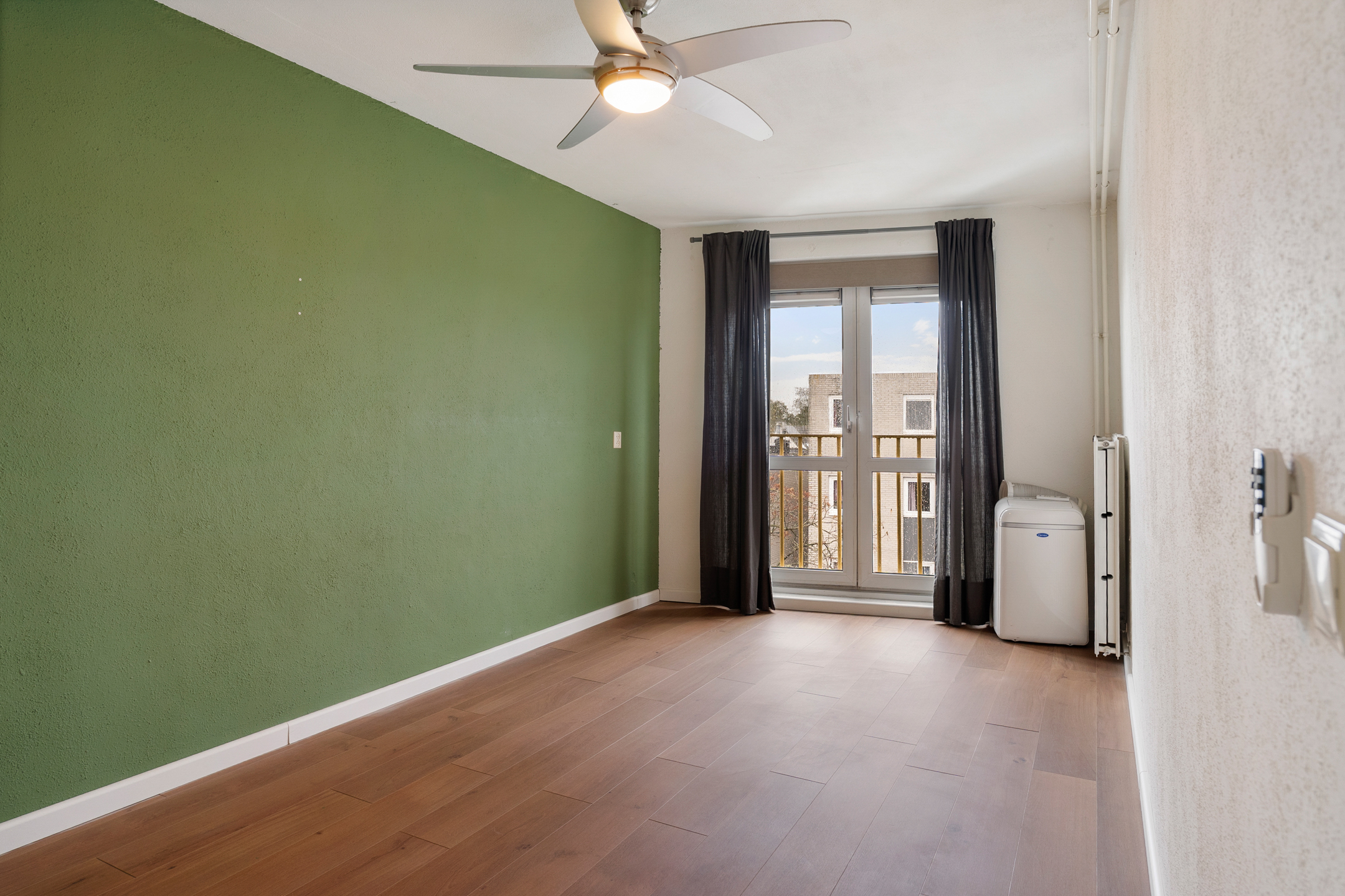Aan de achterzijde van de woonkamer geven grote raampartijen en een deur toegang tot de zonnige loggia, waar u kunt genieten van de avondzon en vrij uitzicht.