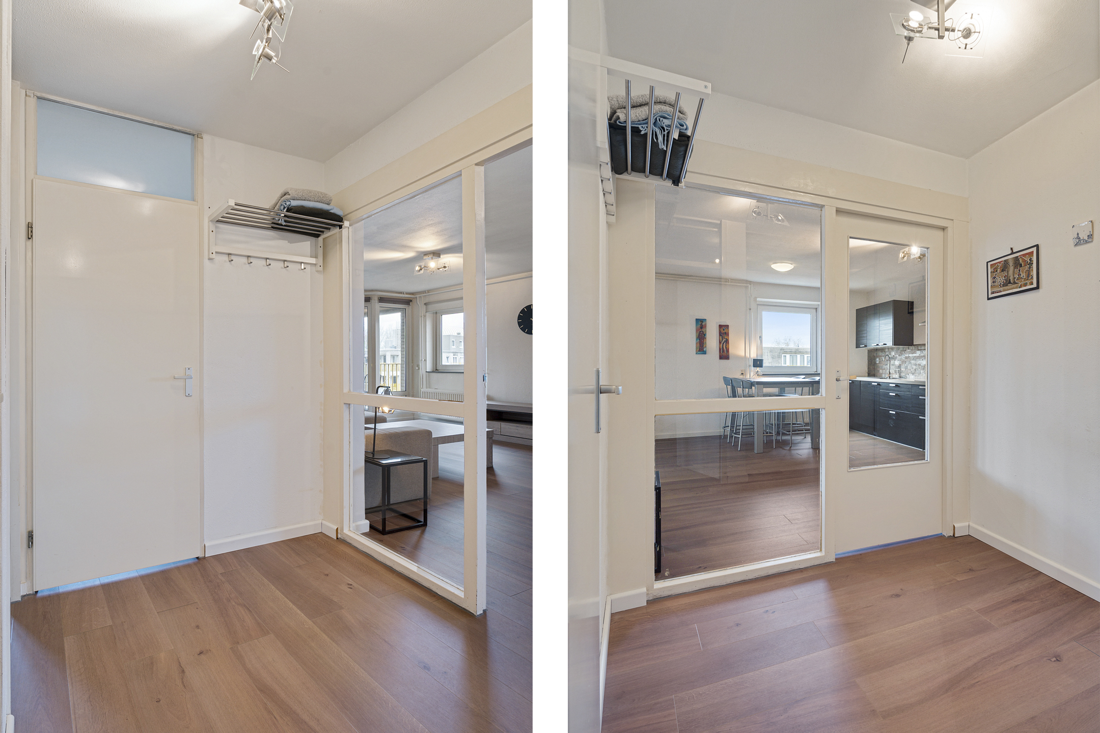 Entree van het appartement op de derde verdieping. Hal met toegang tot het toilet, meterkast en een praktische berging/stookruimte met opstelplaats voor de CV-ketel en aansluitingen voor wasmachine en droger.