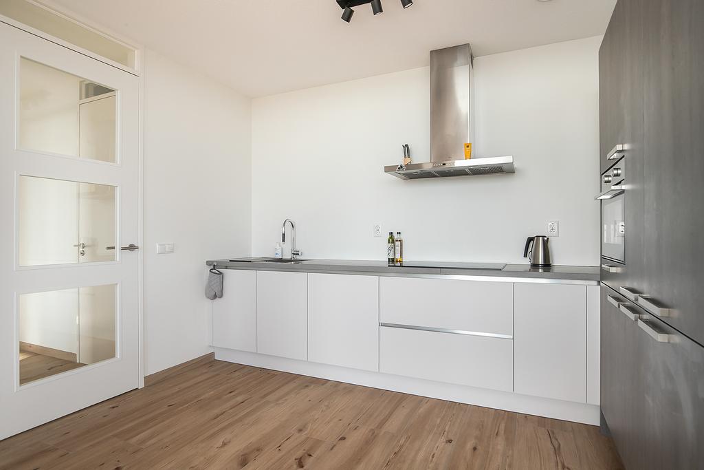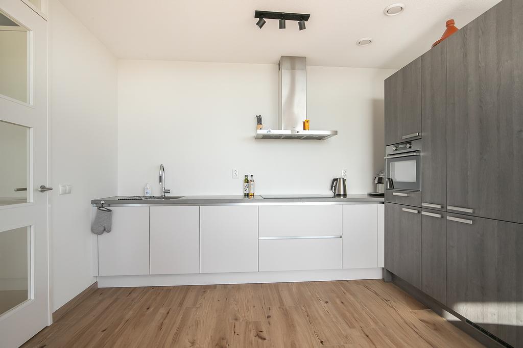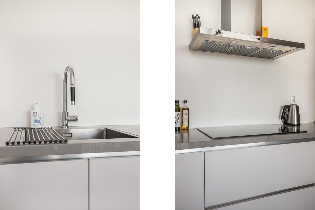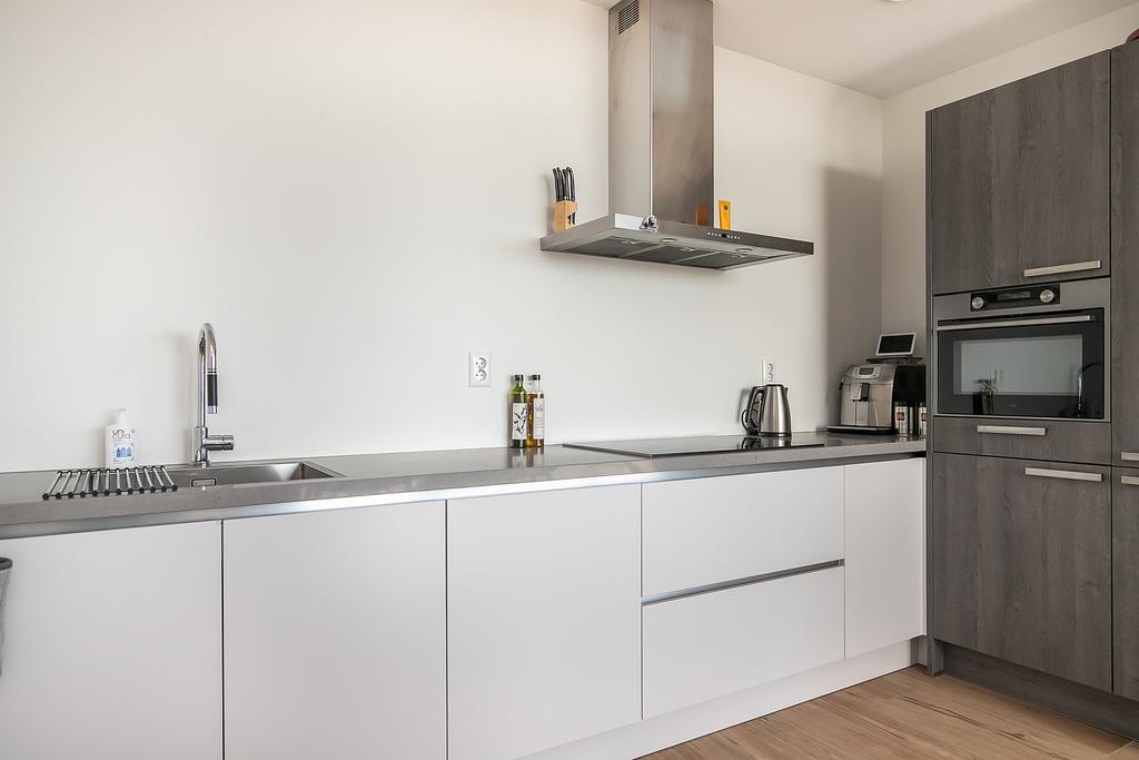 Luxe keuken met inductie-kookplaat, afzuigkap, combimagnetron, koel-vrieskast en een vaatwasser.