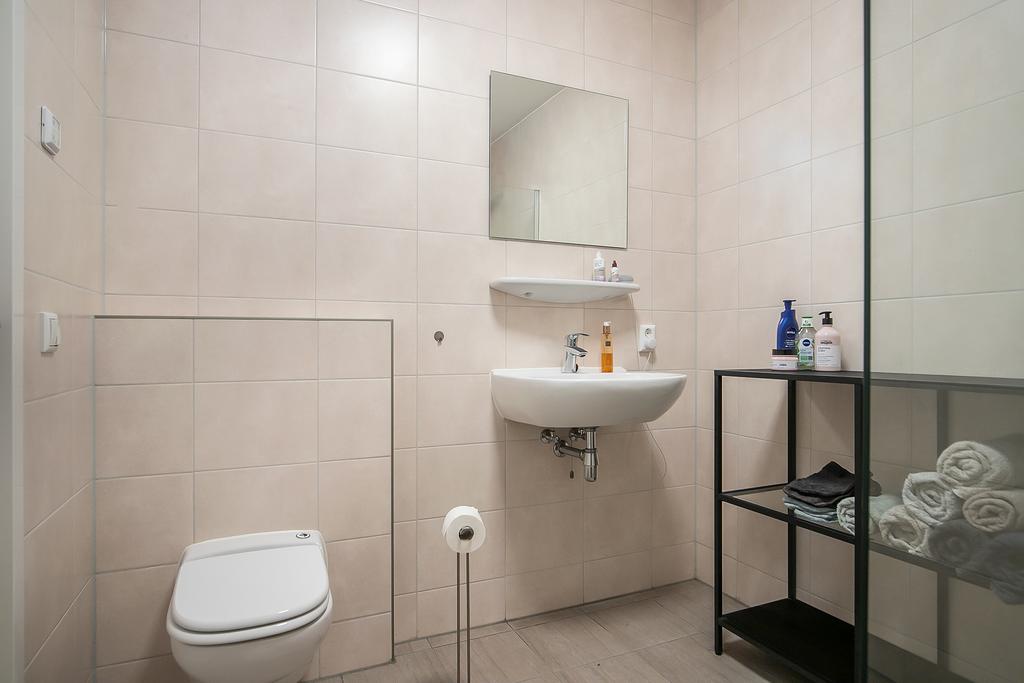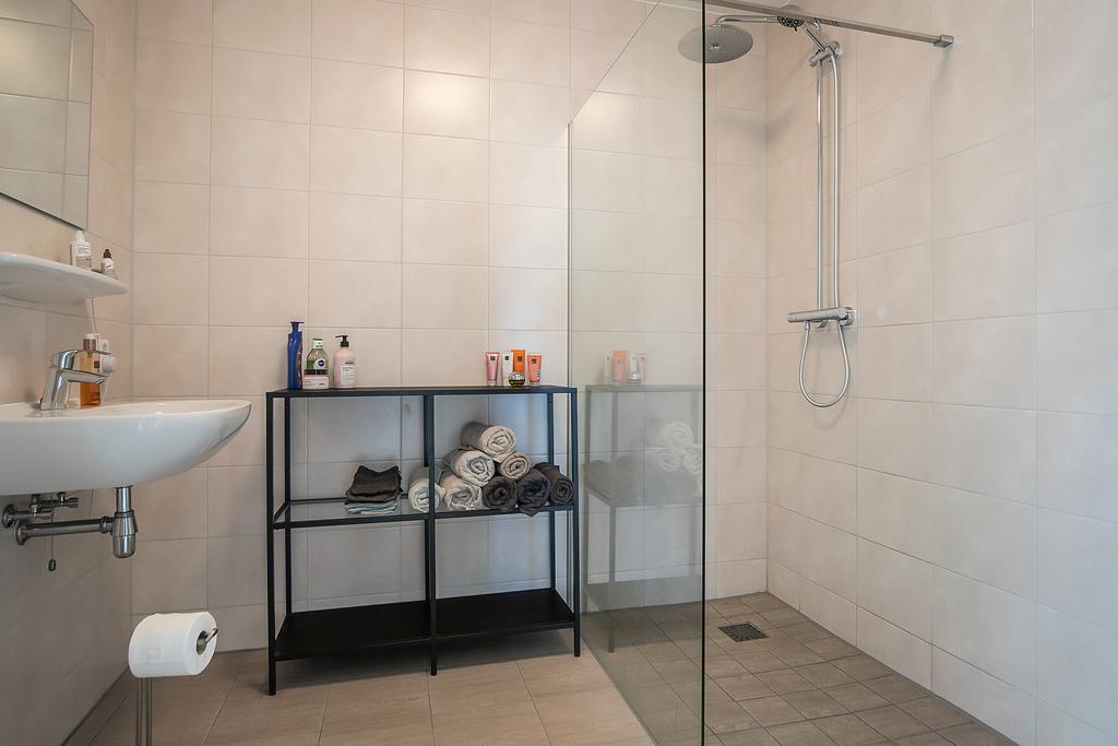 Badkamer met wastafel, ruime inloopdouche en toilet.