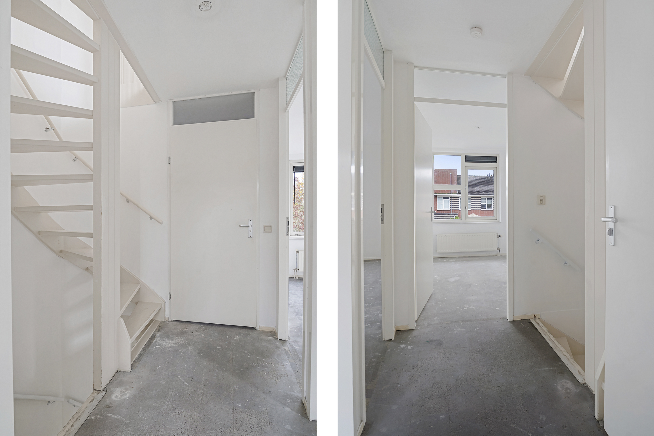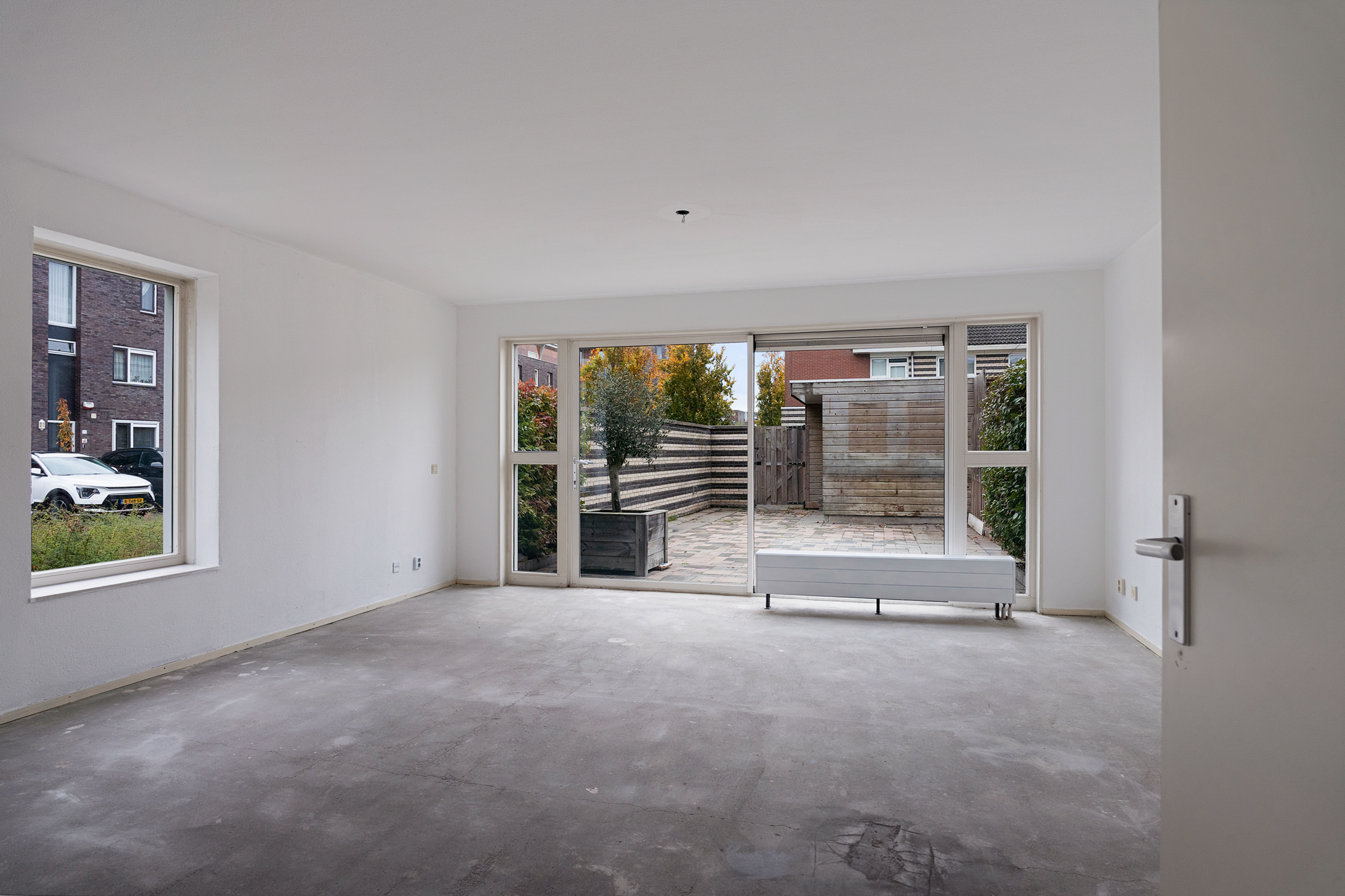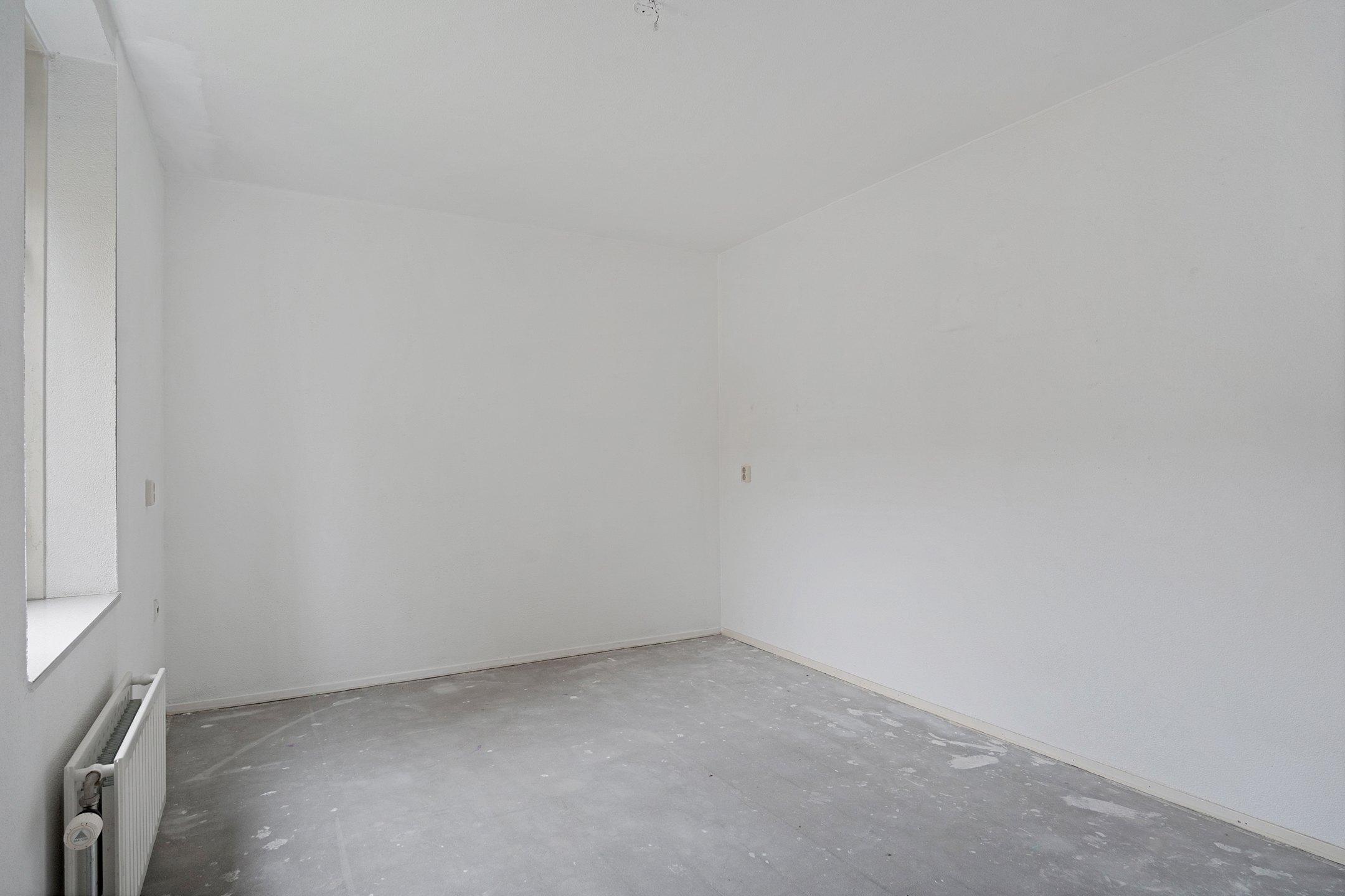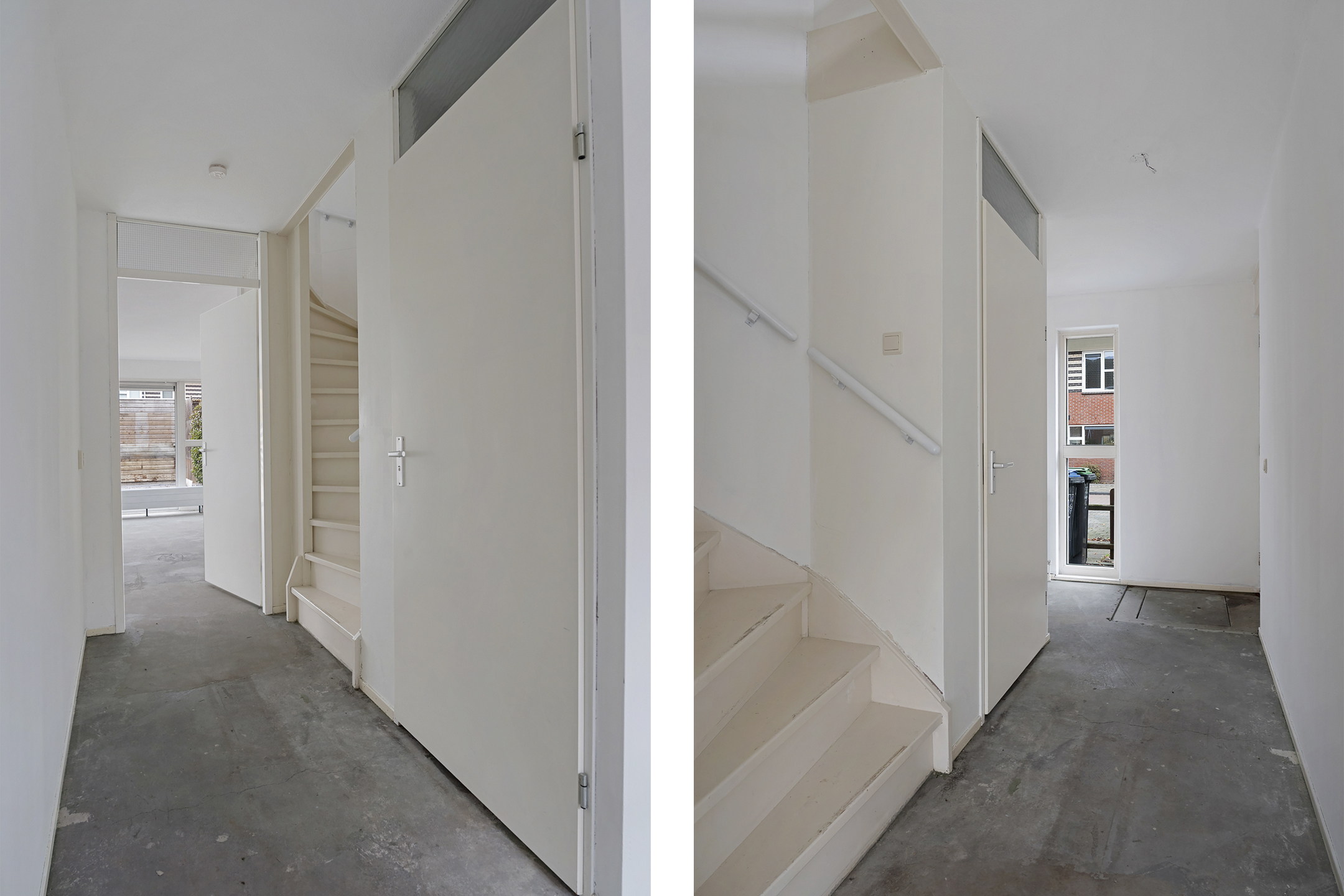 Via de nette hal met meterkast, trapopgang en toilet bereik je de woonkamer. De grote raampartijen zorgen voor een prettige lichtinval en geven de ruimte een open uitstraling. De woonkamer is overzichtelijk ingedeeld en biedt voldoende mogelijkheden voor een comfortabele zit- en eethoek.