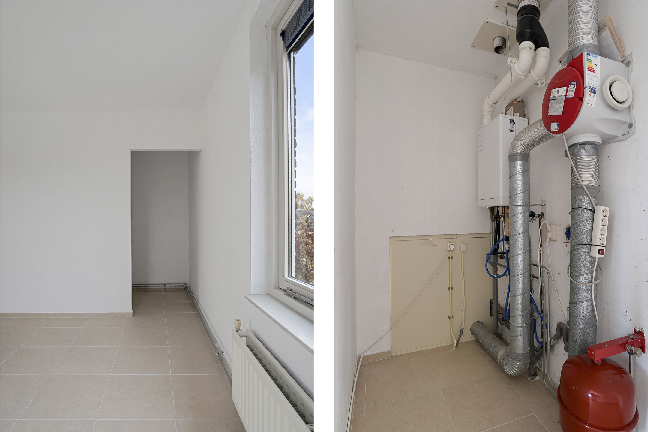 De tweede verdieping biedt verrassend veel extra ruimte. Hier bevindt zich een volwaardige vierde slaapkamer, maar de etage kan ook uitstekend dienen als werk- of hobbyruimte. Daarnaast vind je hier de aansluitingen voor de wasmachine en droger en extra bergruimte achter de knieschotten. Een dakraam zorgt voor een fijne lichtinval onder het zadeldak.