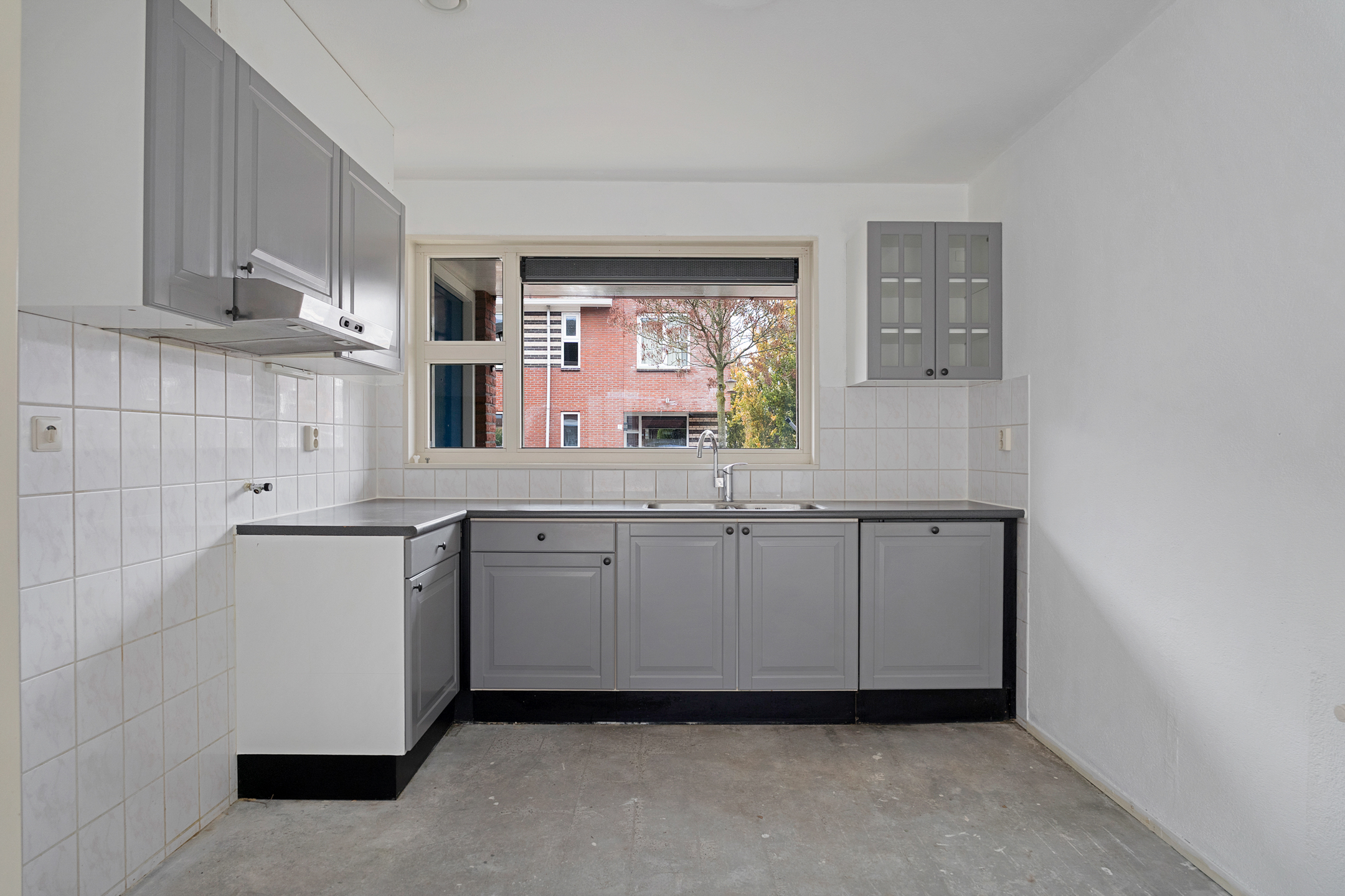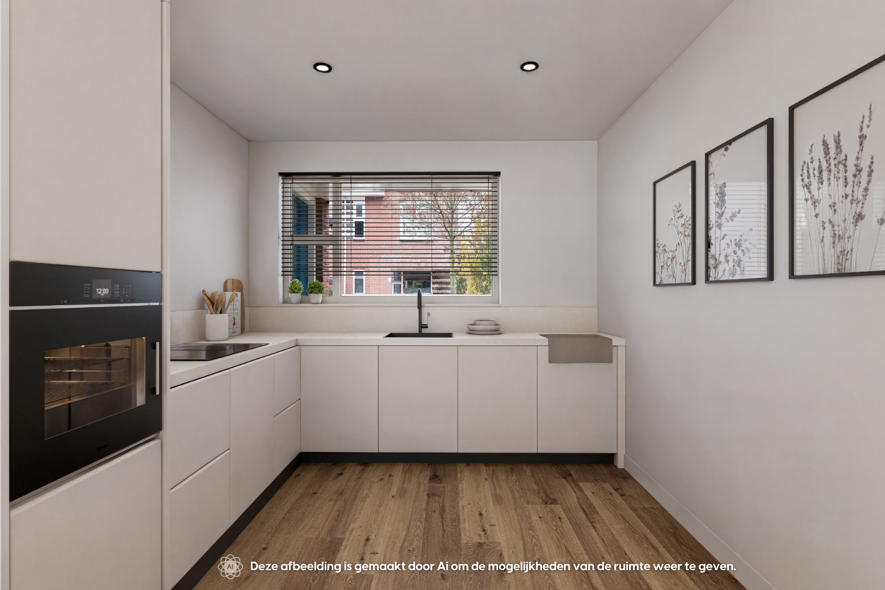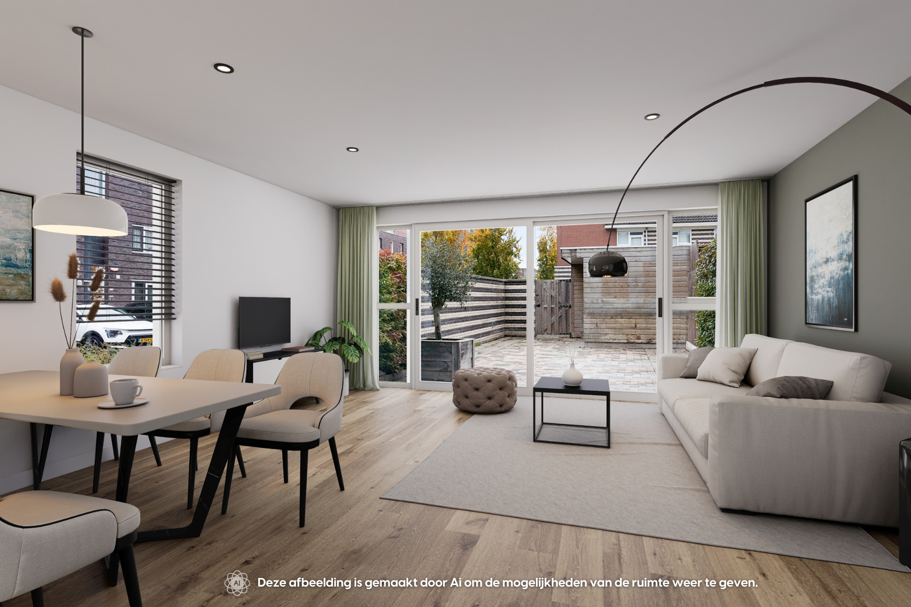 Aan de voorzijde bevindt zich de open keuken, waar je een keukenopstelling naar eigen wens kunt realiseren. Vanuit de woonkamer stap je direct de zonnige achtertuin in, een fijne plek voor buiten eten of ontspannen in de zon.