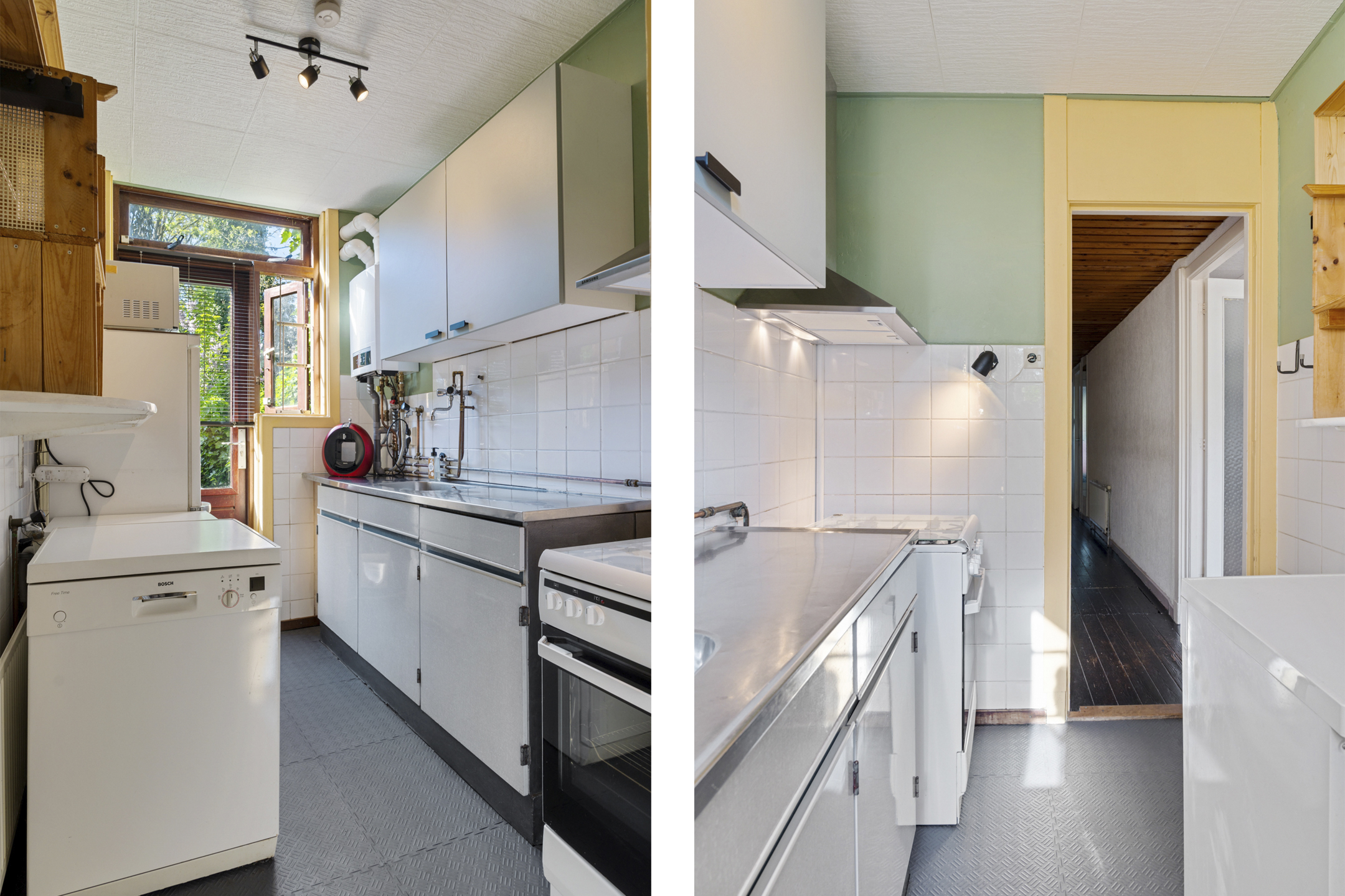 Ook de keuken ligt aan de tuinzijde en geeft eveneens toegang tot het terras. De keuken is eenvoudig van opzet en biedt mogelijkheden voor verdere modernisering.