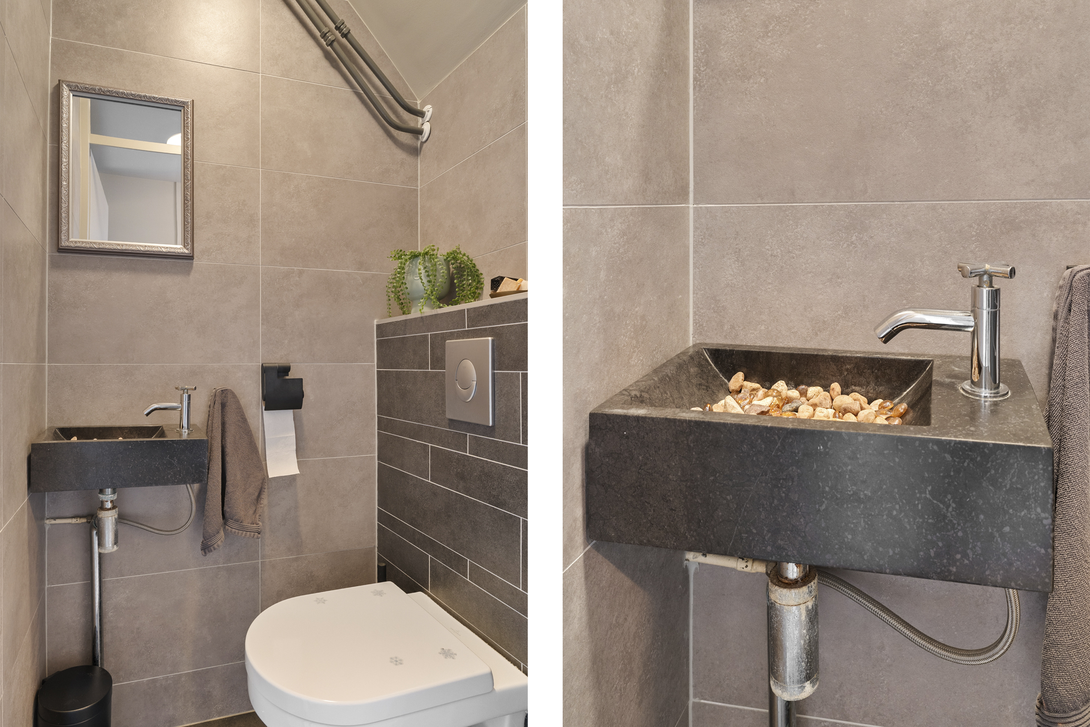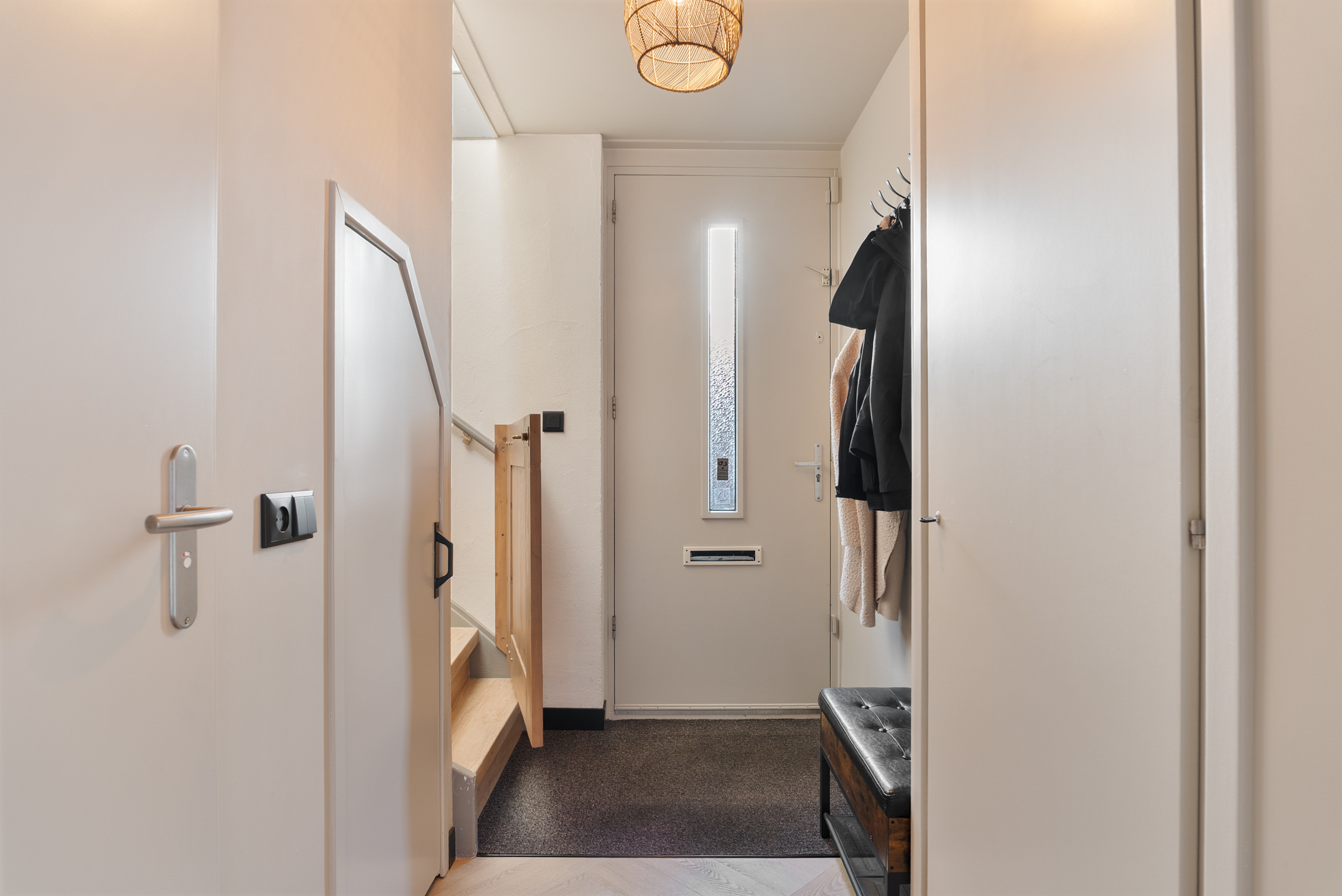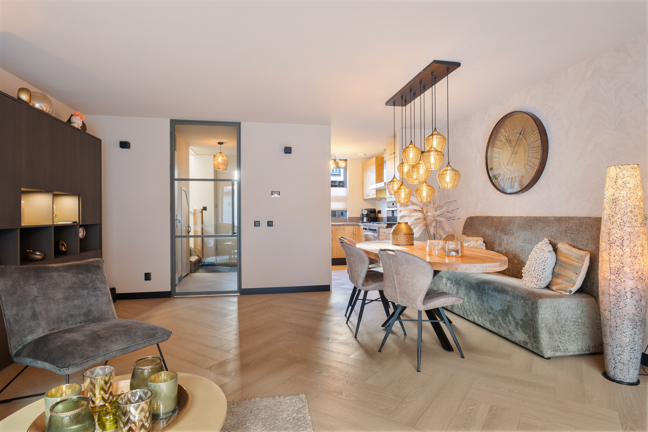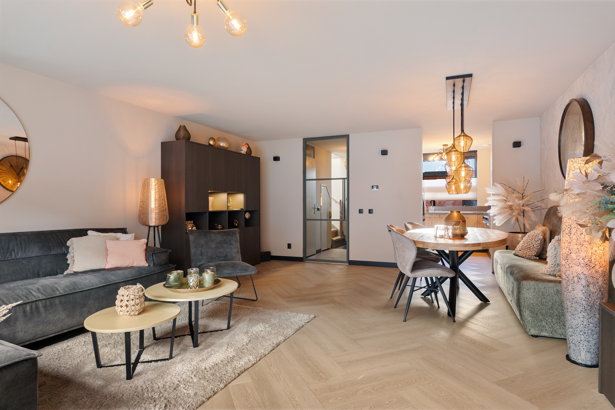De hal biedt toegang tot de mooi afgewerkte trapkast, de vernieuwde meterkast, het toilet en de trap naar de eerste verdieping. Via de fraaie glazen deur stap je de woonkamer binnen. De vloer is afgewerkt met pvc in een visgraatmotief en voorzien van vloerverwarming, wat samen met de warme inrichting zorgt voor een sfeervolle en luxe uitstraling.
