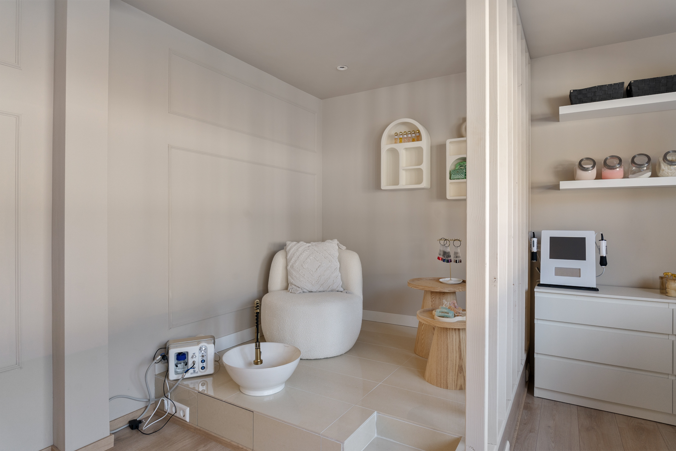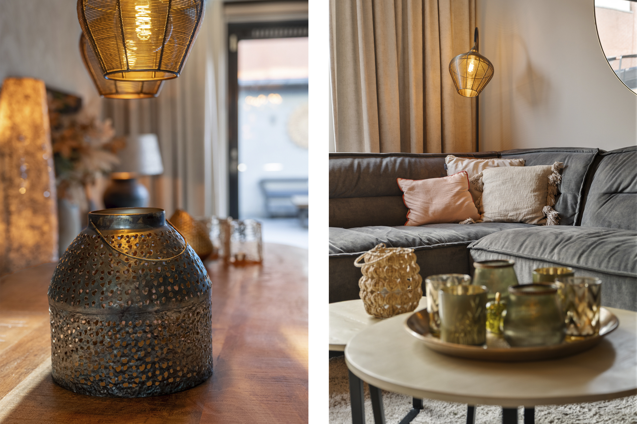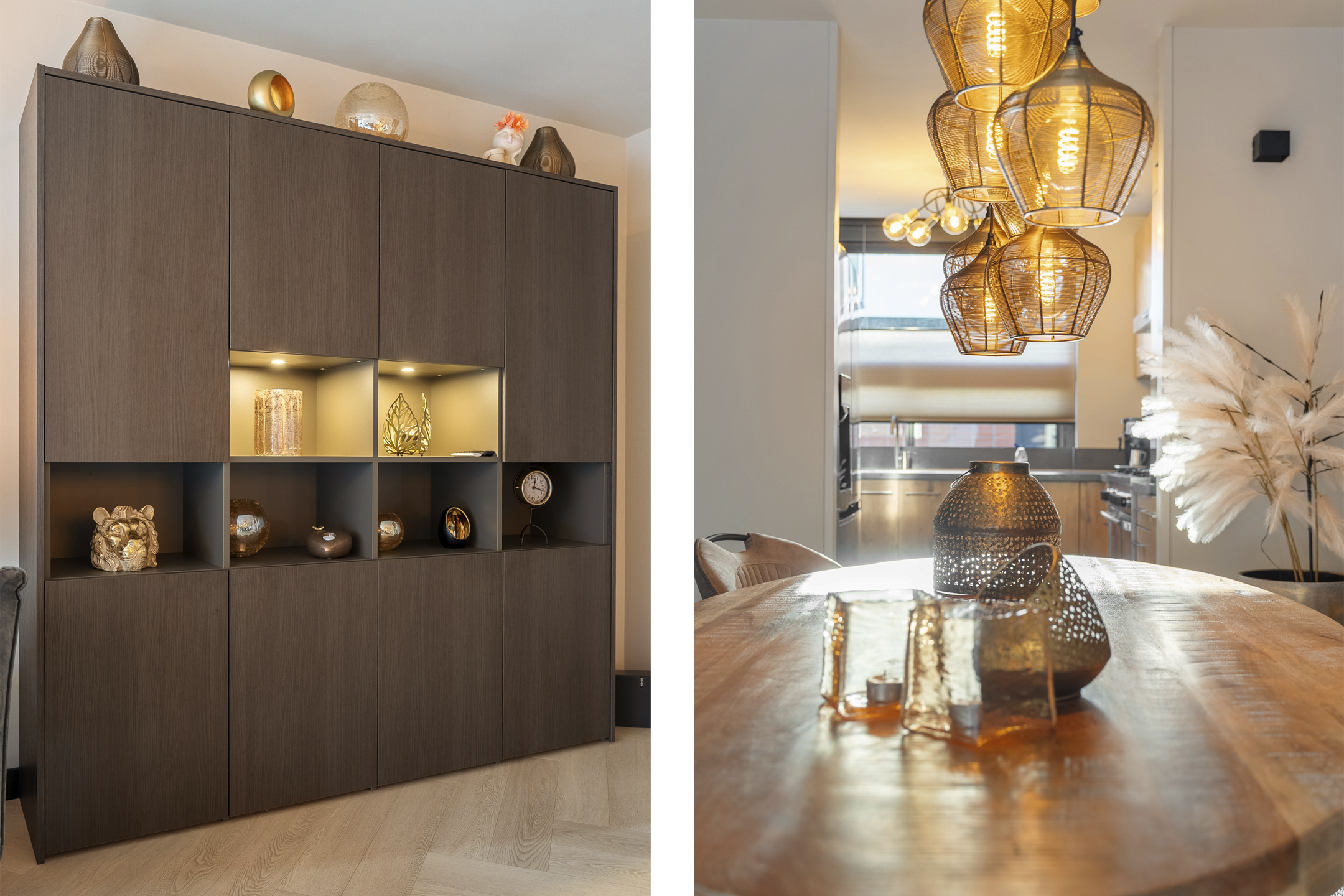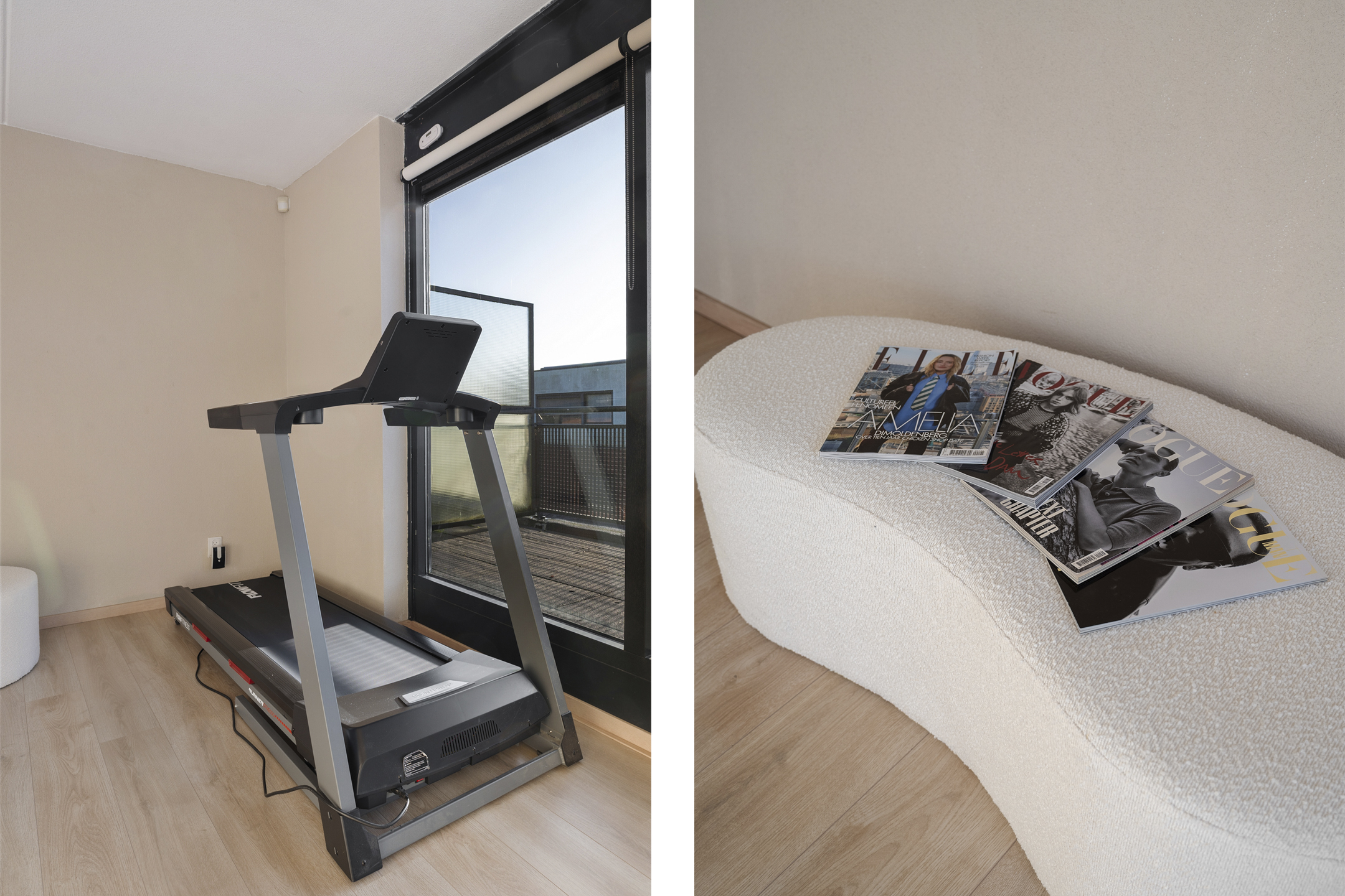 De hal biedt toegang tot de mooi afgewerkte trapkast, de vernieuwde meterkast, het toilet en de trap naar de eerste verdieping. Via de fraaie glazen deur stap je de woonkamer binnen. De vloer is afgewerkt met pvc in een visgraatmotief en voorzien van vloerverwarming, wat samen met de warme inrichting zorgt voor een sfeervolle en luxe uitstraling.