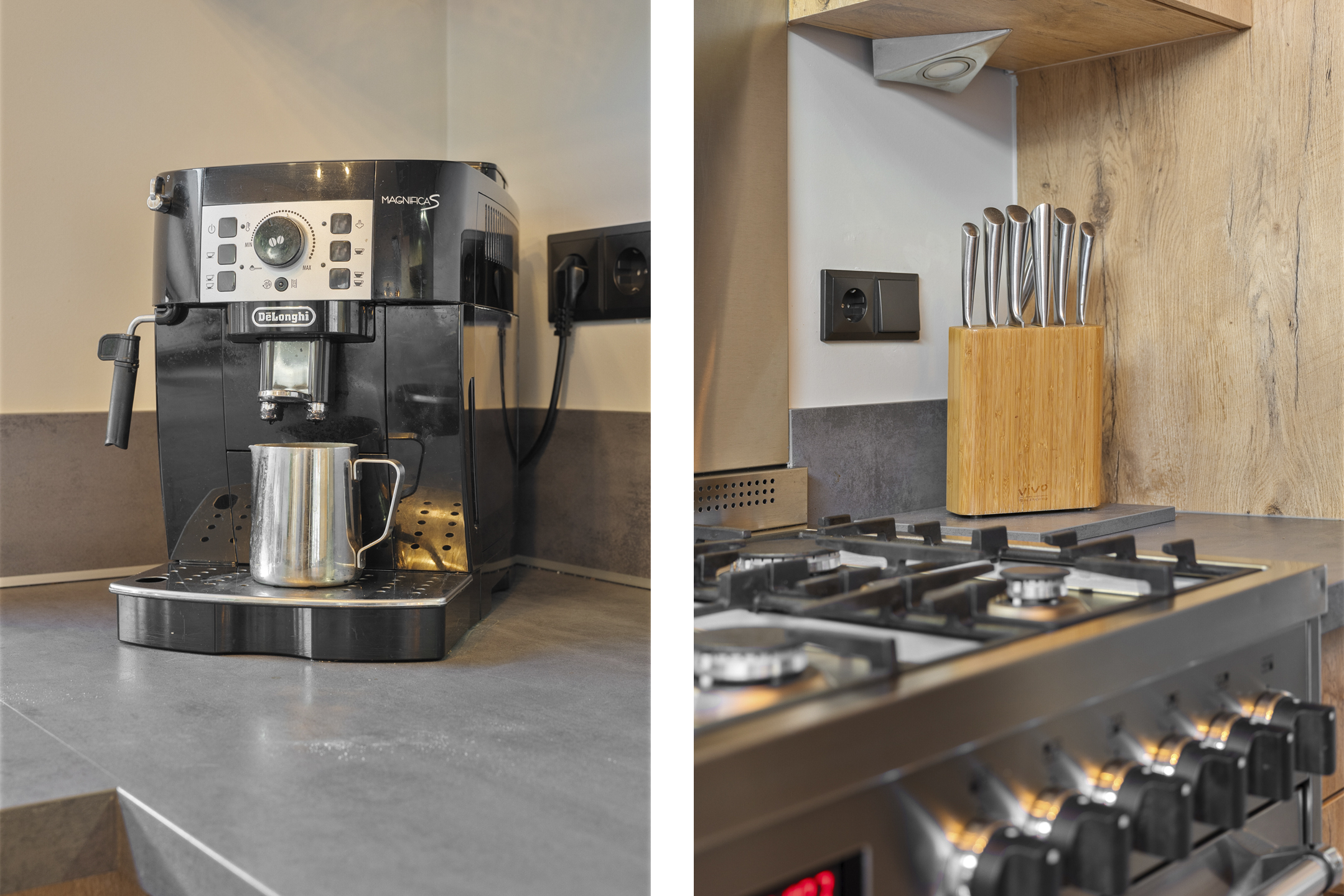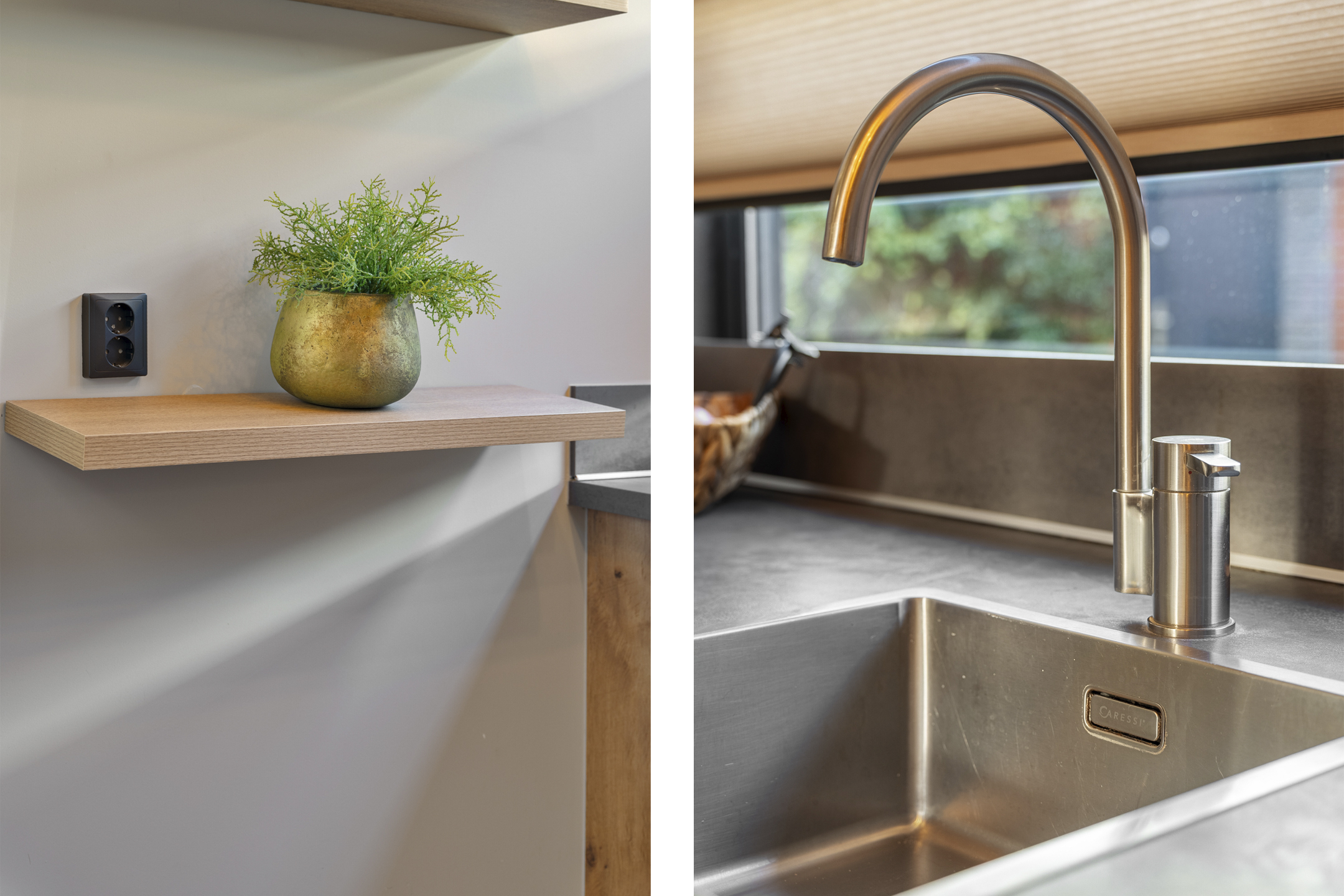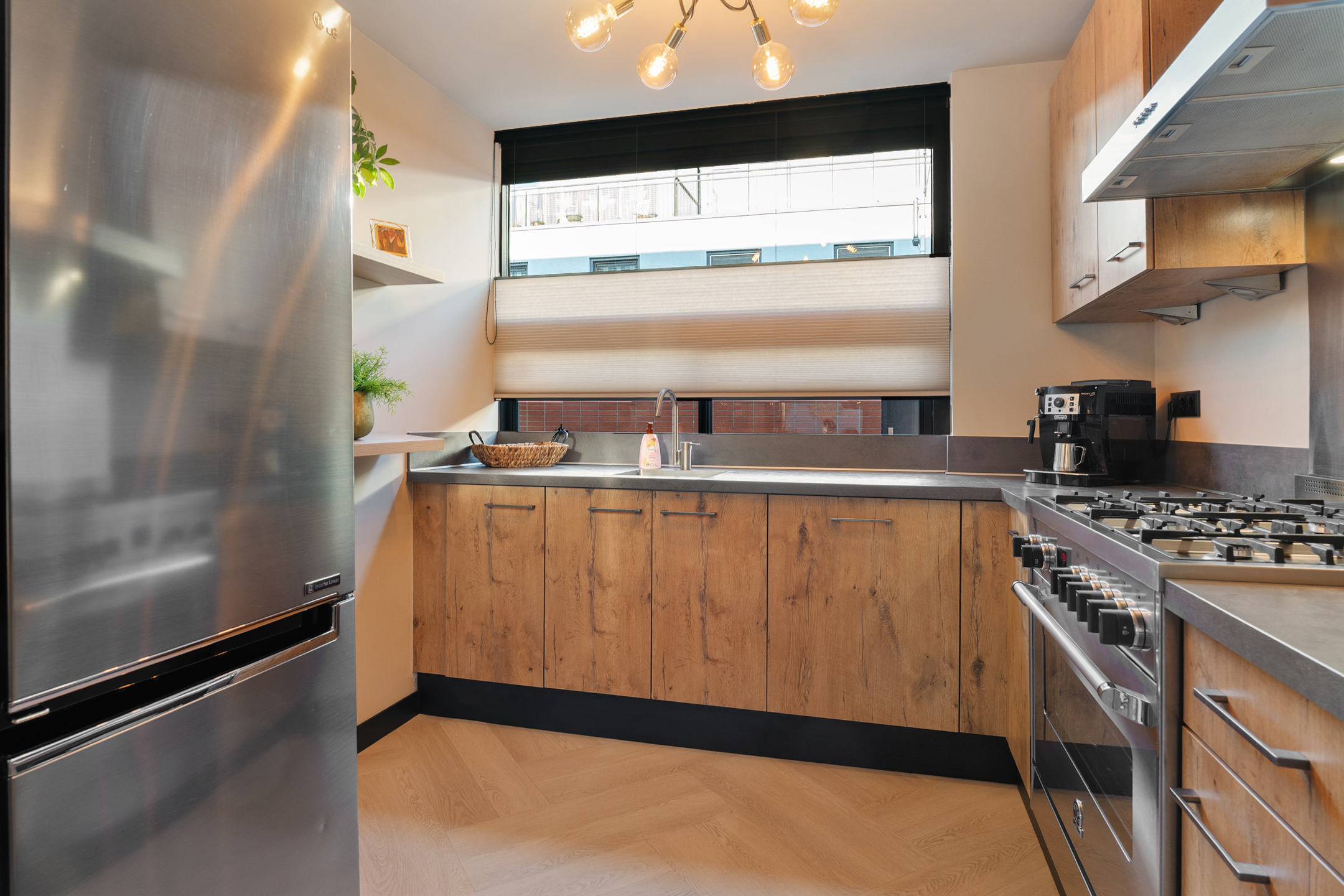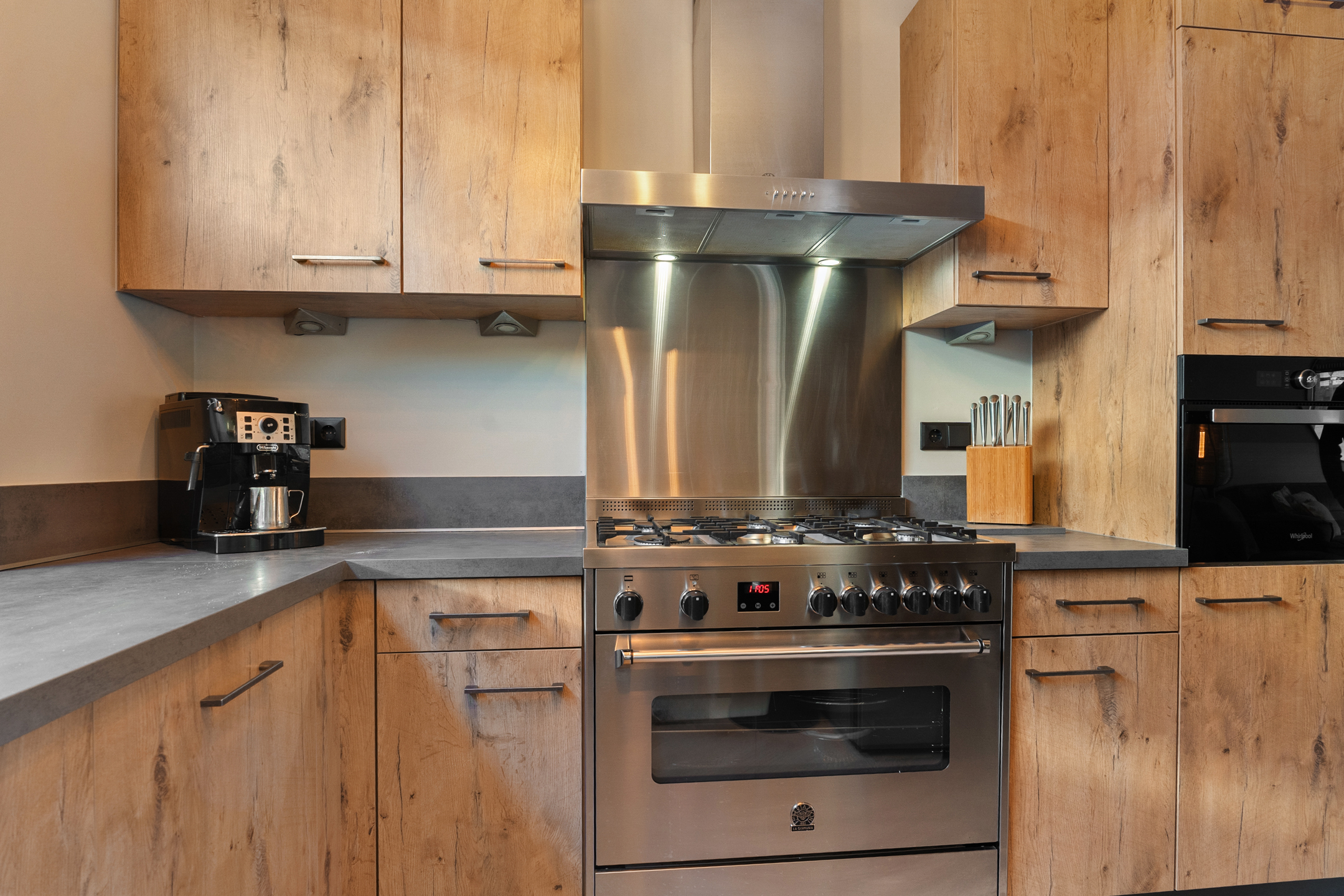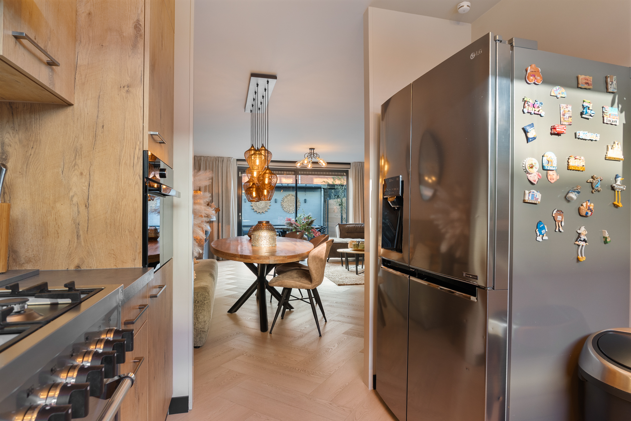 De moderne open keuken sluit perfect aan bij het geheel en is uitgevoerd in een warme kleurstelling. De keuken is van alle gemakken voorzien en vormt een prettige plek om te koken en samen te zijn. Via de grote schuifpui bereik je de fraai ingerichte achtertuin, waar zich ook de stenen berging bevindt.