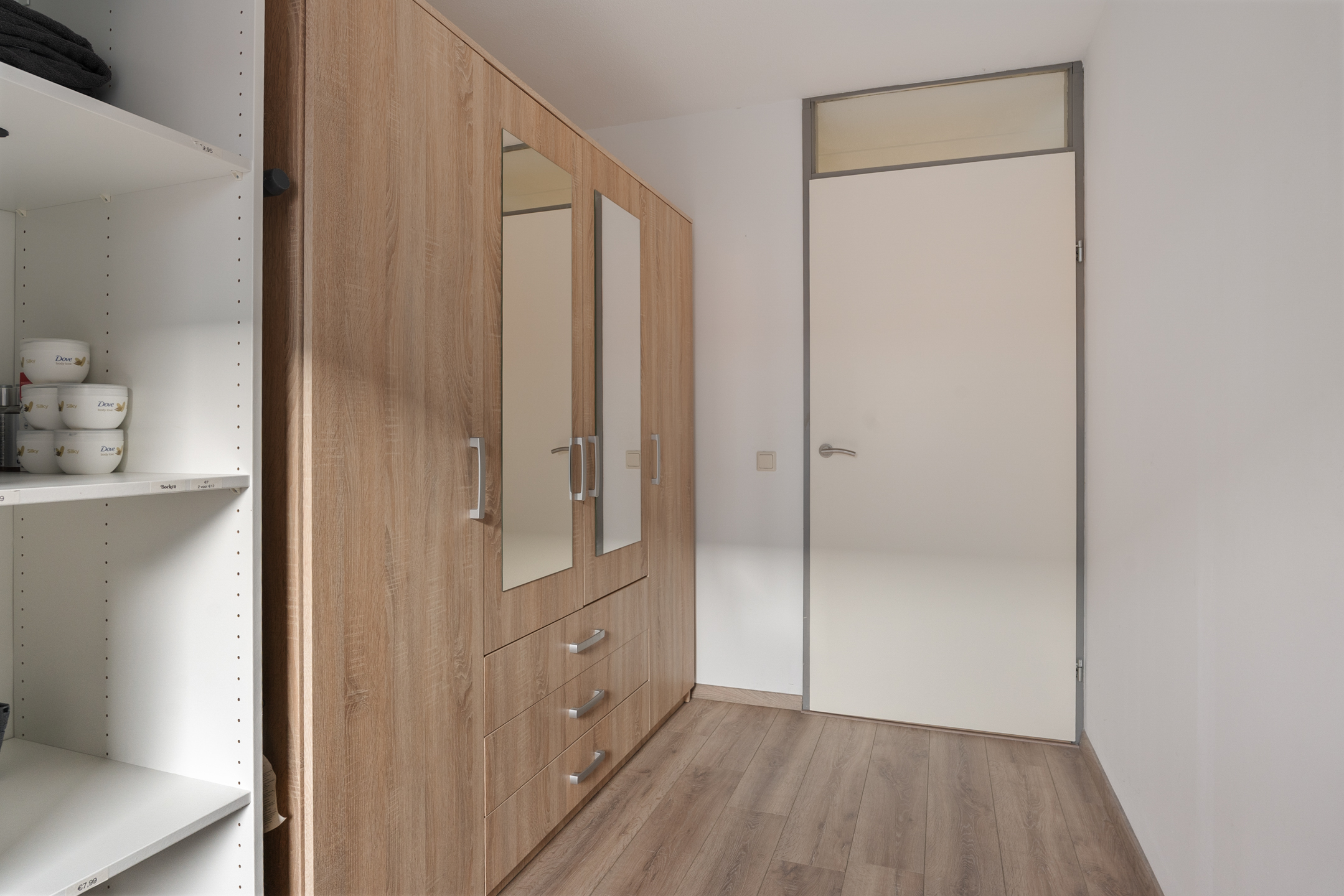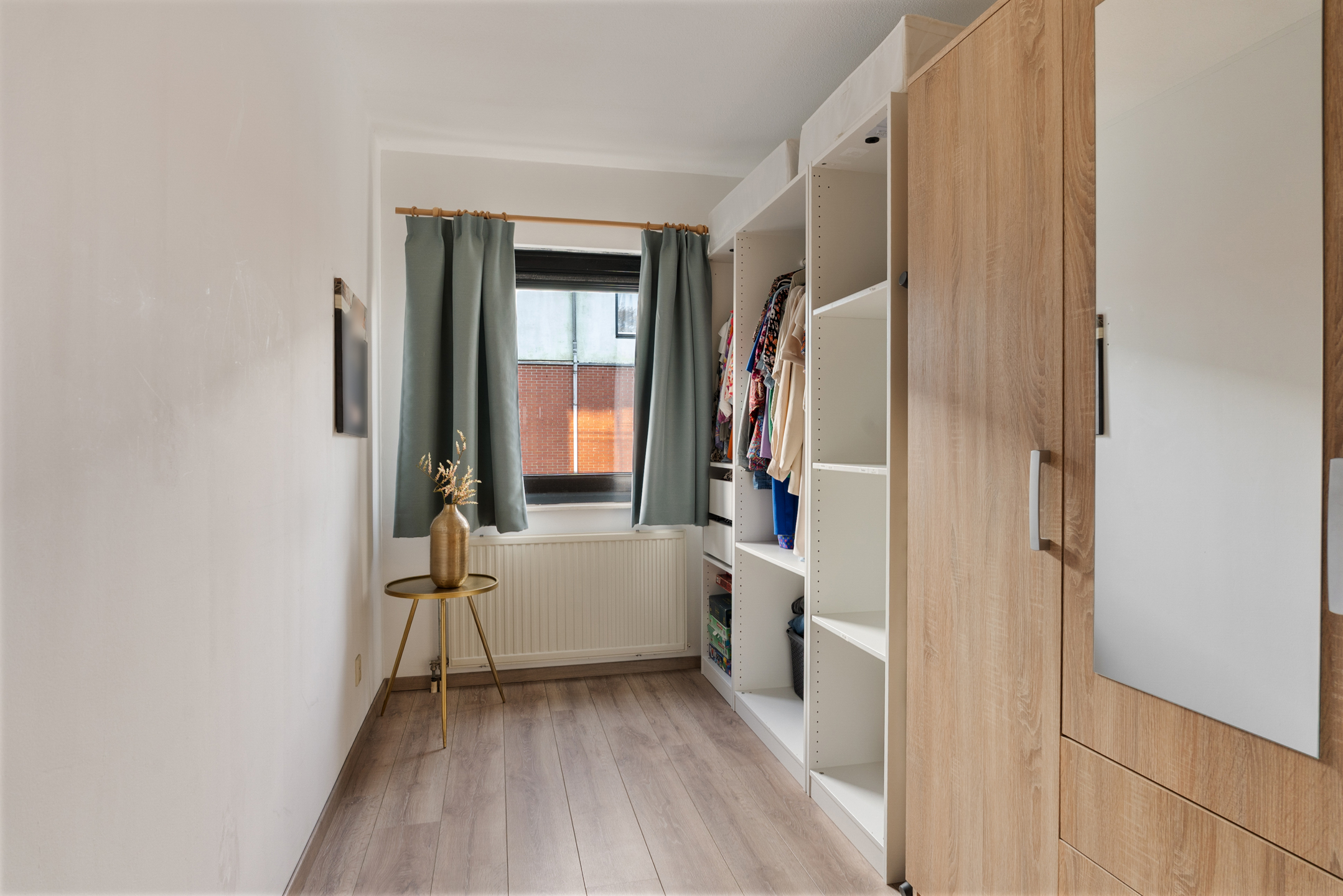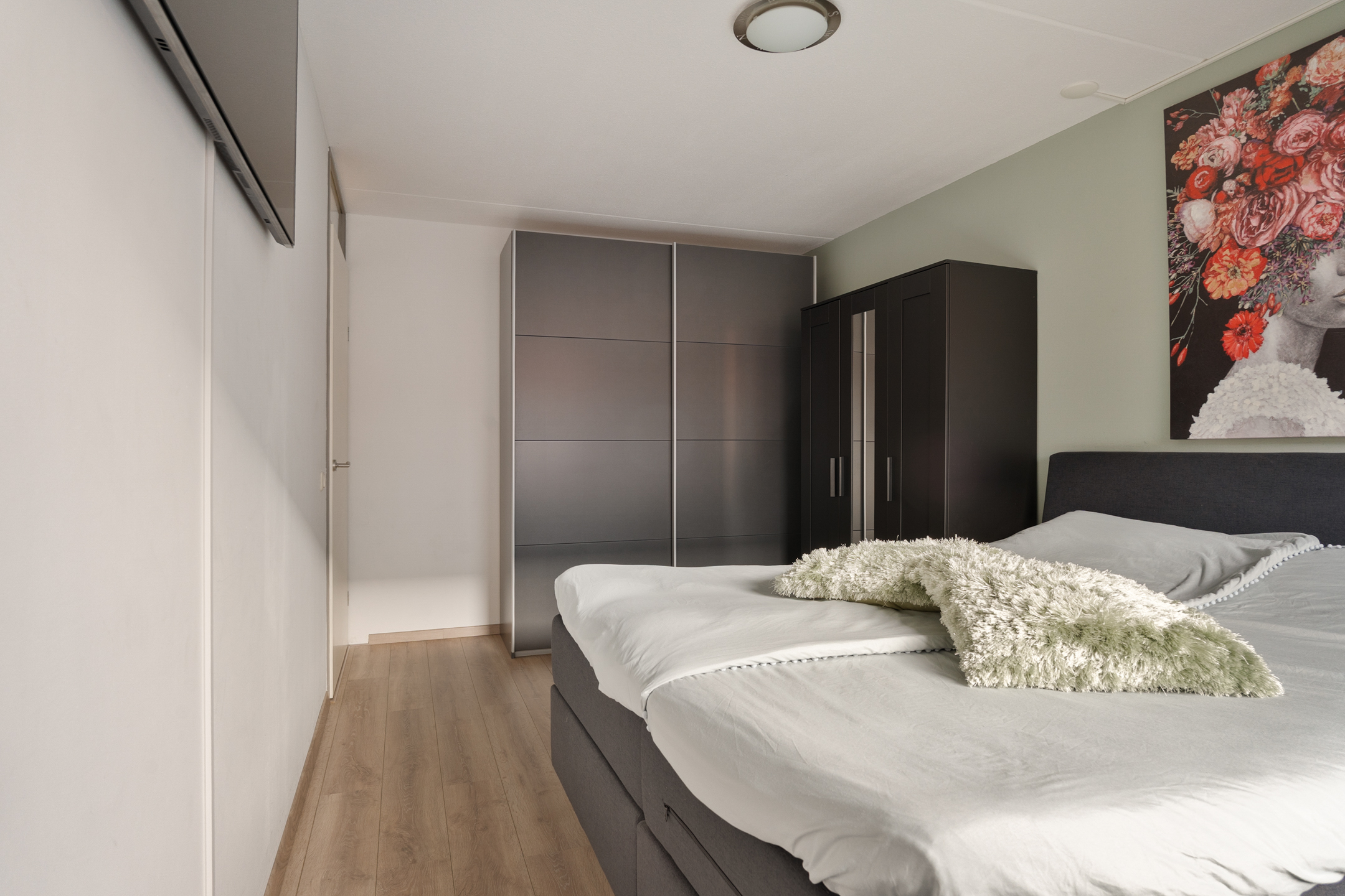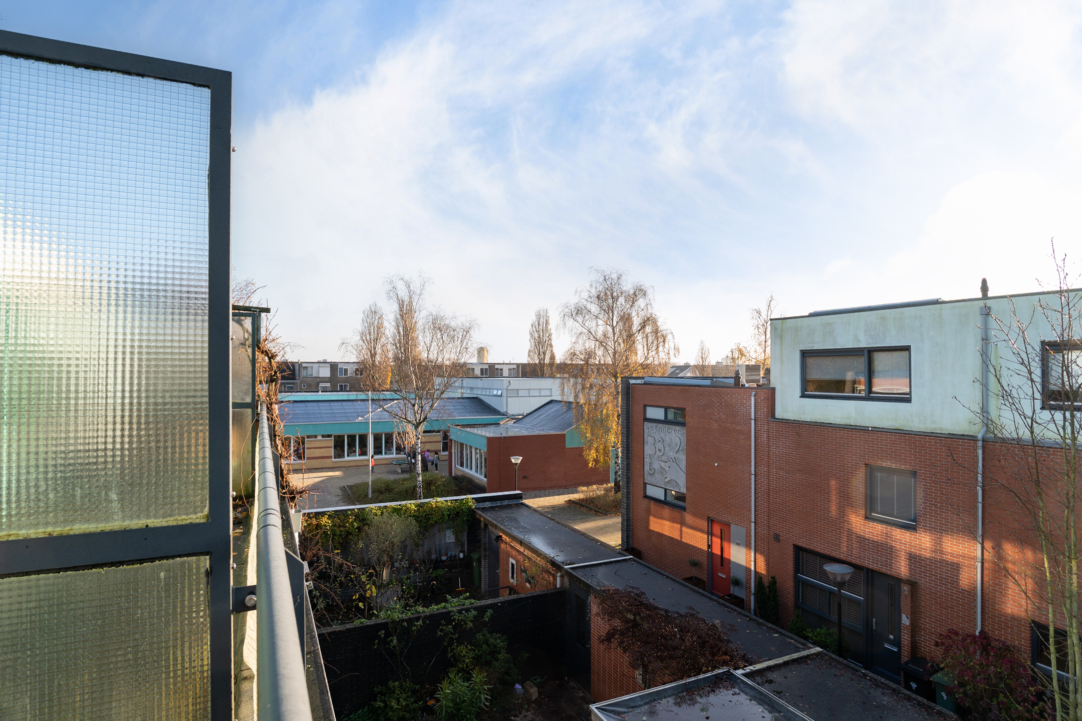 De tweede verdieping is een volwaardige woonlaag met twee ruime slaapkamers. De slaapkamer aan de achterzijde beschikt over een zonnig balkon met uitzicht op de tuin. In de aangrenzende bergruimte bevinden zich de cv-ketel en de aansluitingen voor wasmachine en droger.