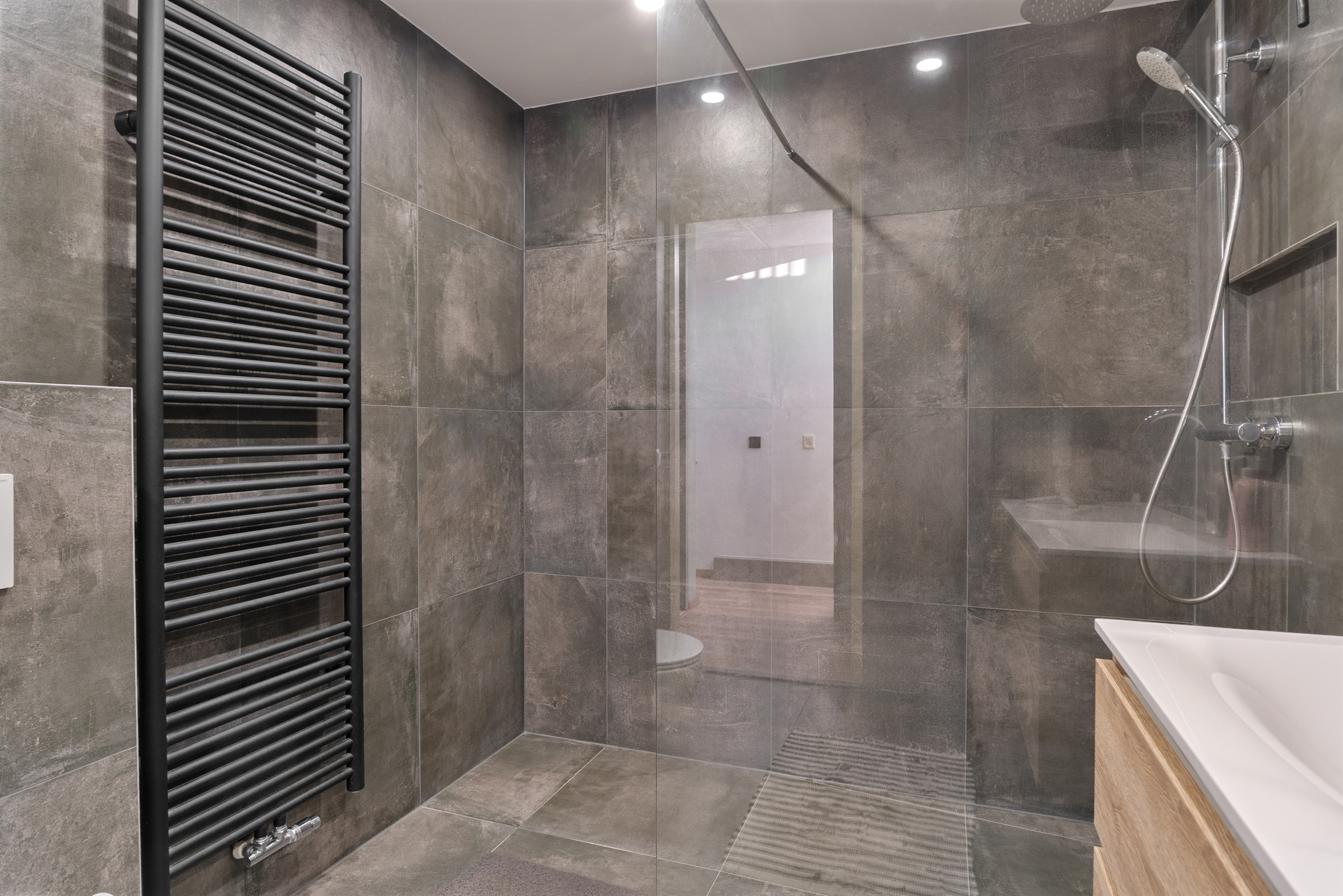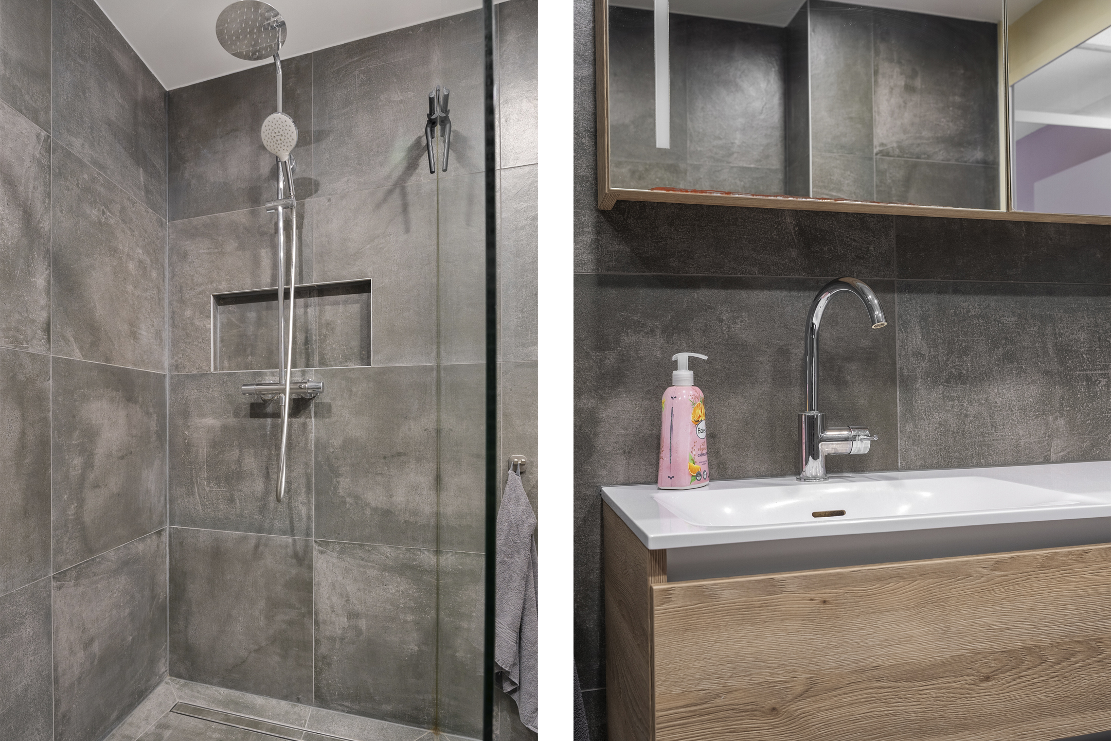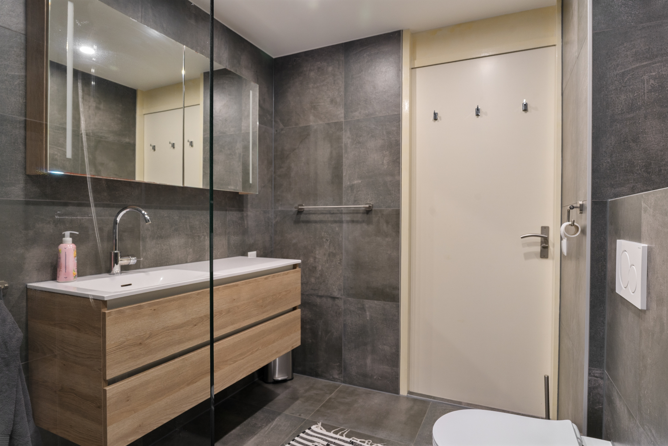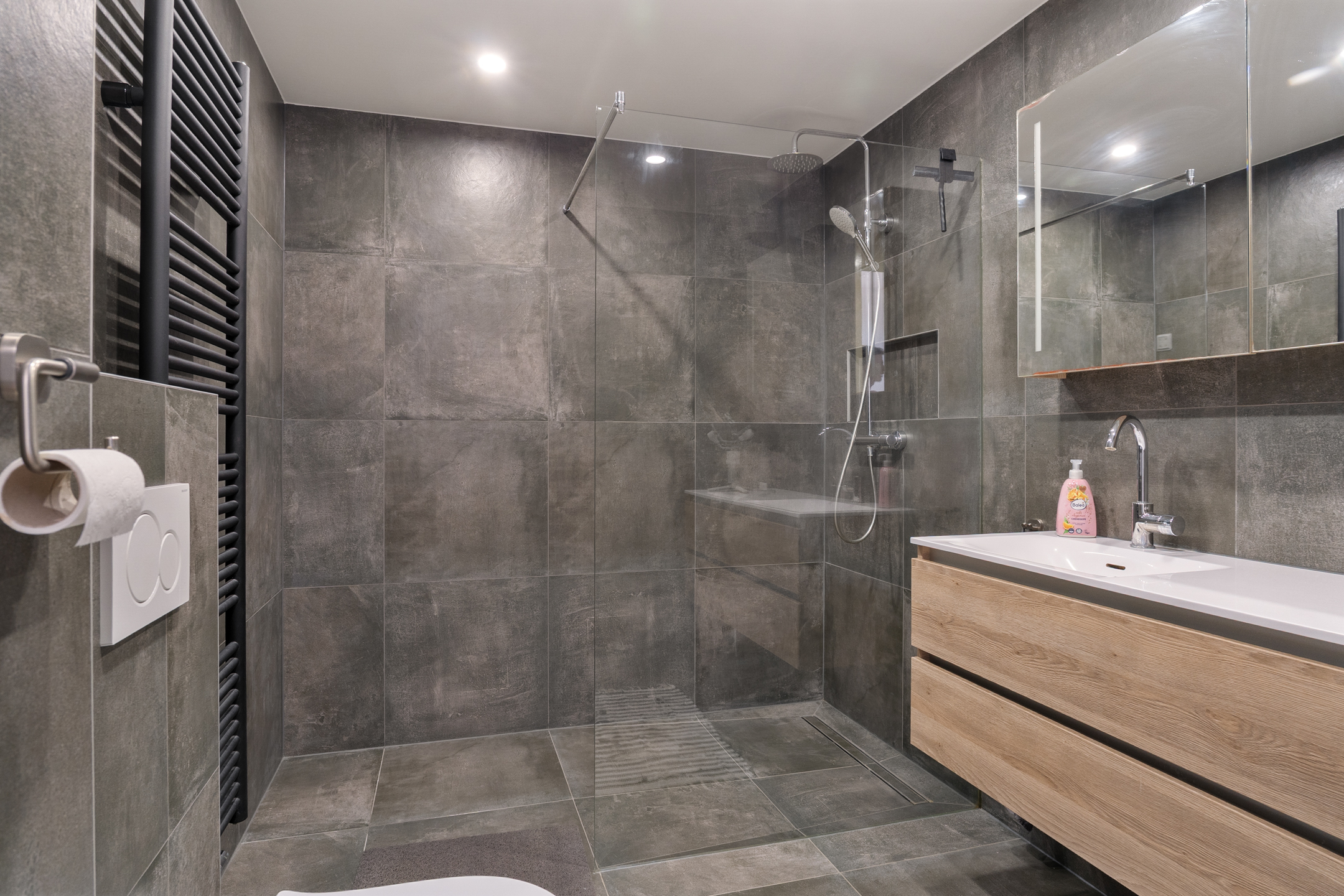 De badkamer is centraal gelegen en verrassend ruim. Deze is voorzien van een inloopdouche met regendouche en losse handdouche, een fraai wastafelmeubel, designradiator en een hangend toilet.