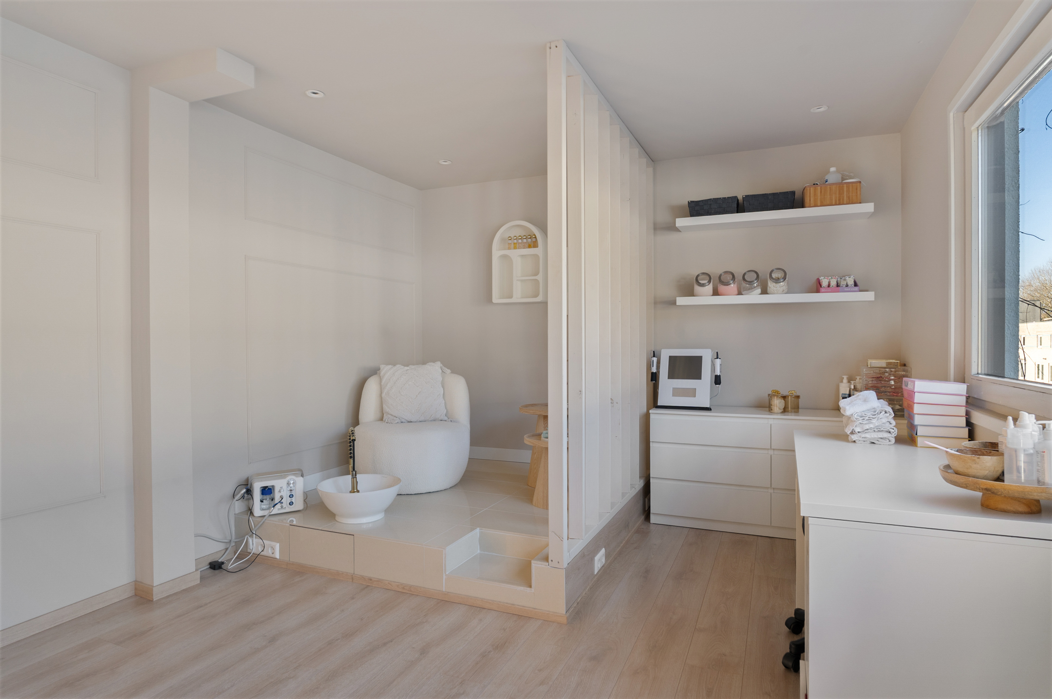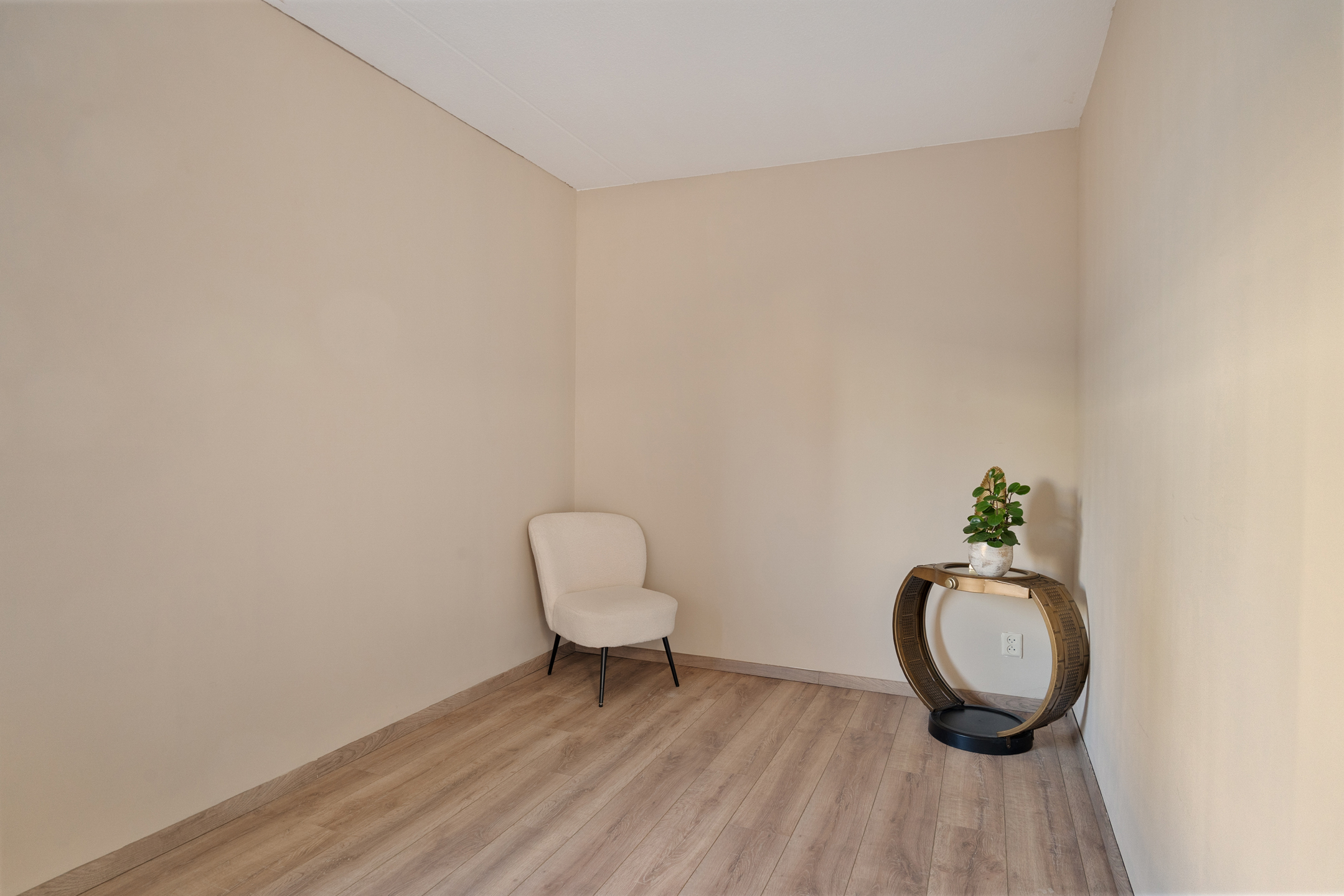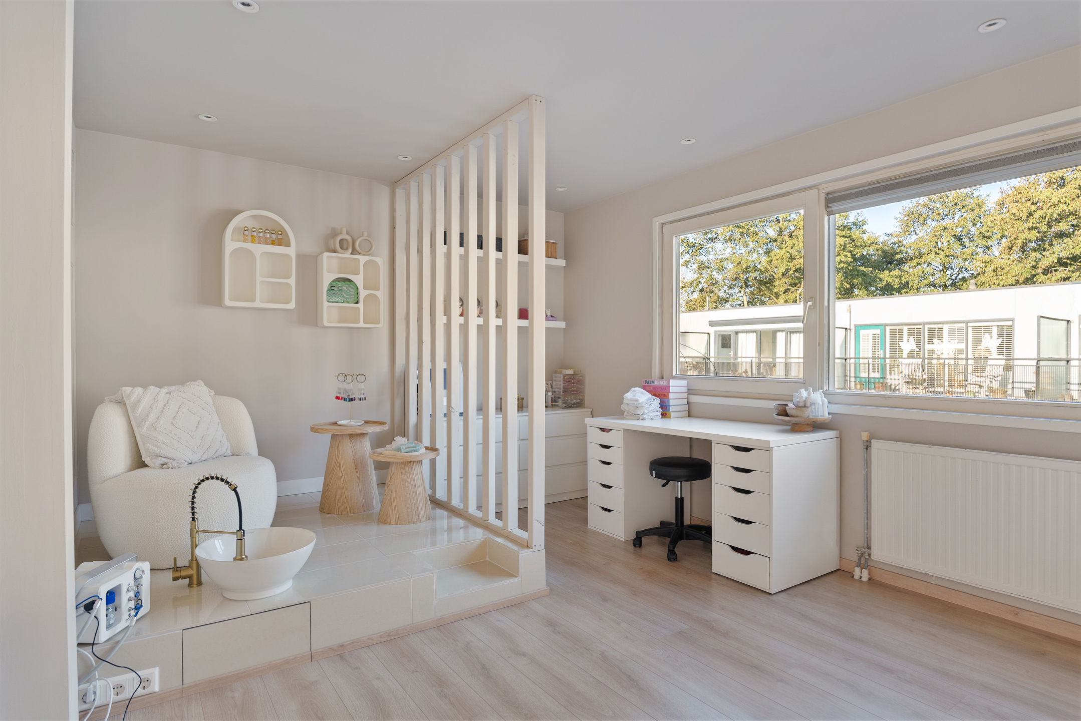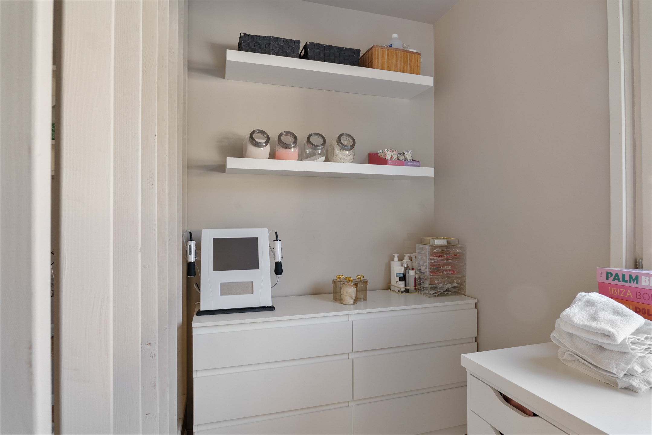 De slaapkamer aan de voorzijde is eveneens ruim en wordt momenteel gebruikt als pedicure, maar is ook zeer geschikt als slaapkamer, werkruimte of hobbykamer. Deze kamer heeft een airco.